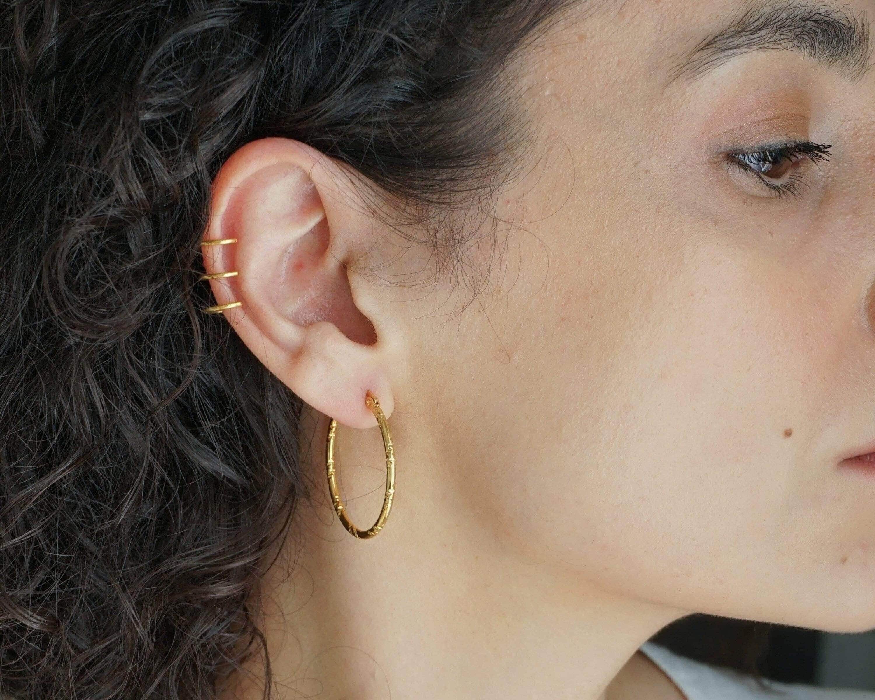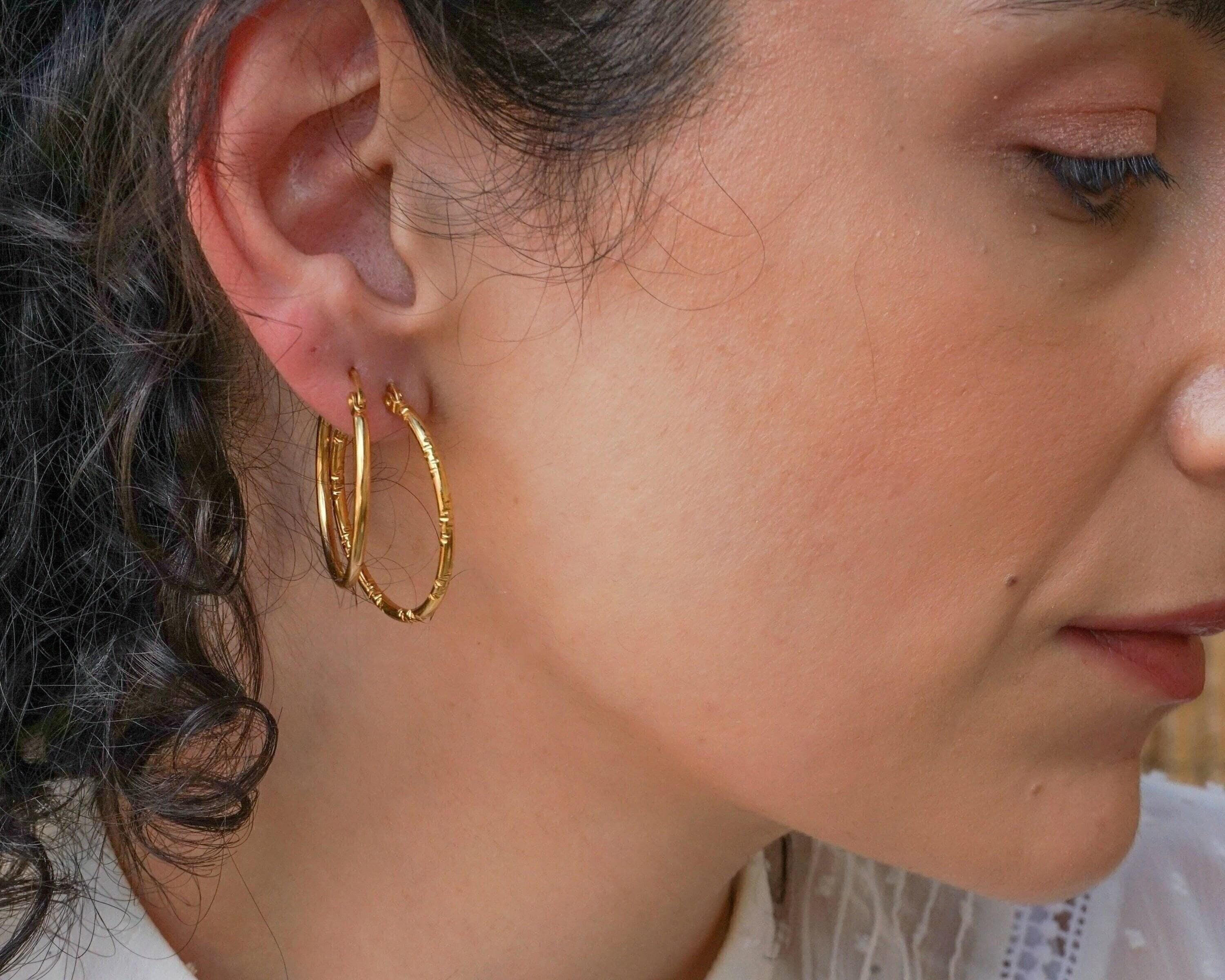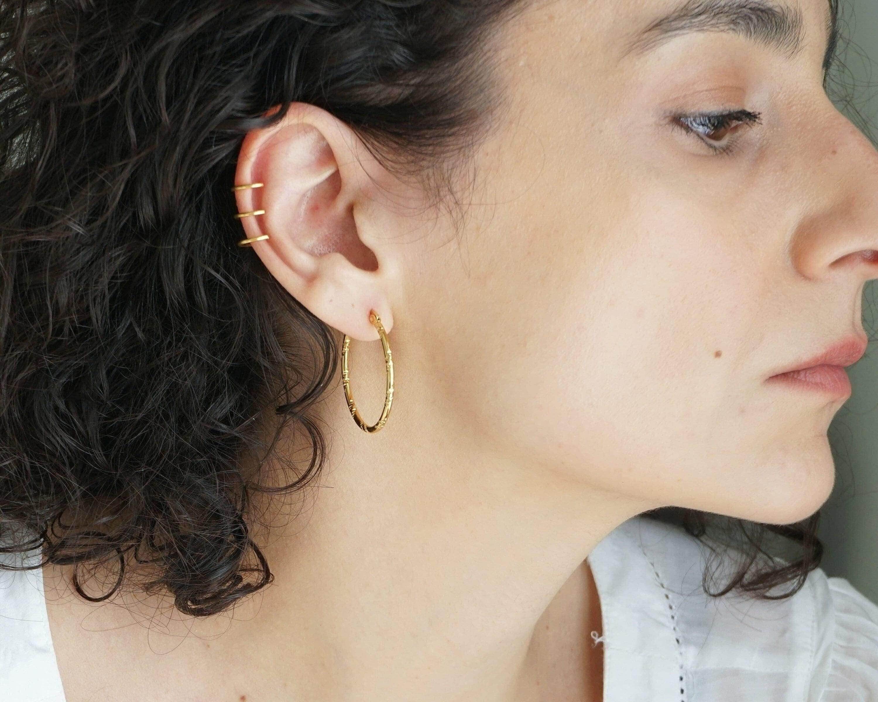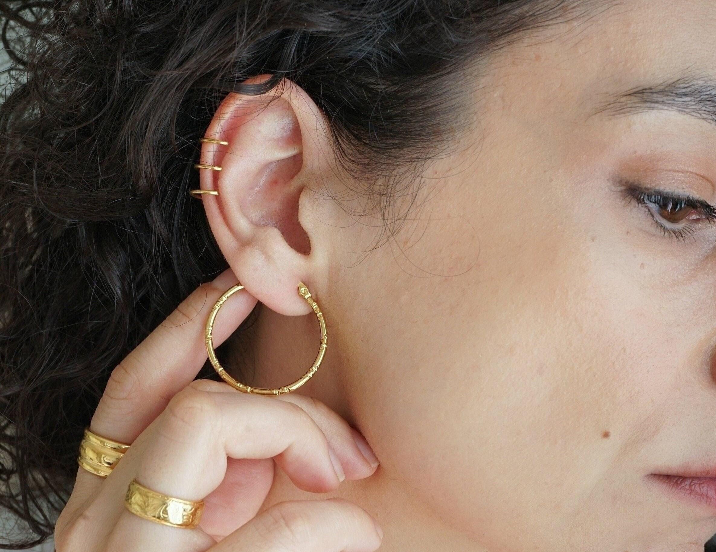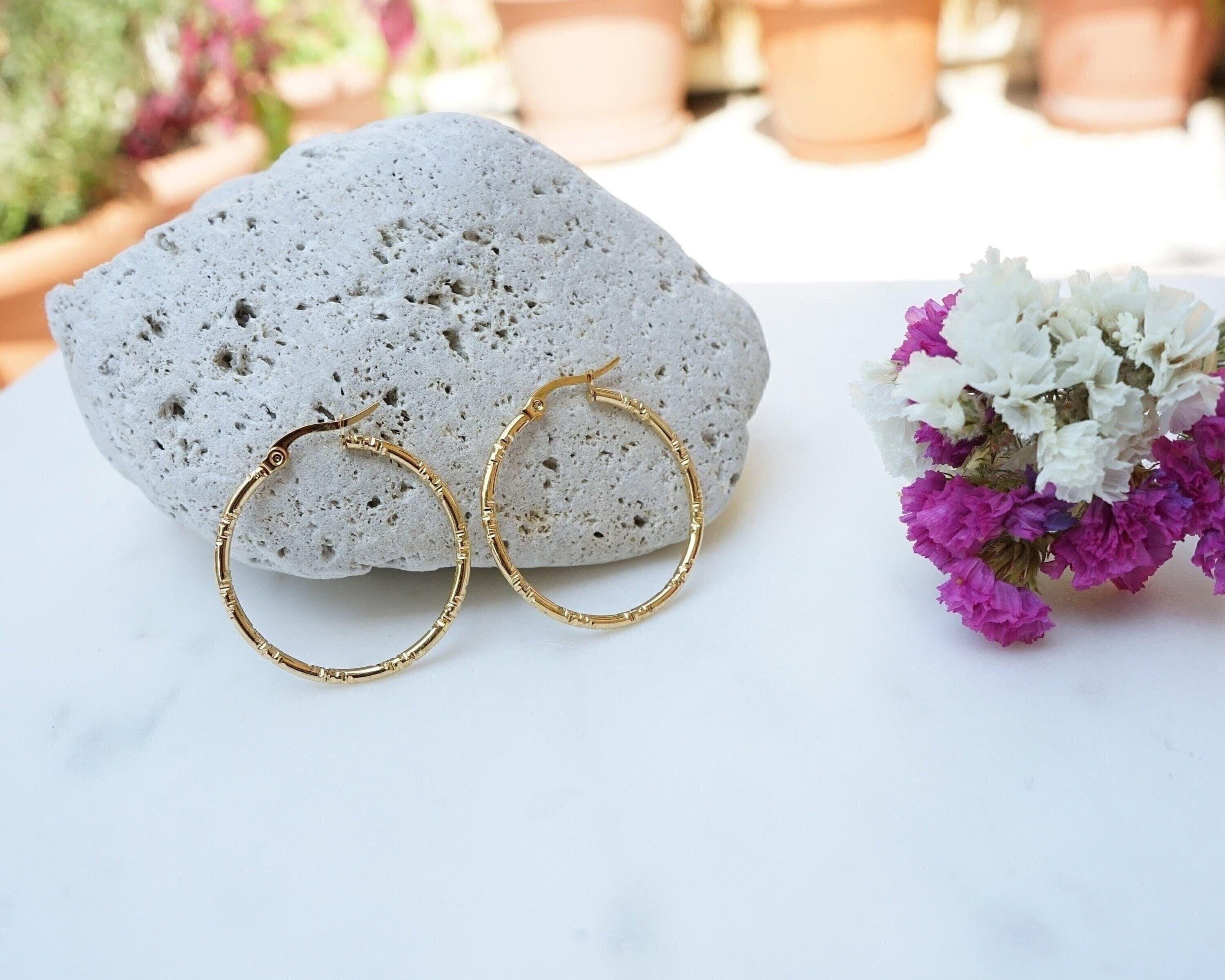 Why limit yourself to stacking just necklaces and rings when you can stack earrings too?! These gorgeous gold hammered hoops are made of stainless steel, perfect on their own for a touch of class or stacked for a modern vibe. From day to night, they'll elevate any outfit. Understated yet stylish, they're lightweight and effortless to wear without weighing down your earlobes. Unique and versatile.
