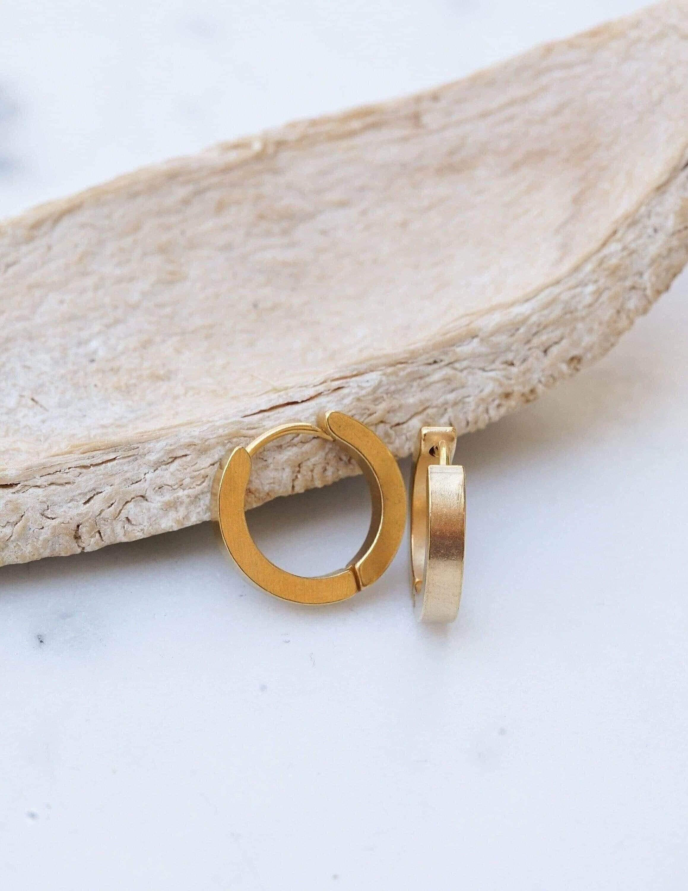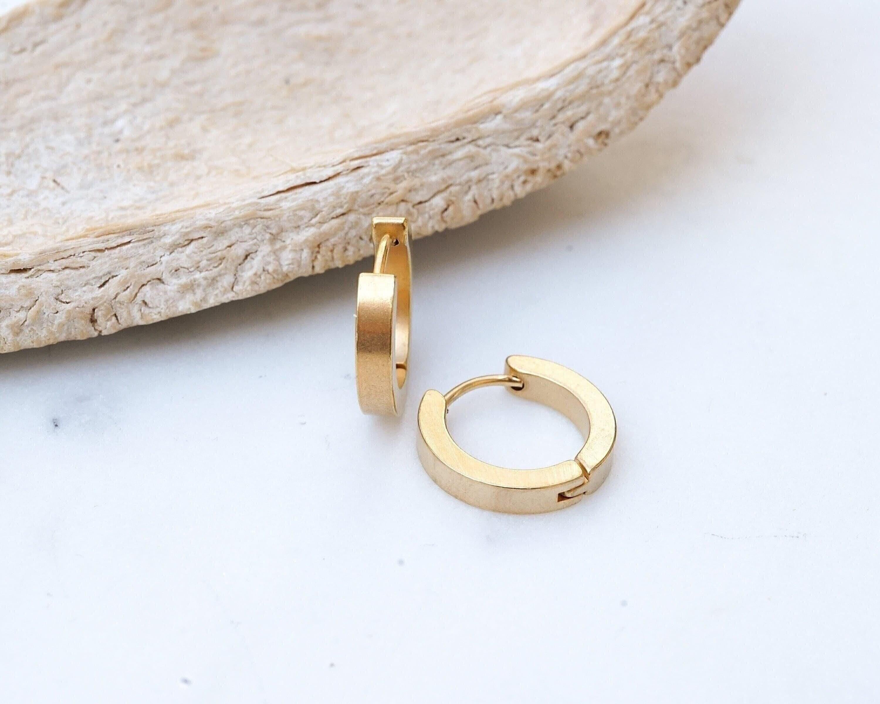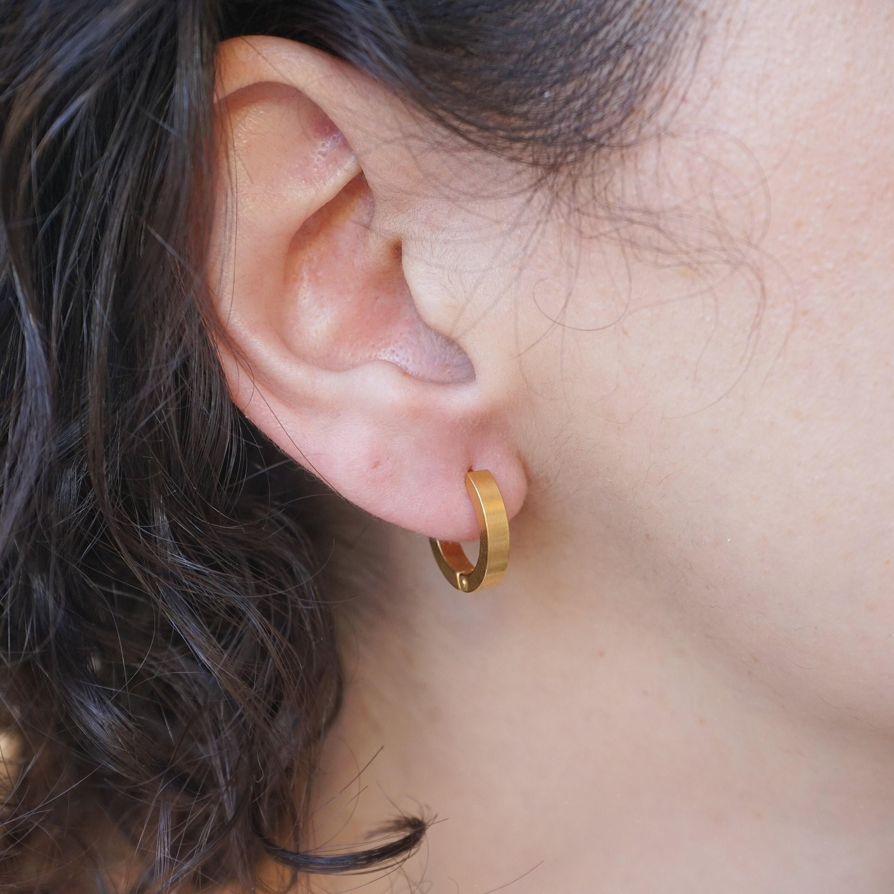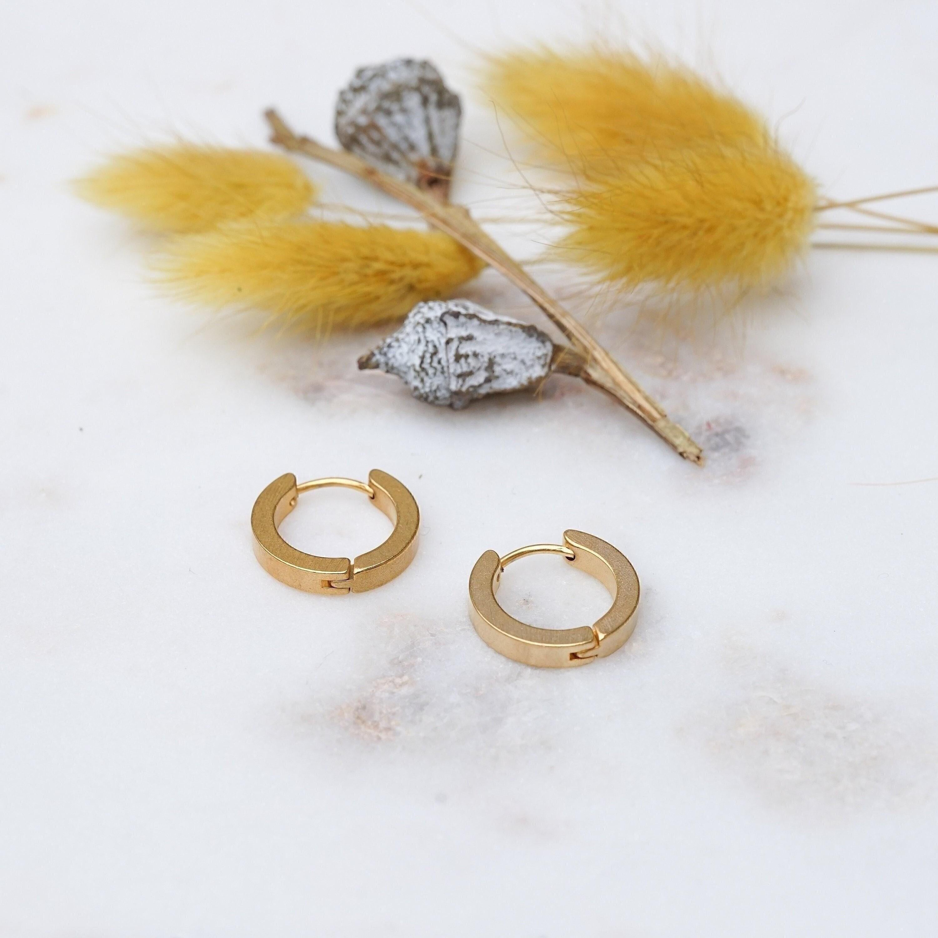 Why settle for just stacking your necklaces and rings when you can also stack your earrings? These beautiful gold hoop earrings are timeless and made of stainless steel with a gold plating. Wear them alone for a sophisticated look or stack them for a modern touch. These versatile earrings can transition easily from day to night and add a touch of elegance to any outfit. They're lightweight and effortless to wear, making them a unique and stylish addition to your collection.
