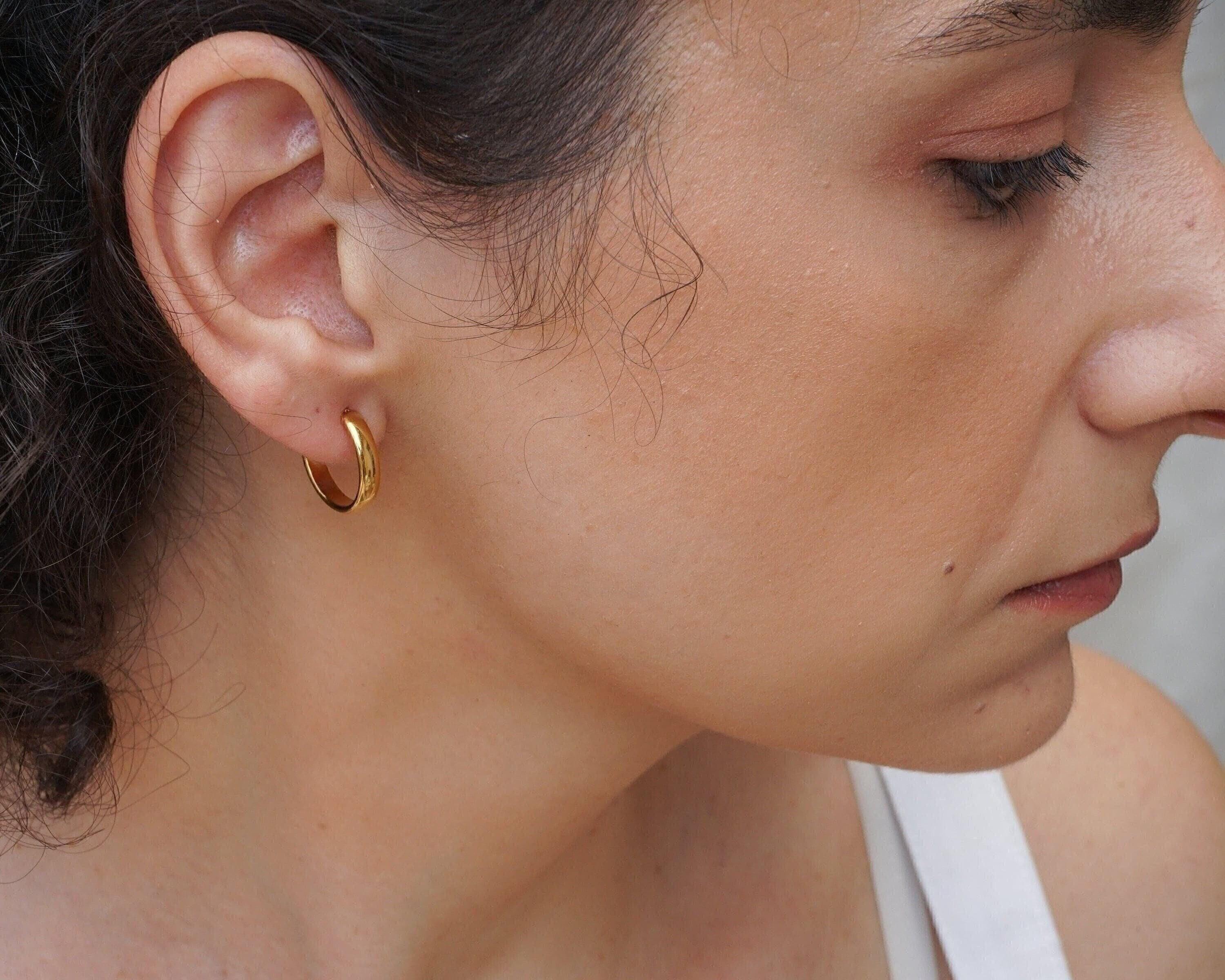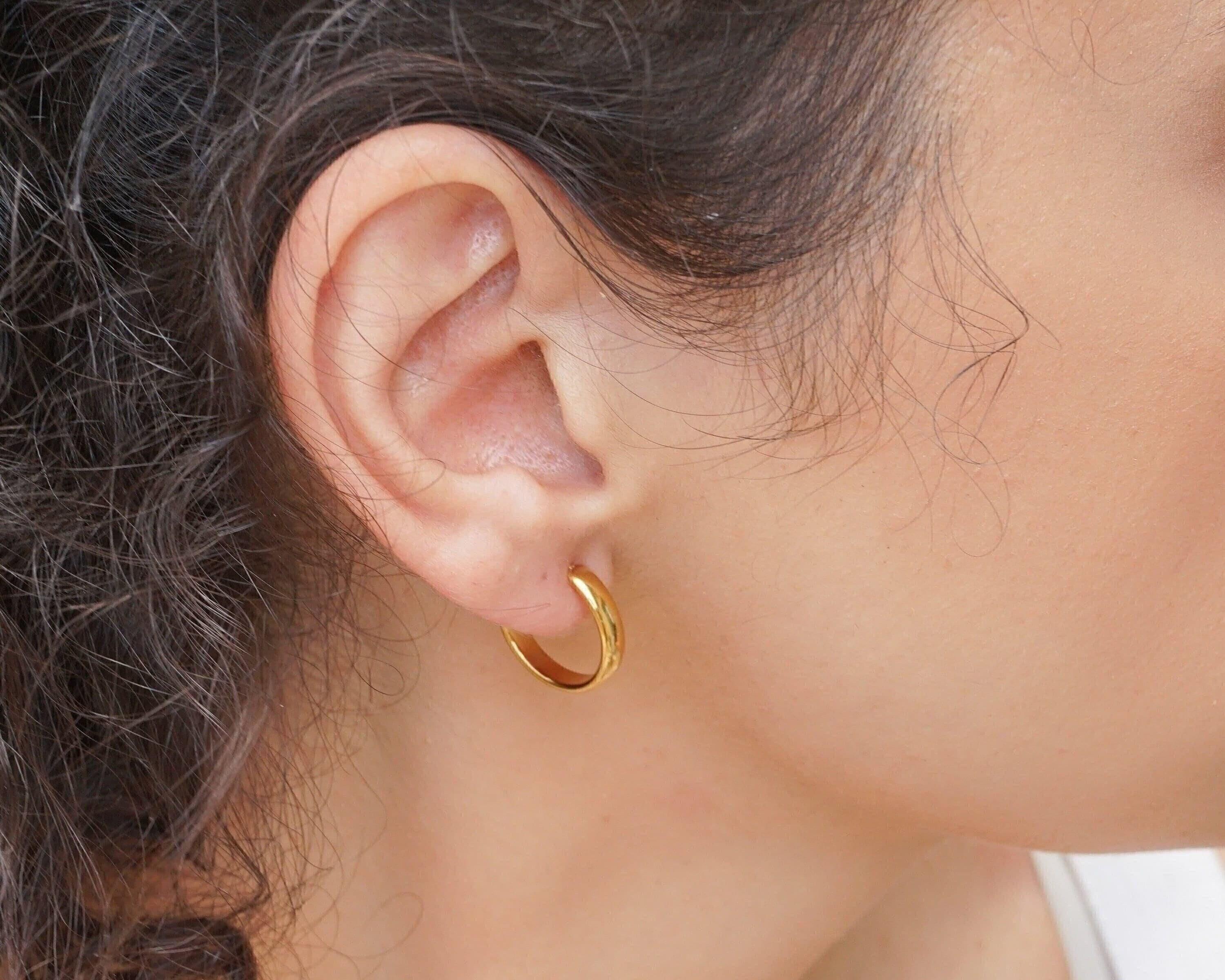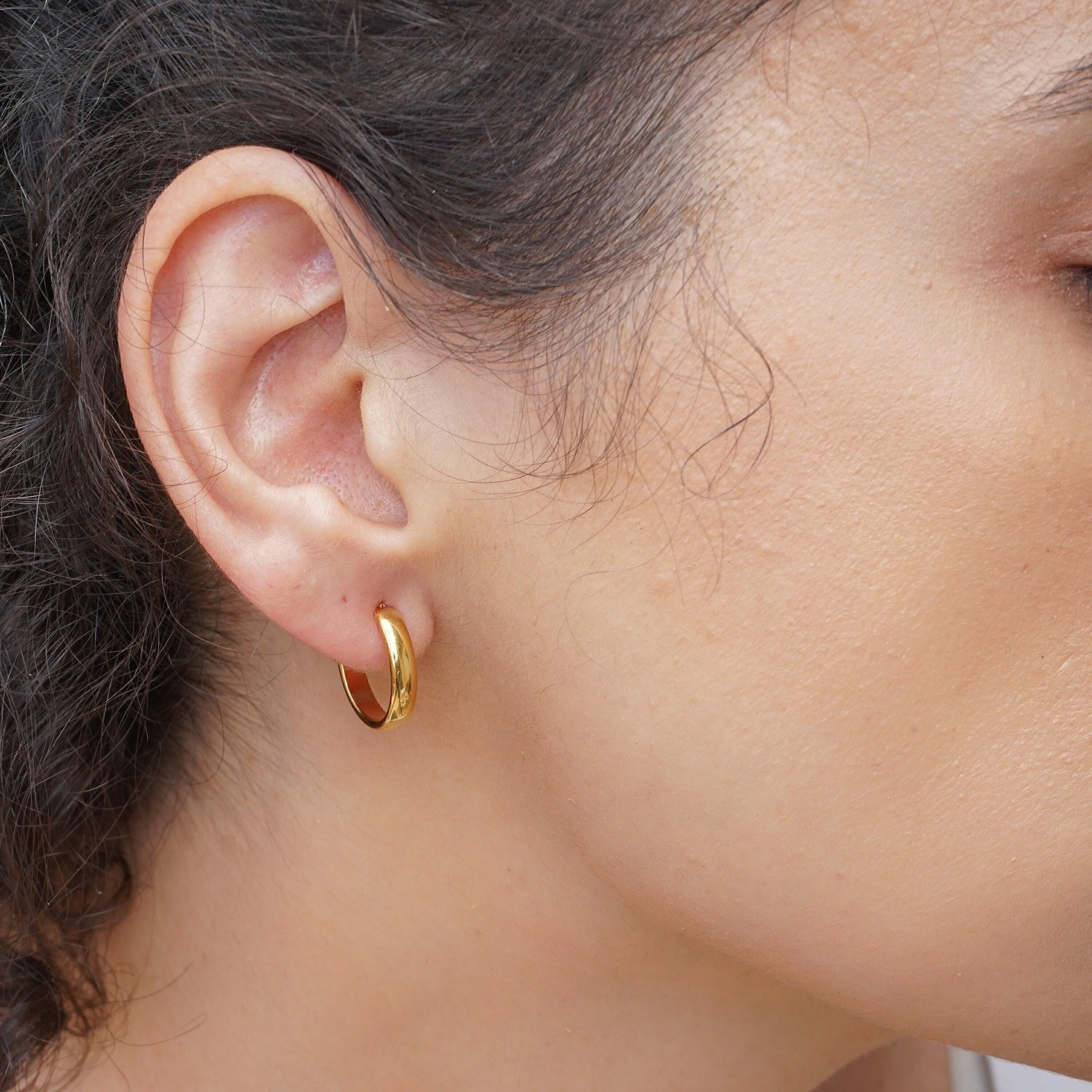 These classic gold medium hoop earrings are perfect for any style or occasion. You can wear them alone for a sophisticated look or stack them with other piercings for a more edgy vibe. They are understated, yet still make a fashion statement. Lightweight and easy to wear, they won't weigh your earlobes down. They are versatile and can easily be dressed up or down.