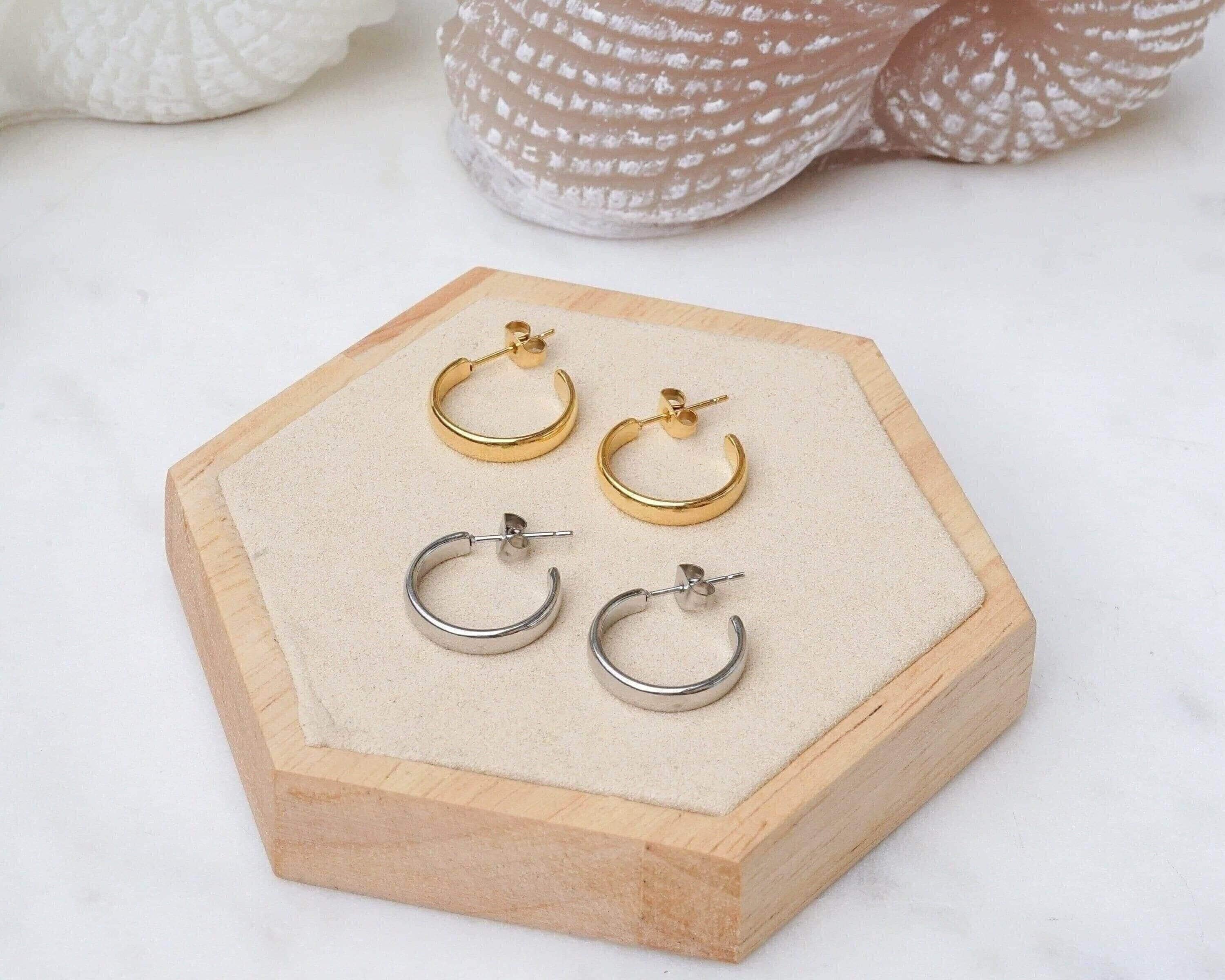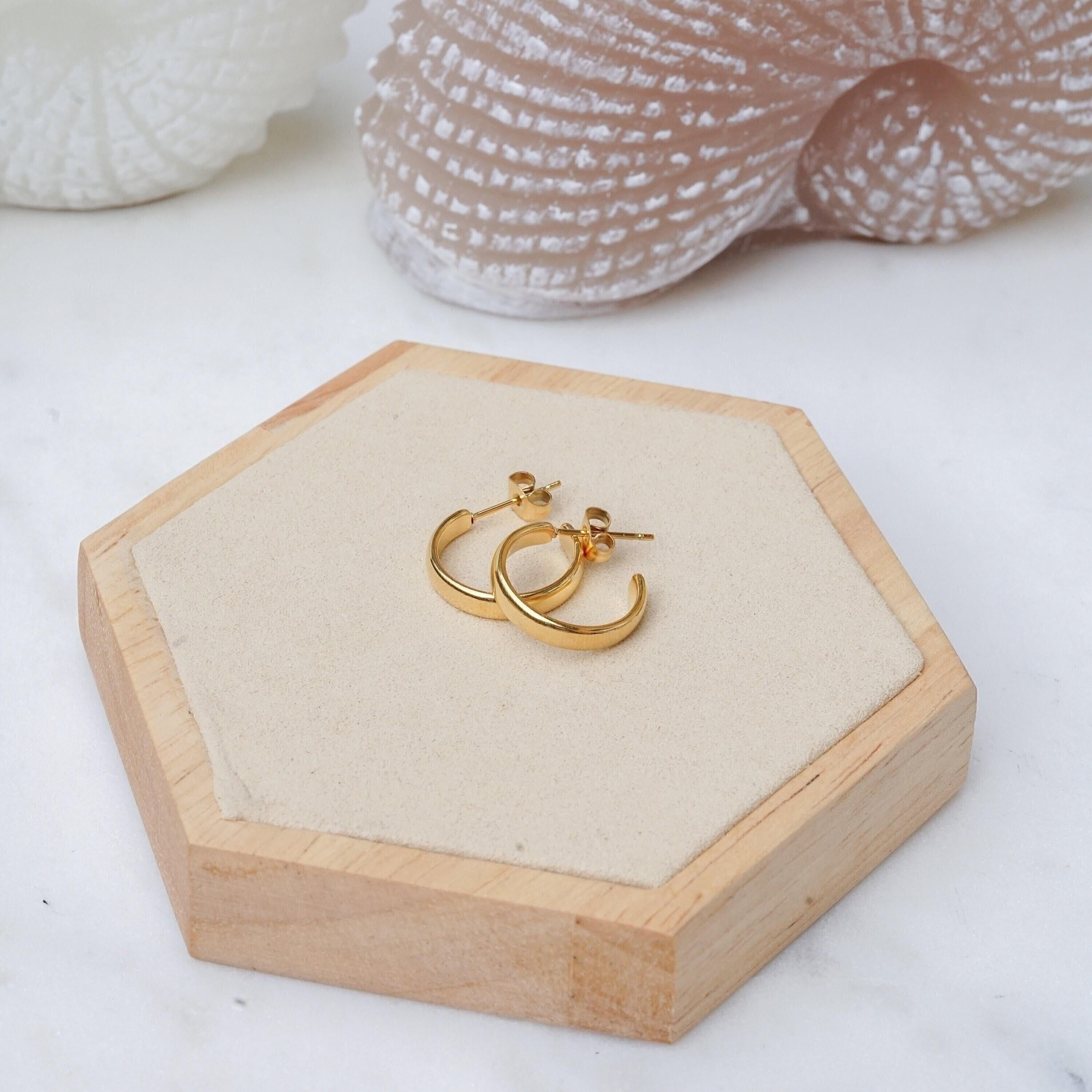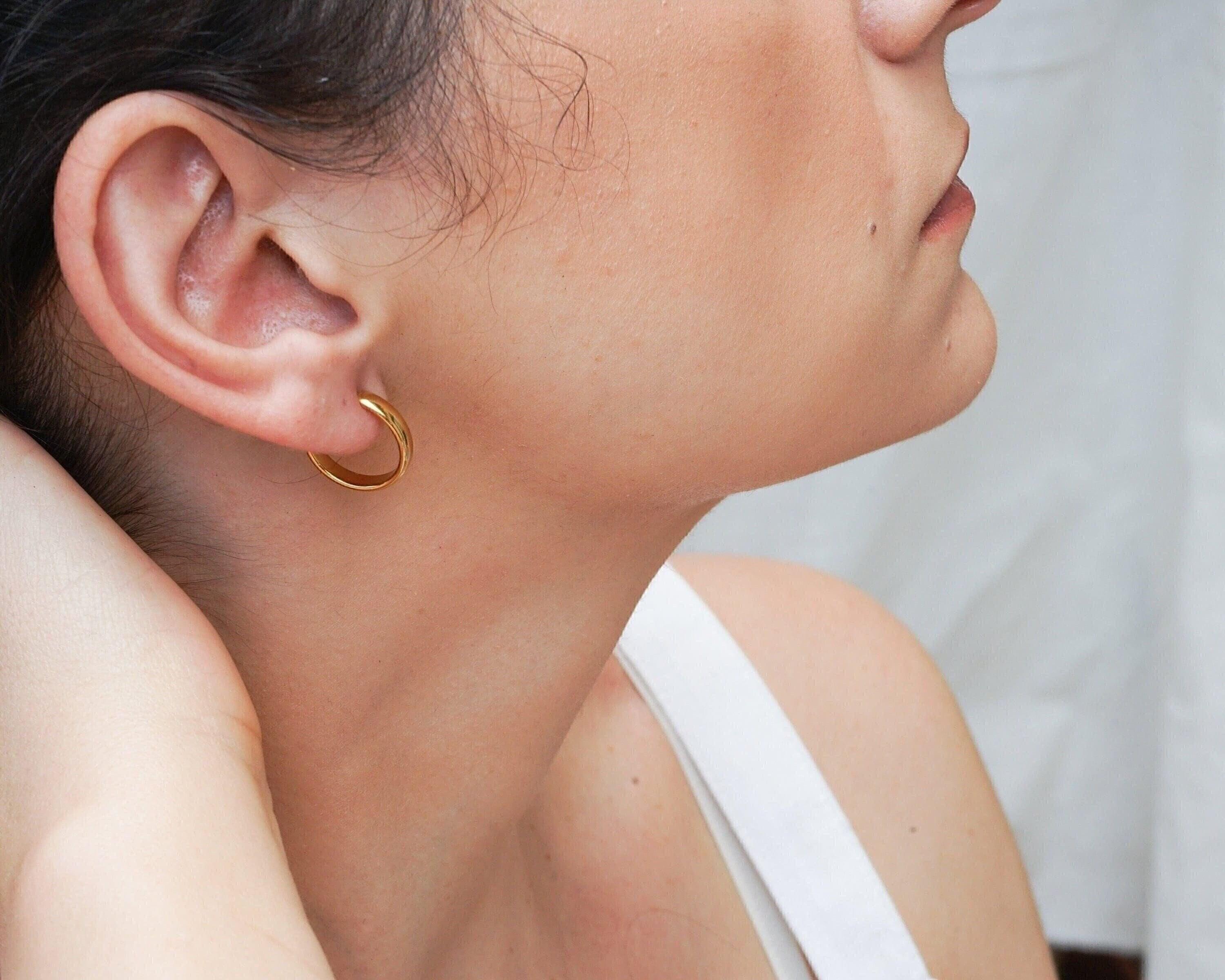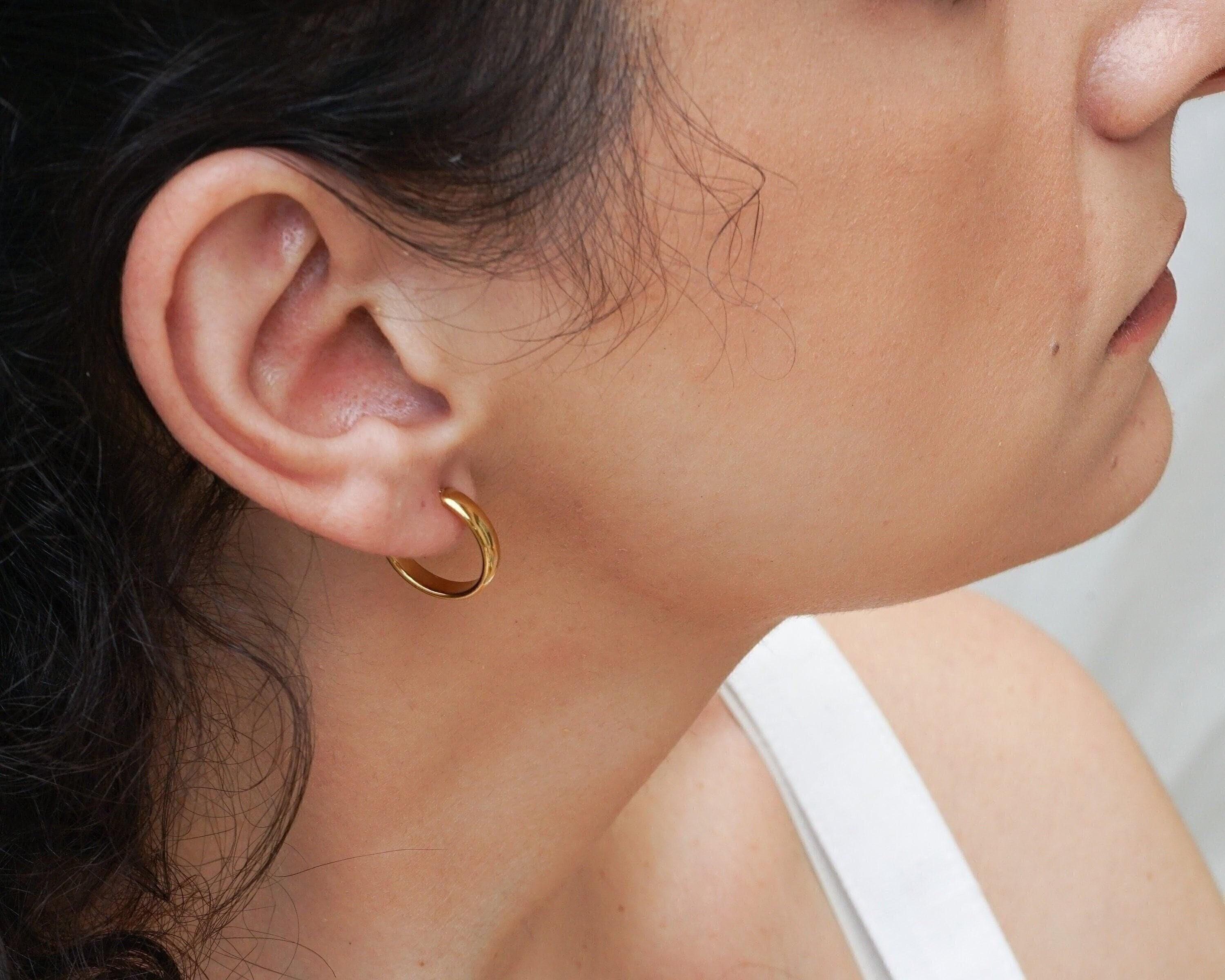 These classic gold medium hoop earrings are perfect for any style or occasion. You can wear them alone for a sophisticated look or stack them with other piercings for a more edgy vibe. They are understated, yet still make a fashion statement. Lightweight and easy to wear, they won't weigh your earlobes down. They are versatile and can easily be dressed up or down.