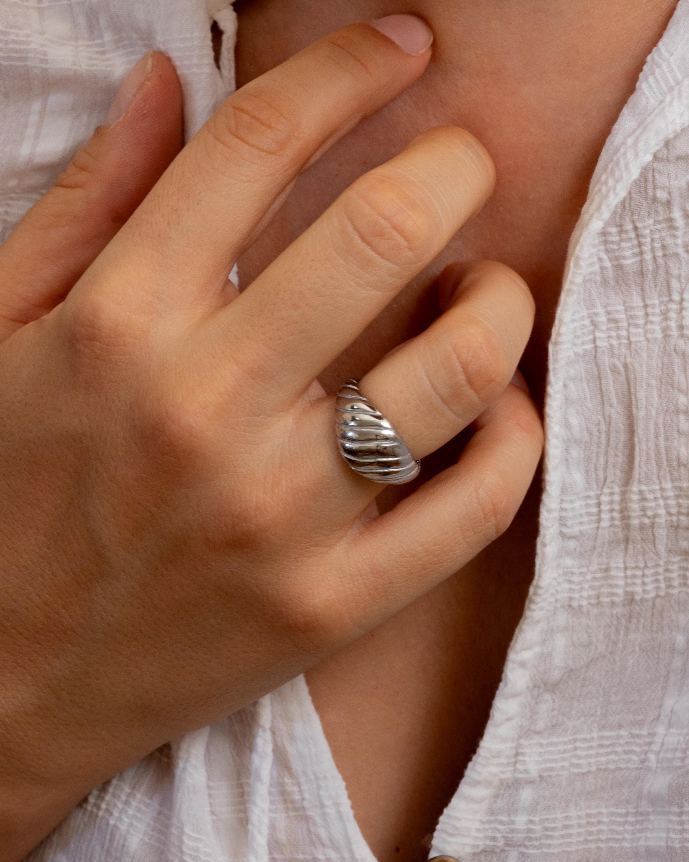 This silver croissant ring blends modern design with timeless simplicity. The ribbed dome shape gives it a sculptural look that shines from every angle.