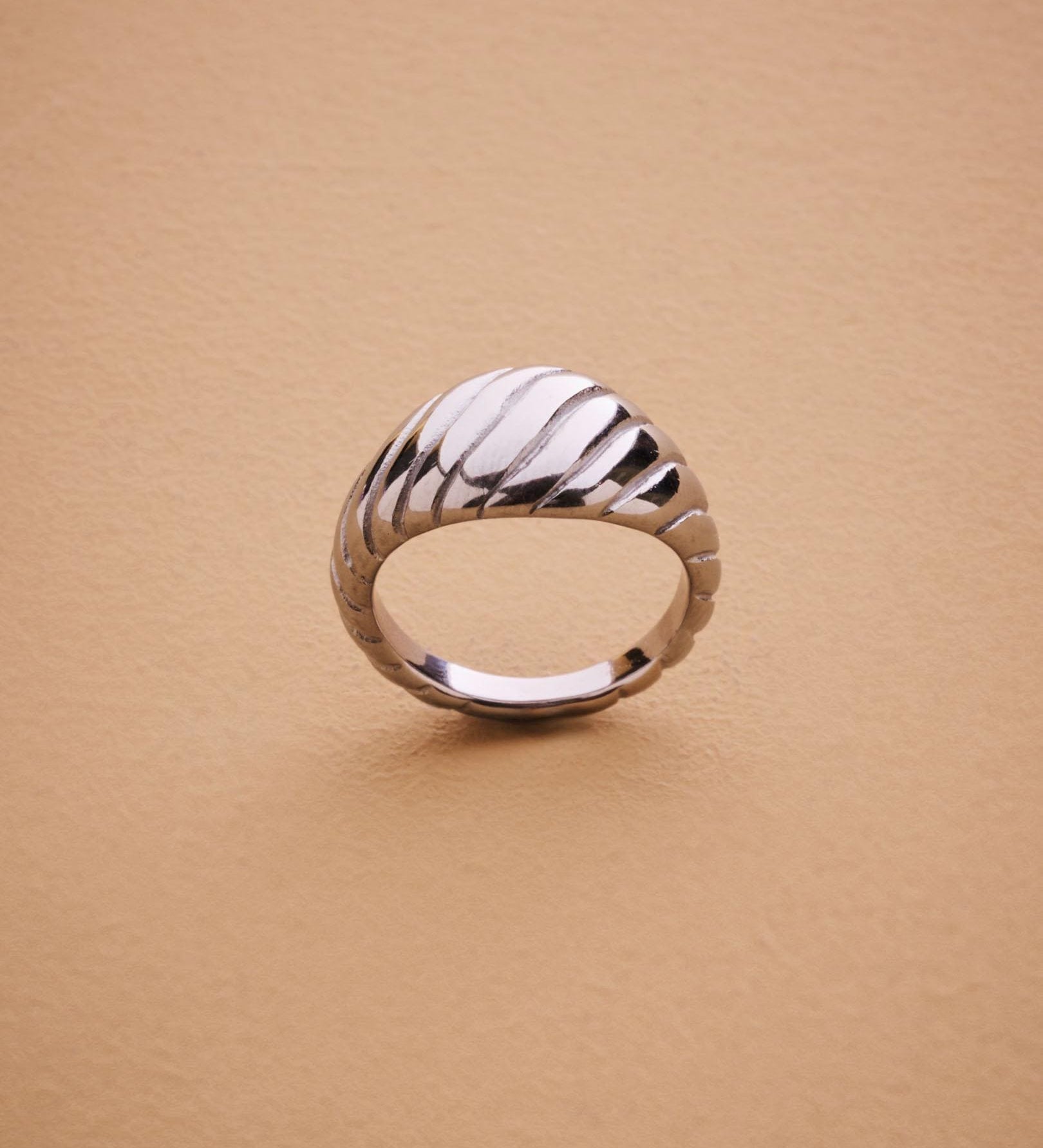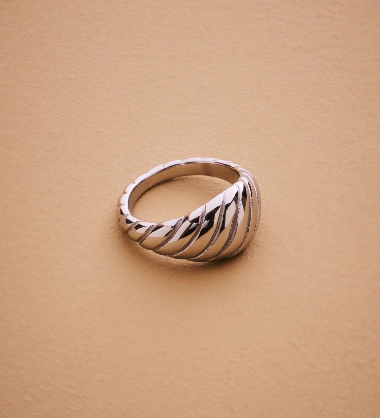 Silver Croissant Ring, Ribbed Dome Ring for Women, Modern Sculptural Statement Ring, Bold Silver Waterproof Braided Soft Dome Ring