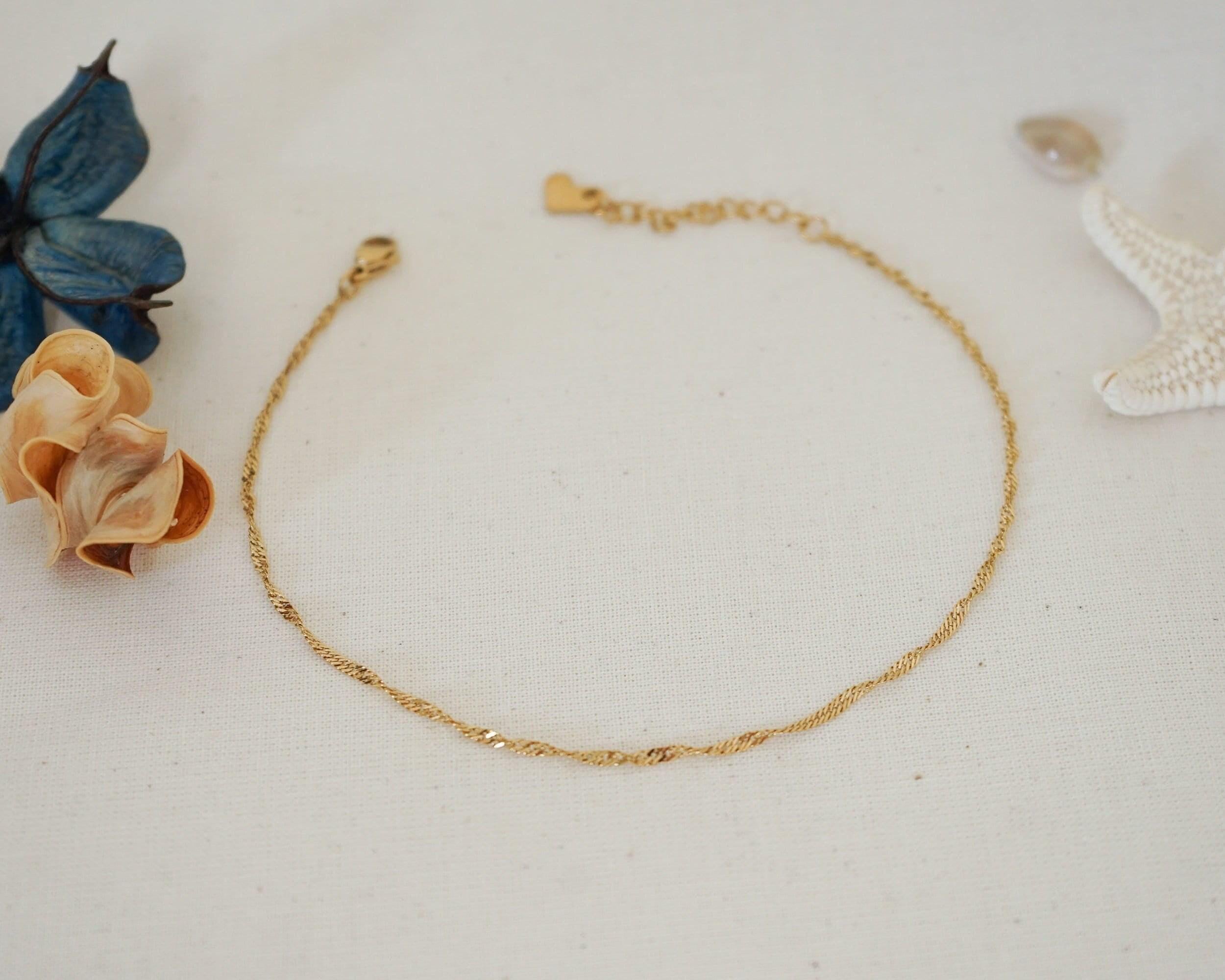 A very stylish gold TWISTED SERPENTINE chain anklet bracelet, made from stainless steel. Durable, waterproof and fashionable. Available in two different widths.
