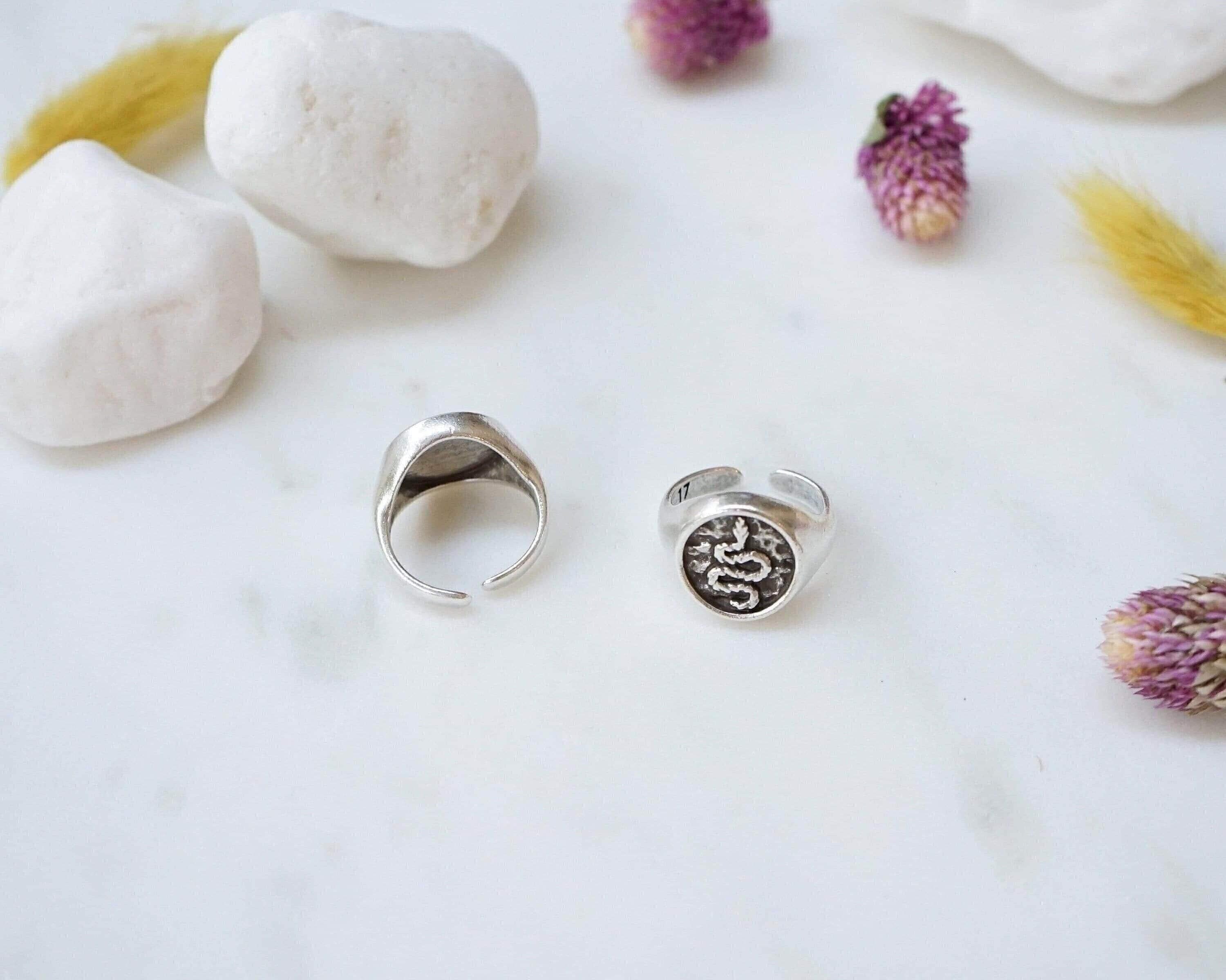 Crafted from silver-plated zamak, this snake stamp signet chevalier ring embodies a potent creative life force. Despite their often misunderstood reputation, snakes have been revered symbols of rebirth, transformation, immortality, and healing in Ancient Greece and Egypt. The Greek god Asclepius, known for his association with medicine, famously wielded a rod entwined with serpents, highlighting their significance. Not only does this ring serve as a meaningful emblem, but it also makes a striking addition to any style ensemble.