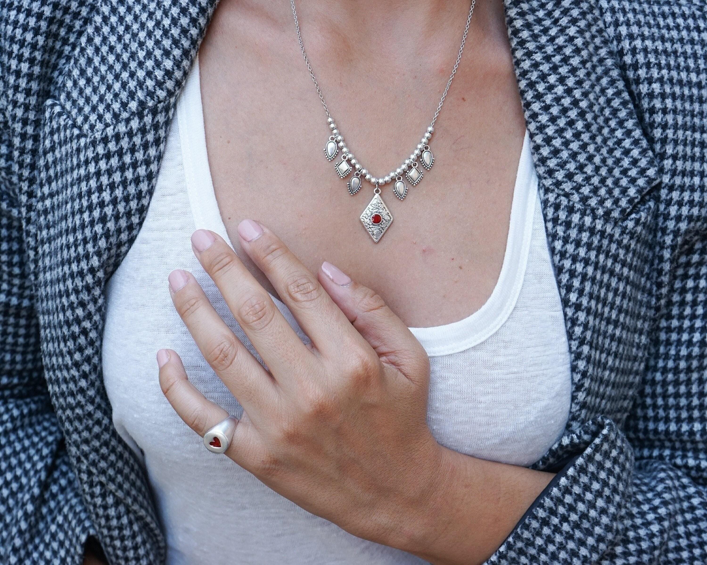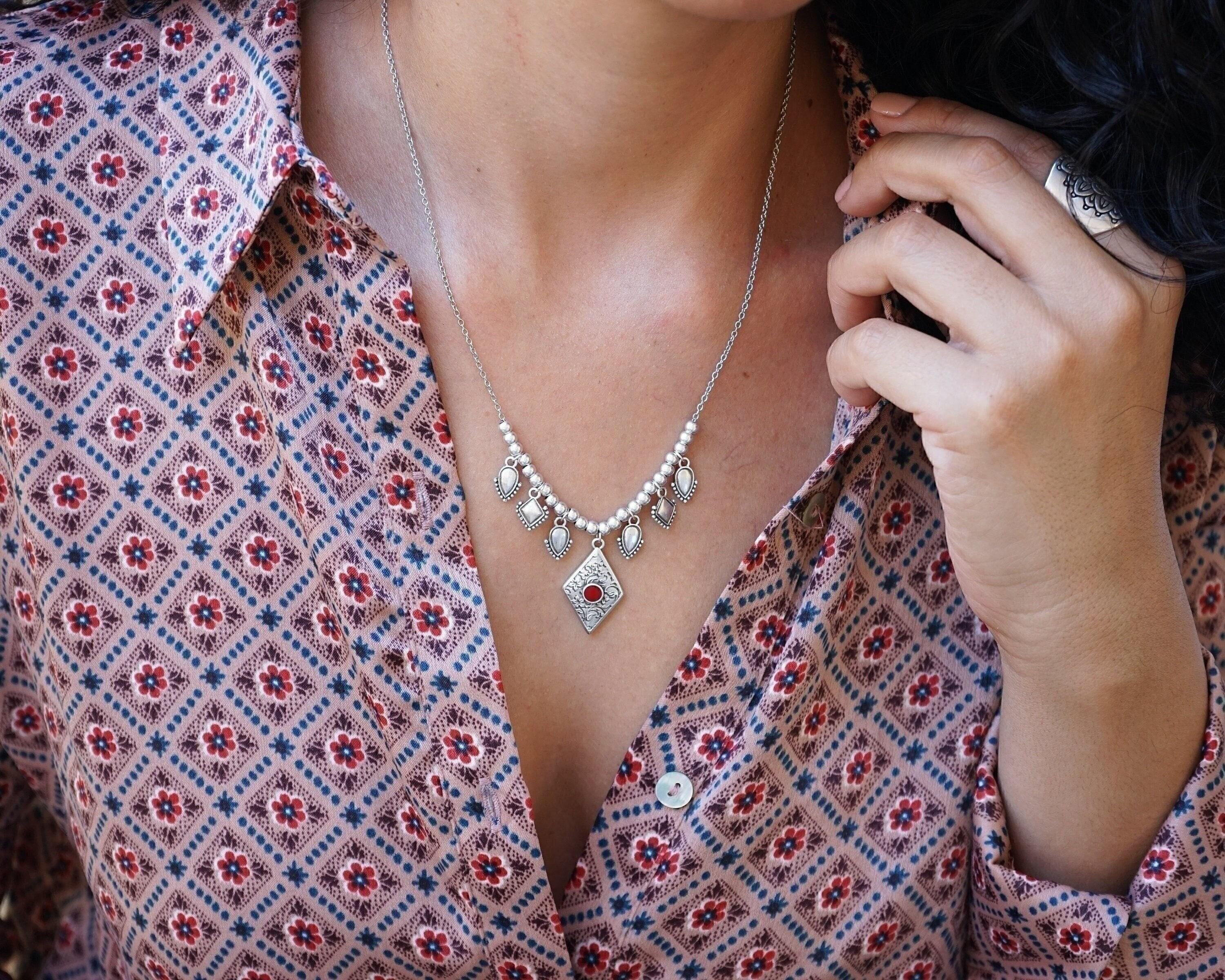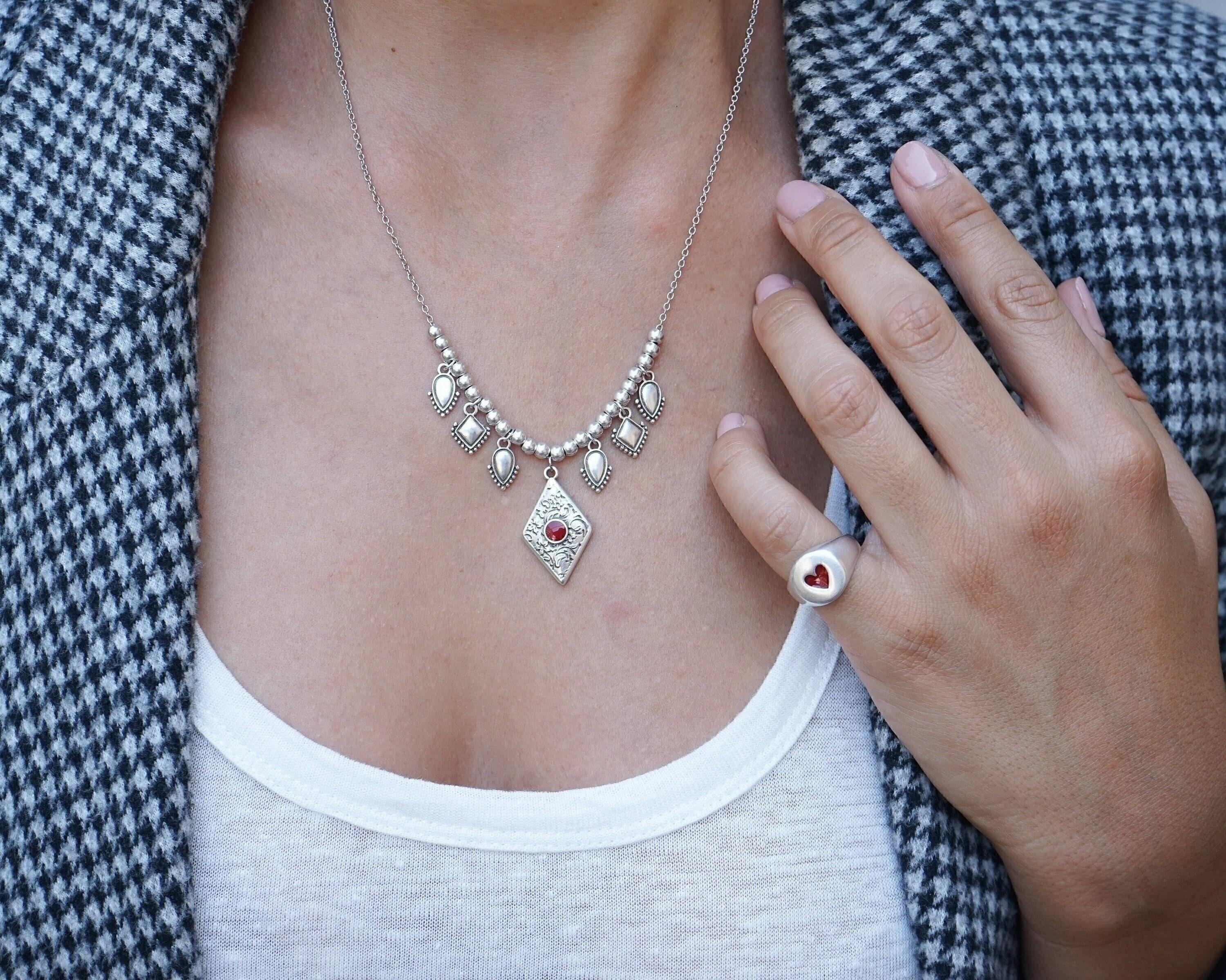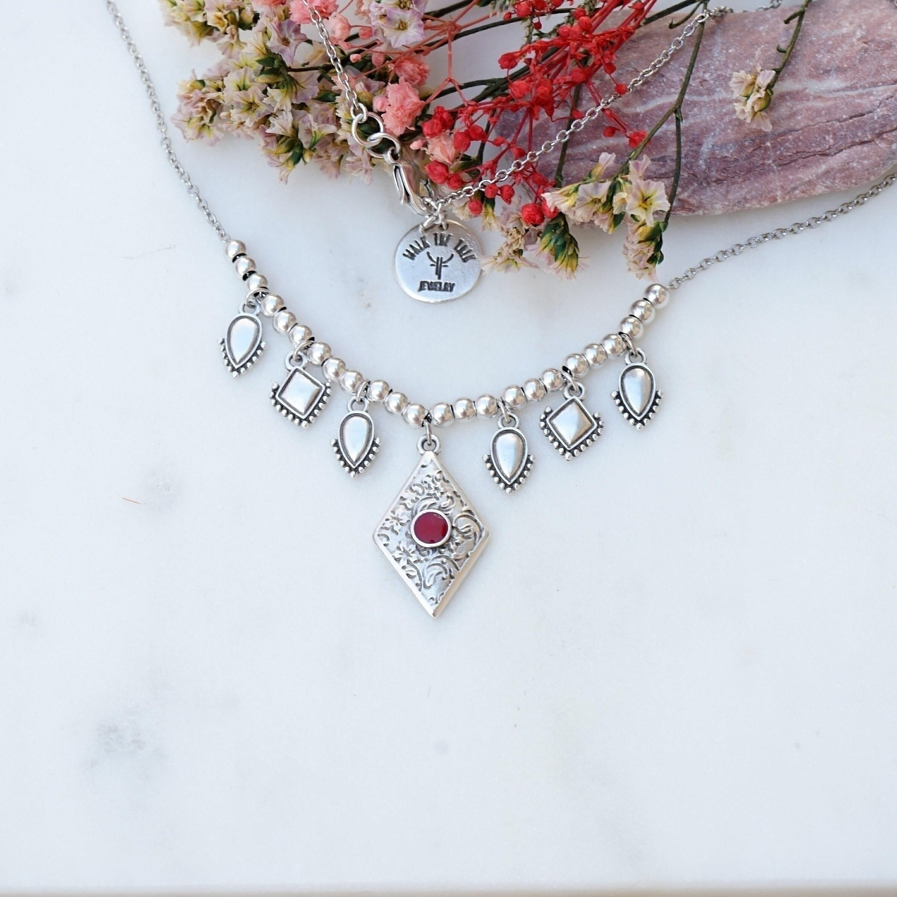 Embrace a touch of Turkish elegance with this Silver Chandelier Necklace, featuring a striking antique silver rhombus-shaped floral pendant adorned with a rich burgundy enamel centerpiece. The design is beautifully complemented by delicate teardrop-rhombus charms, which serve as charming tassels, adding movement and flair to your look. This necklace strikes a balance between simplicity and statement-making, allowing you to wear it on its own or layer it with other pieces to create a personalized style. Perfect for enhancing a bohemian or gypsy-inspired outfit, this exquisite jewelry will elevate your ensemble effortlessly. Crafted from high-quality materials, this necklace maintains its beauty and durability over time.