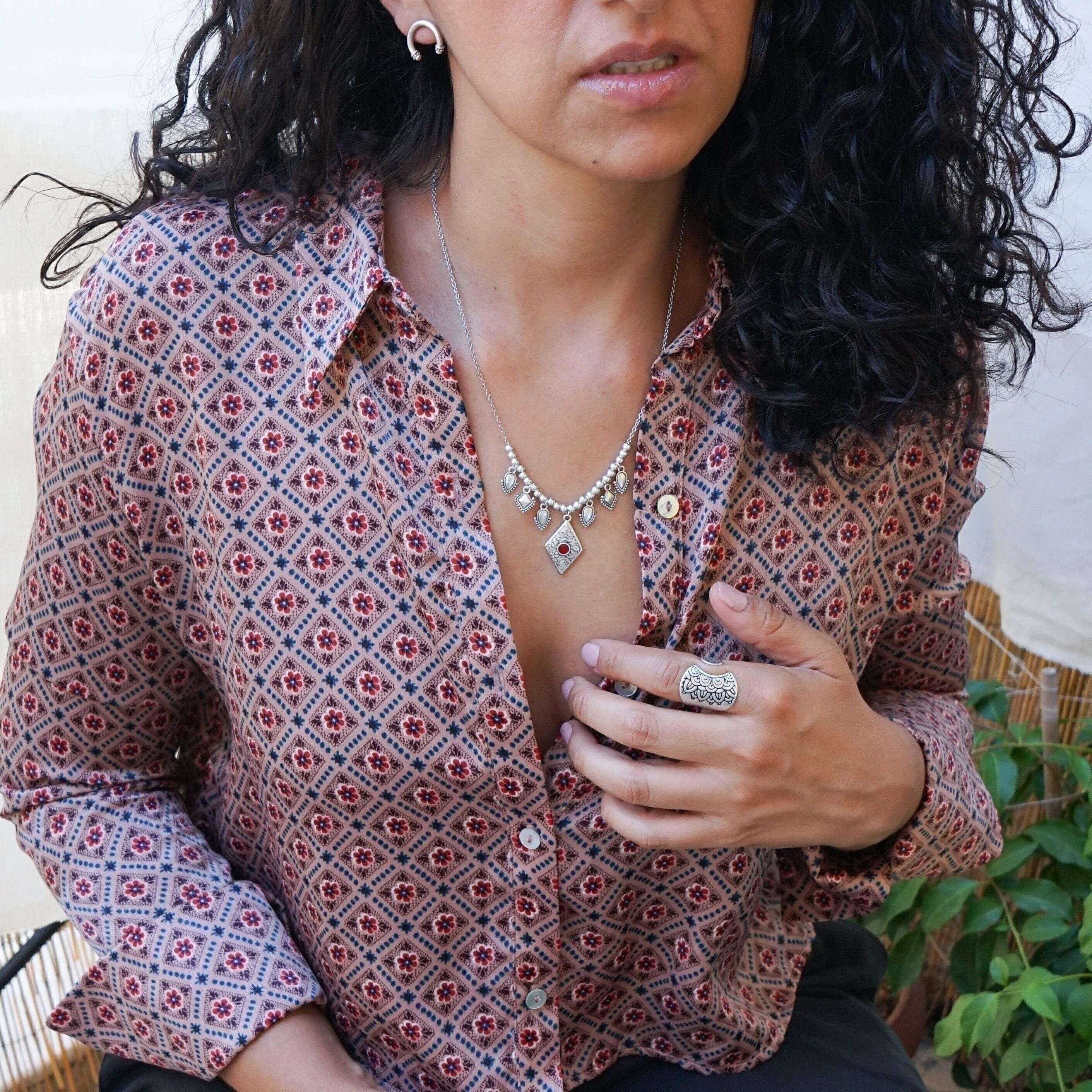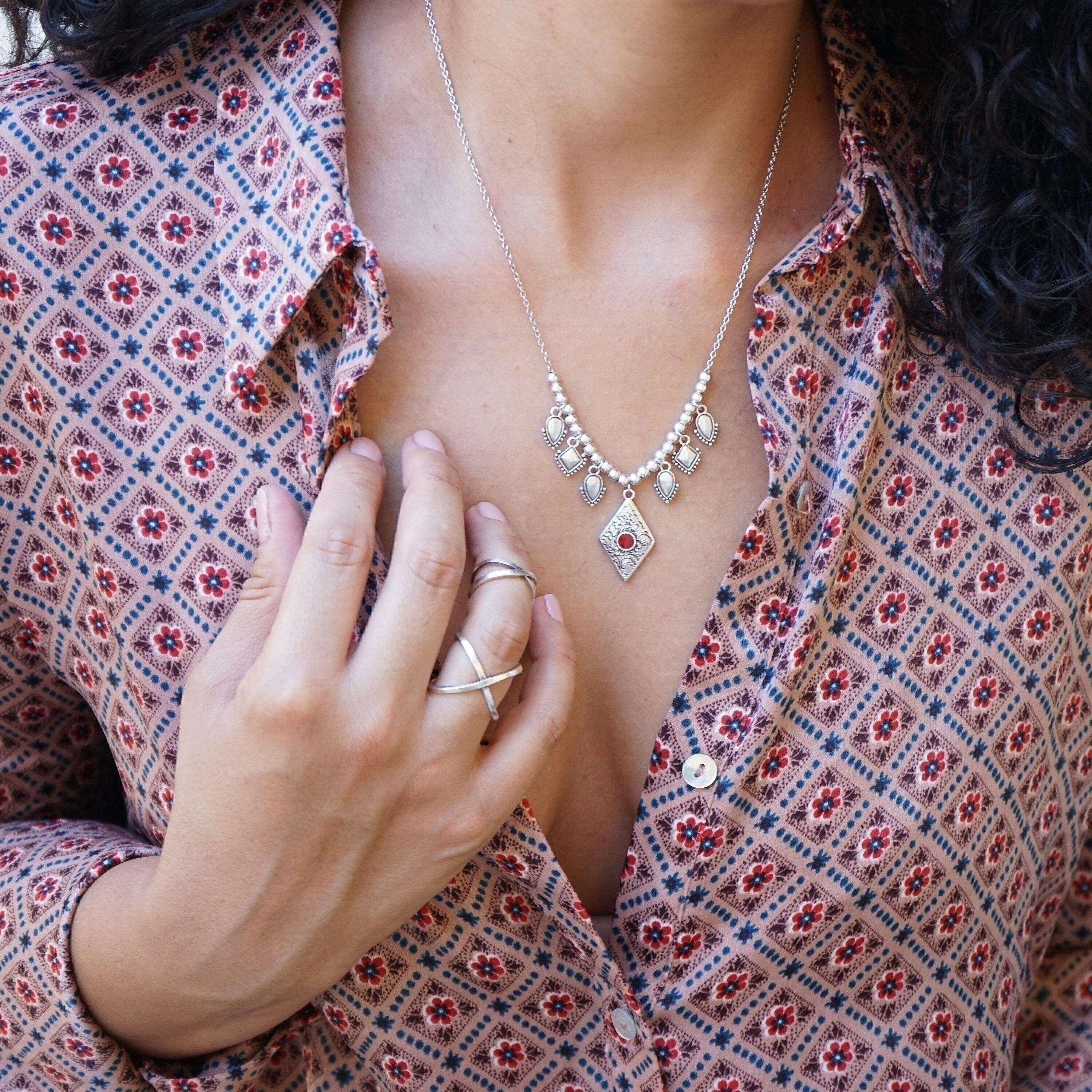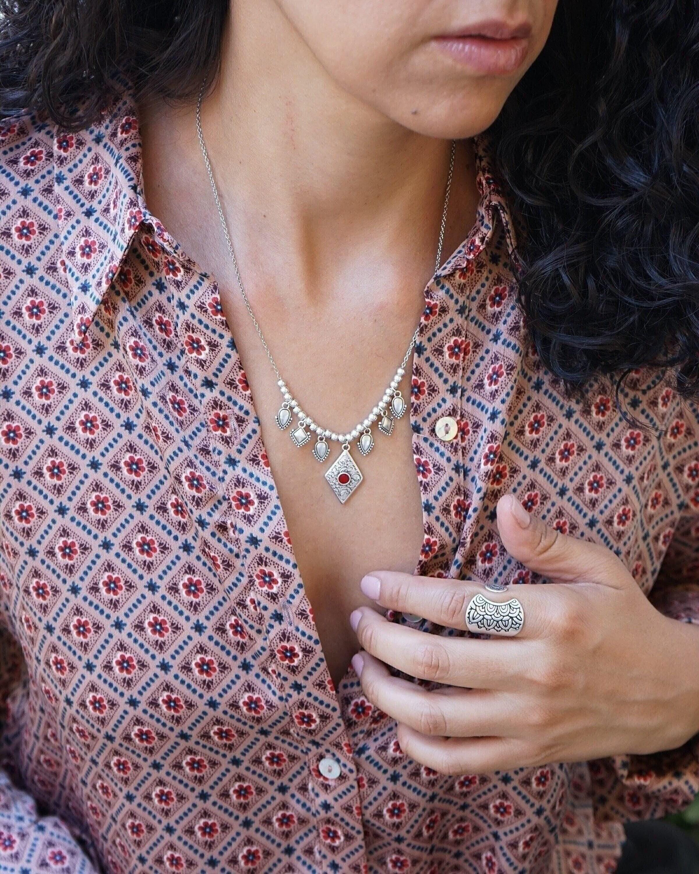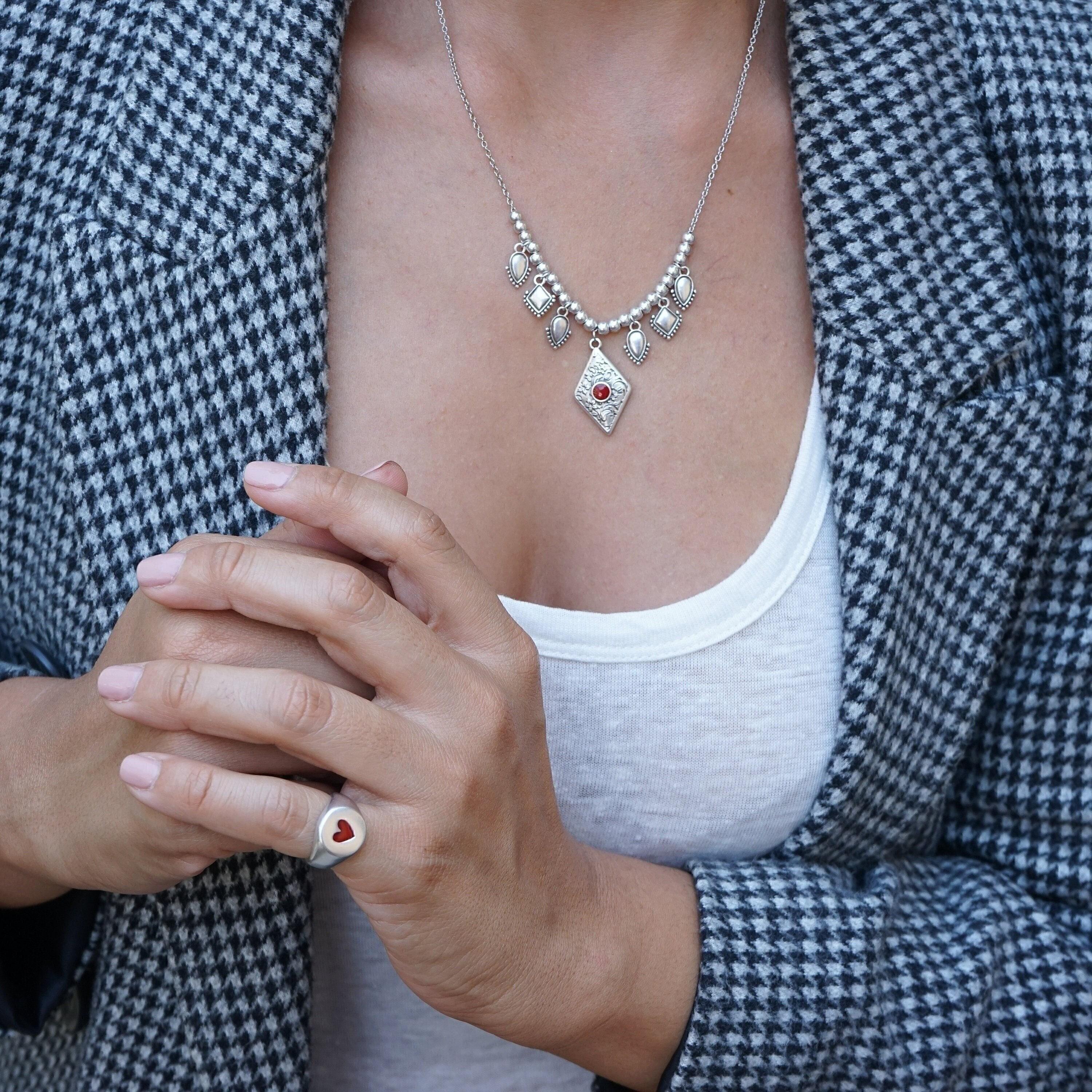 Embrace a touch of Turkish elegance with this Silver Chandelier Necklace, featuring a striking antique silver rhombus-shaped floral pendant adorned with a rich burgundy enamel centerpiece. The design is beautifully complemented by delicate teardrop-rhombus charms, which serve as charming tassels, adding movement and flair to your look. This necklace strikes a balance between simplicity and statement-making, allowing you to wear it on its own or layer it with other pieces to create a personalized style. Perfect for enhancing a bohemian or gypsy-inspired outfit, this exquisite jewelry will elevate your ensemble effortlessly. Crafted from high-quality materials, this necklace maintains its beauty and durability over time.
