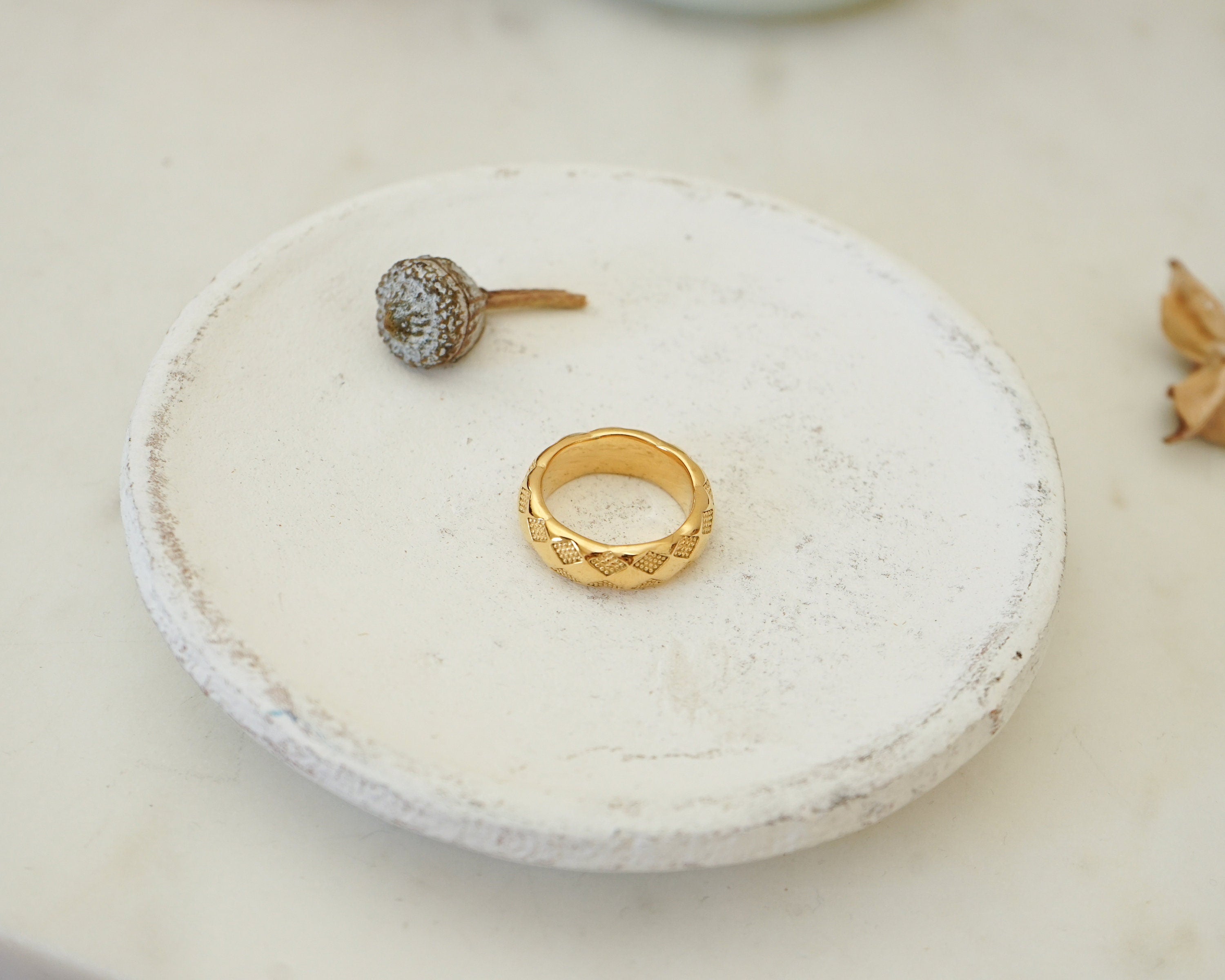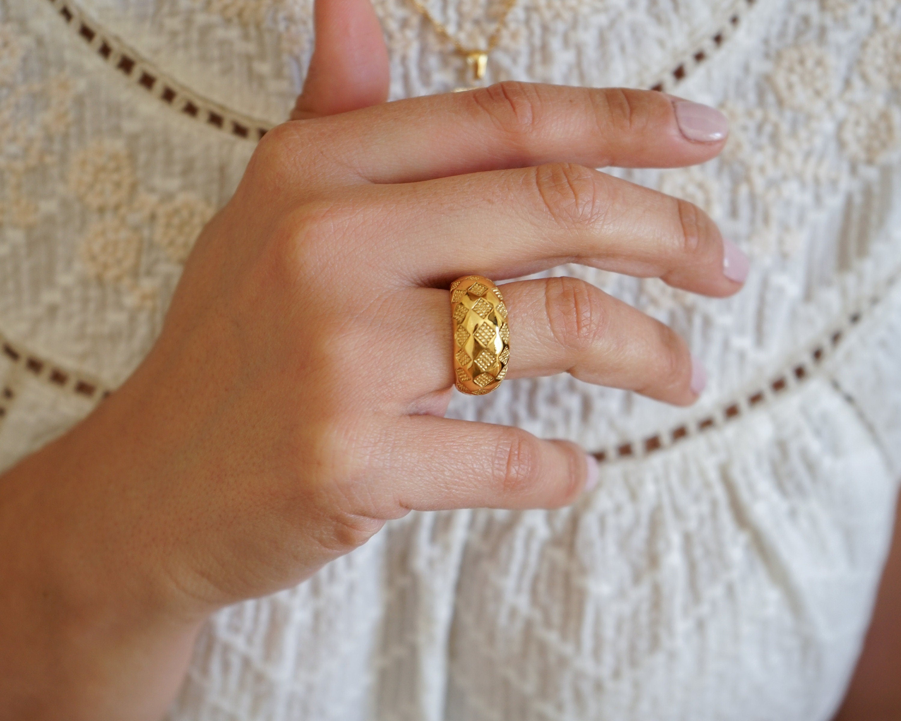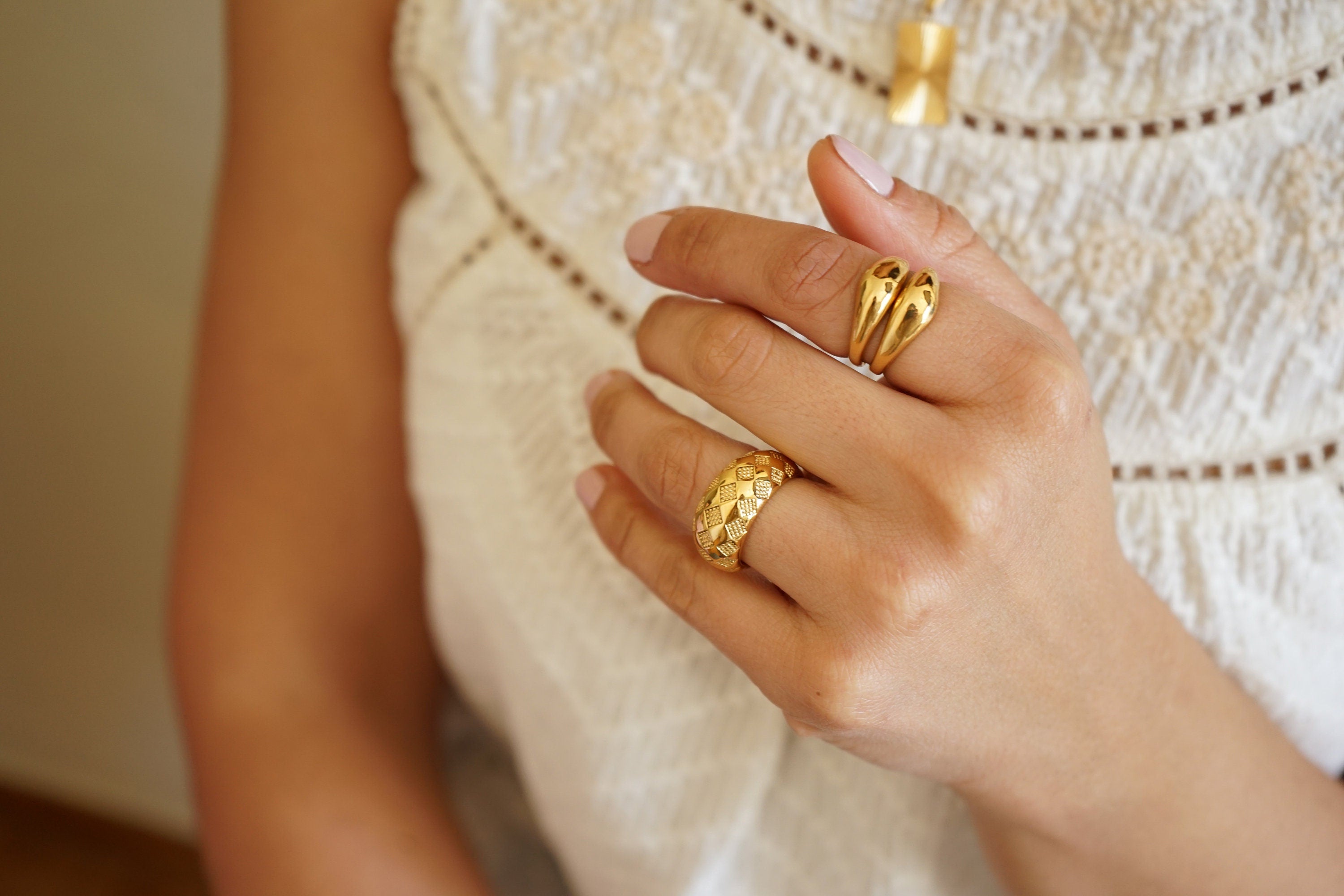 Discover a distinctive 18K gold-plated stainless steel ring featuring a striking rhombus pattern, available in two elegant designs. This statement band can be effortlessly worn on your index, middle, or ring finger, adding a touch of sophistication to any ensemble.