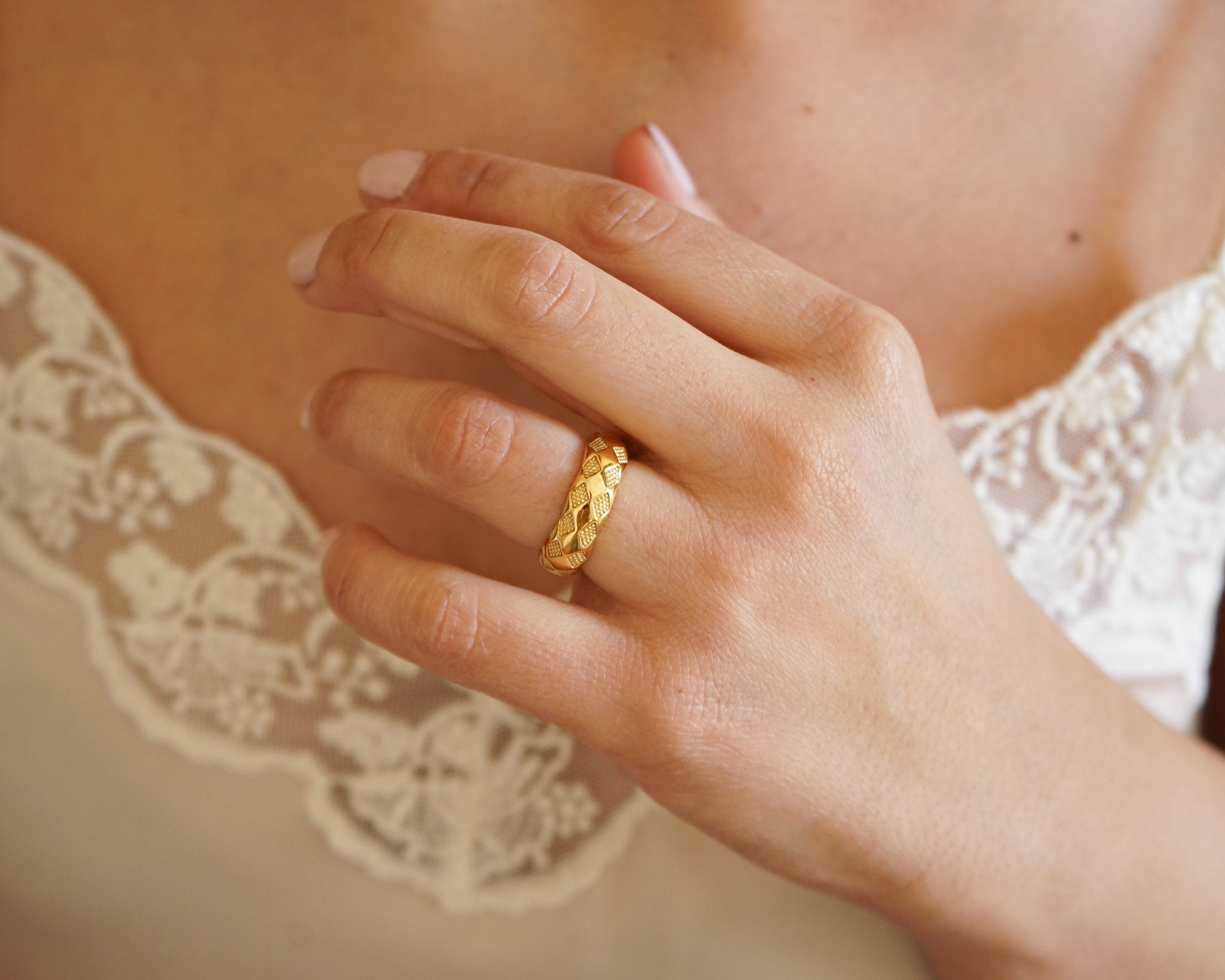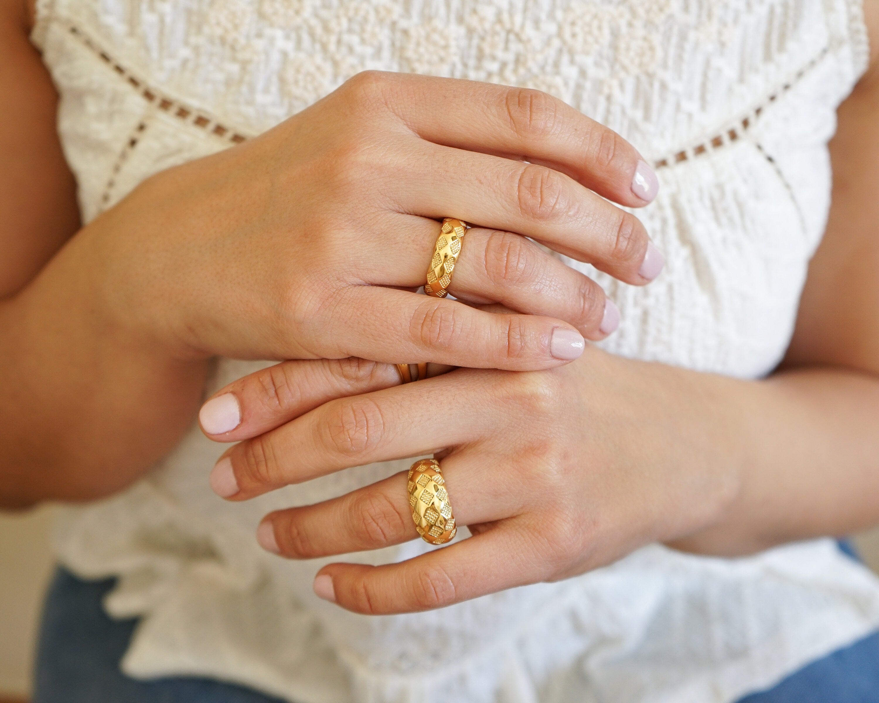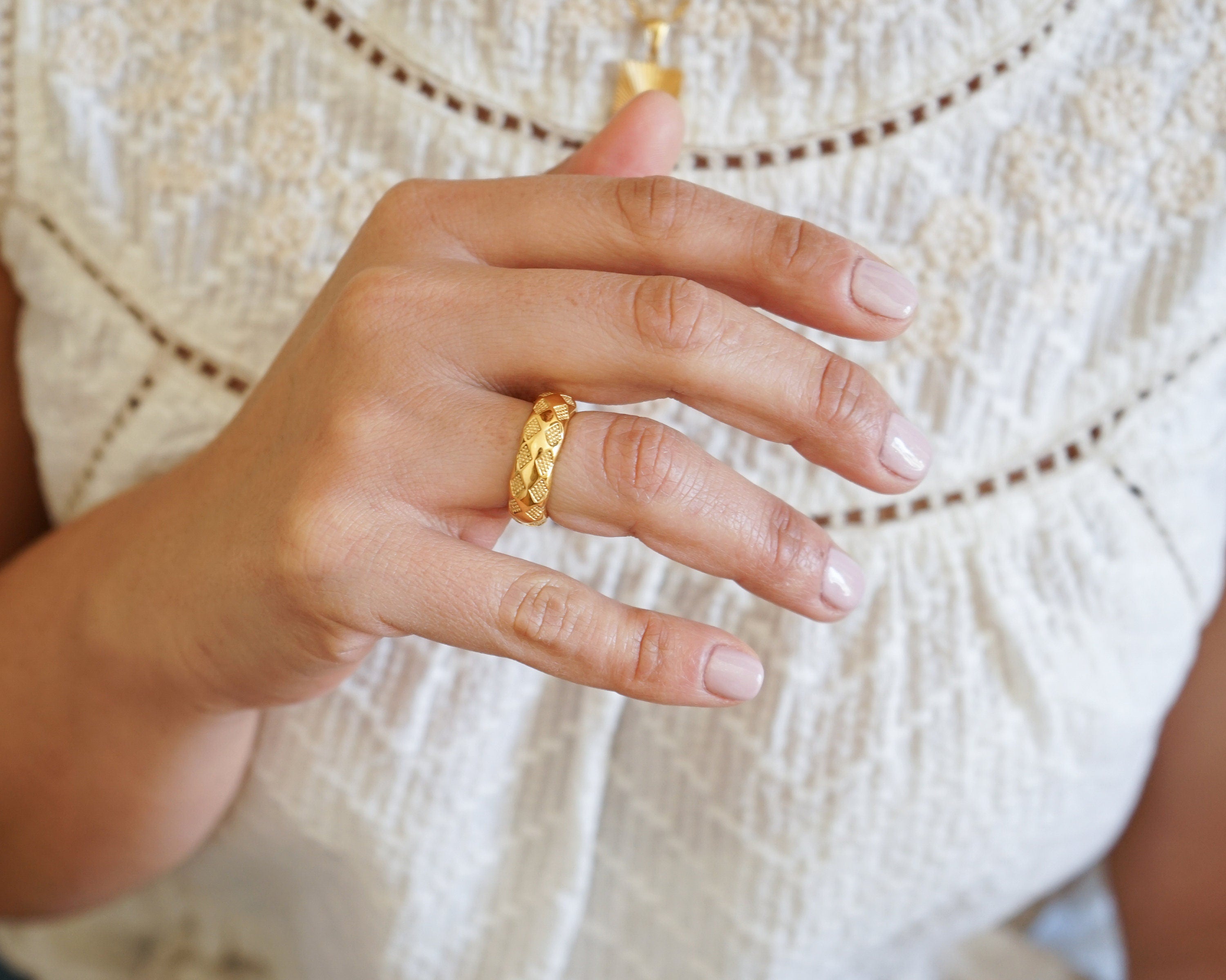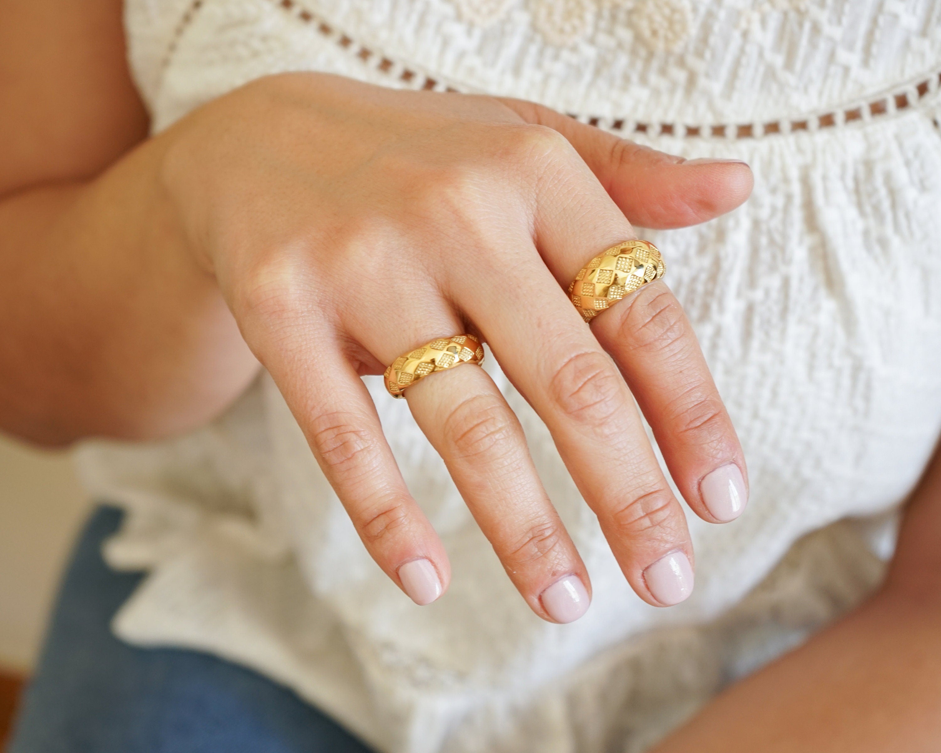 Discover a distinctive 18K gold-plated stainless steel ring featuring a striking rhombus pattern, available in two elegant designs. This statement band can be effortlessly worn on your index, middle, or ring finger, adding a touch of sophistication to any ensemble.