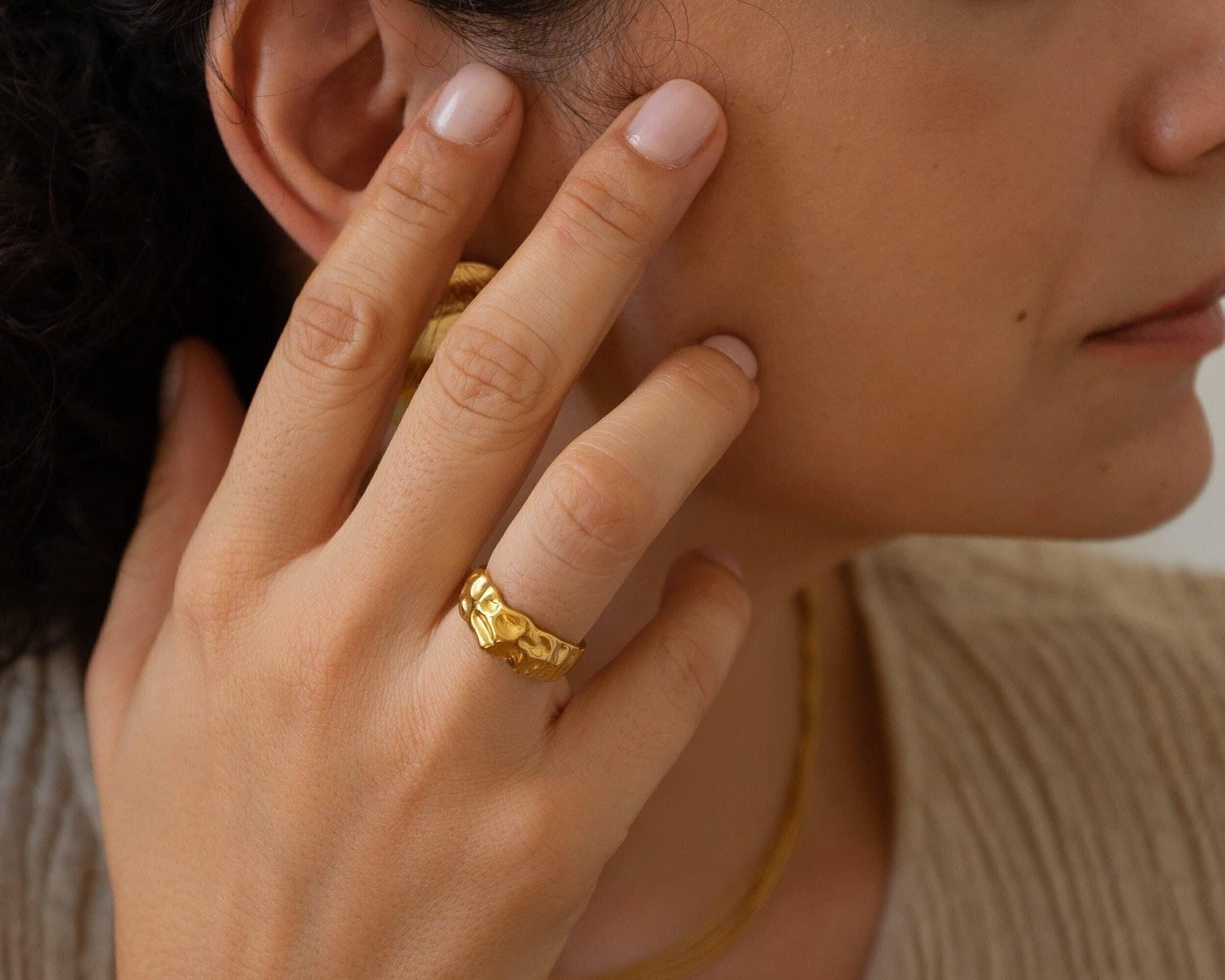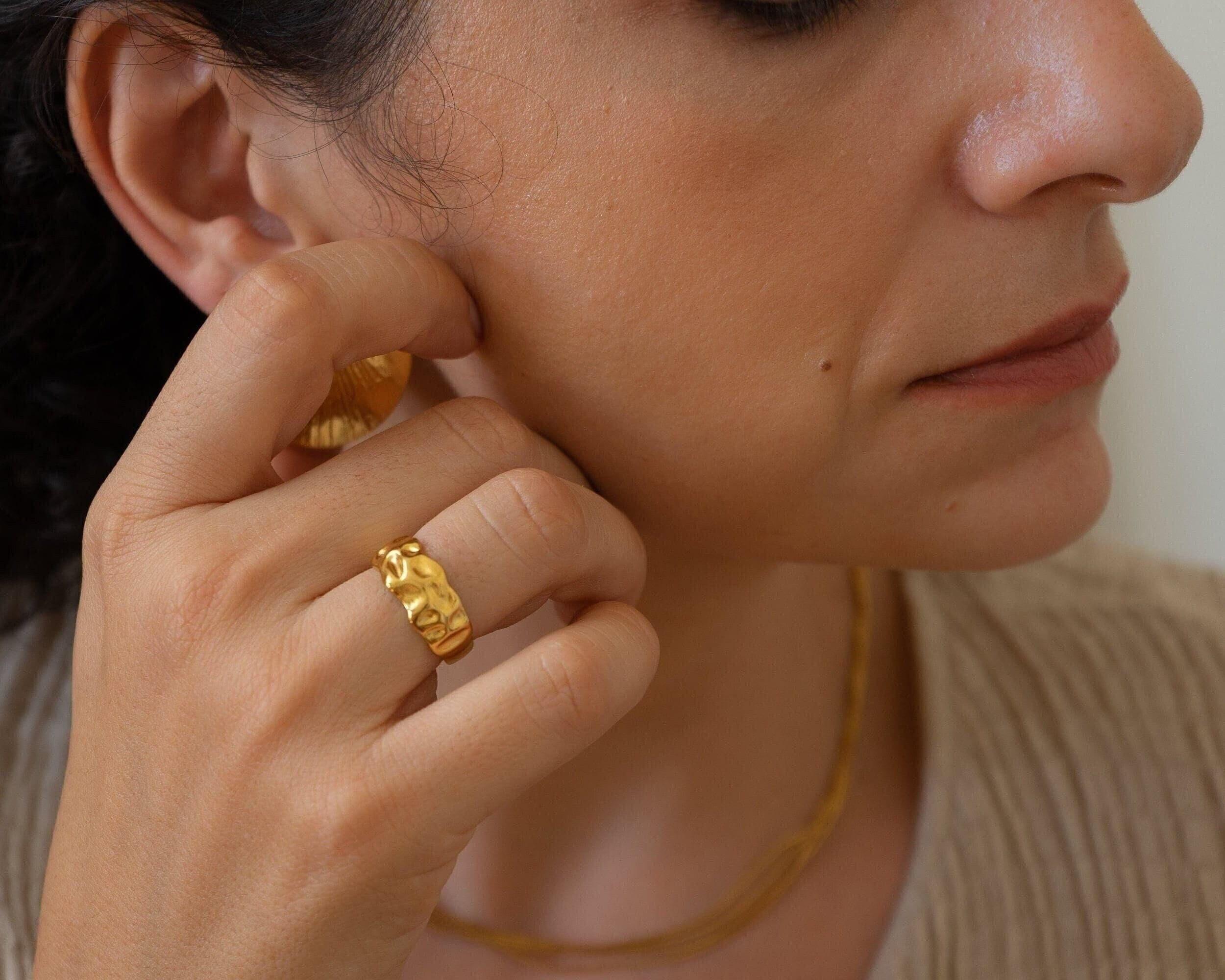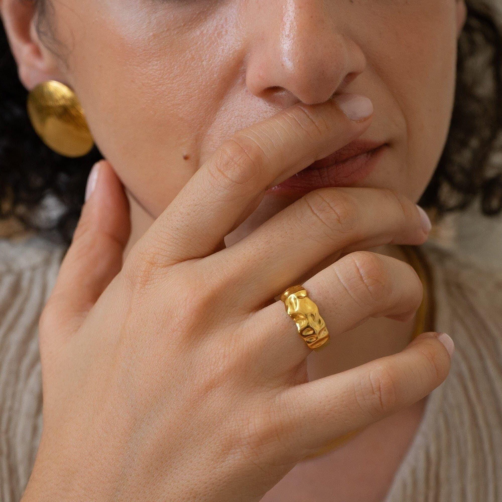 A unique 18K gold plated stainless steel statement HAMMERED ring, with a textured surface.