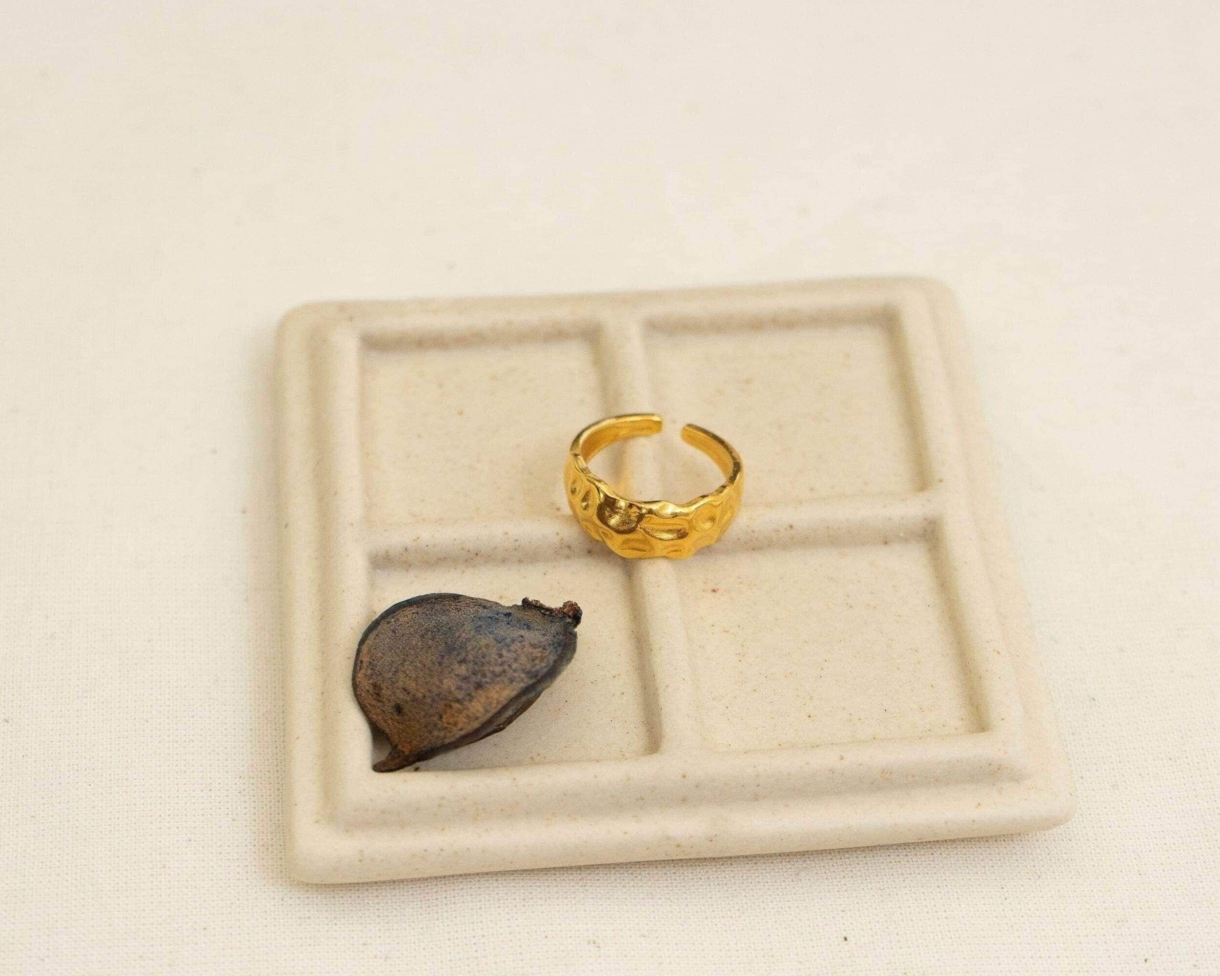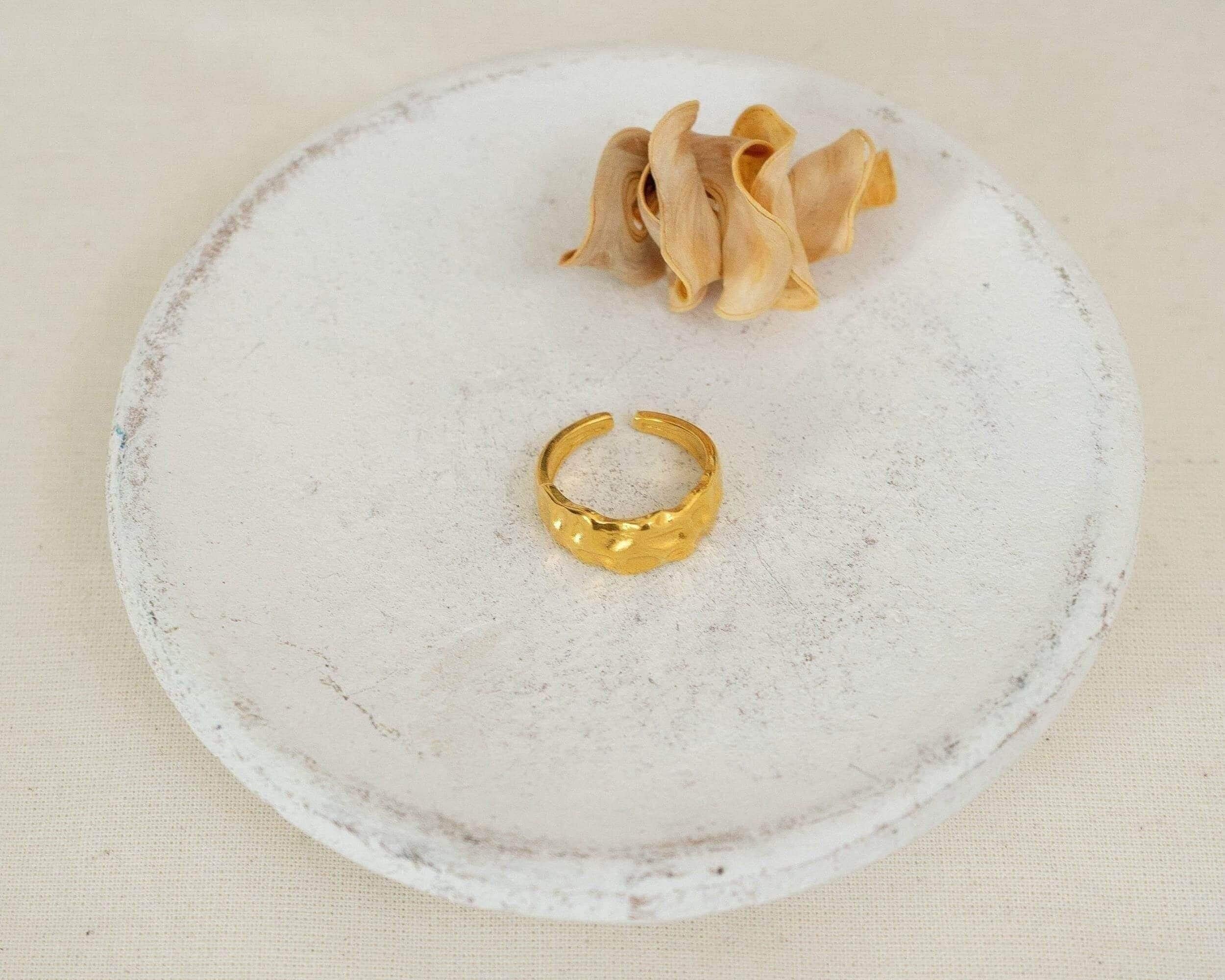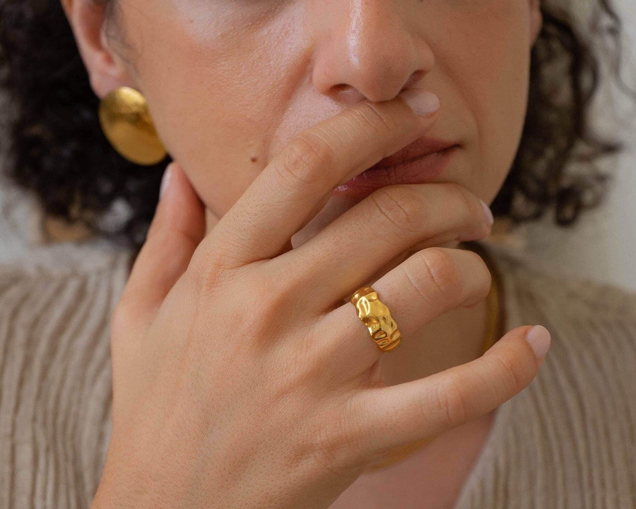 A unique 18K gold plated stainless steel statement HAMMERED ring, with a textured surface.