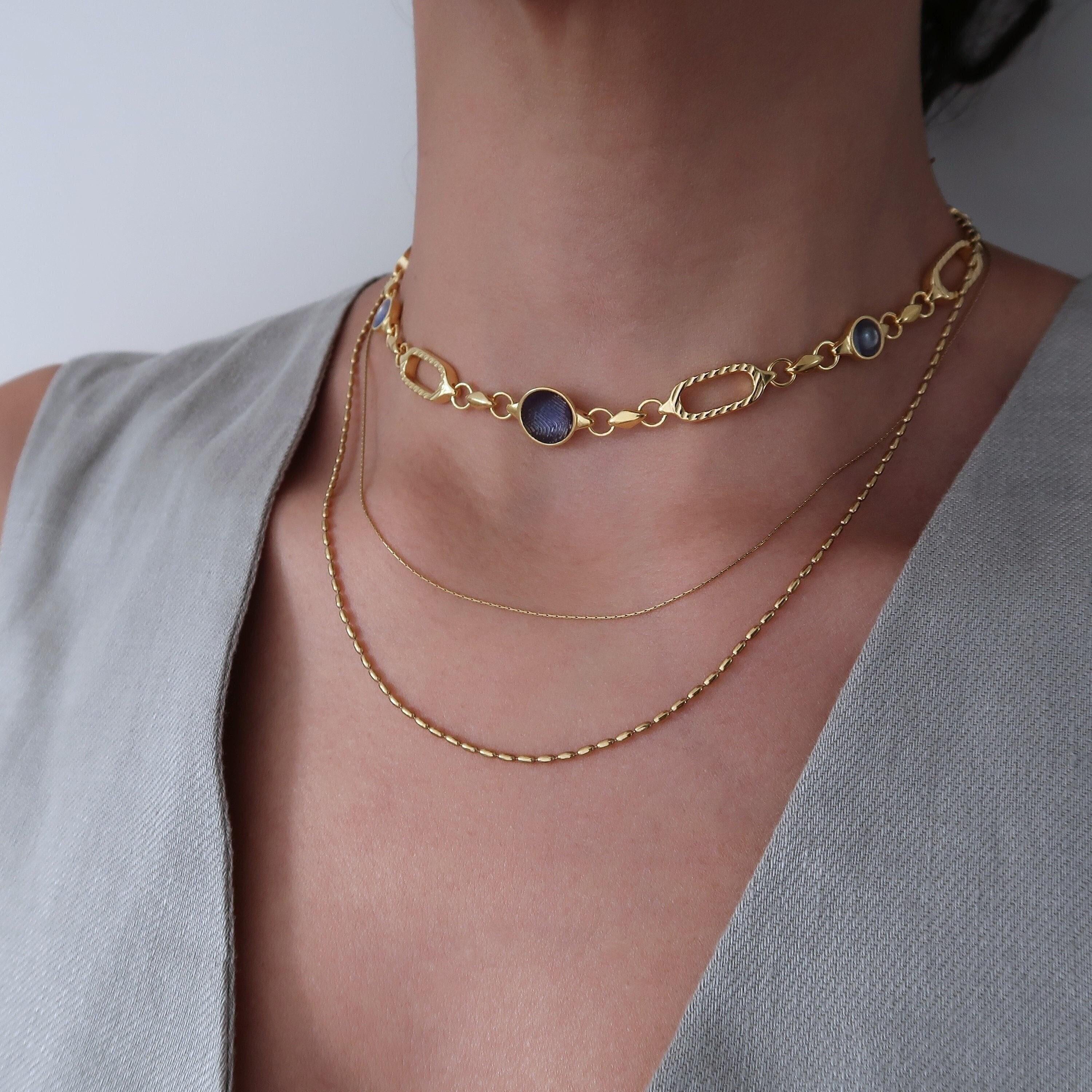 This striking choker necklace features a thick chain adorned with rectangular connectors that showcase delicate lines, complemented by a solid round connector embellished with blue enamel at its center. The design exudes a contemporary rock aesthetic, making it a versatile accessory that can be worn alone or layered with other pieces for a more personalized look. Its modern vibe is perfect for enhancing your style.