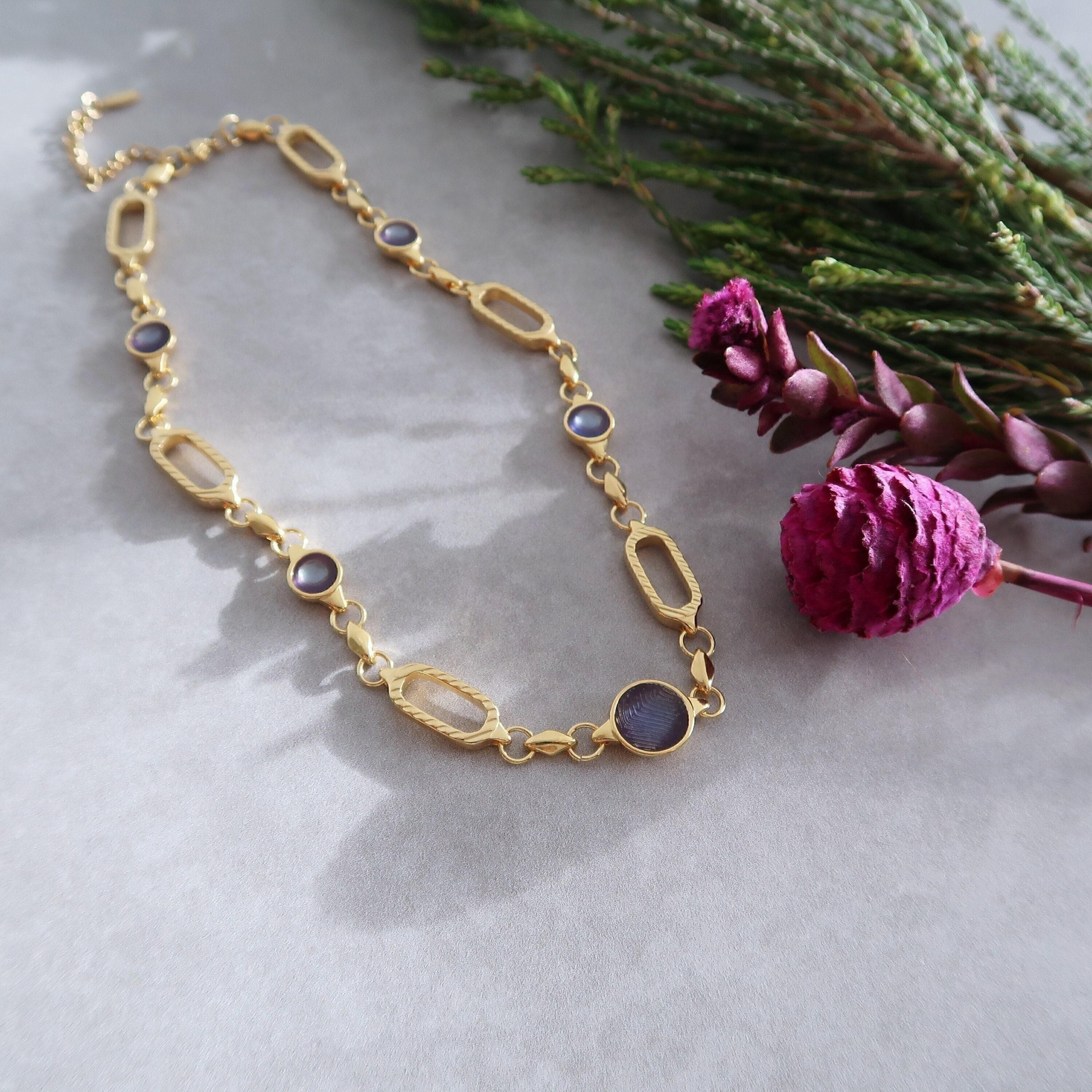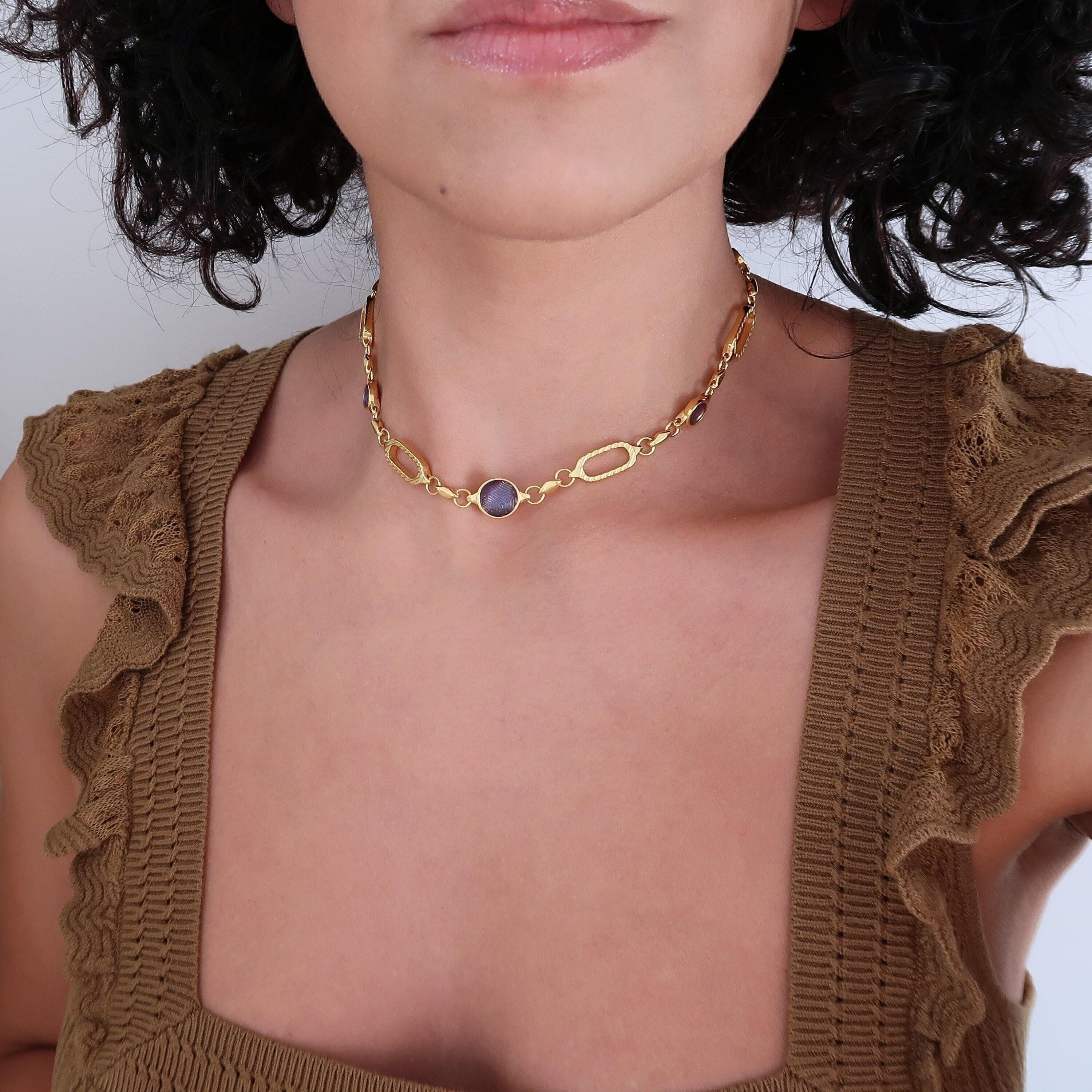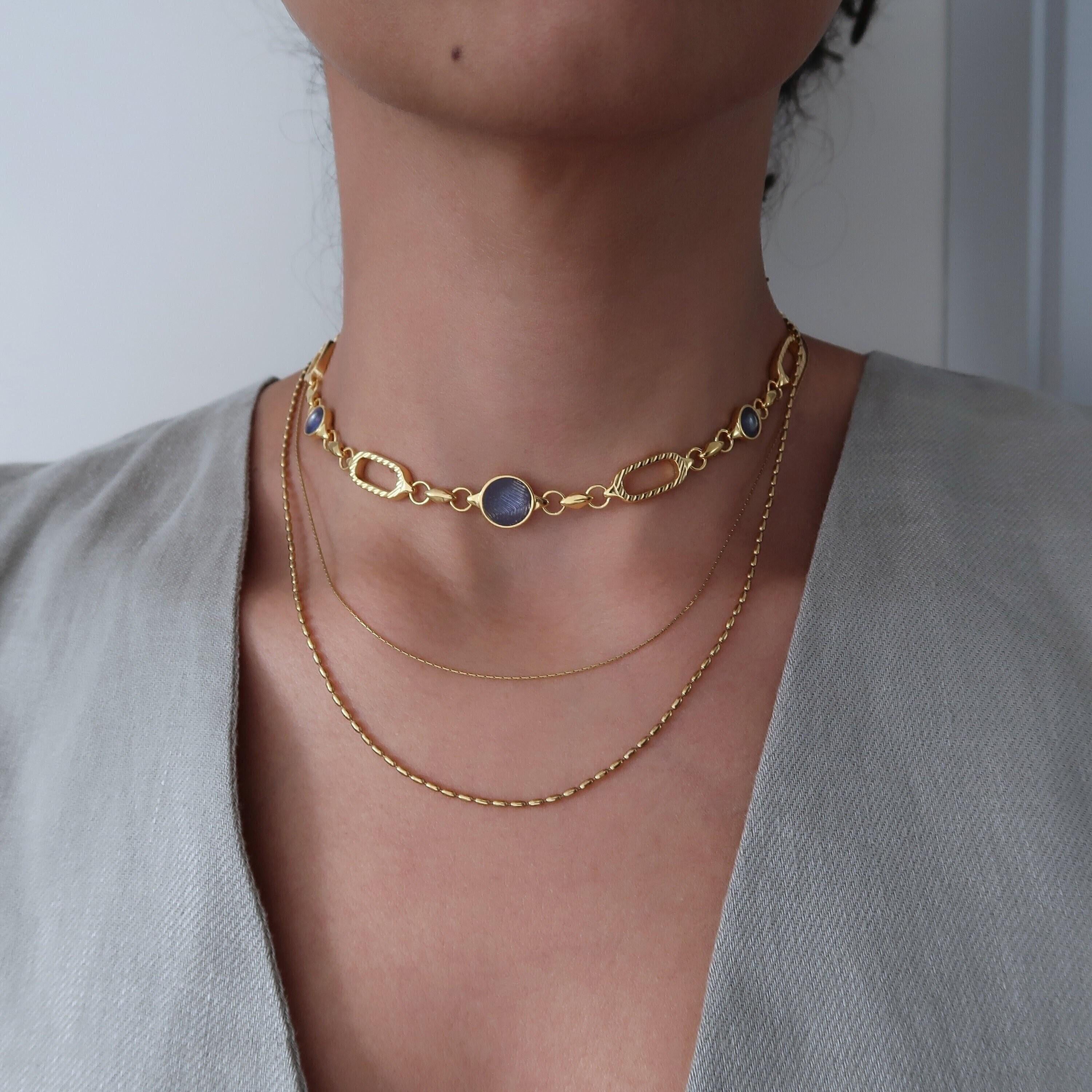 Gold Rectangular Chain Choker with Lines and Blue Enamel Connectors