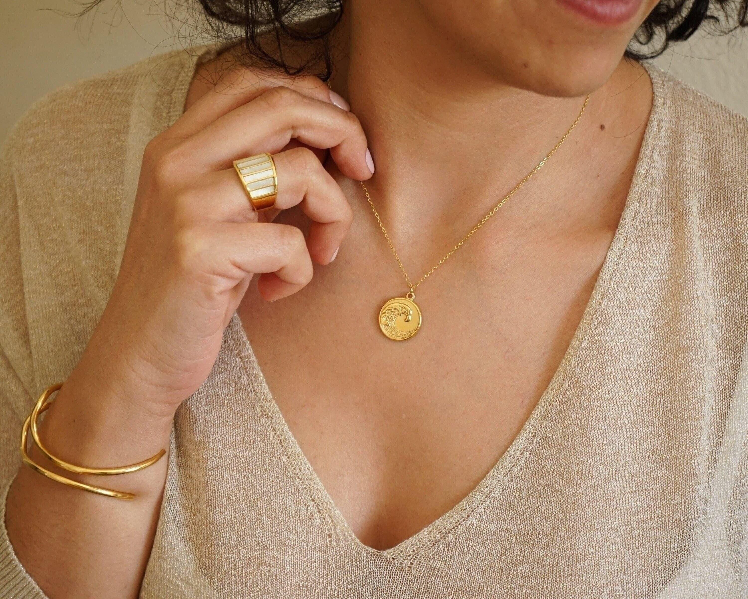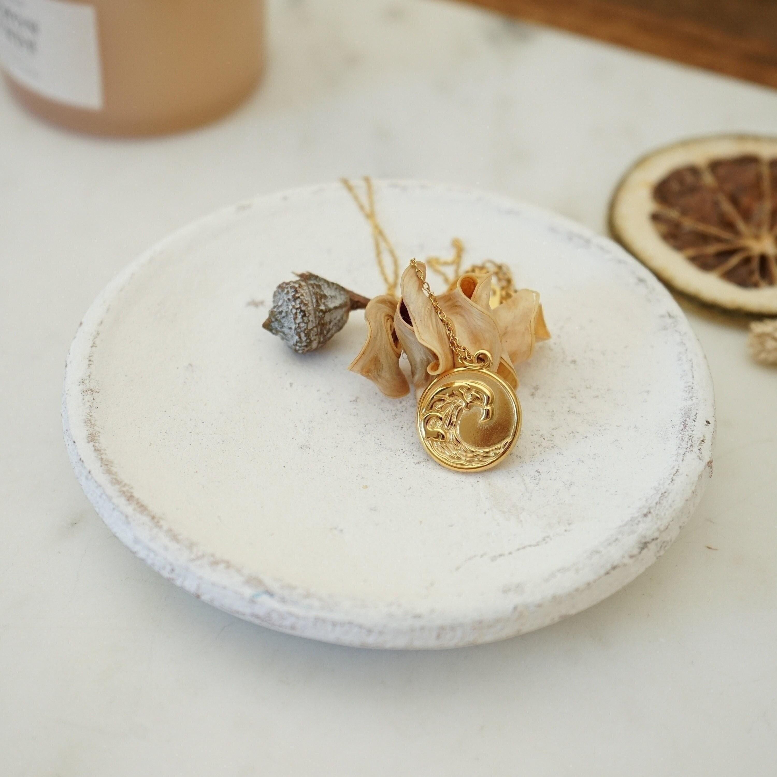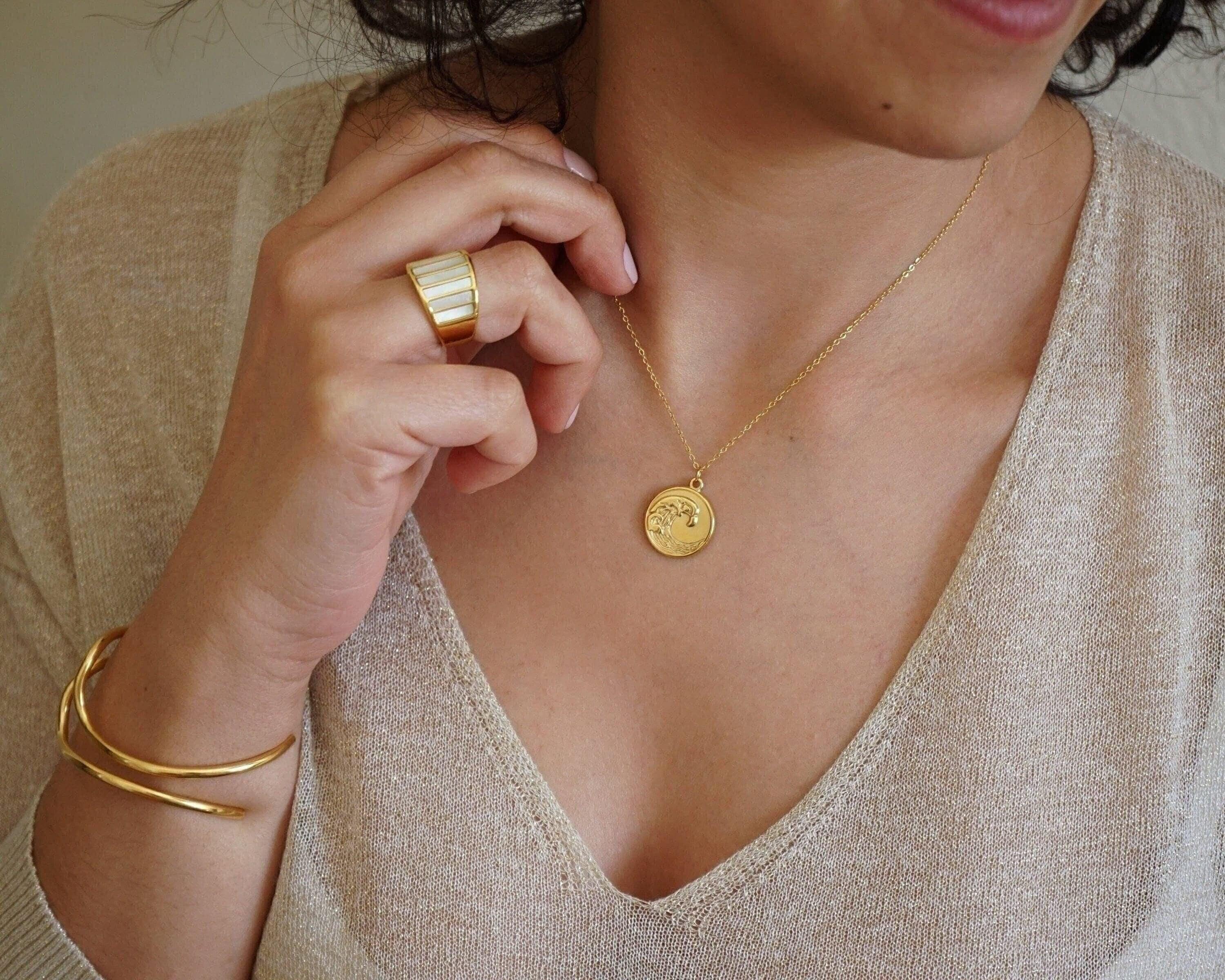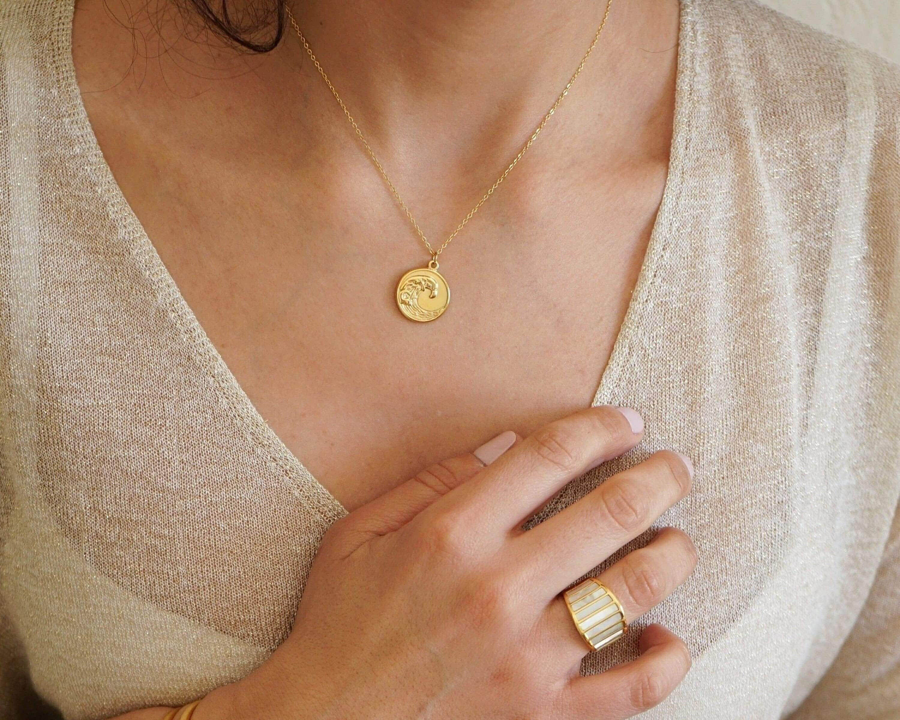 Introducing a beautifully crafted gold pendant necklace featuring a unique embossed wave design at its center, drawing inspiration from the traditional Ukiyo-E art style. The pendant is elegantly suspended from a durable stainless steel chain, ensuring that it maintains its luster over time. Crafted from high-quality materials, this necklace is tarnish-free and waterproof, making it perfect for everyday wear.