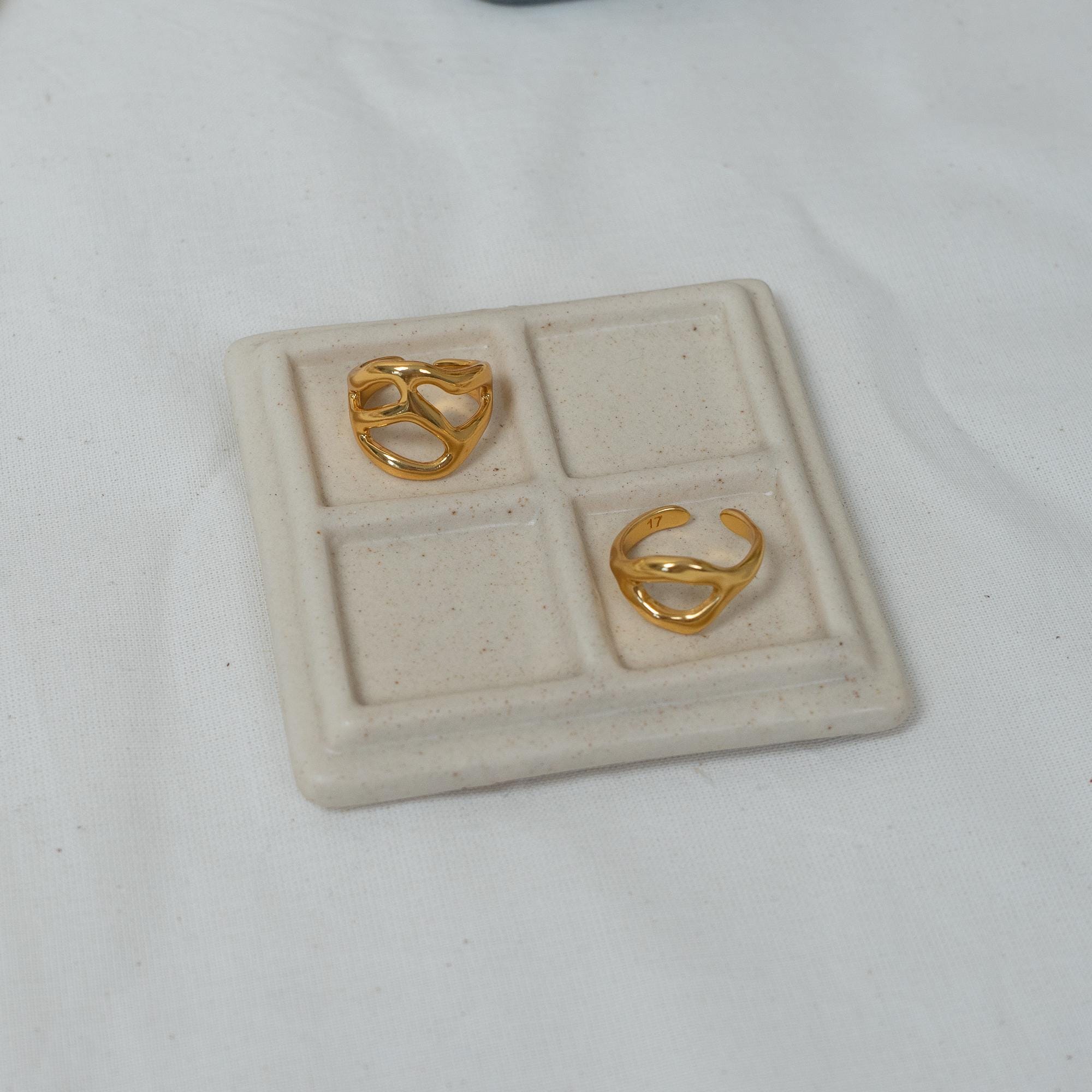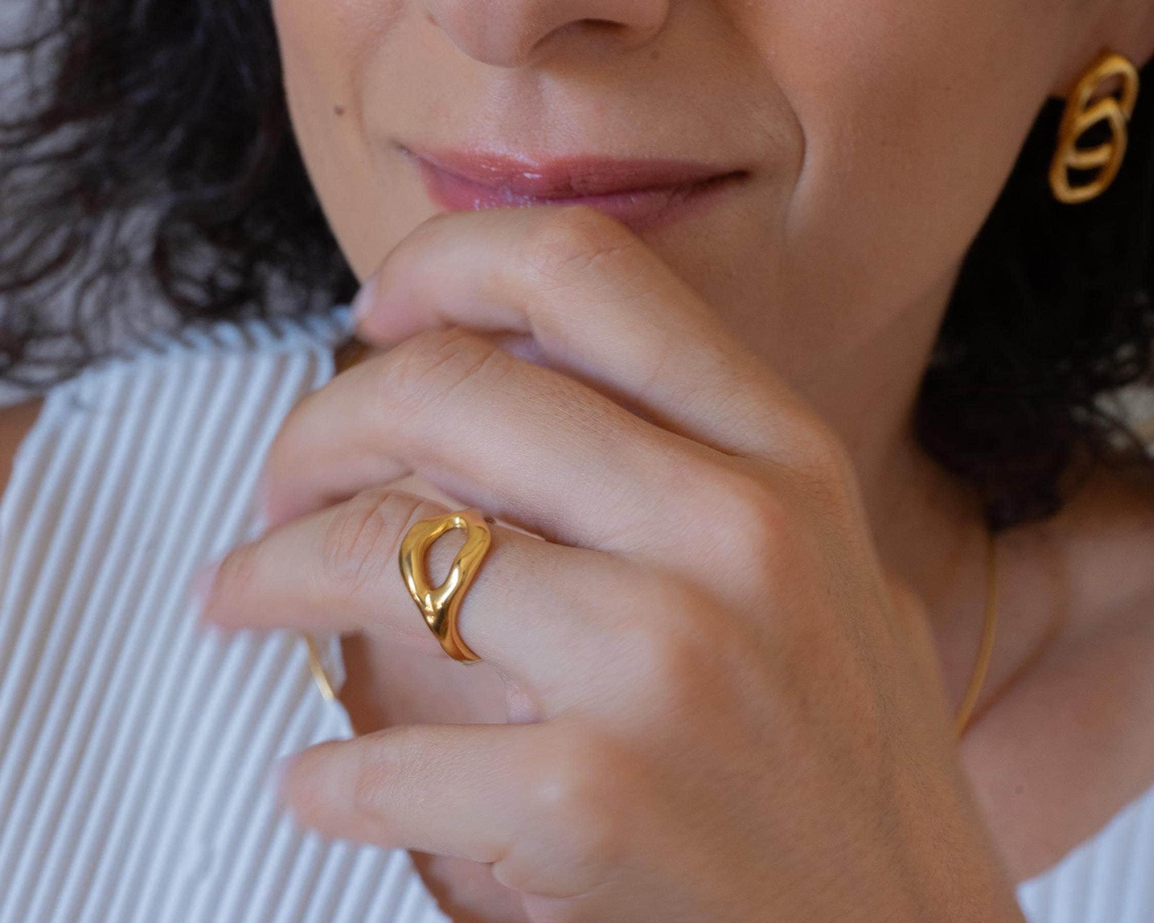 Discover the allure of our 24K gold plated soft asymmetric ring, a stunning accessory that stands out whether worn alone or beautifully layered with other rings for a stacked look. Available in two distinct designs, this piece showcases an irregular and unique shape, ensuring it will be a timeless addition to your jewelry collection.