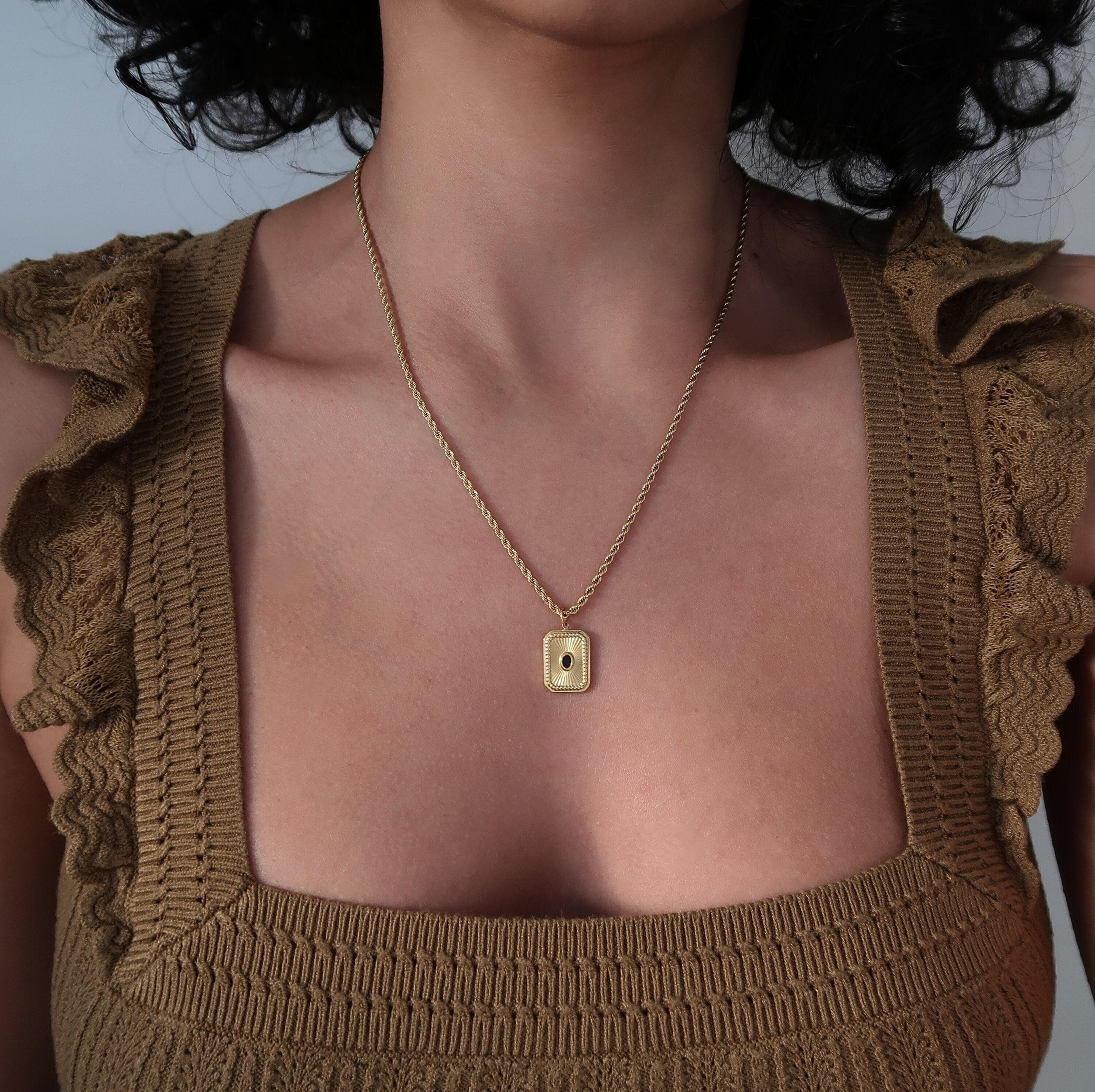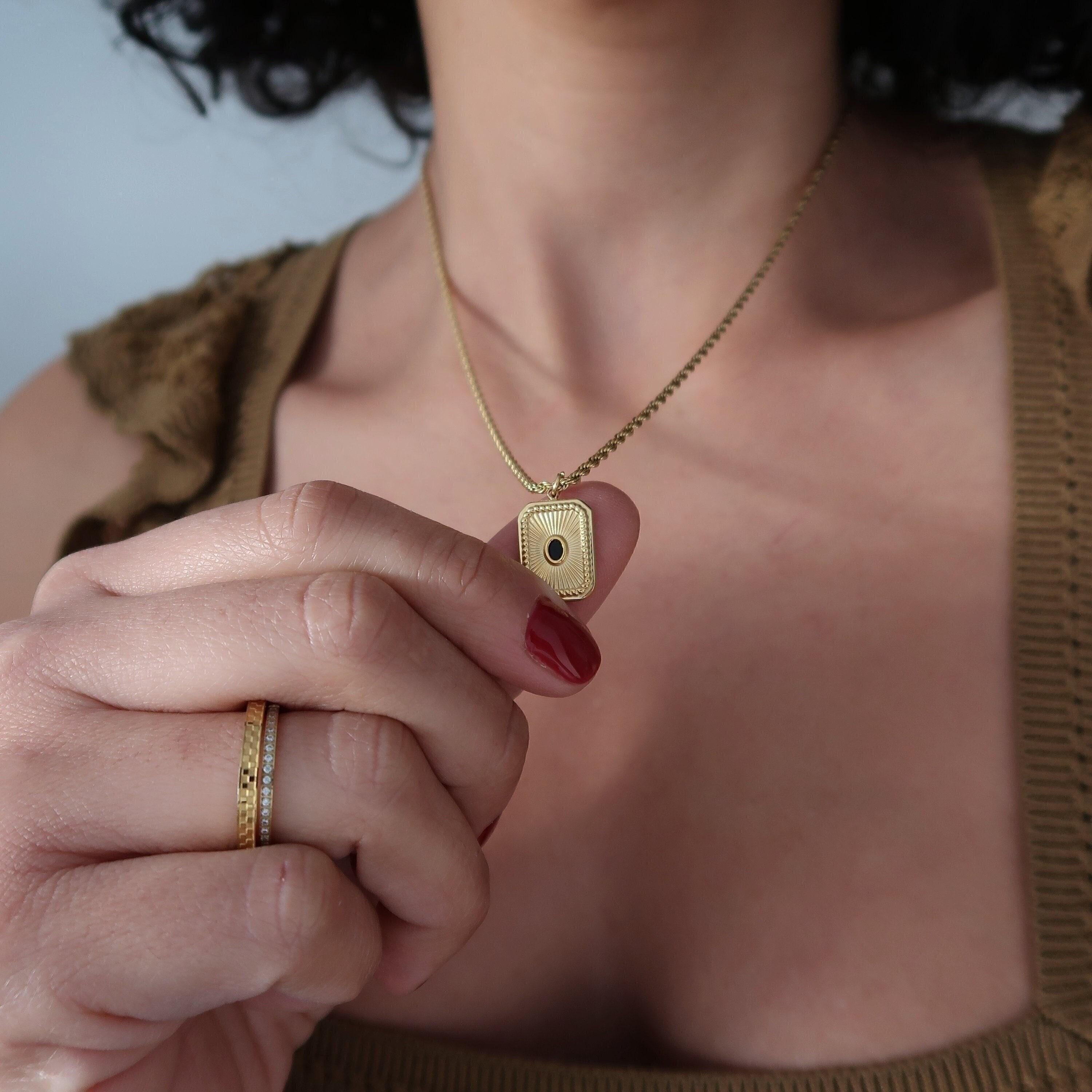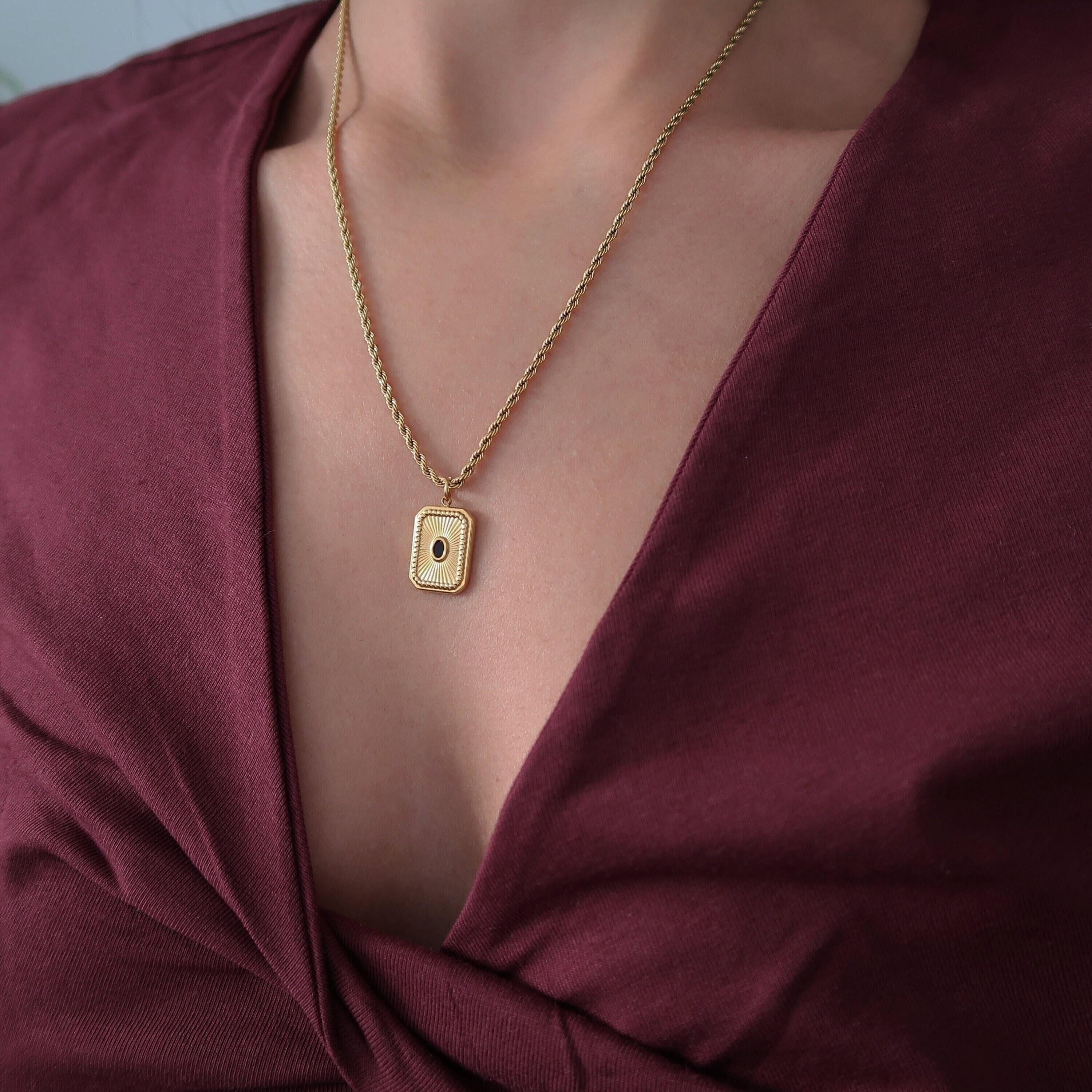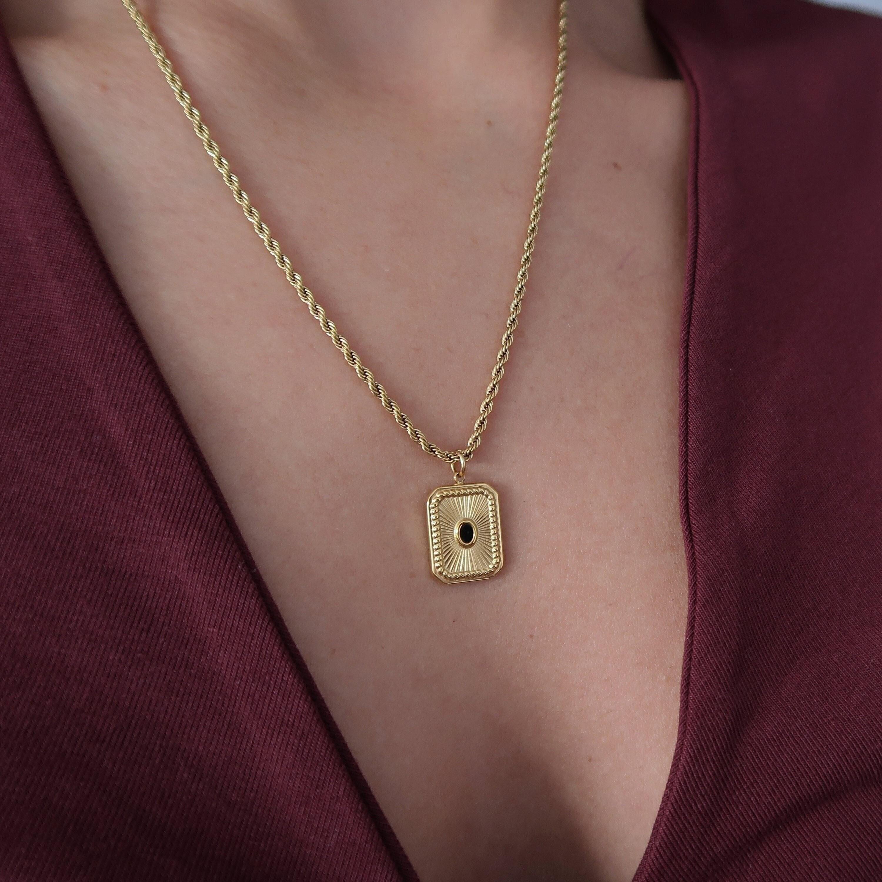 Discover a striking gold pendant adorned with black enamel, elegantly suspended from a stainless steel twisted rope chain. This dainty necklace adds a touch of color and sophistication to any layered look, making it a versatile accessory for every occasion. Crafted from durable materials, this piece is designed to maintain its beauty without fading or wearing off.