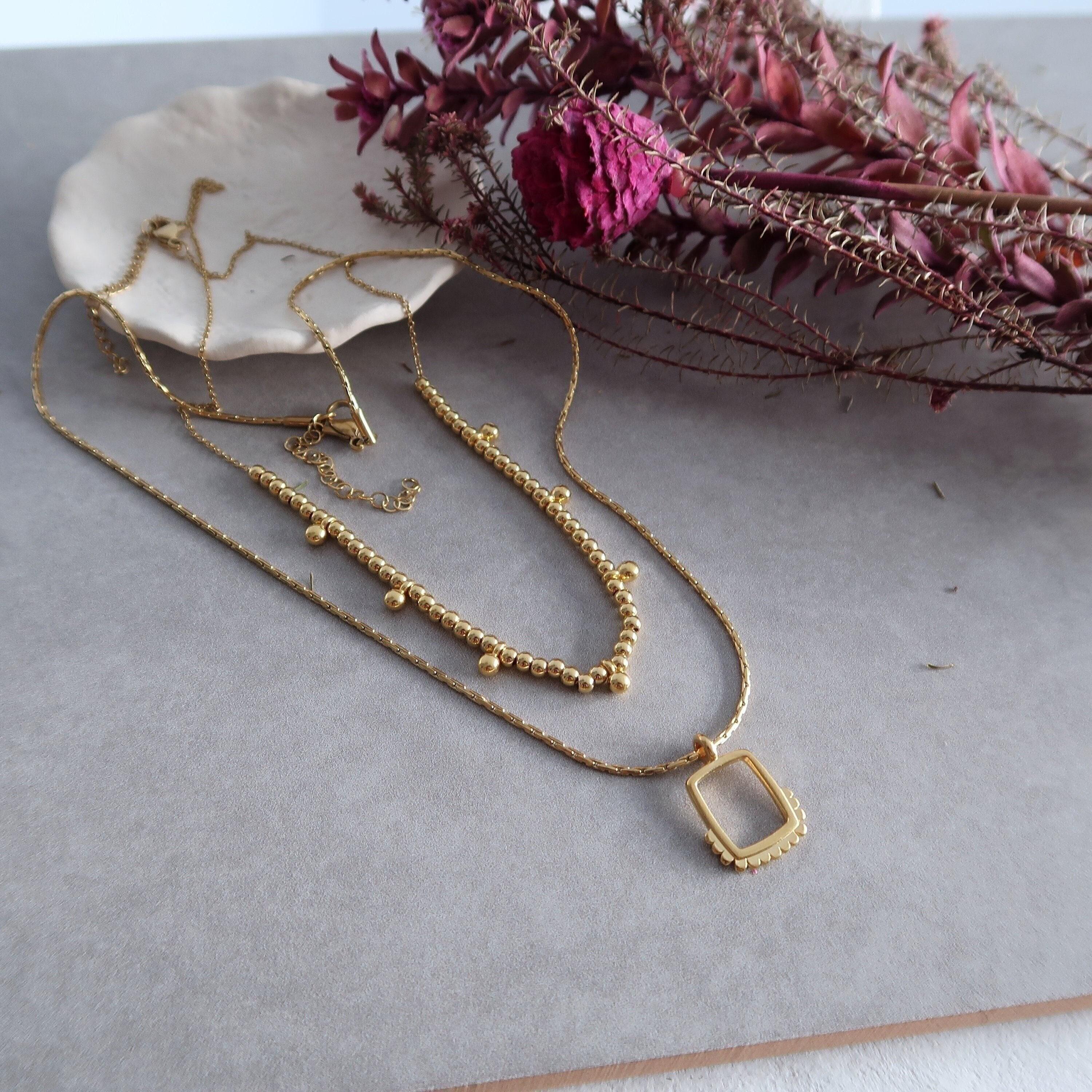 Elevate your accessory collection with this stunning set of two gold geometric necklaces. The first piece features a hollow square pendant, while the second showcases a chic ball-beaded choker, both designed to create a modern and fresh aesthetic.