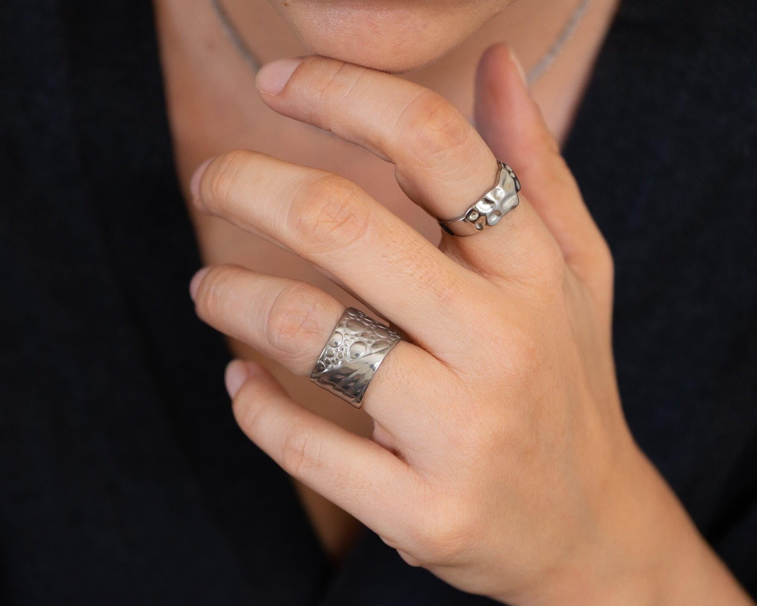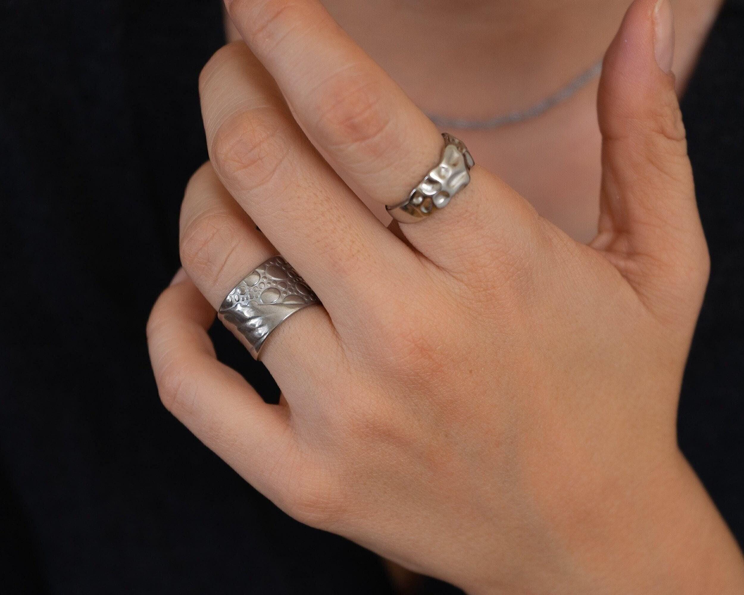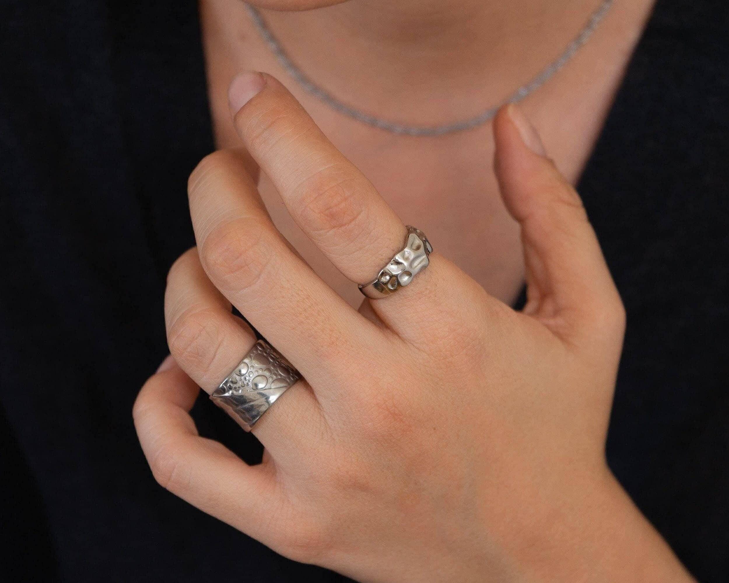 Discover a distinctive silver stainless steel ring featuring a unique textured surface inspired by bubbles. This versatile ring is designed to be worn on your index, middle, or ring finger, making it a flexible choice for any occasion. Its irregular shape adds a striking element to your jewelry collection, allowing it to stand out whether worn alone or stacked with other rings.