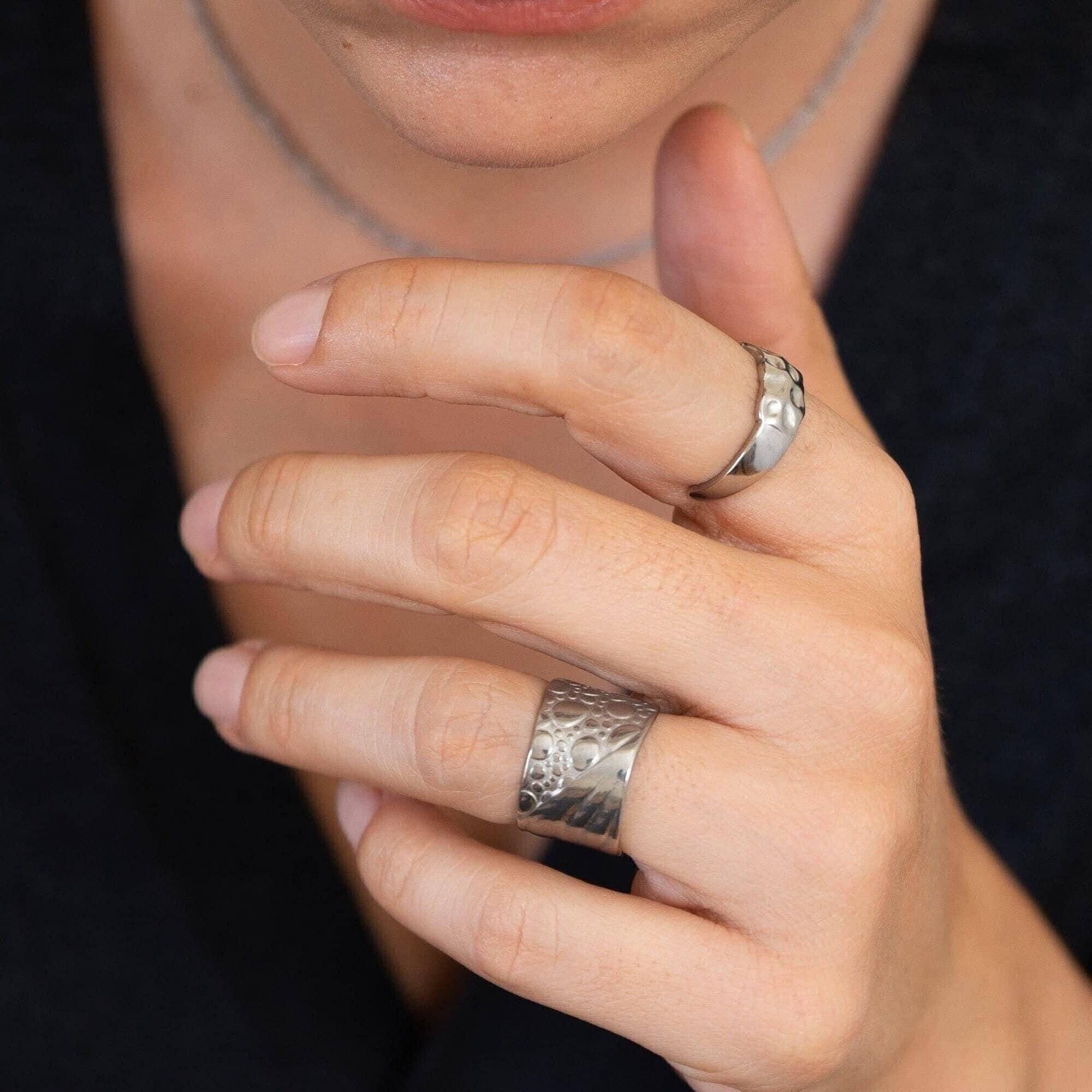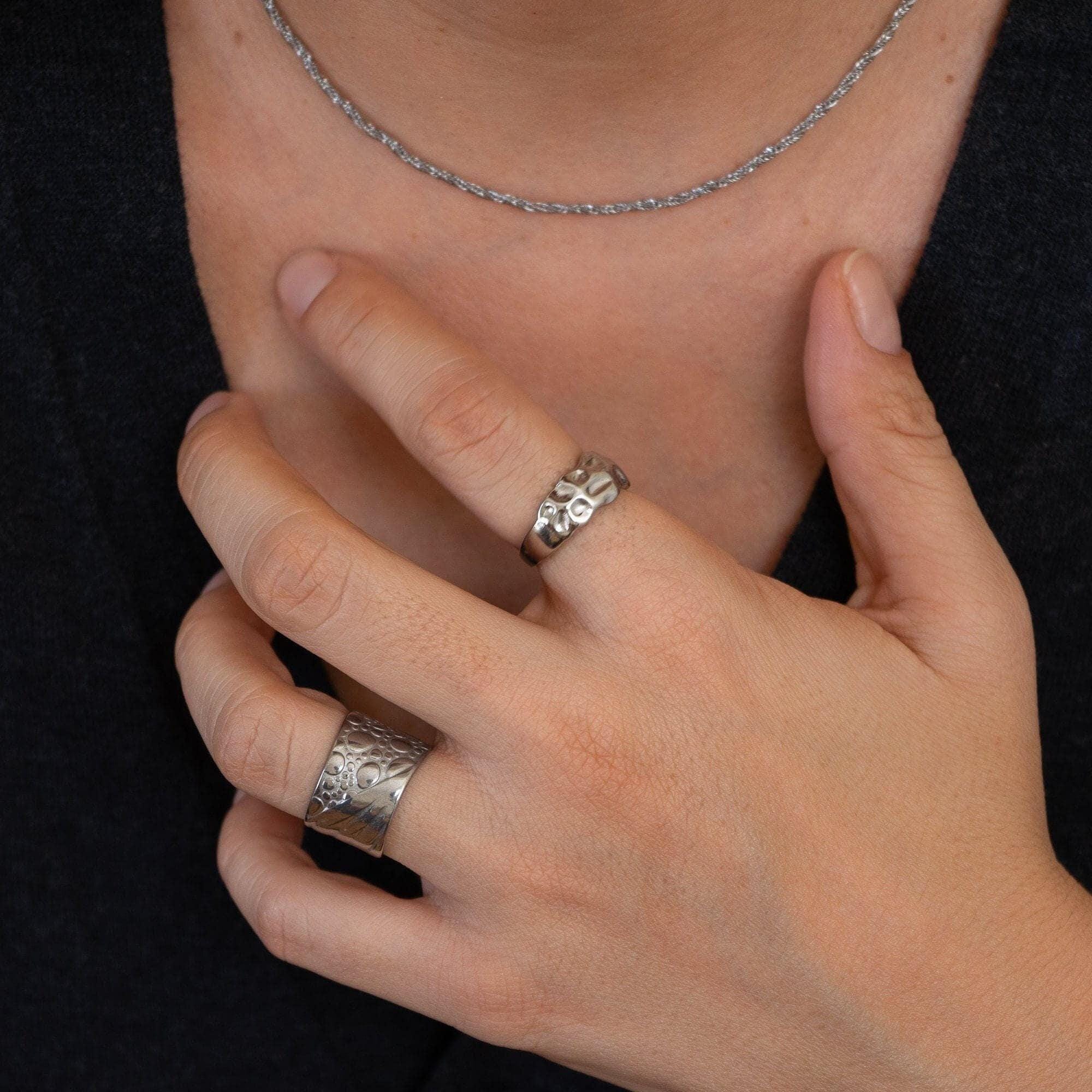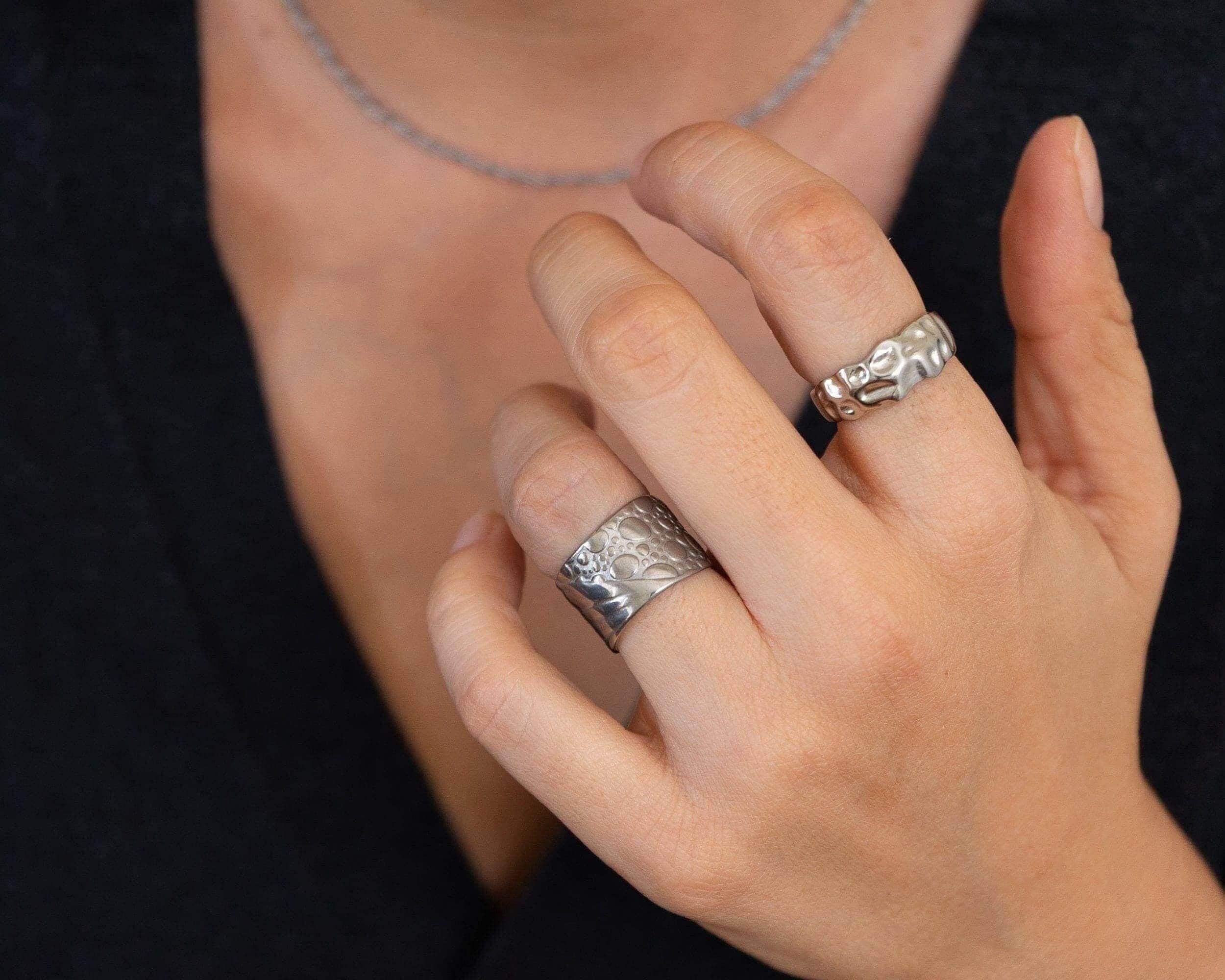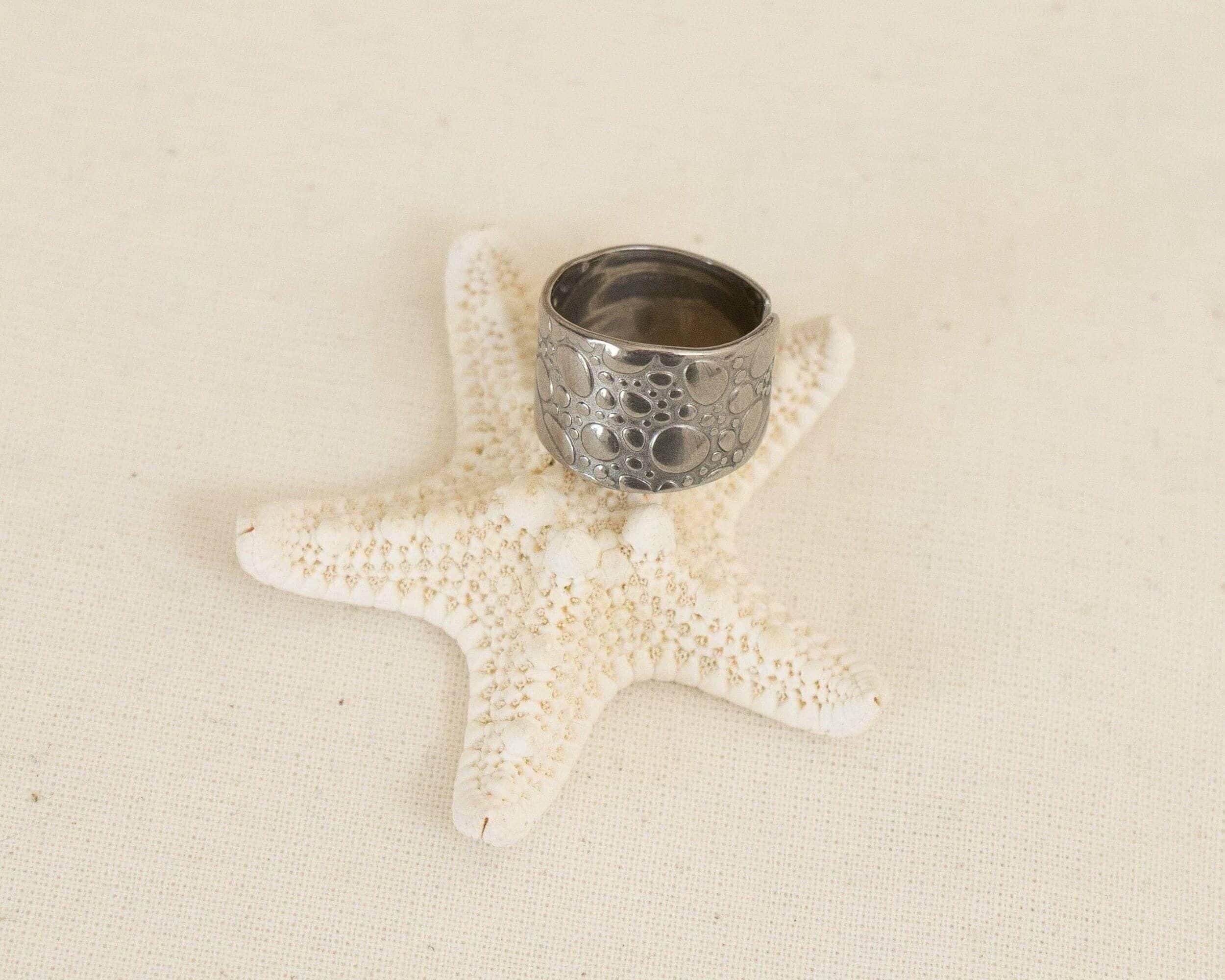 Discover a distinctive silver stainless steel ring featuring a unique textured surface inspired by bubbles. This versatile ring is designed to be worn on your index, middle, or ring finger, making it a flexible choice for any occasion. Its irregular shape adds a striking element to your jewelry collection, allowing it to stand out whether worn alone or stacked with other rings.
