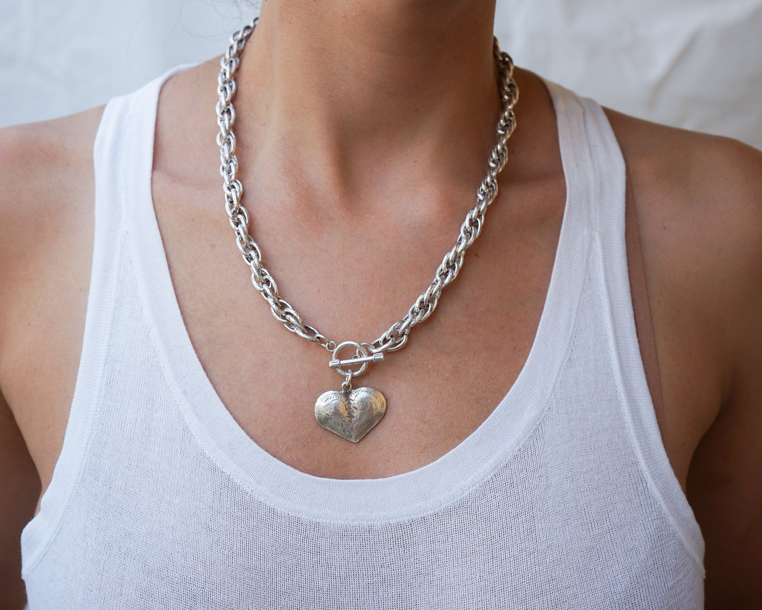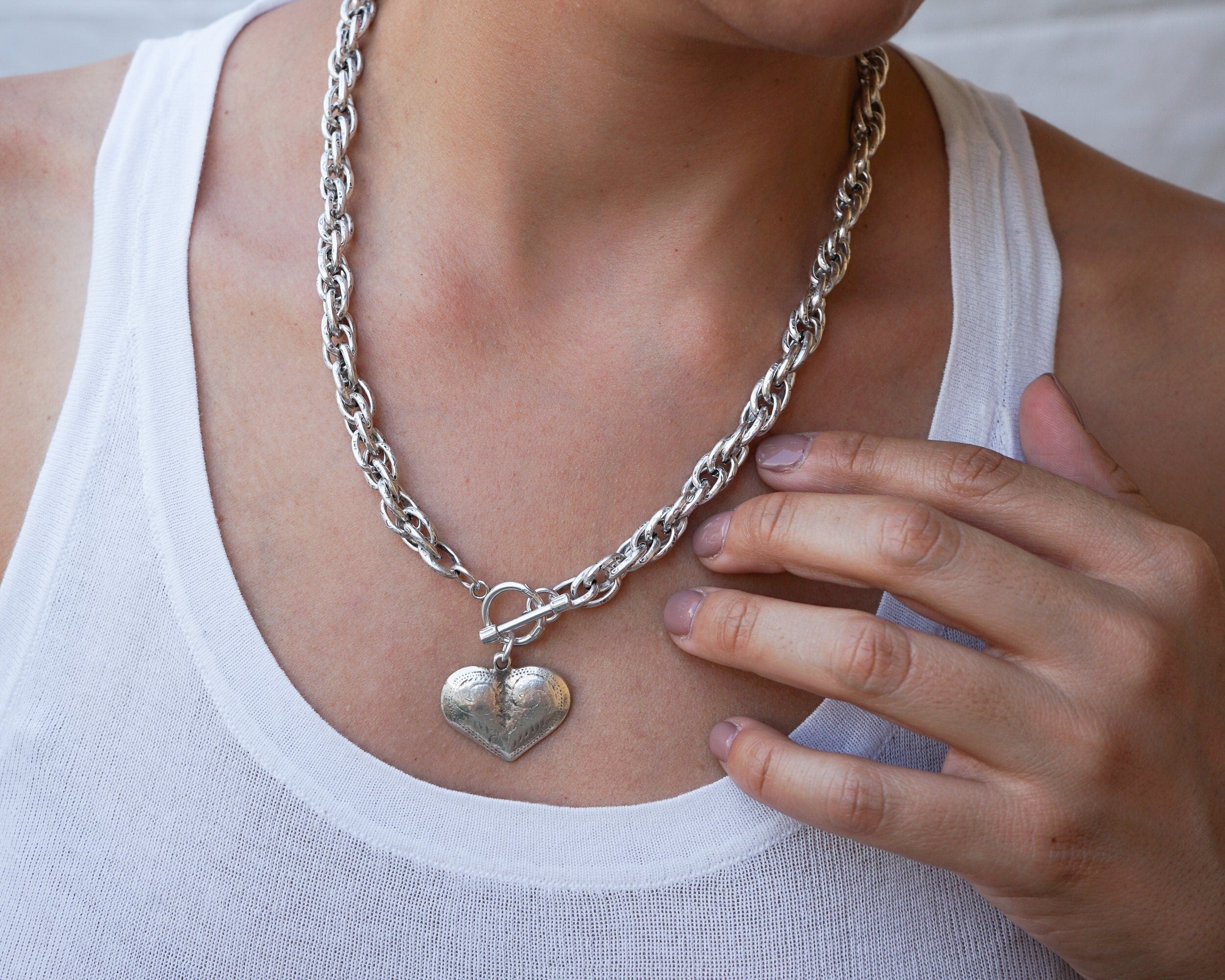 Get ready to elevate your accessory game with our fabulous Silver Statement Necklace featuring a stunning Front Toggle Clasp and an exquisite engraved HEART pendant! This unique chunky thick chain choker necklace is not just an accessory; it’s a bold expression of style and sophistication. Imagine how this gorgeous piece will shimmer and shine around your neck, making every outfit pop with personality!