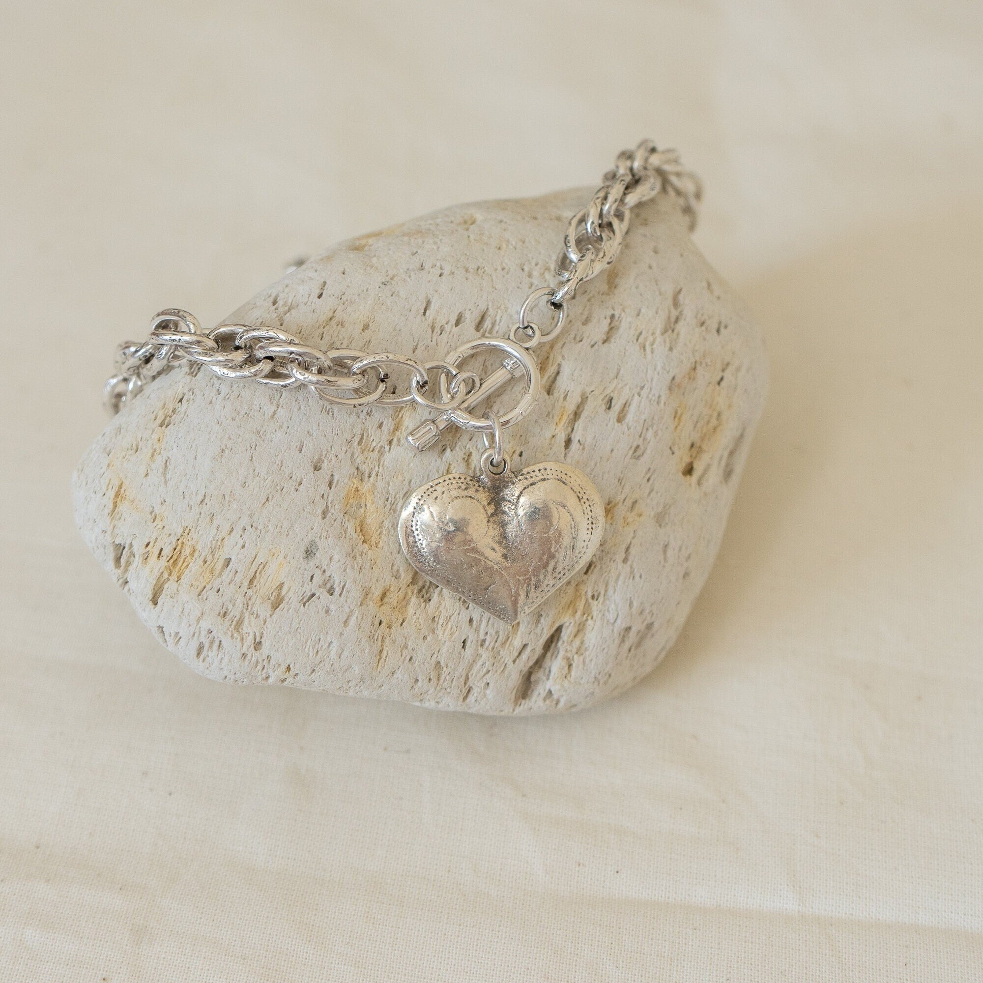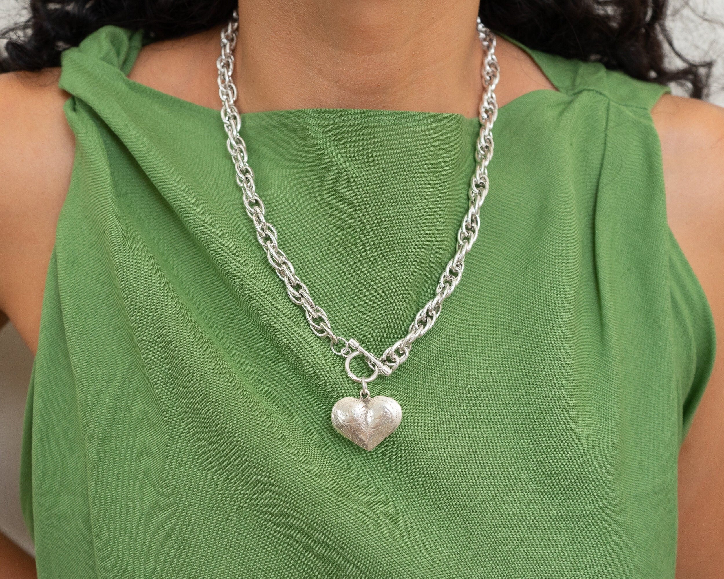 Silver Statement Necklace with Front Toggle Clasp Engraved Heart Pendant