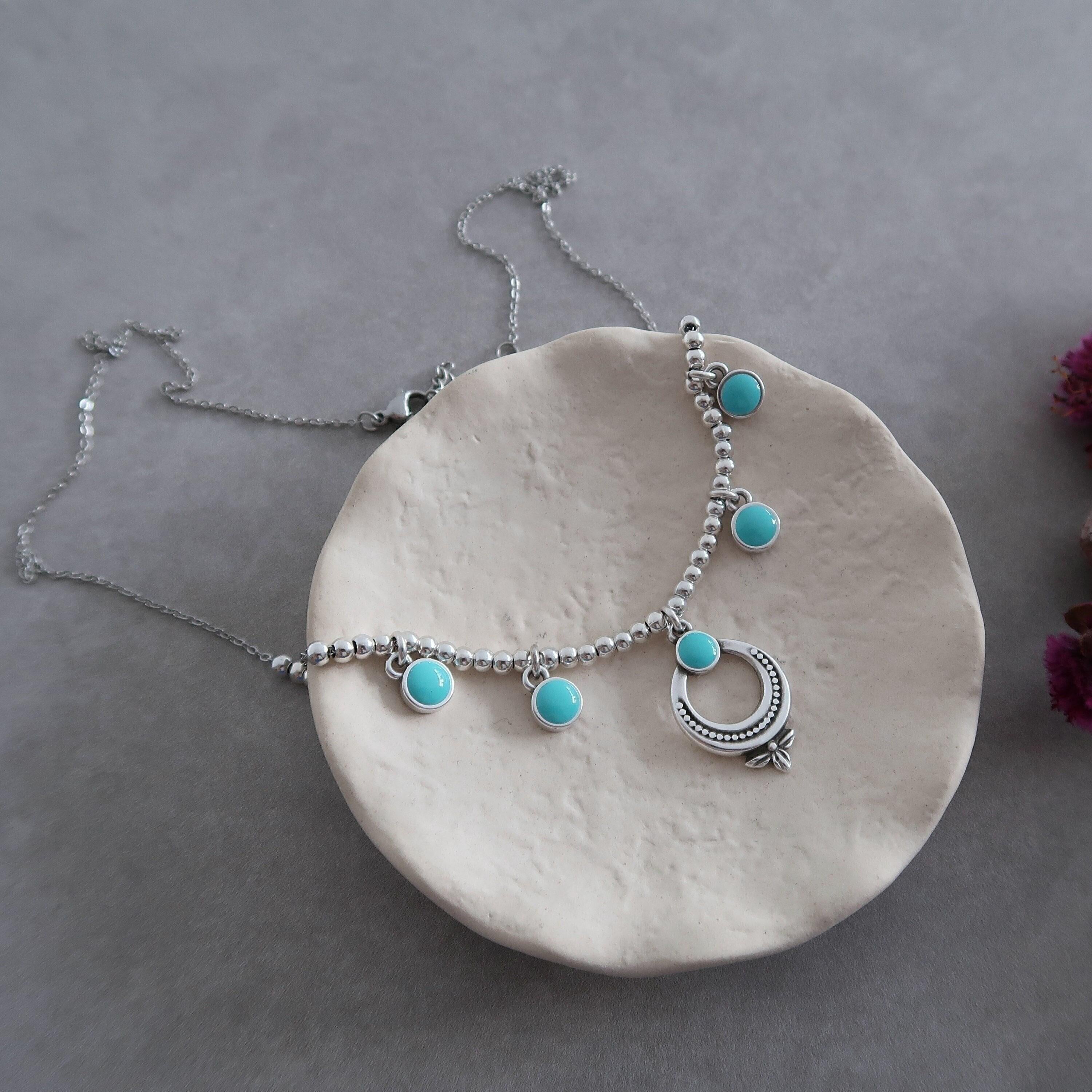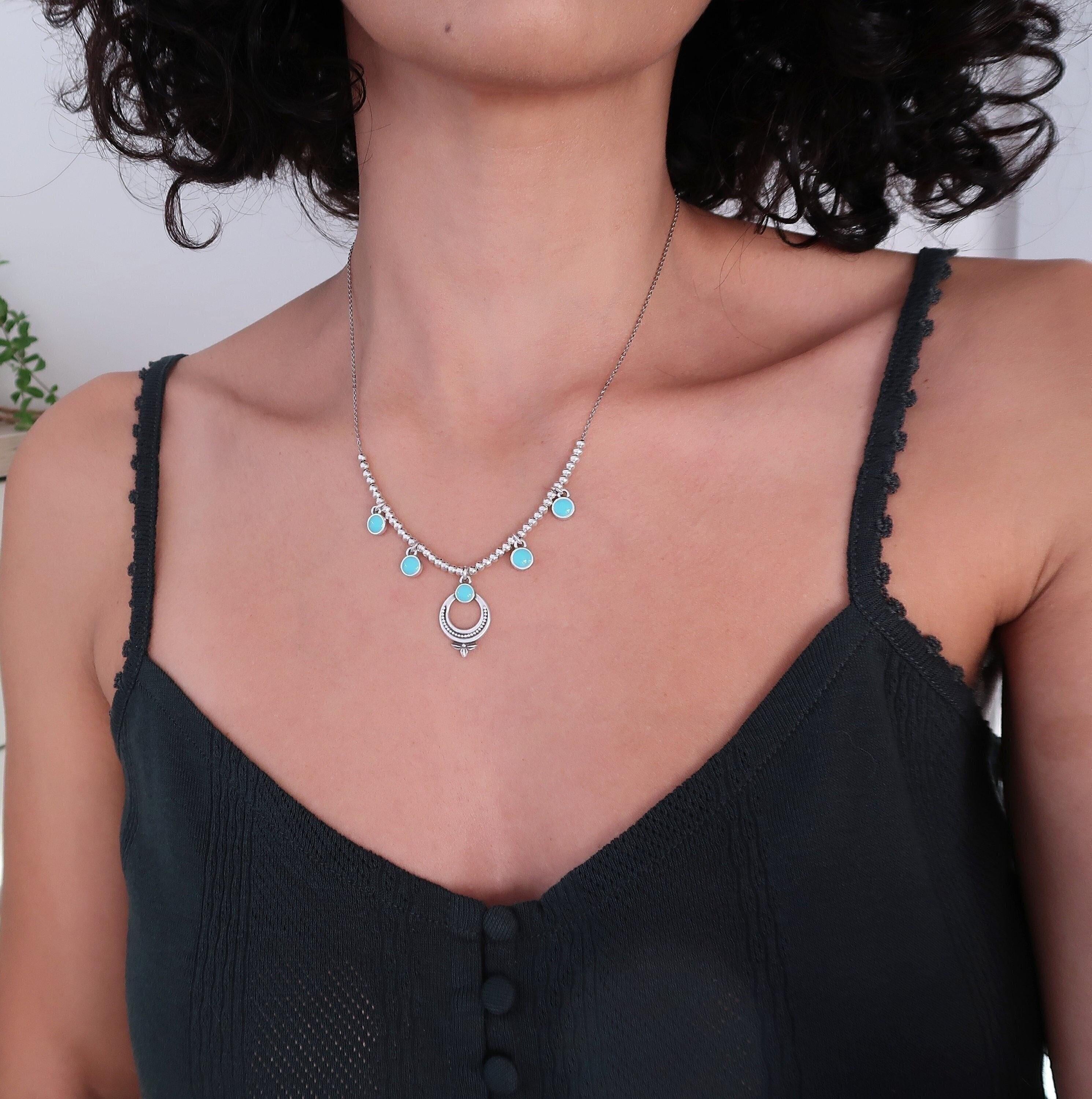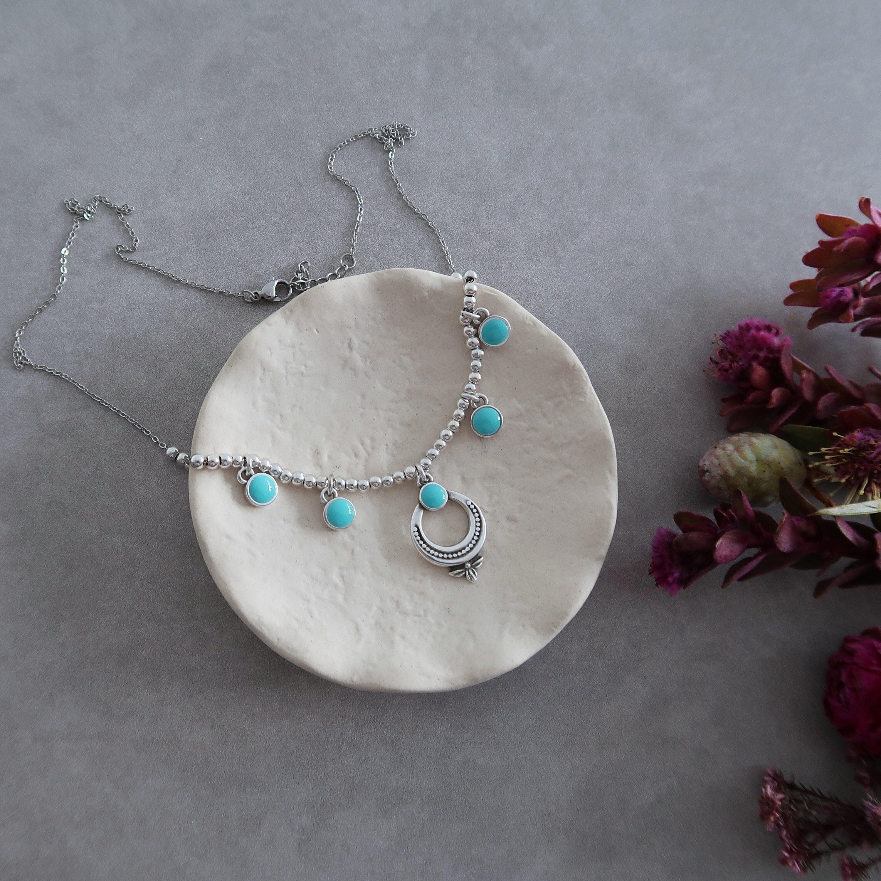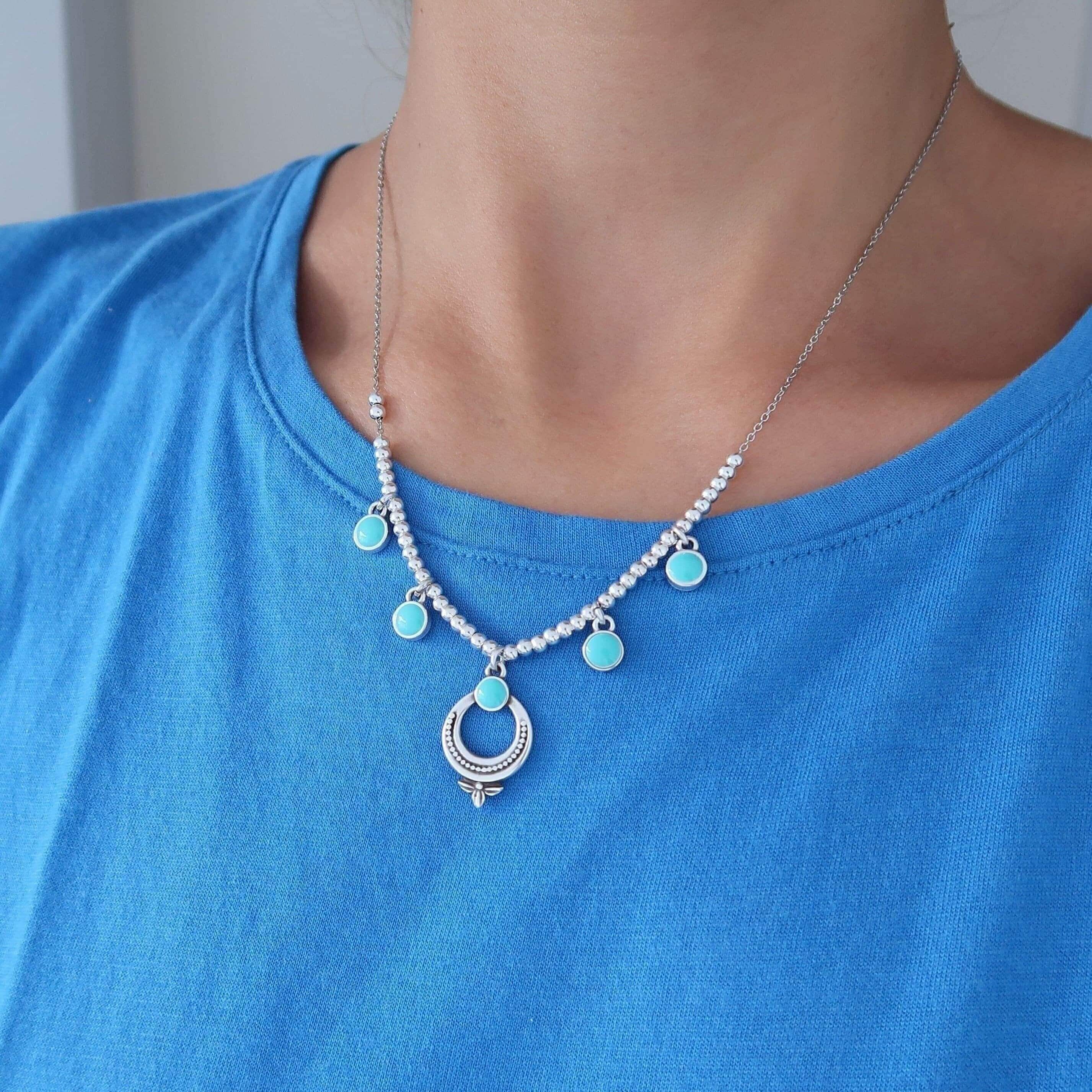 Discover the charm of this unique round ethnic motif pendant, featuring vibrant turquoise enamel, elegantly suspended on a durable stainless steel chain. This dainty necklace is an ideal piece to infuse color into your layered looks. Crafted from high-quality materials, it is designed to maintain its beauty without fading over time.