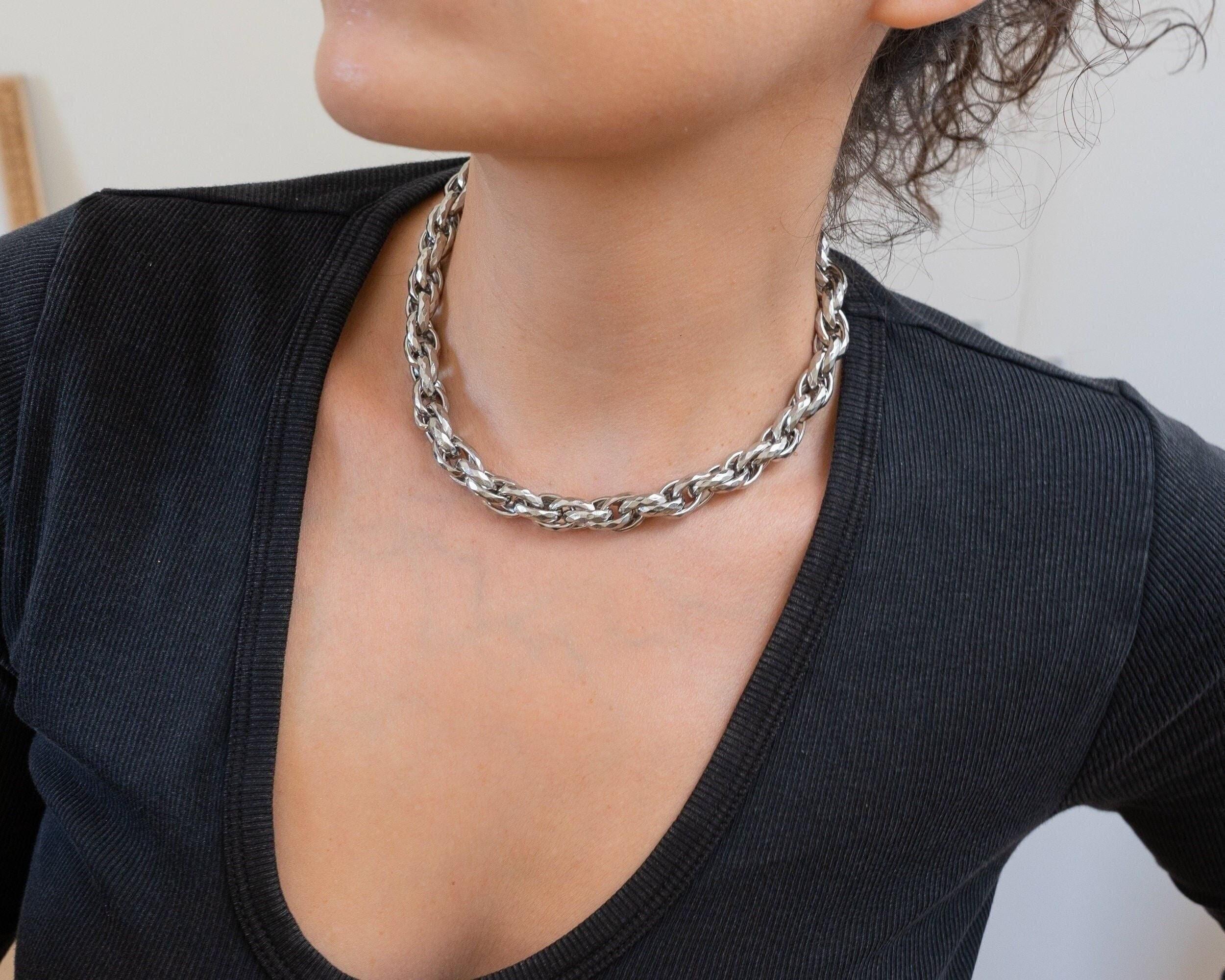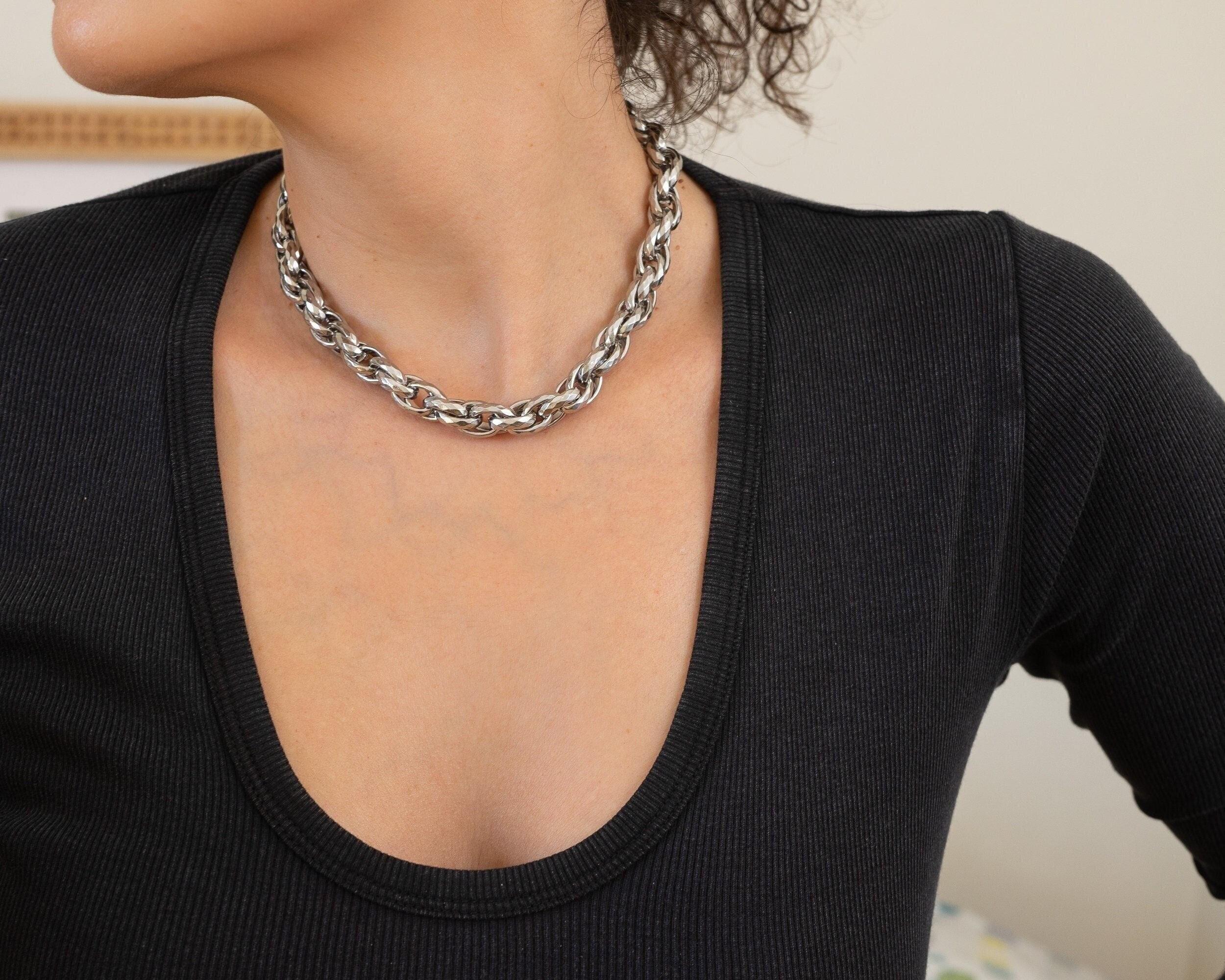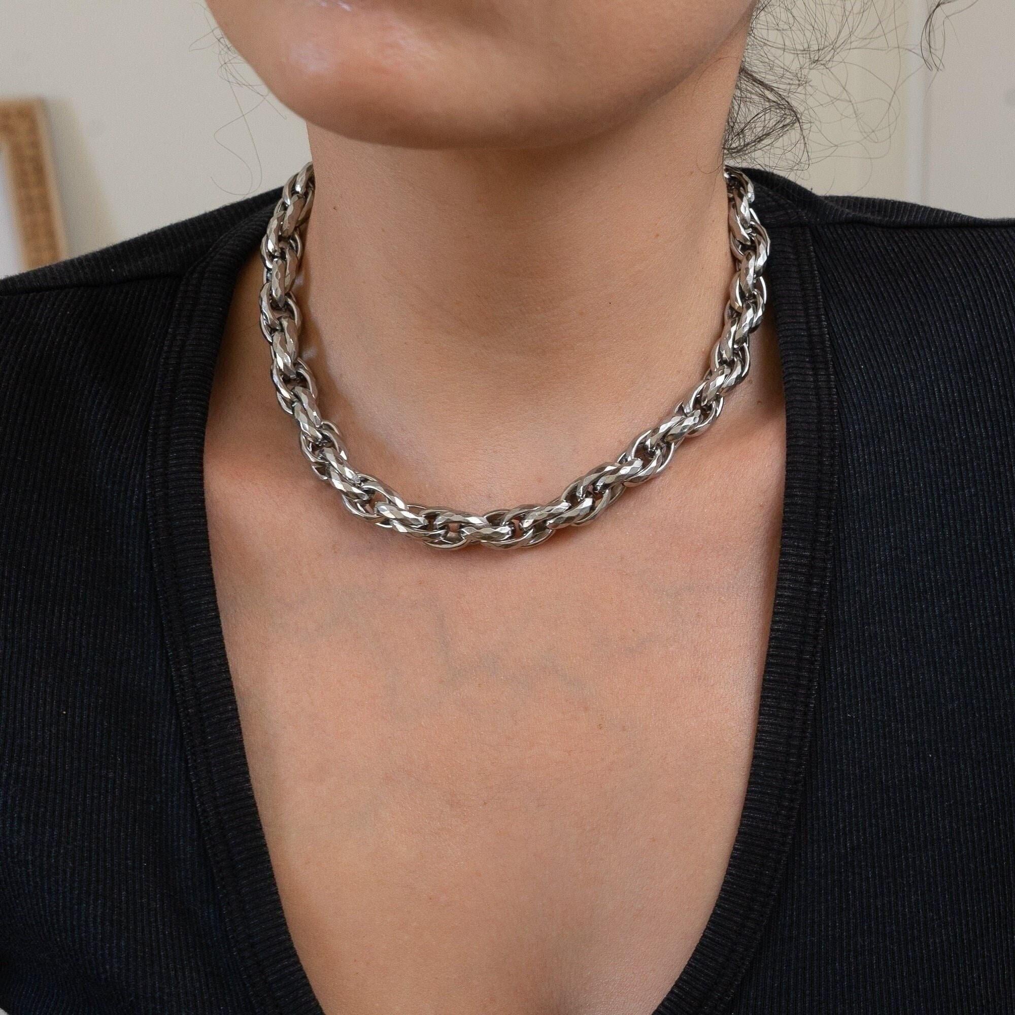 Discover a distinctive piece with this stainless steel twisted faceted oval link chain choker, designed to bring an edgy and modern flair to your ensemble. The unique twisted links create a captivating texture, while the durable stainless steel ensures that the choker remains beautiful over time without fading or wearing off.
