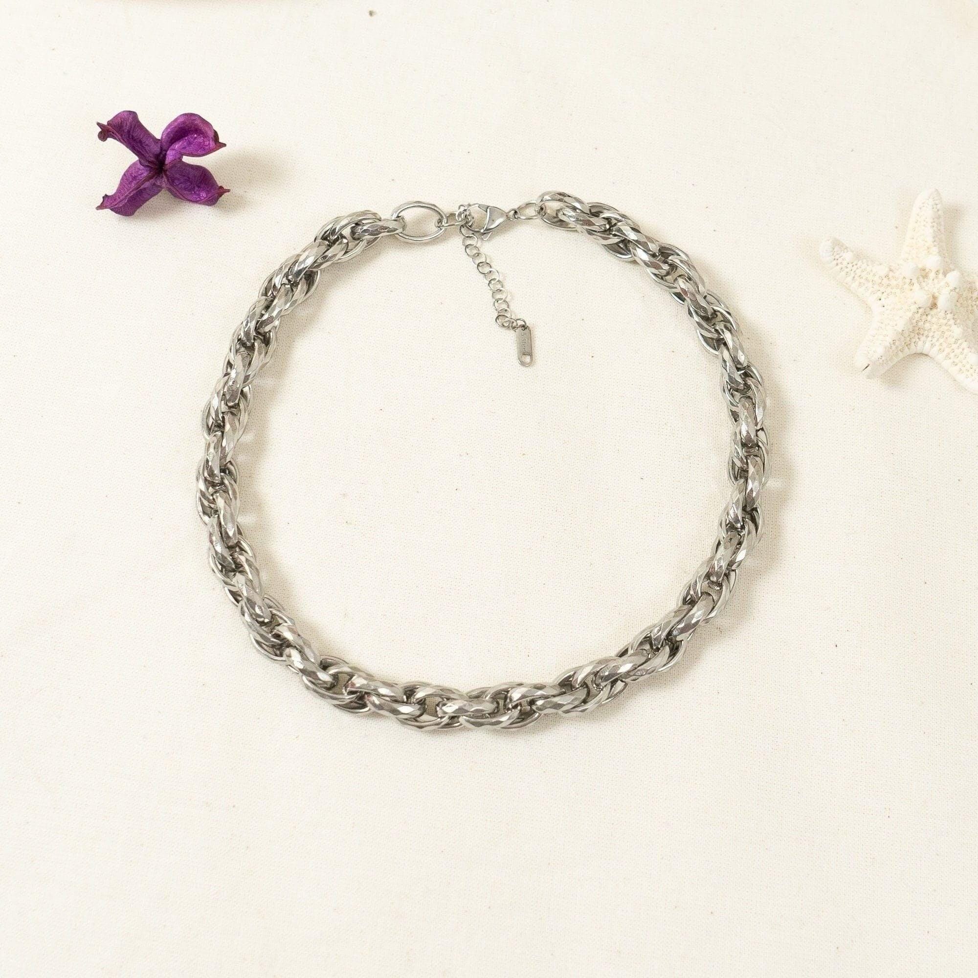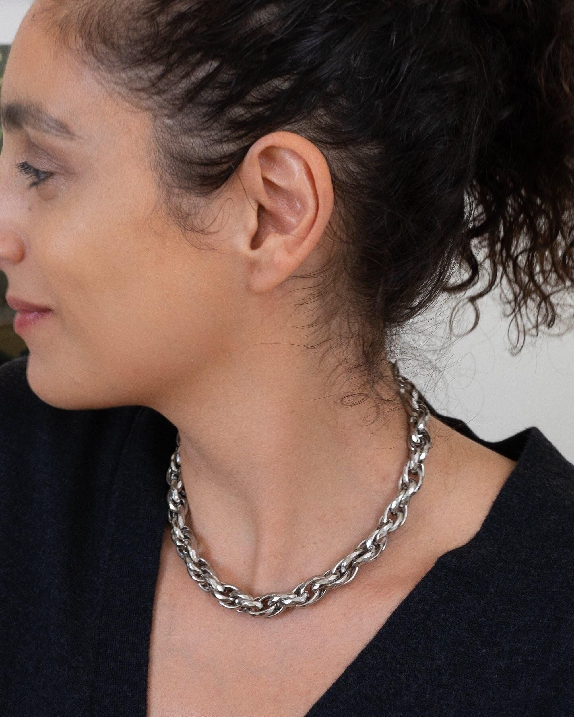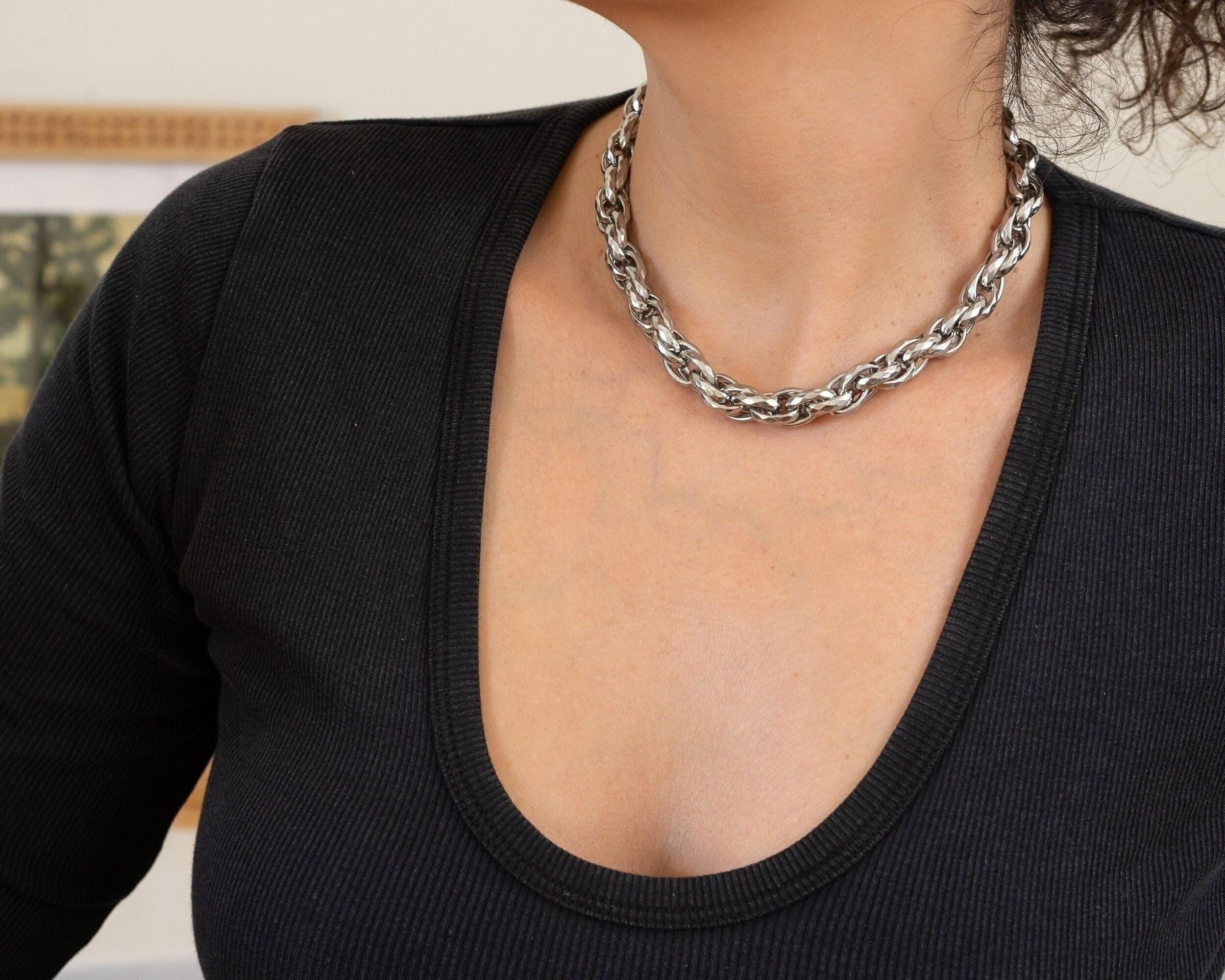 Discover a distinctive piece with this stainless steel twisted faceted oval link chain choker, designed to bring an edgy and modern flair to your ensemble. The unique twisted links create a captivating texture, while the durable stainless steel ensures that the choker remains beautiful over time without fading or wearing off.