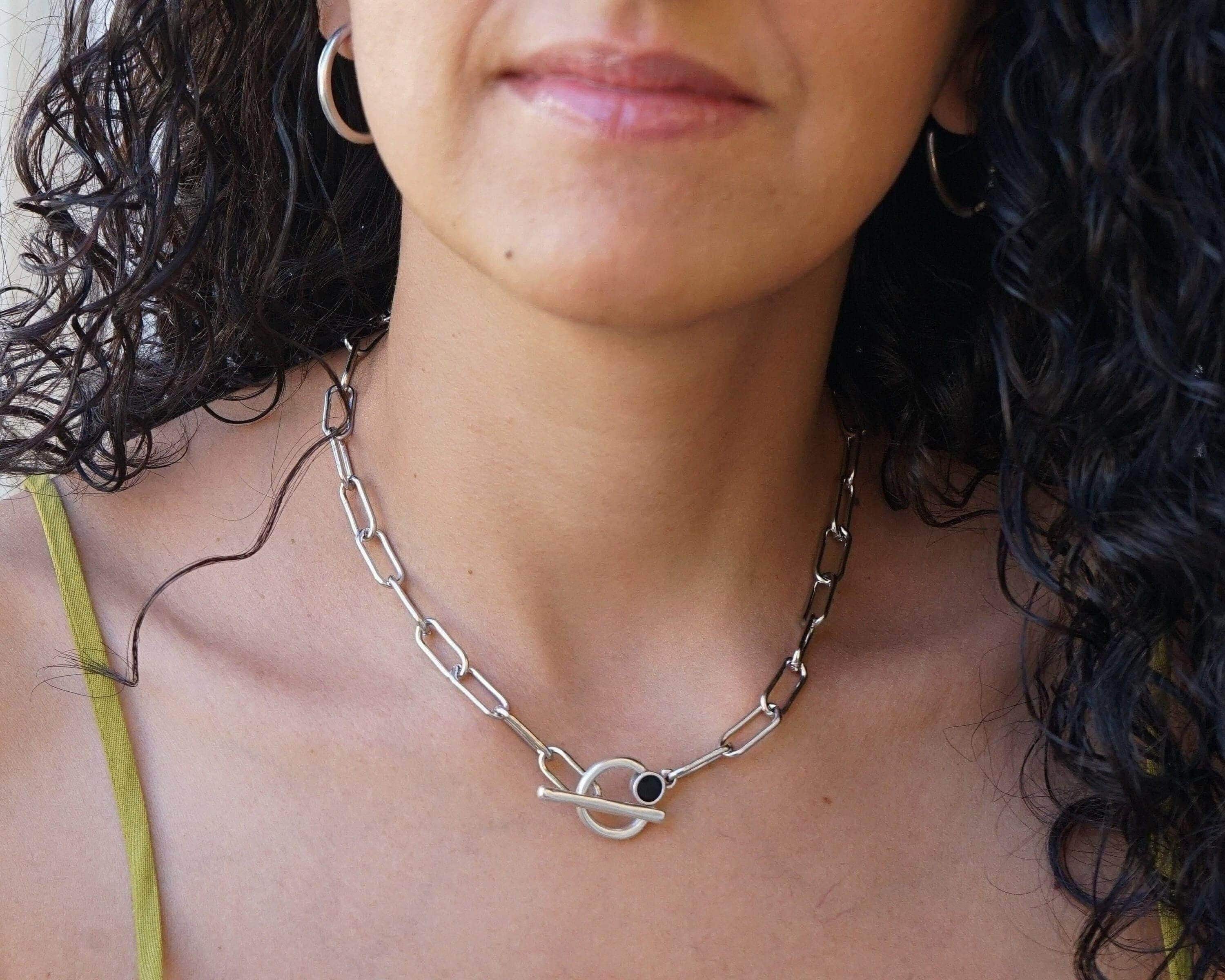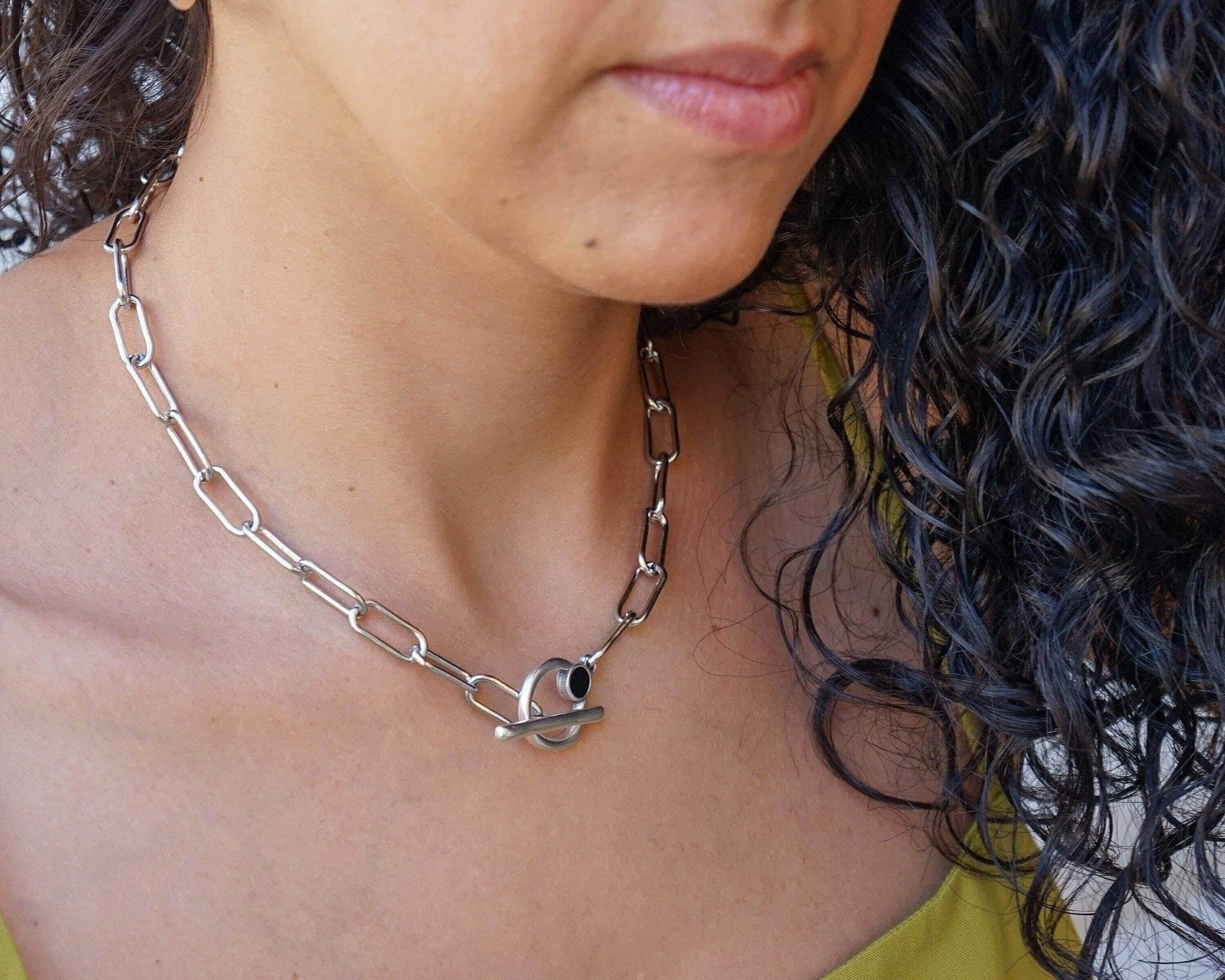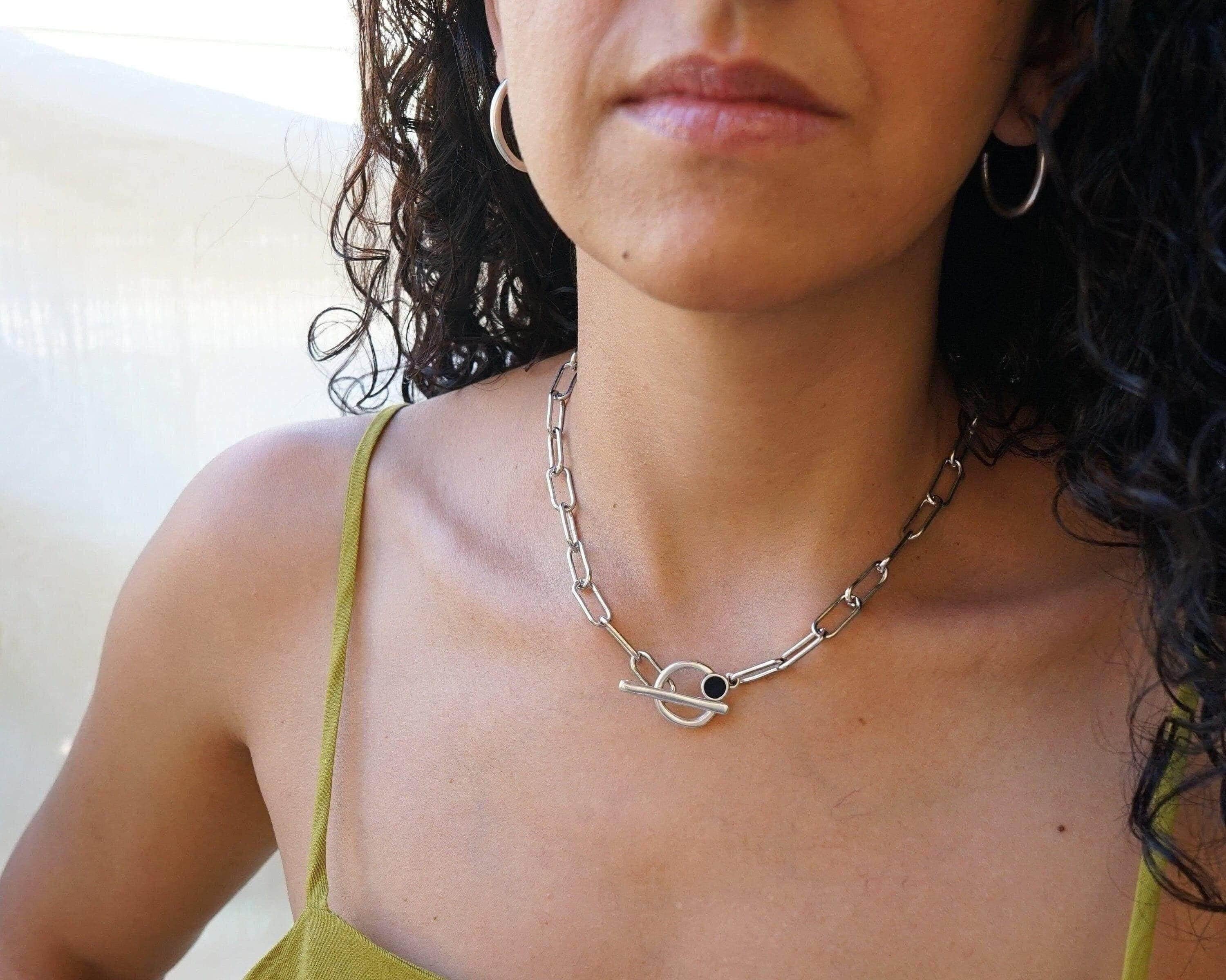 Thick Silver Oval Chain with Black Enamel Stone T-Clasp