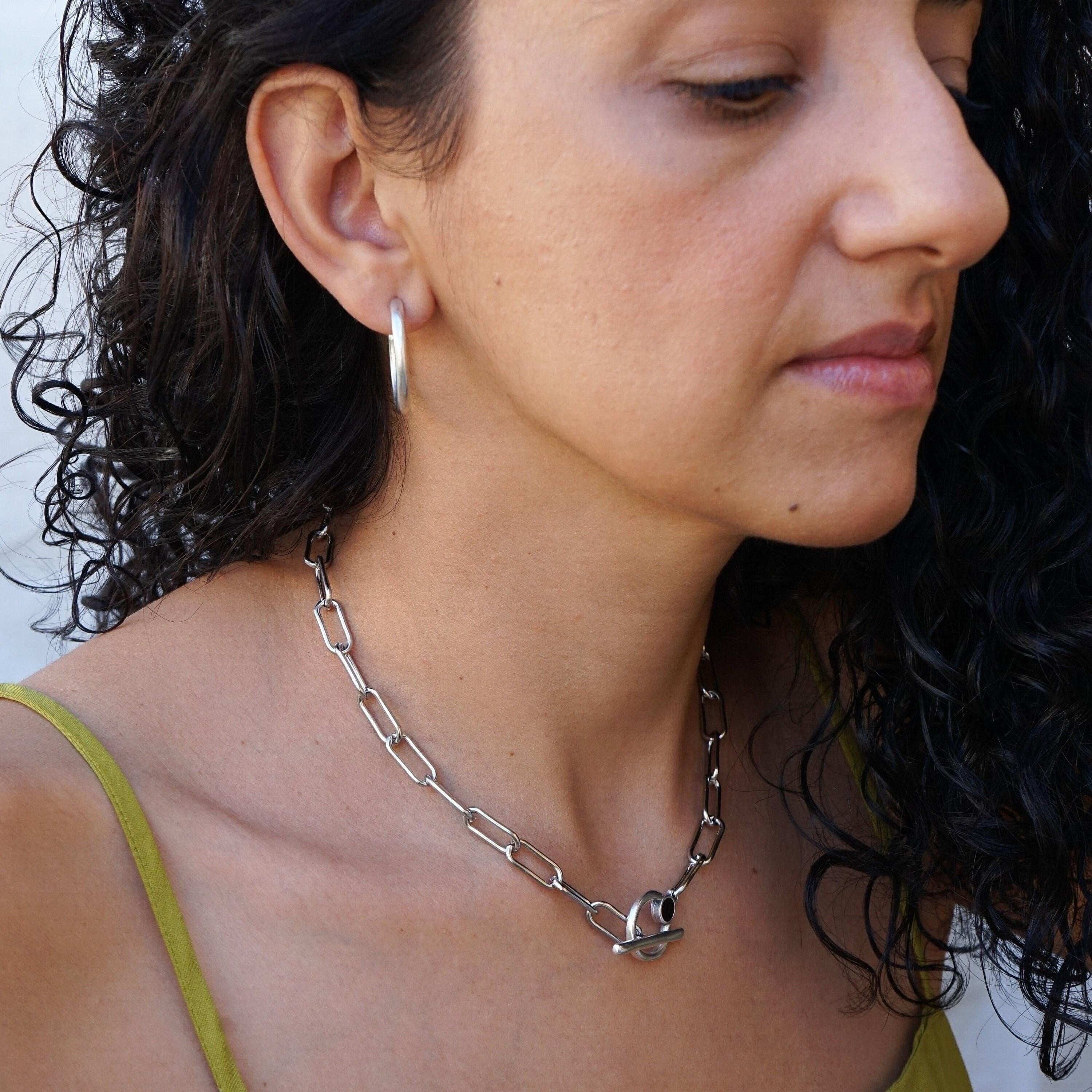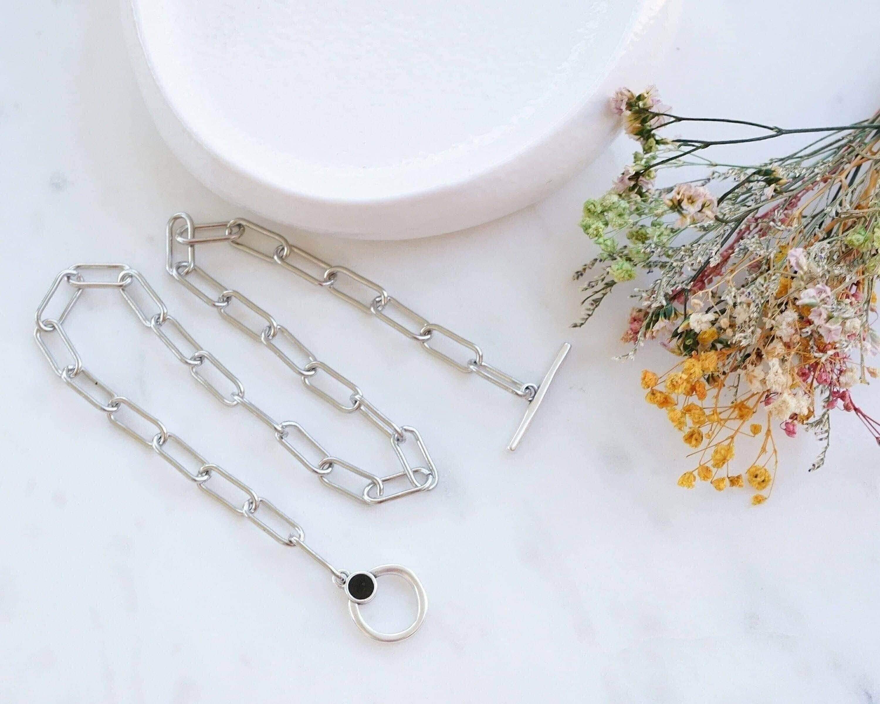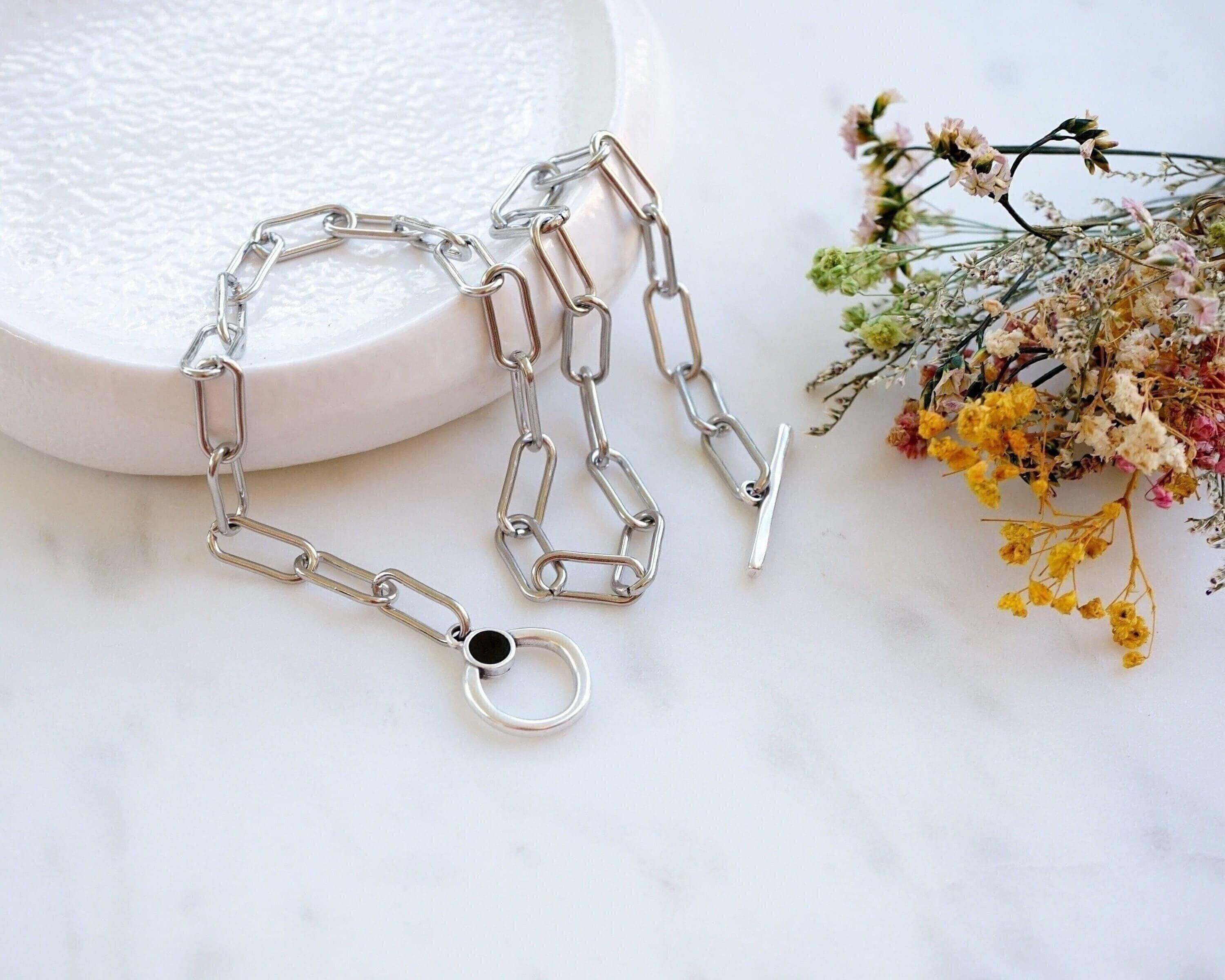 Thick Silver Oval Chain with Black Enamel Stone T-Clasp