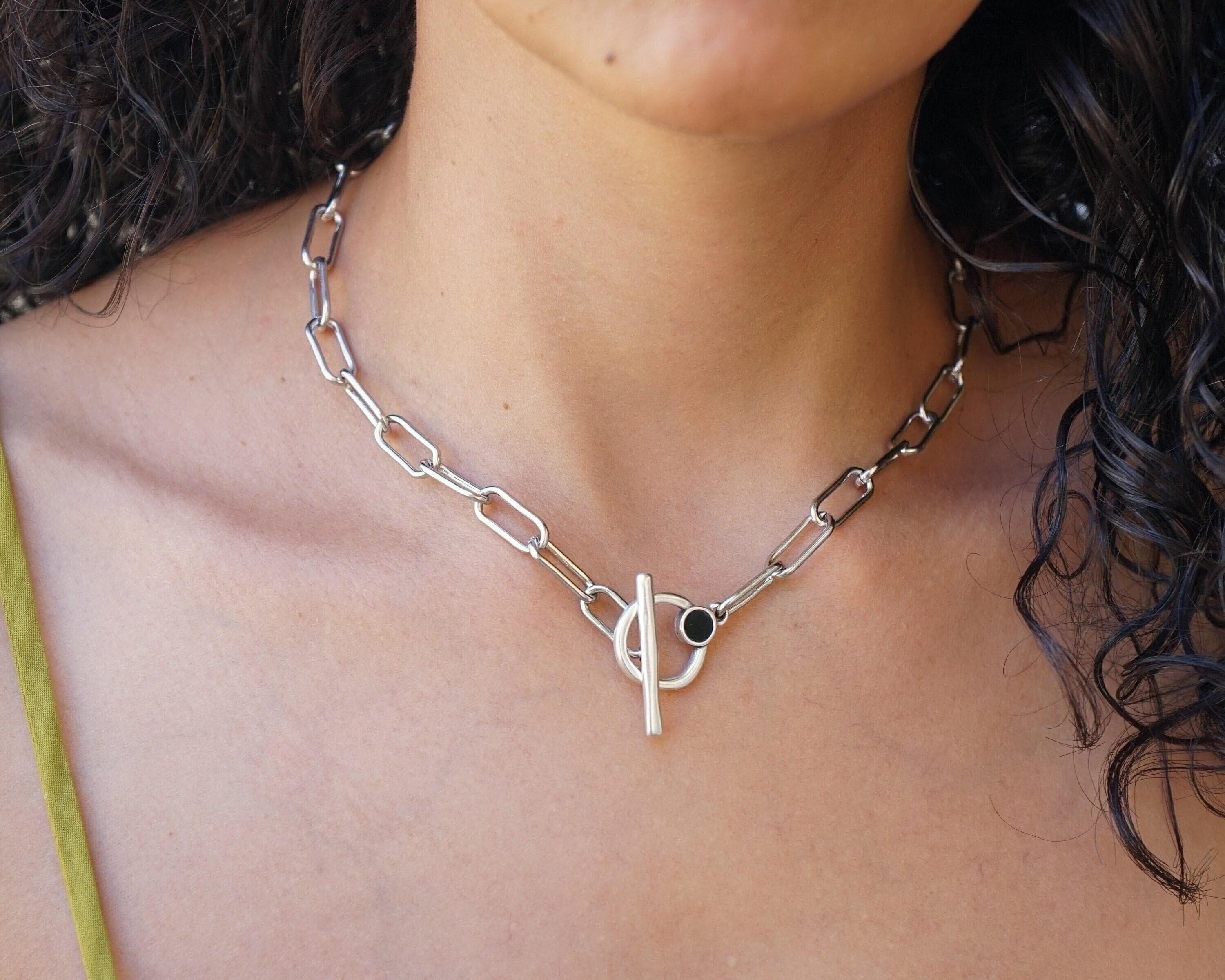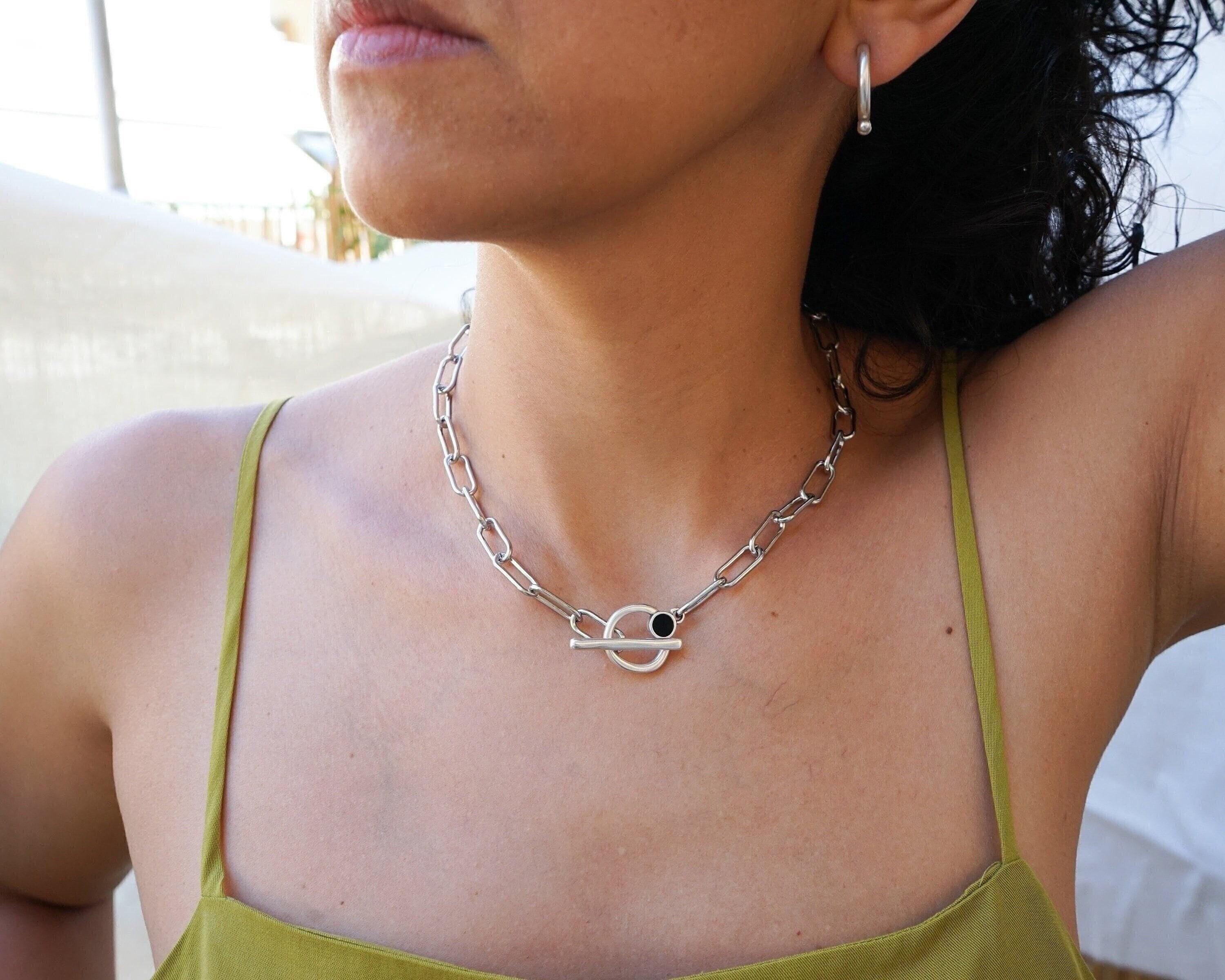 This striking choker necklace features a thick chain made of orthogonal links, complemented by a large T-bar toggle clasp adorned with a black enamel stone that exudes a modern, rock-inspired aesthetic. Versatile in style, it can be worn independently for a bold statement or effortlessly layered with other jewelry pieces to create a personalized look. Crafted from high-quality materials, this necklace is designed to maintain its beauty without fading over time.