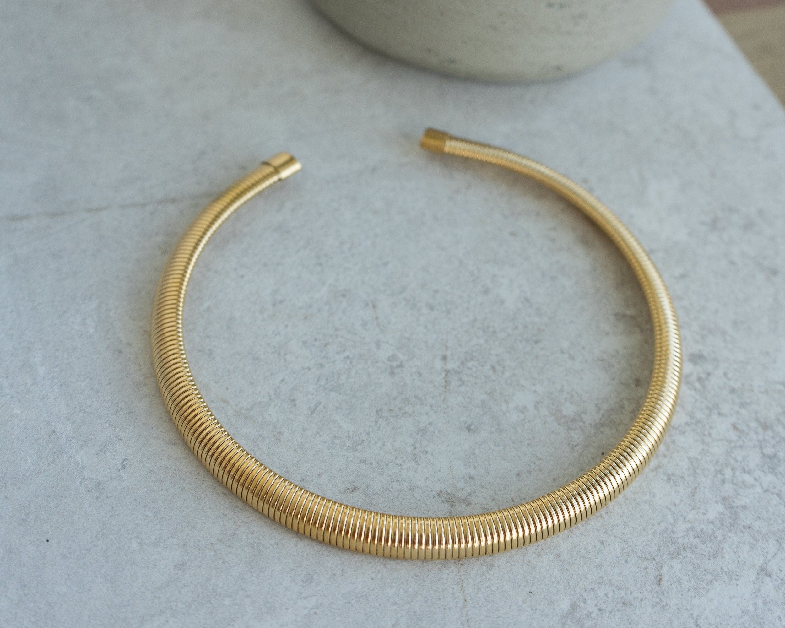 Elevate your style this season with the gold oversized snake collar, a striking necklace designed to enhance any outfit. Expertly crafted from high-quality stainless steel, this piece combines strength and durability with rust resistance, ensuring it retains its luster over time. Its smooth, serpentine design catches the light beautifully, making it a versatile accessory that can be worn alone for a bold statement or layered with other necklaces for a unique look.