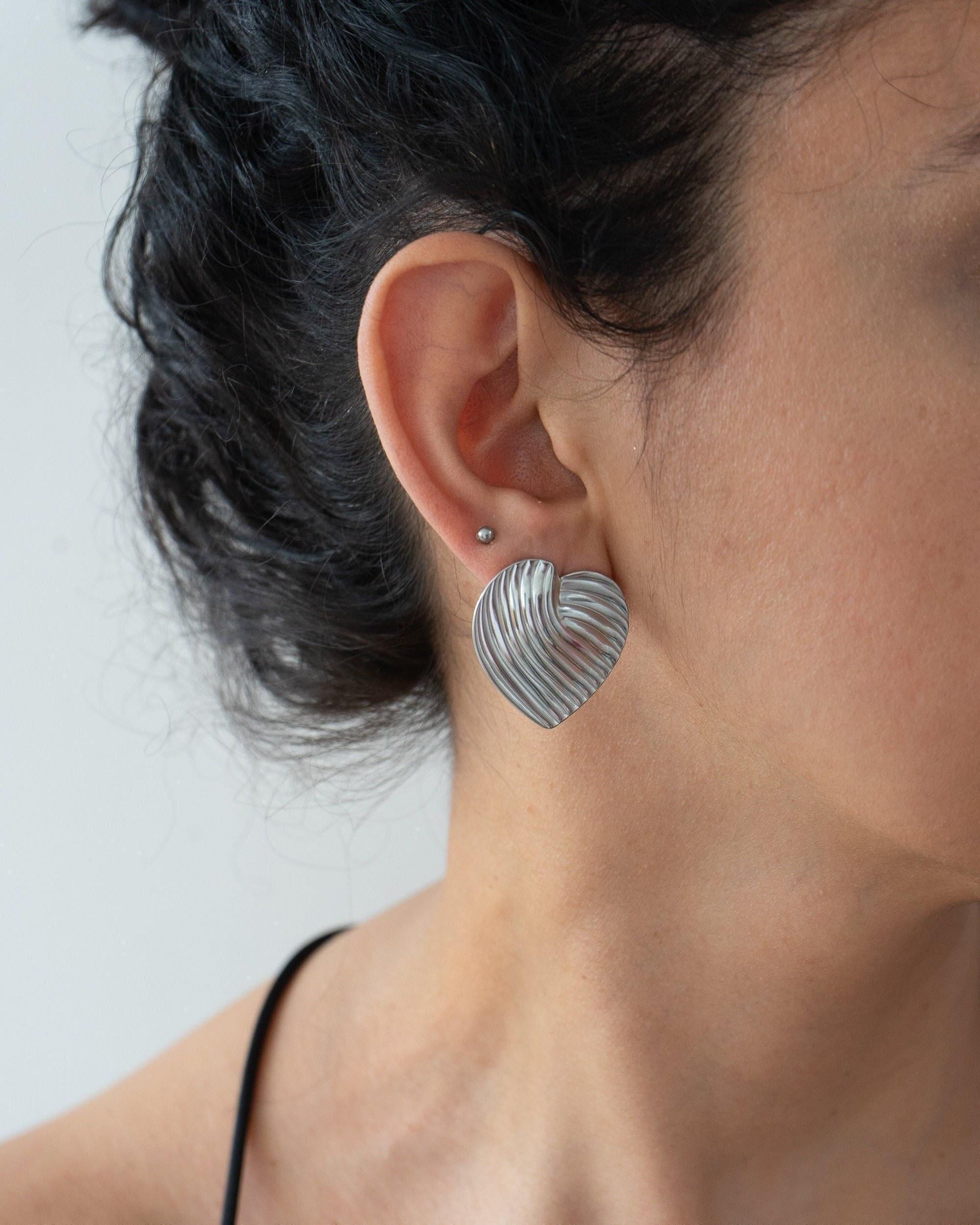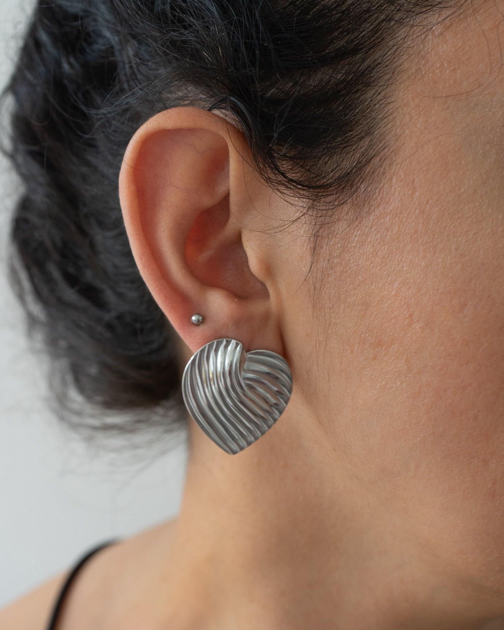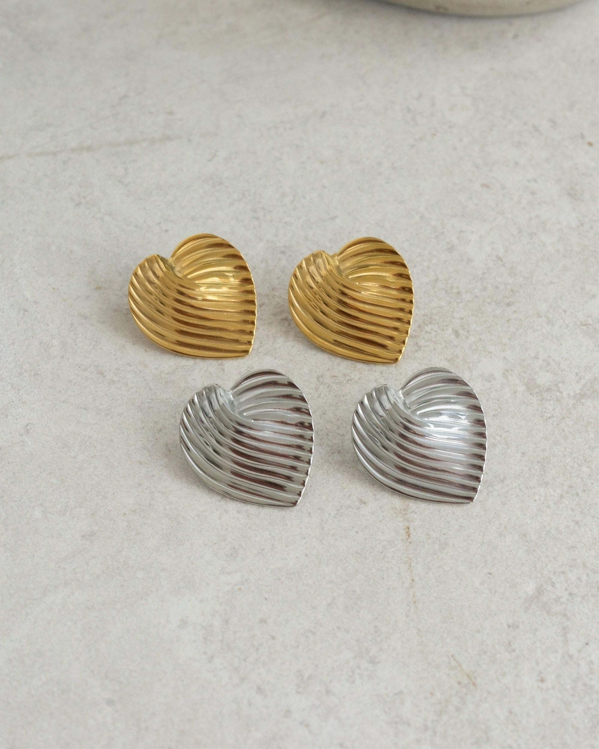 Make a bold impression with these Large Heart Stud Earrings. Crafted from durable gold stainless steel, these earrings feature a unique lined design that adds an elegant touch to both everyday and special occasion outfits. Despite their impressive size, they are lightweight and comfortable, ensuring they won’t pull on your earlobes.