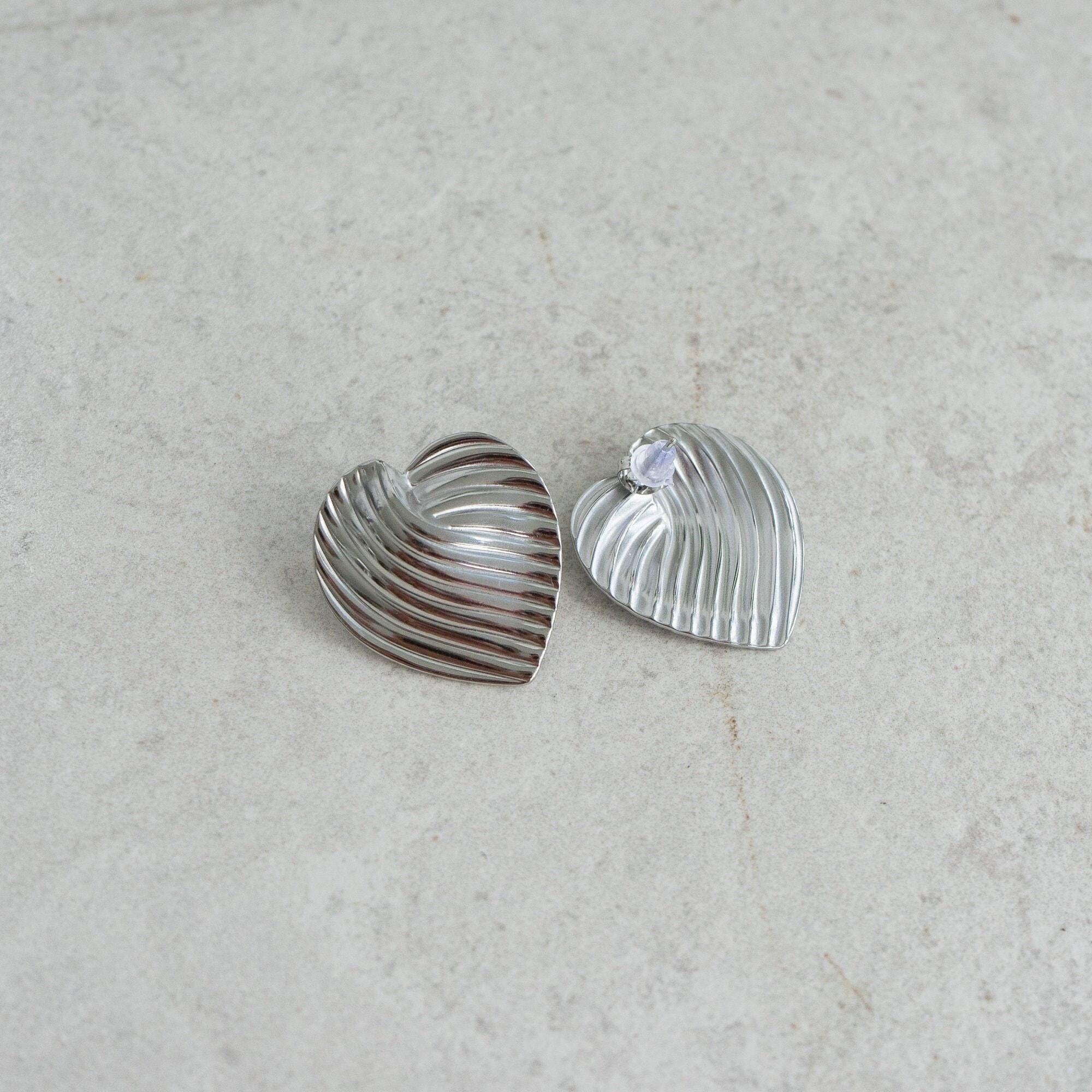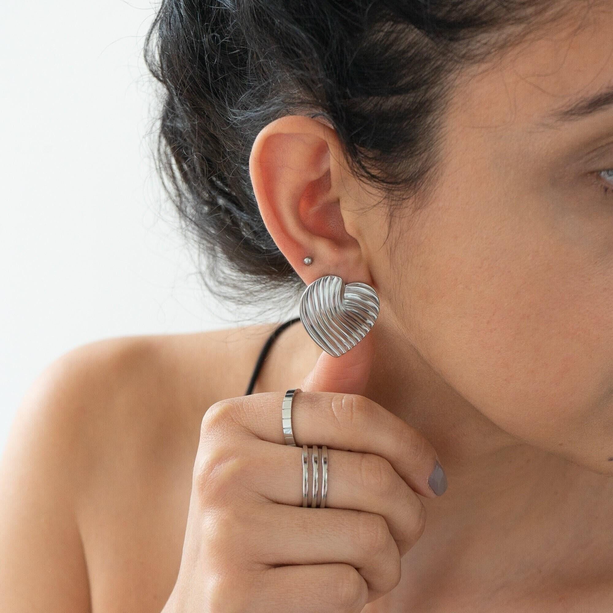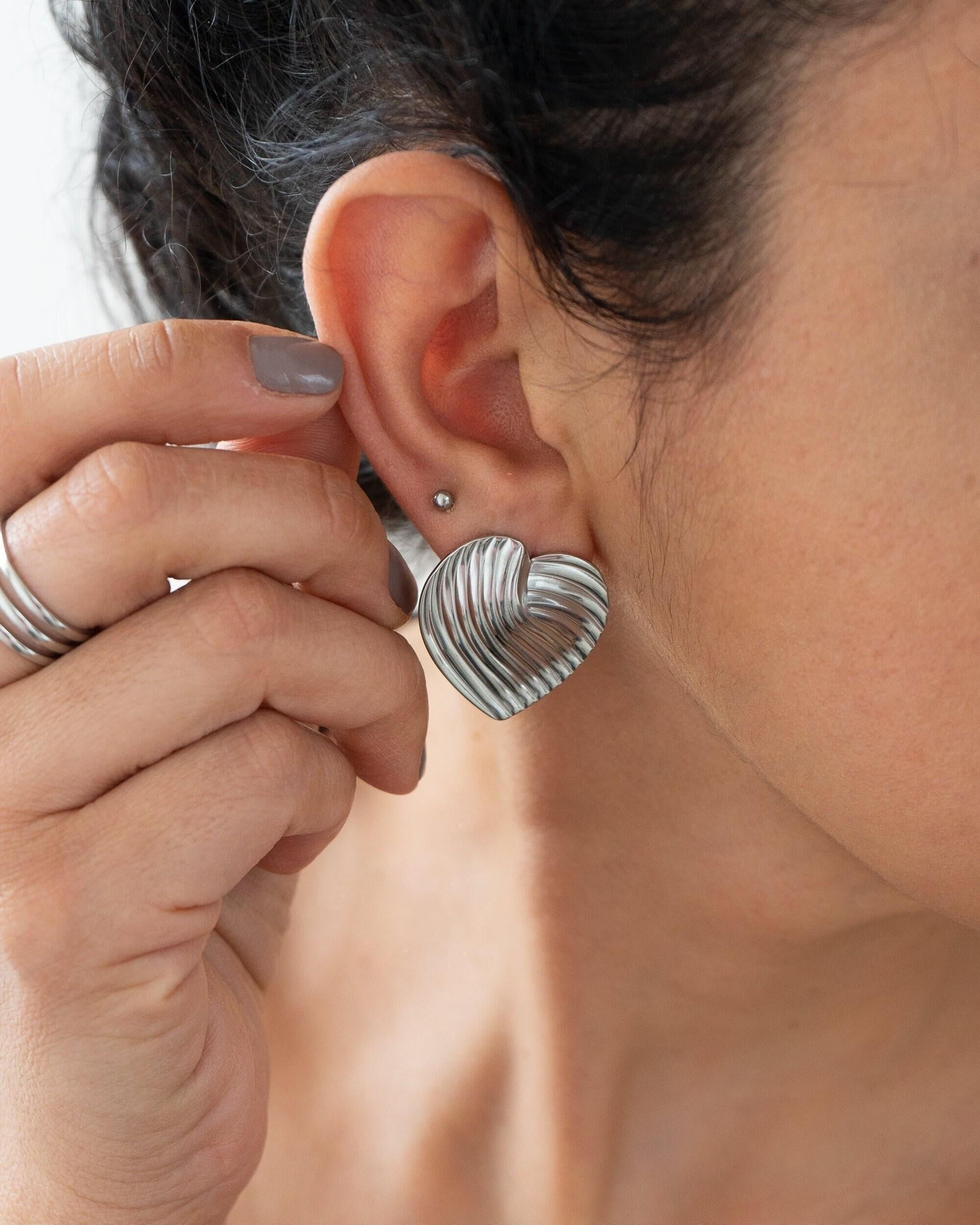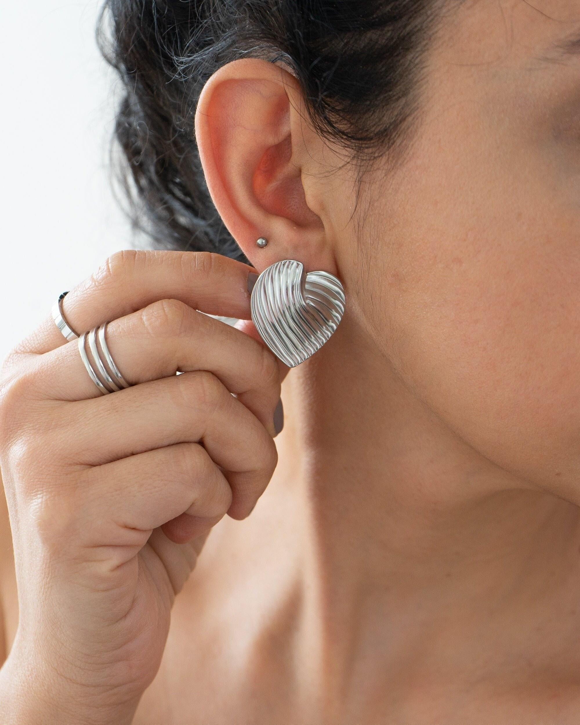 Make a bold impression with these Large Heart Stud Earrings. Crafted from durable gold stainless steel, these earrings feature a unique lined design that adds an elegant touch to both everyday and special occasion outfits. Despite their impressive size, they are lightweight and comfortable, ensuring they won’t pull on your earlobes.