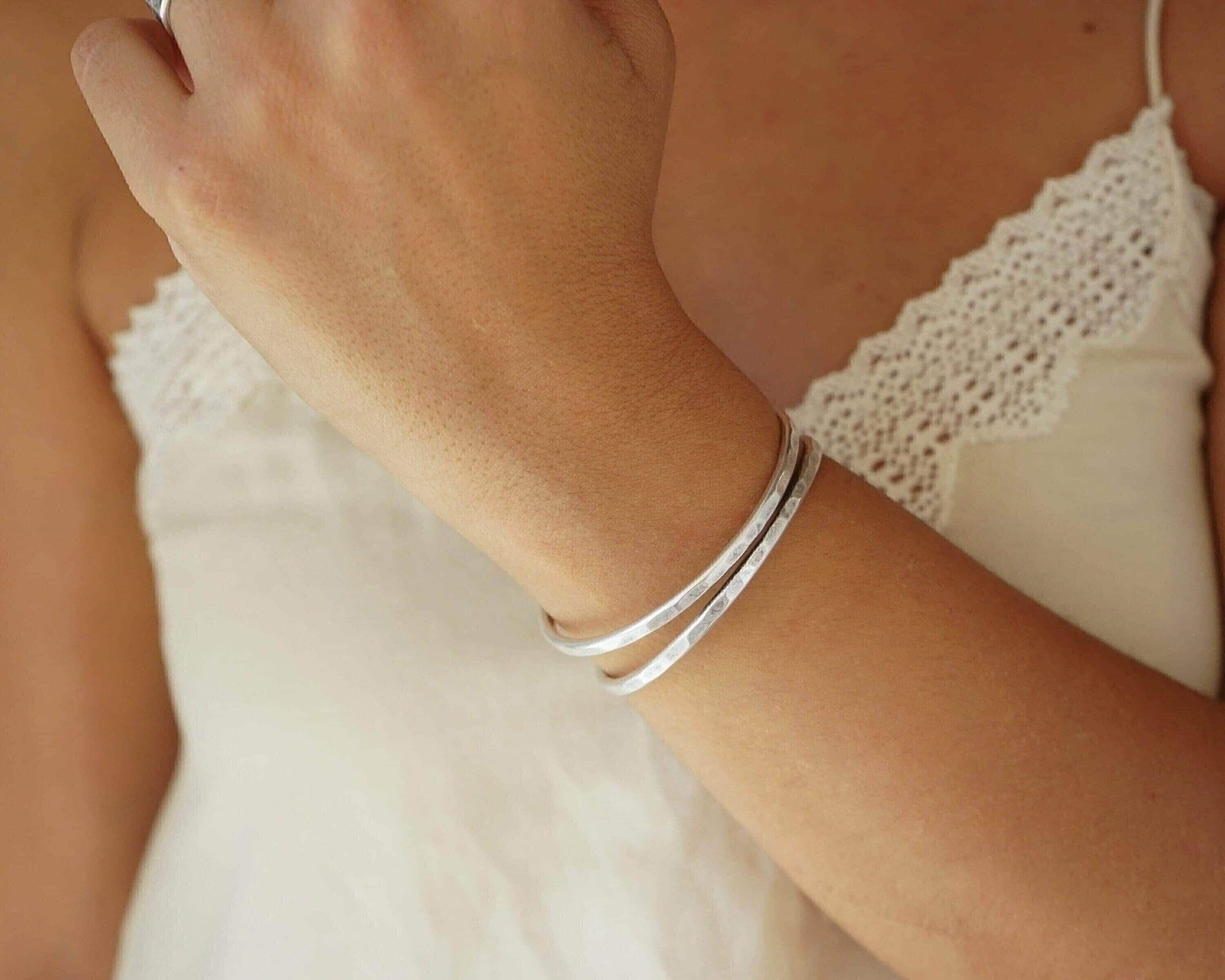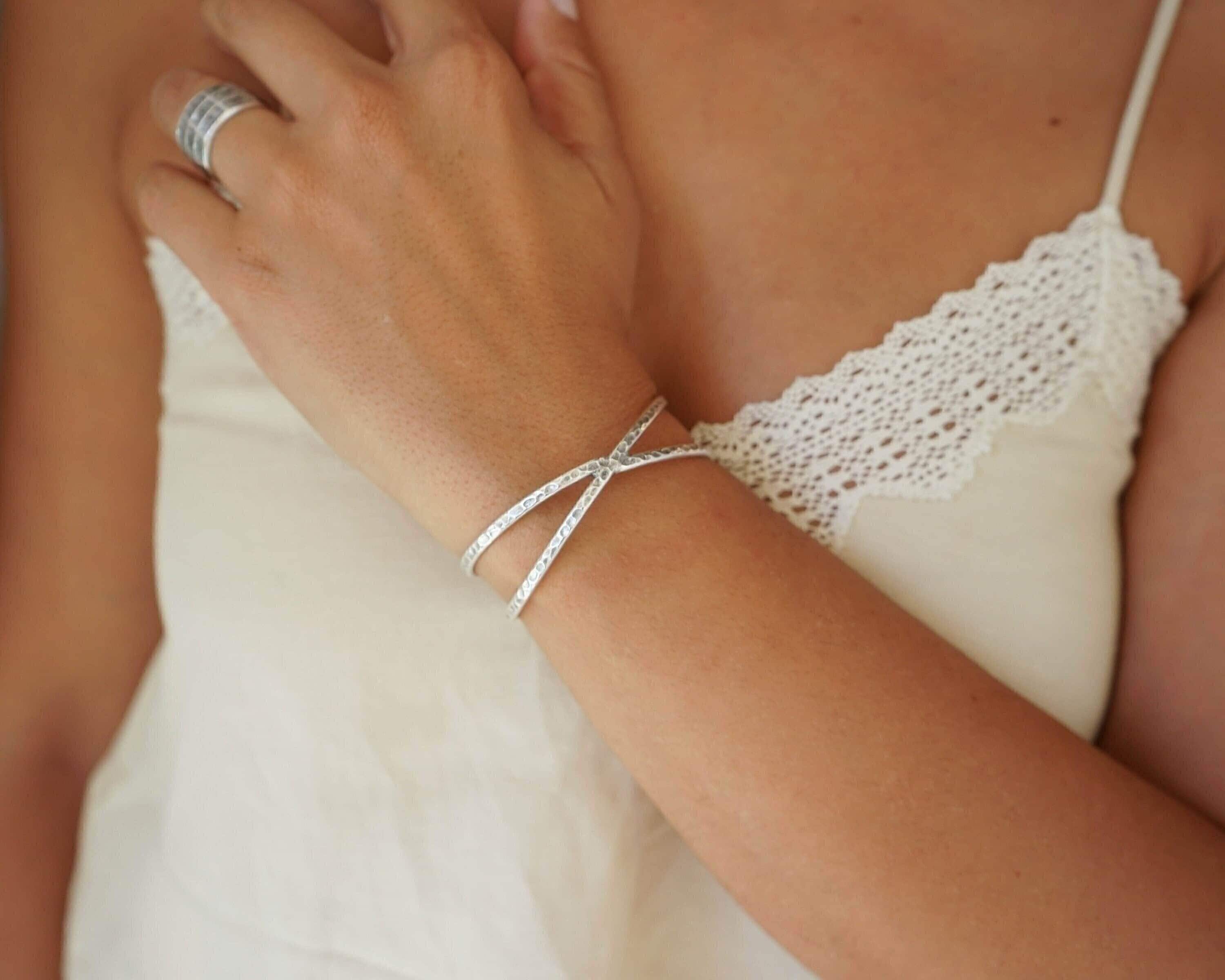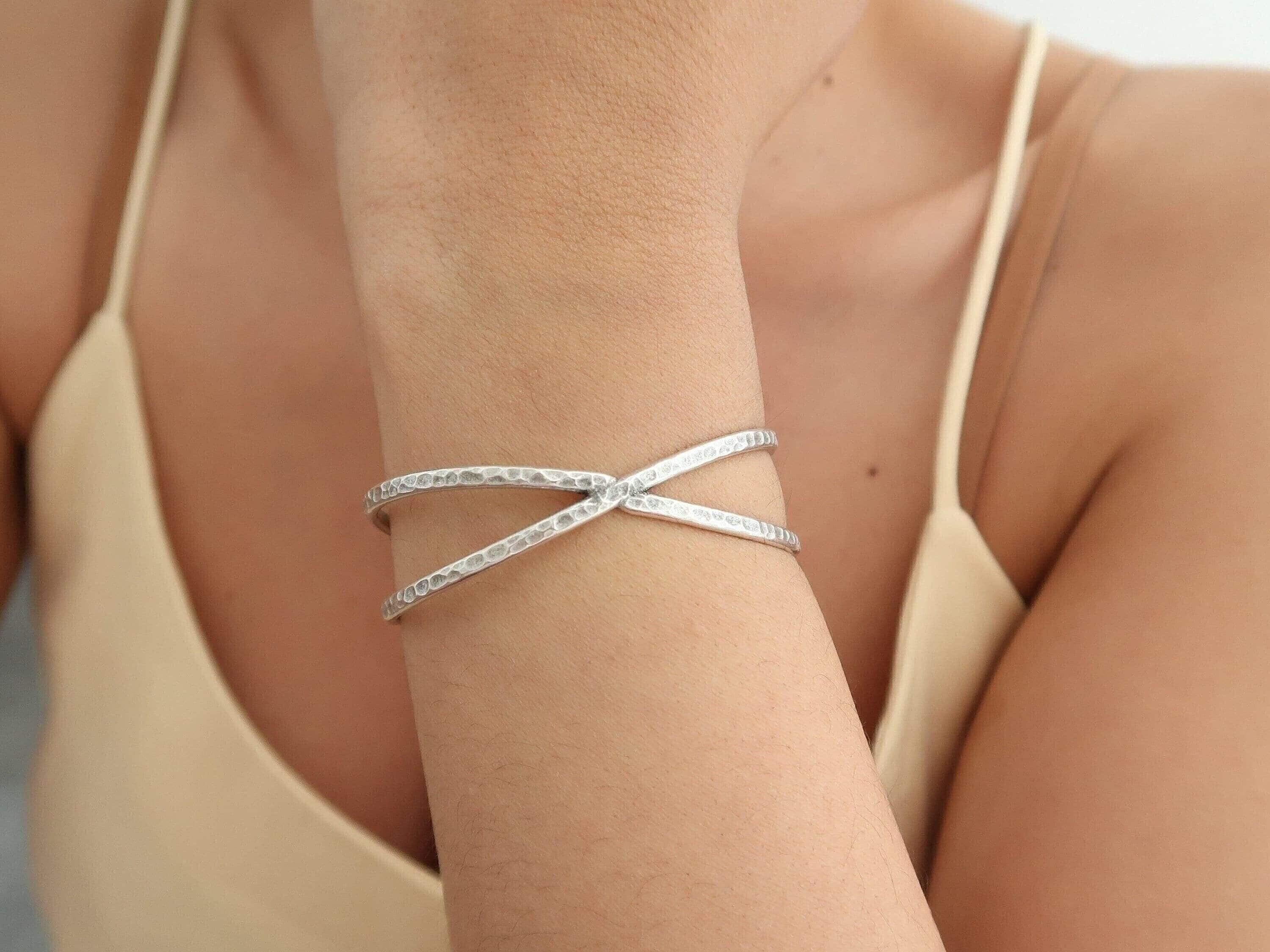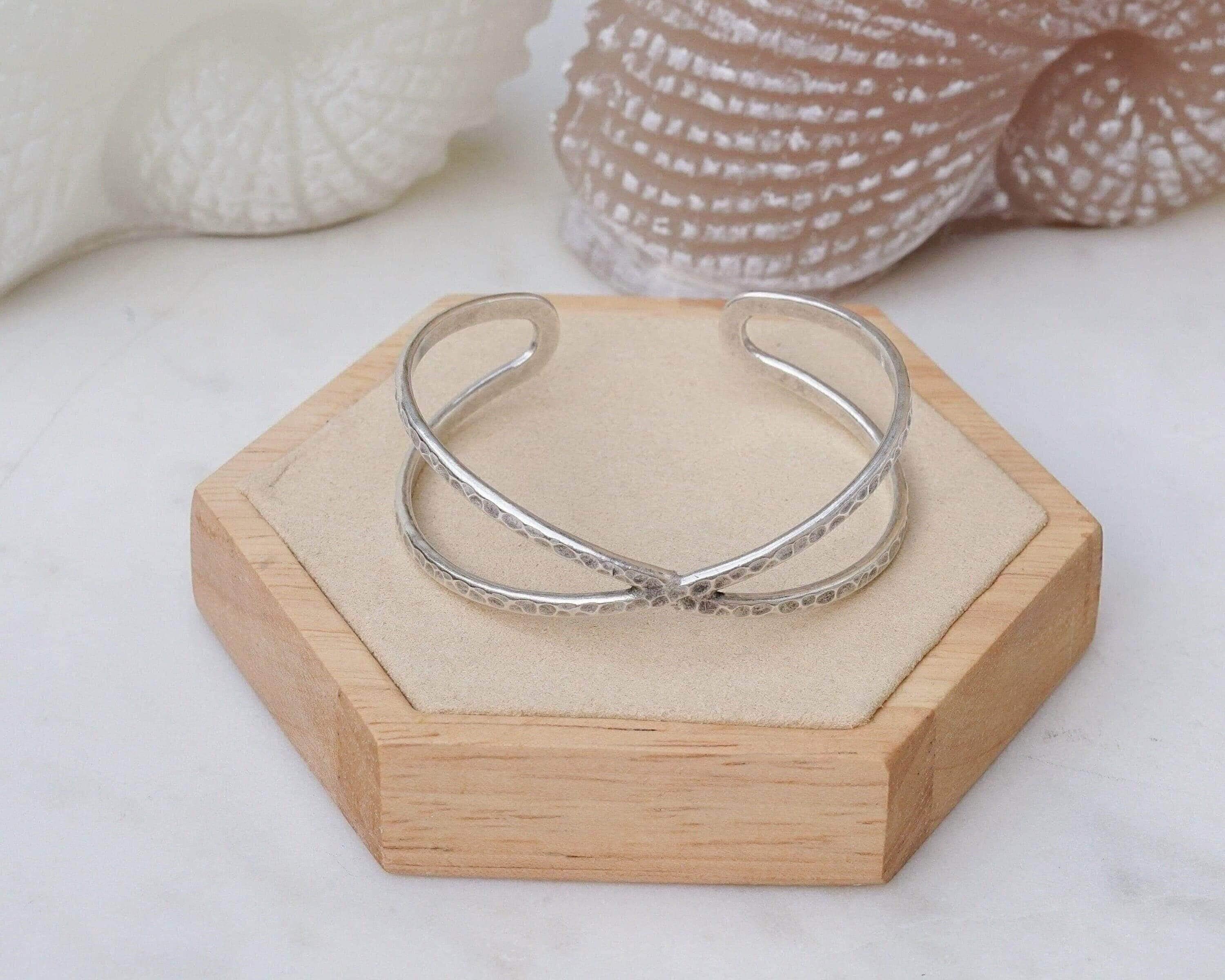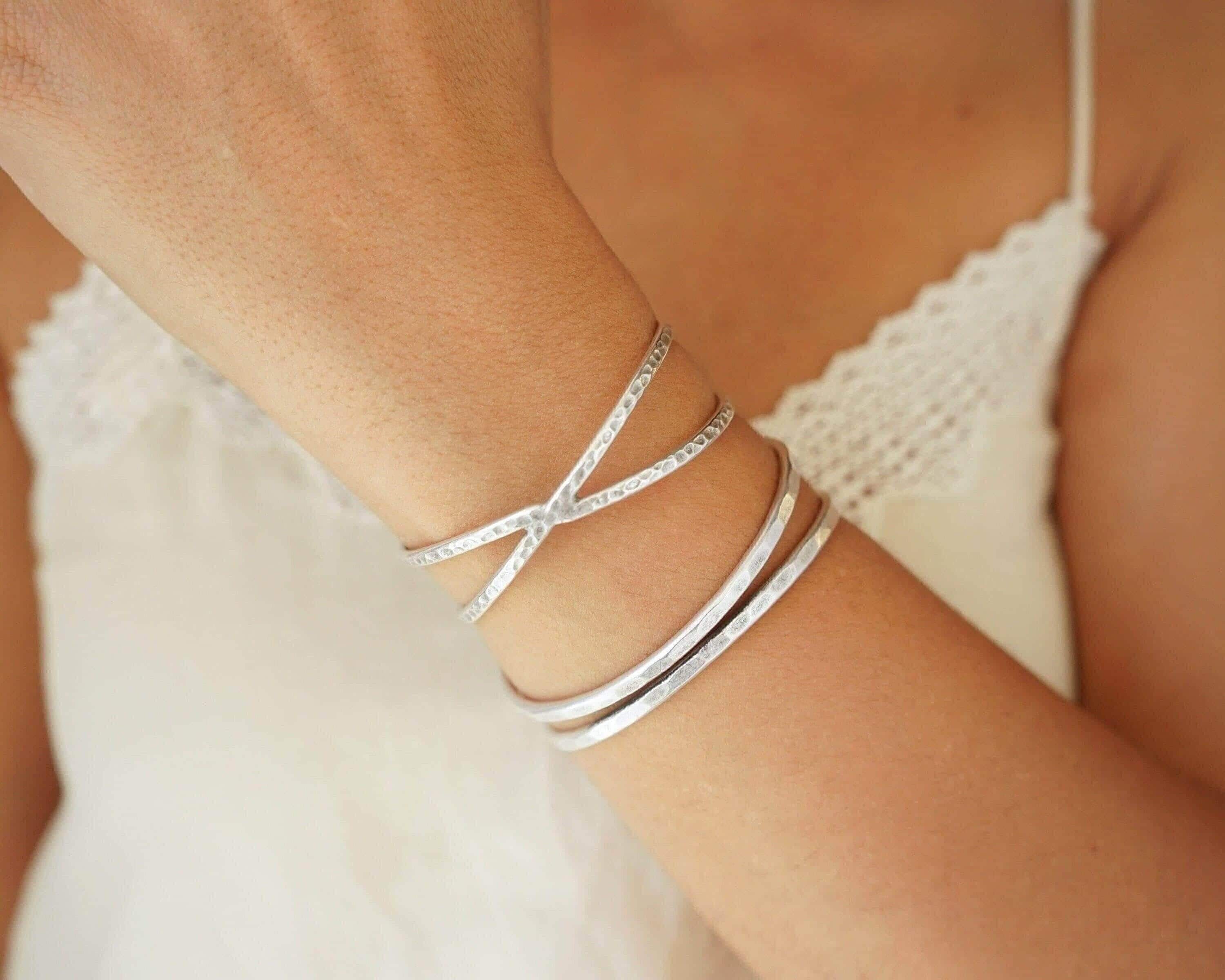 Silver Hammered Cuff Two Lines or X Design Stacking Bracelet