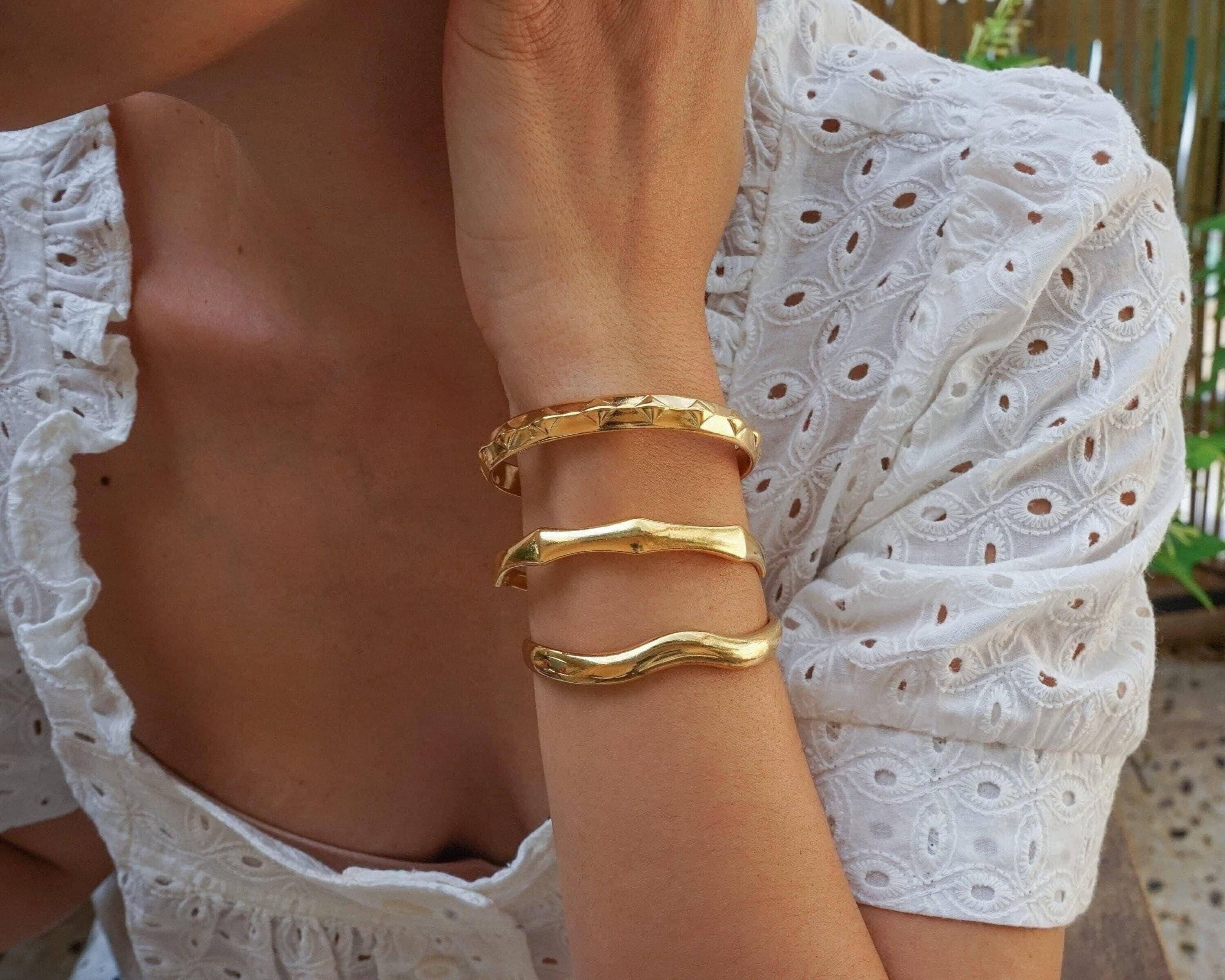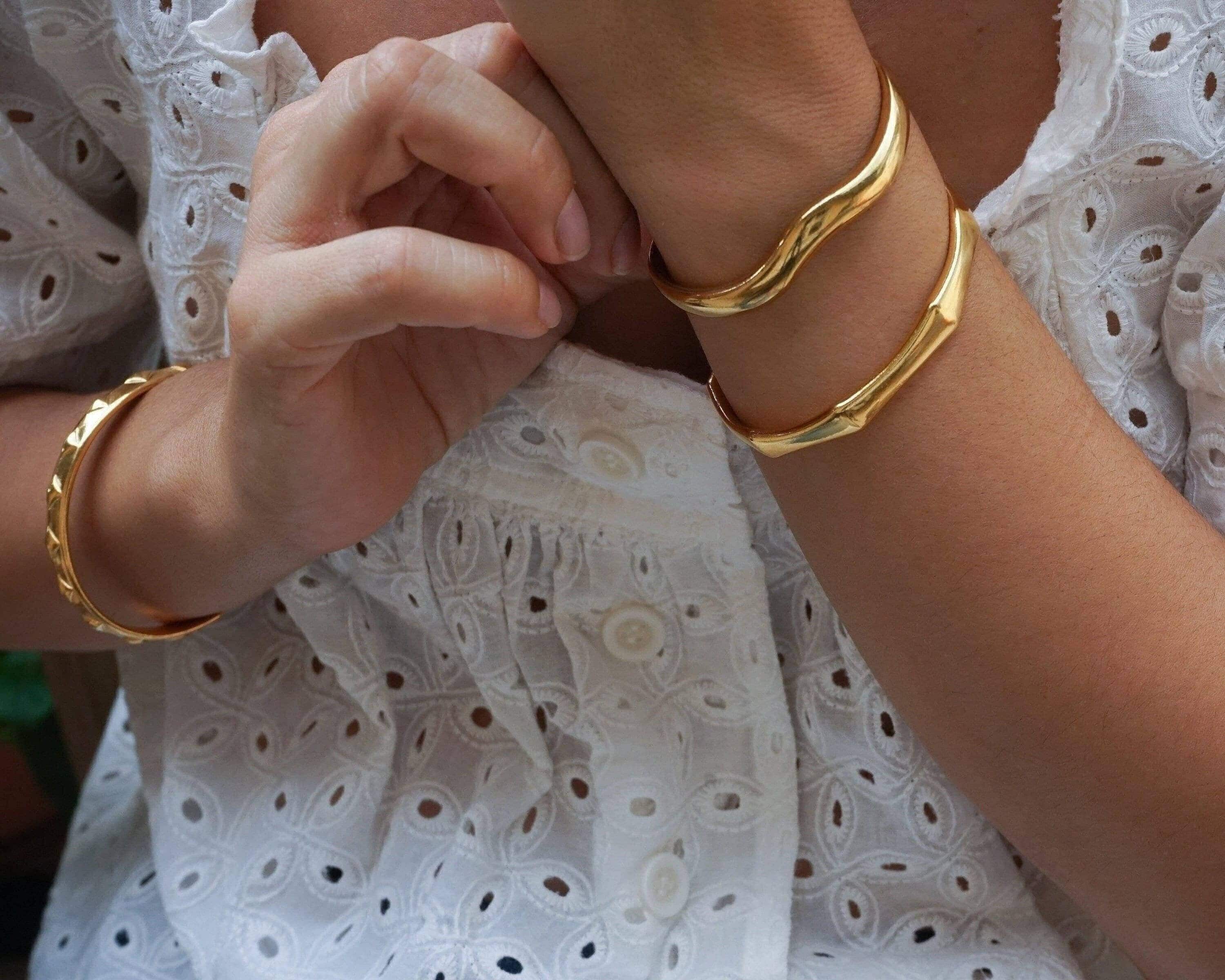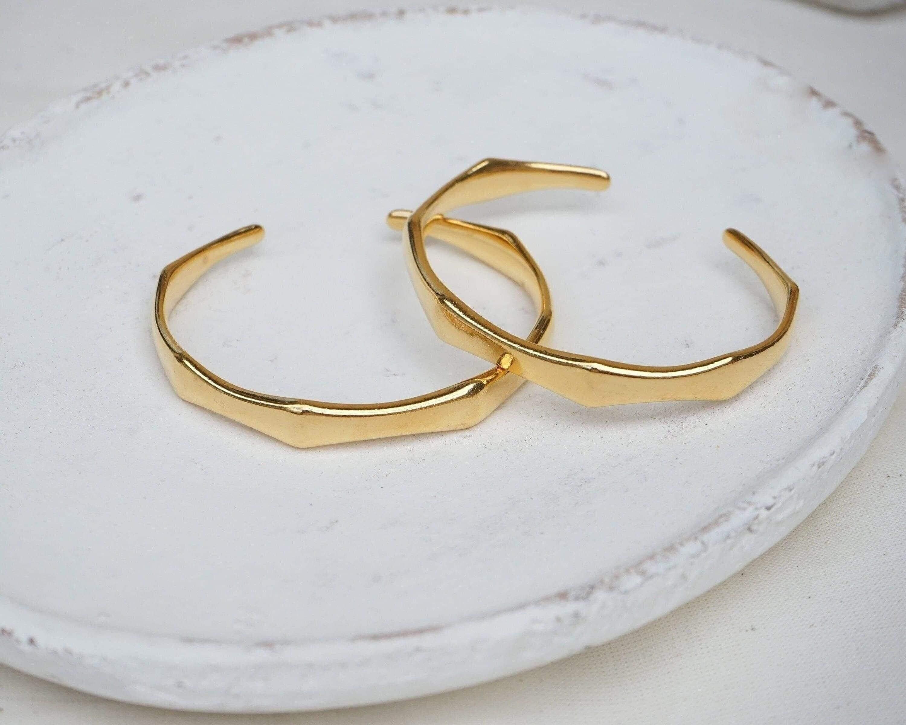 This sumptuous gold-plated cuff bracelet features a striking angular design, combining boldness with elegance. Its sophisticated aesthetic makes it a standout accessory, whether worn solo or paired with other cuffs and bangles.