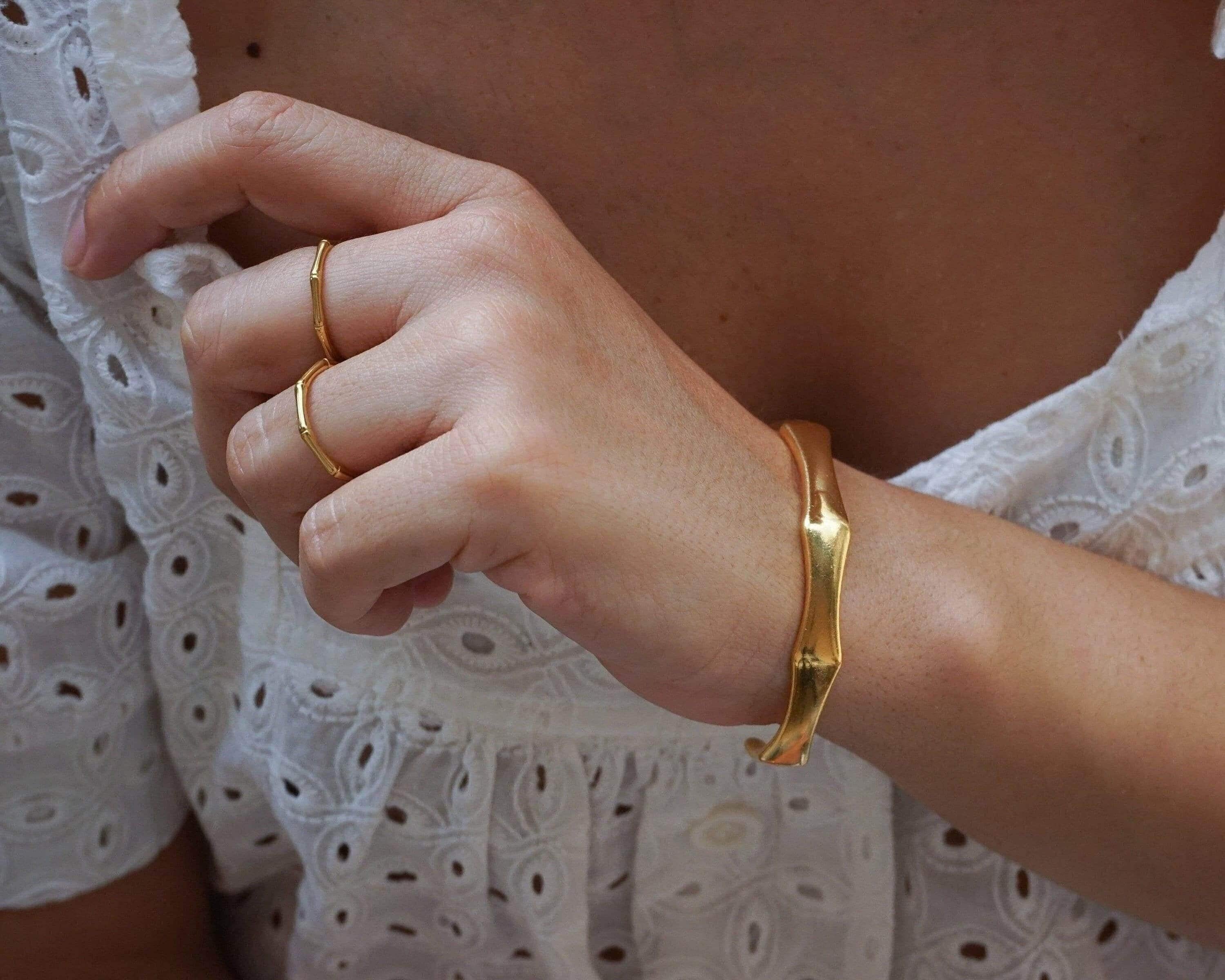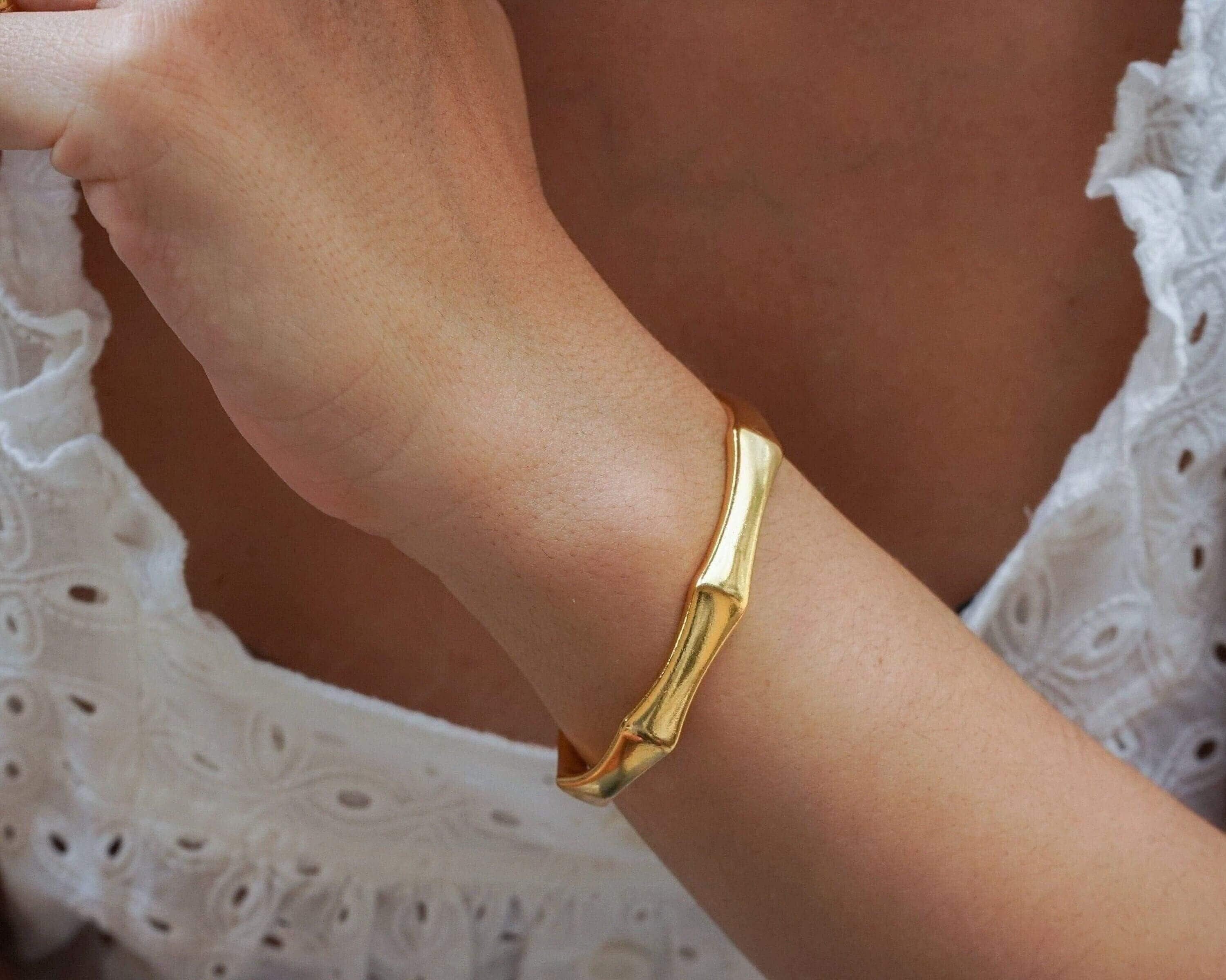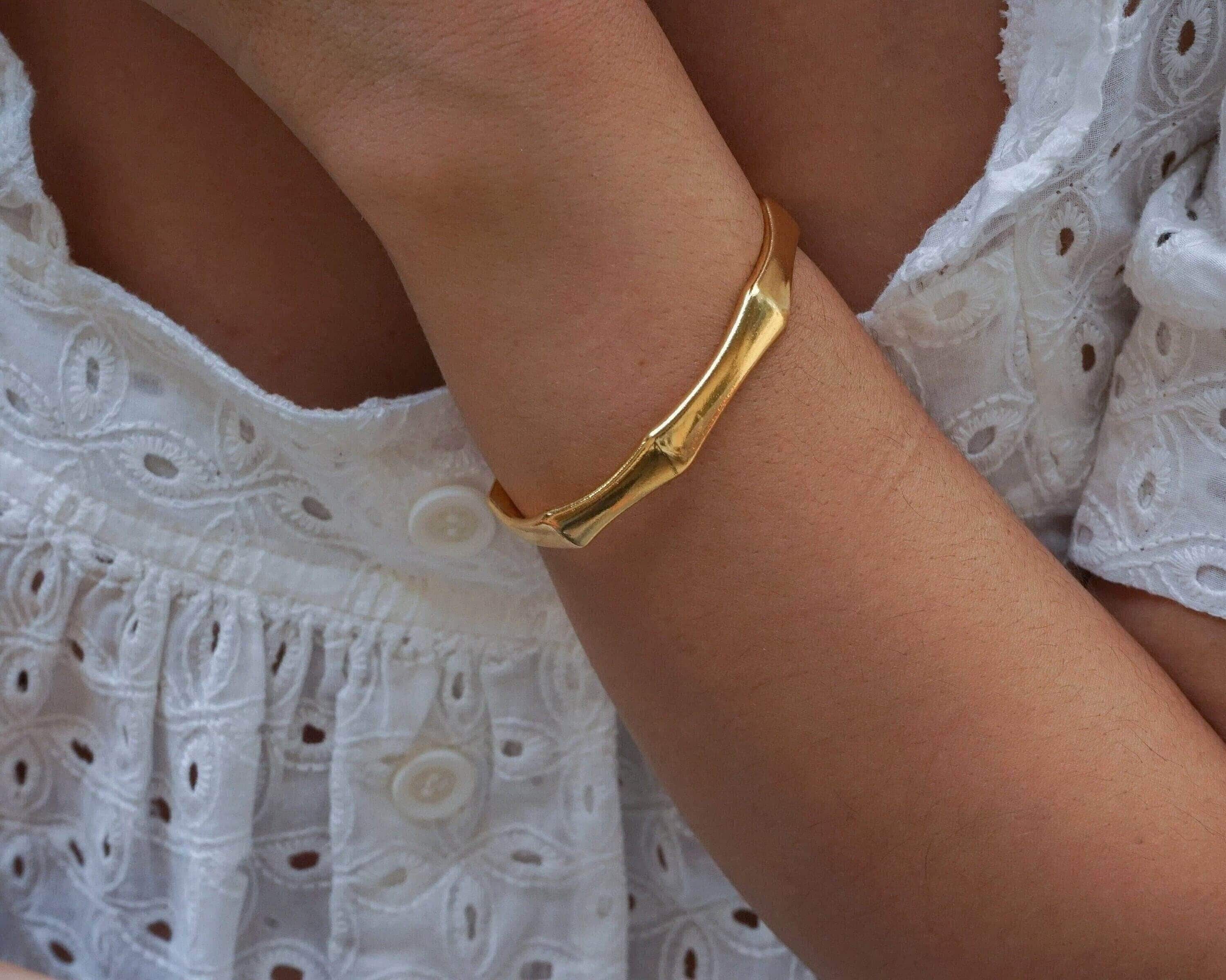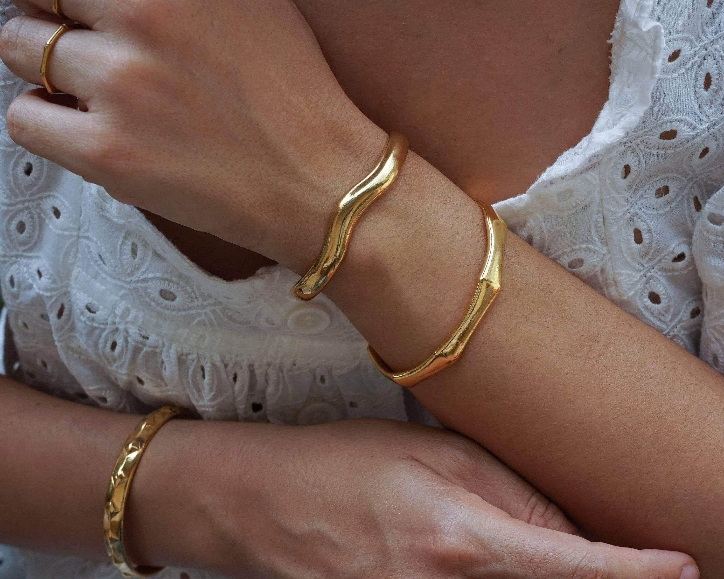 This sumptuous gold-plated cuff bracelet features a striking angular design, combining boldness with elegance. Its sophisticated aesthetic makes it a standout accessory, whether worn solo or paired with other cuffs and bangles.