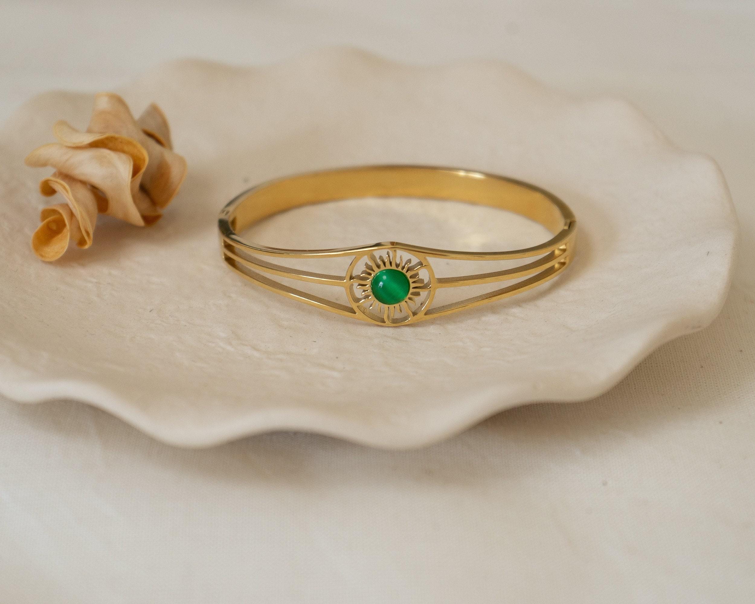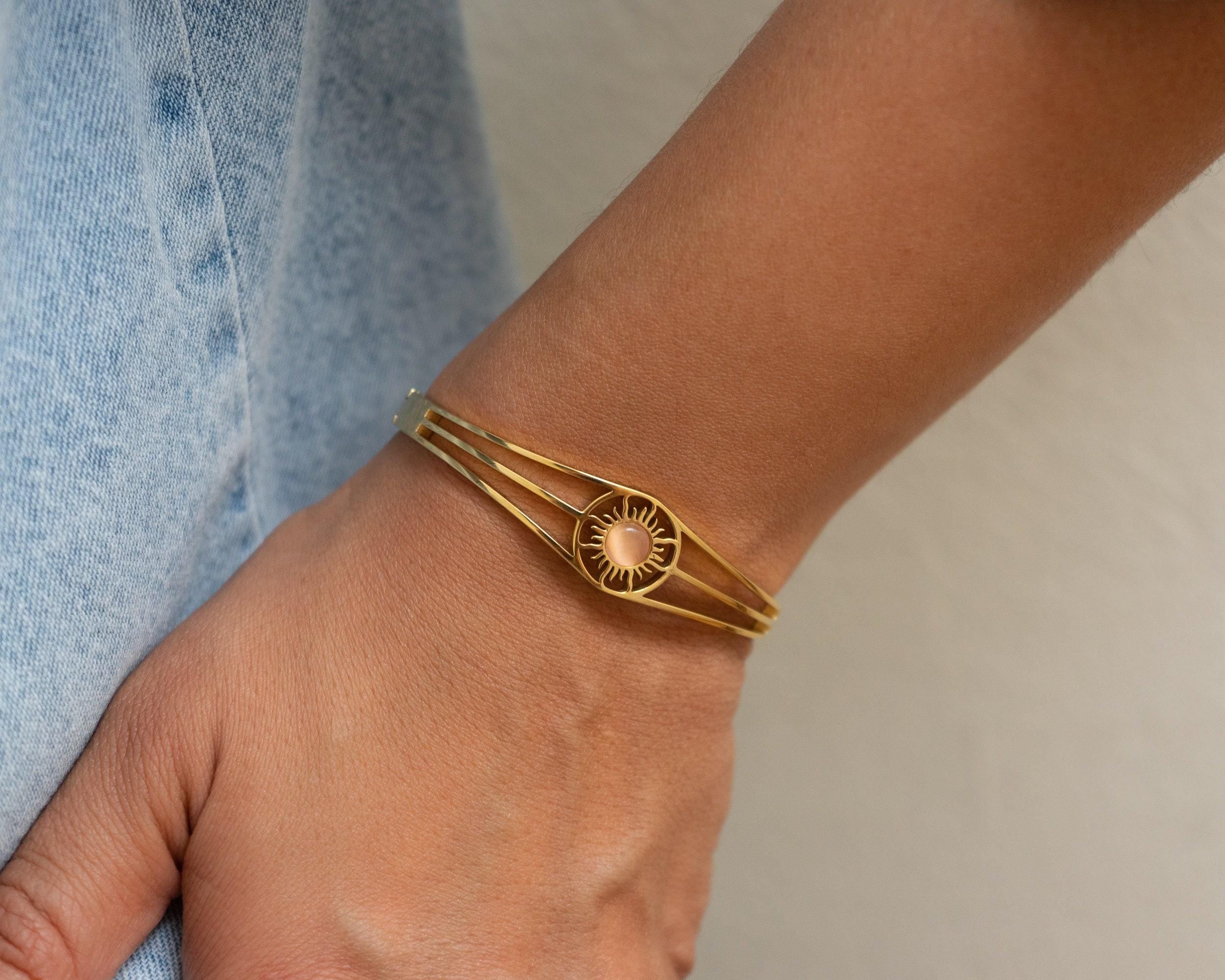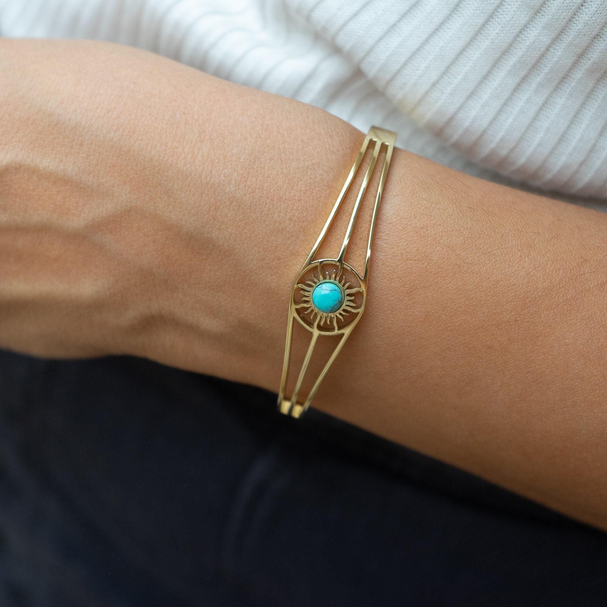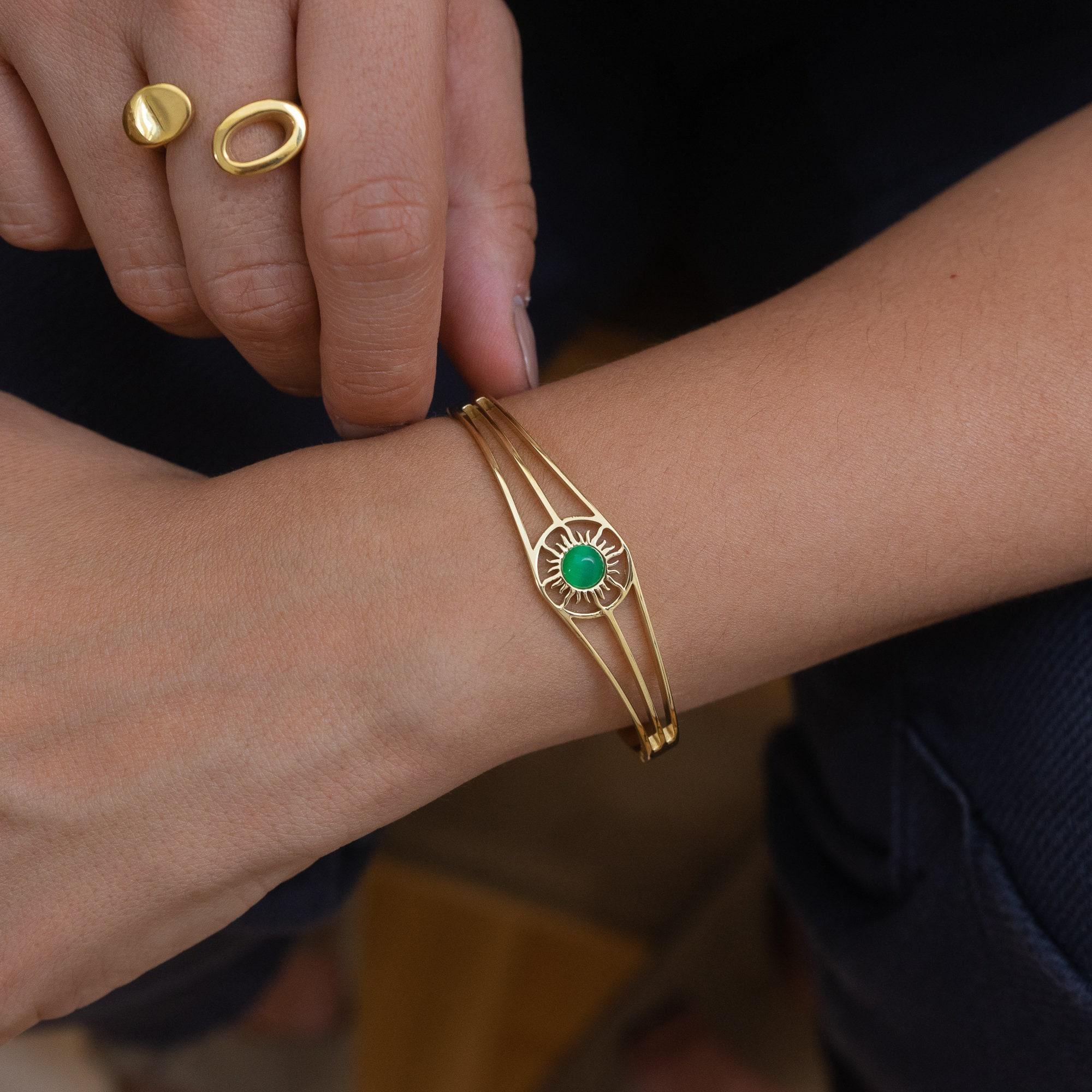 This exquisite gold bangle, featuring a radiant Sun motif, is the perfect addition to any jewelry collection. Designed with sophistication in mind, it’s versatile enough to complement both casual and formal outfits. The bangle is available with a choice of three stunning semi-precious stones: Turquoise, Beige Cat Eye, or Green Cat Eye, allowing you to personalize it to suit your style.