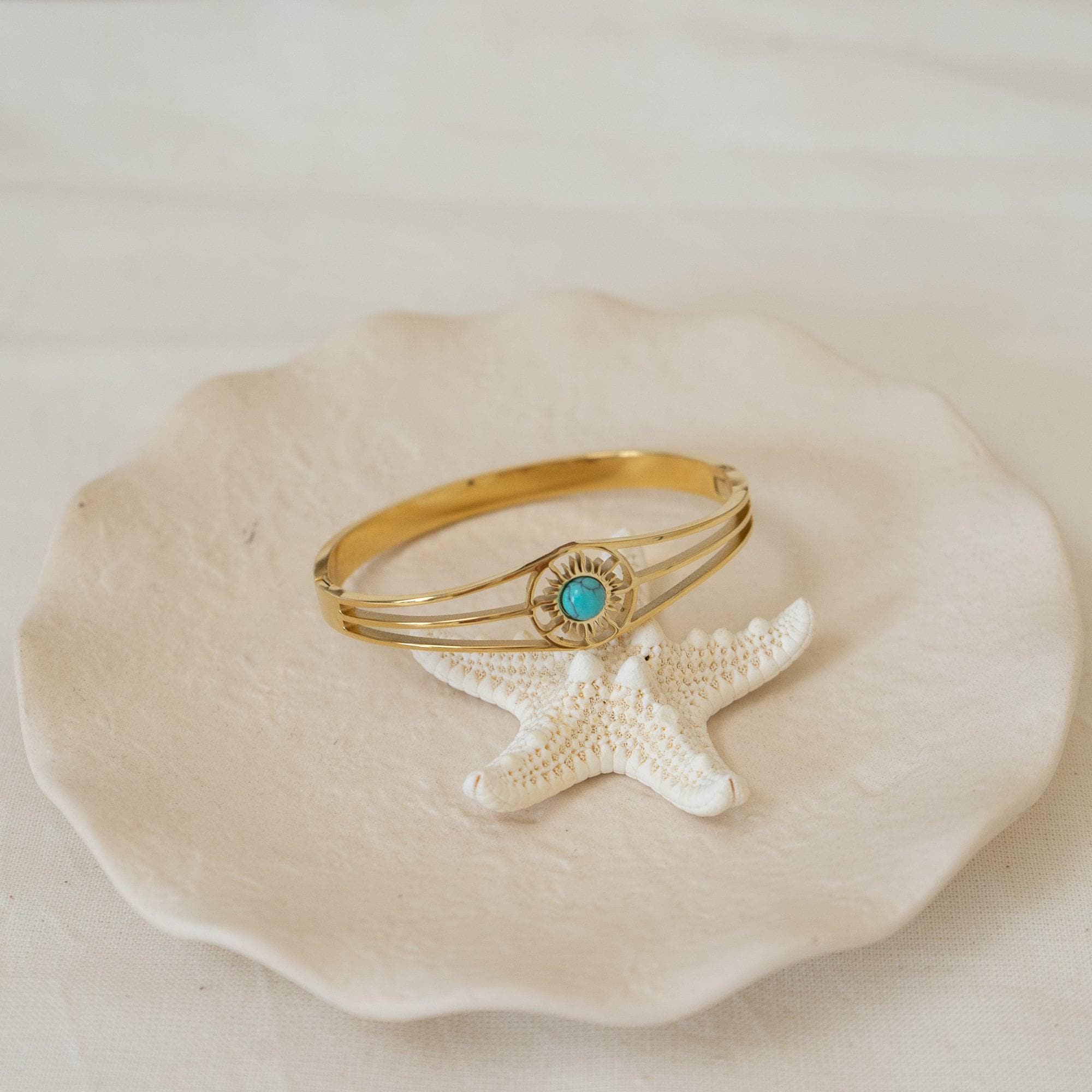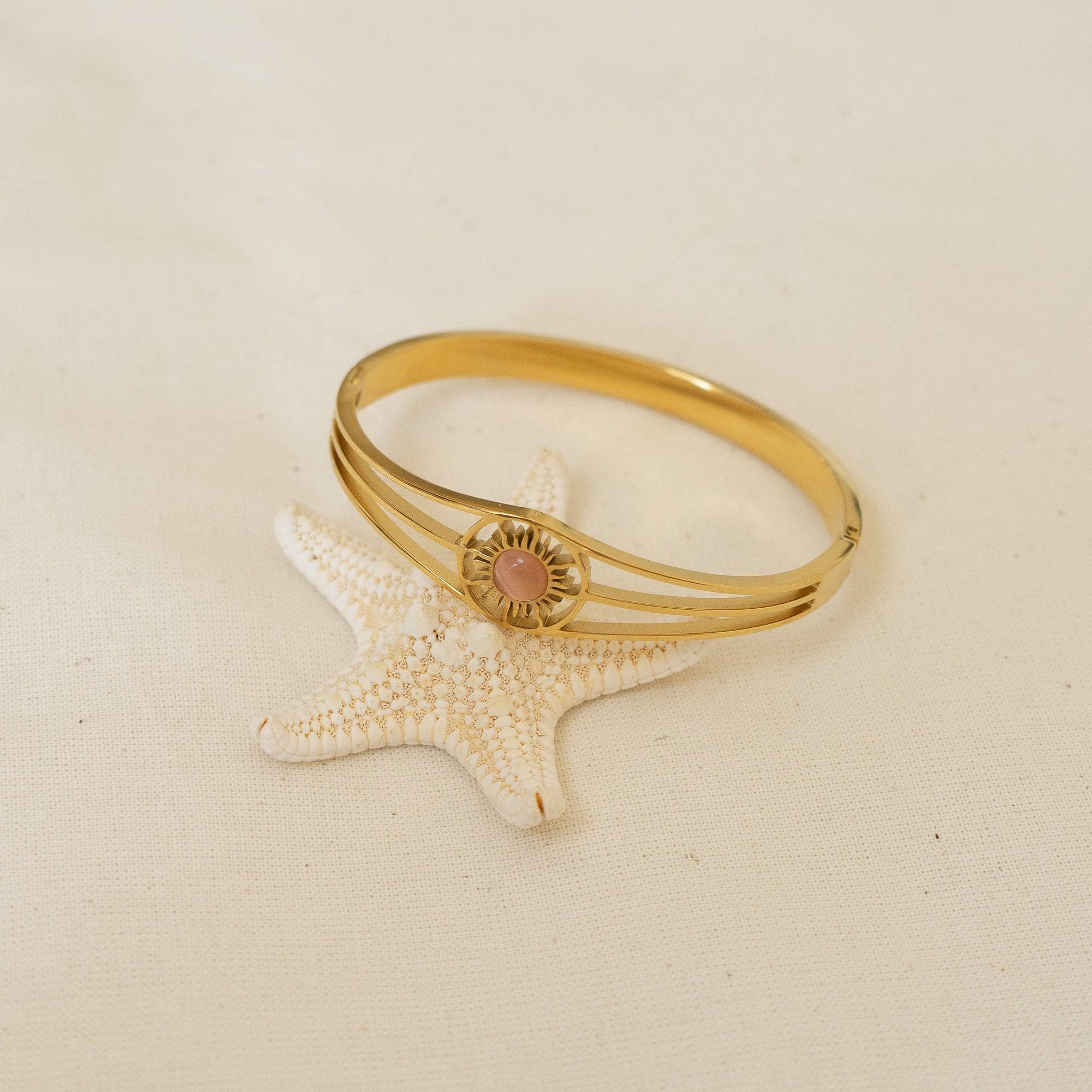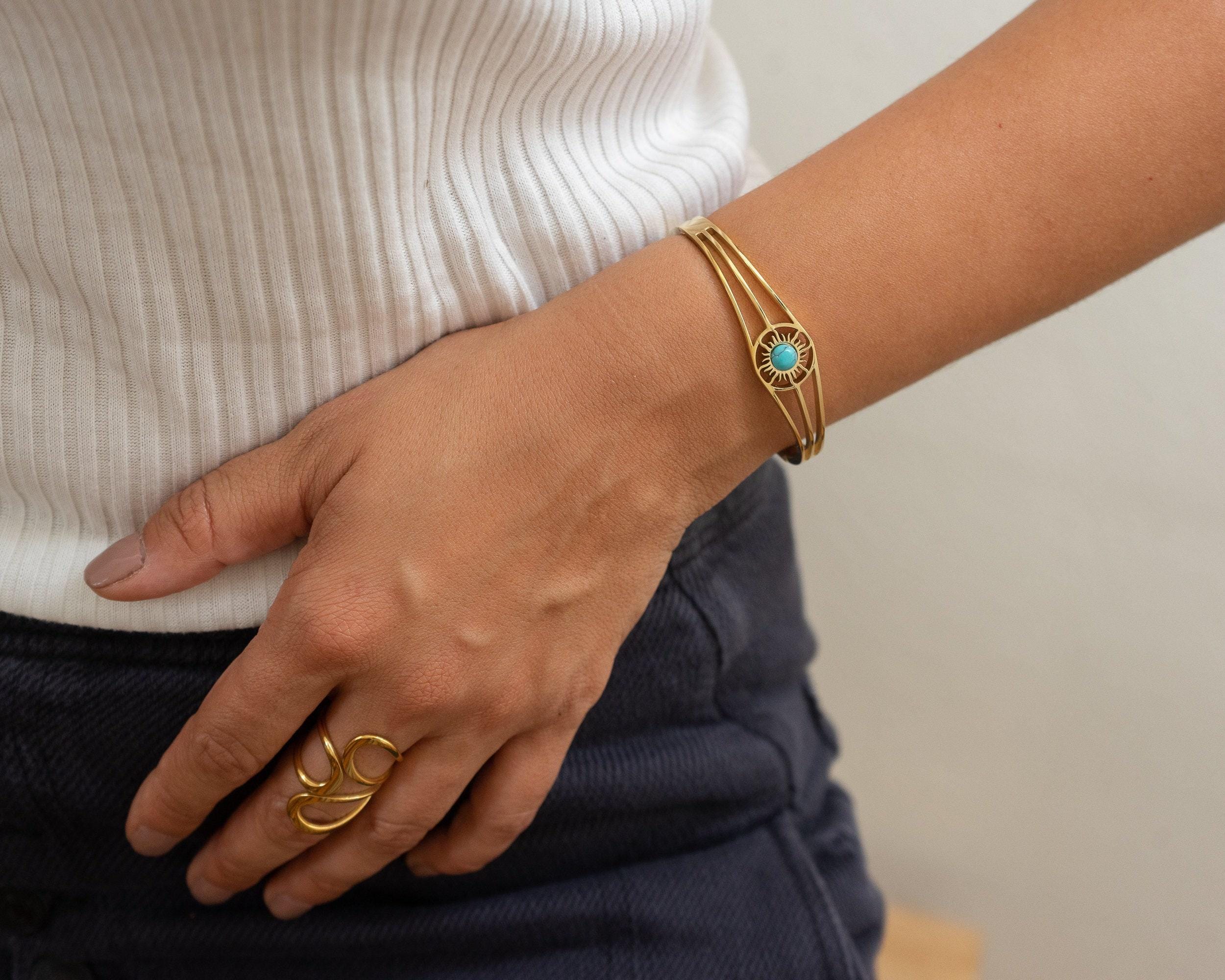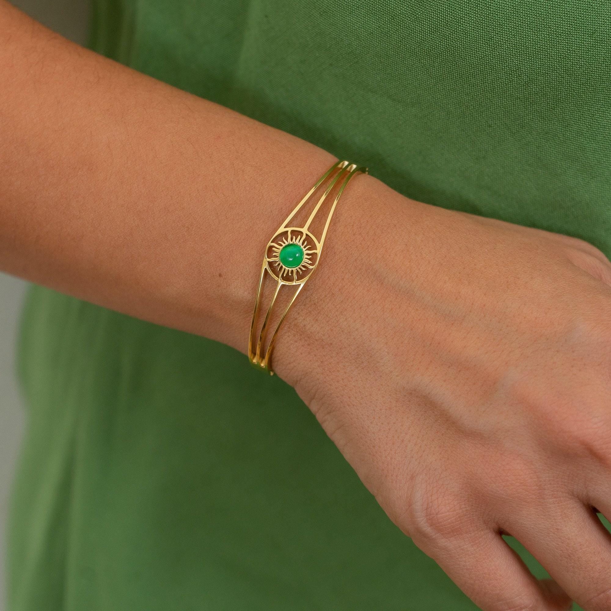 This exquisite gold bangle, featuring a radiant Sun motif, is the perfect addition to any jewelry collection. Designed with sophistication in mind, it’s versatile enough to complement both casual and formal outfits. The bangle is available with a choice of three stunning semi-precious stones: Turquoise, Beige Cat Eye, or Green Cat Eye, allowing you to personalize it to suit your style.