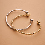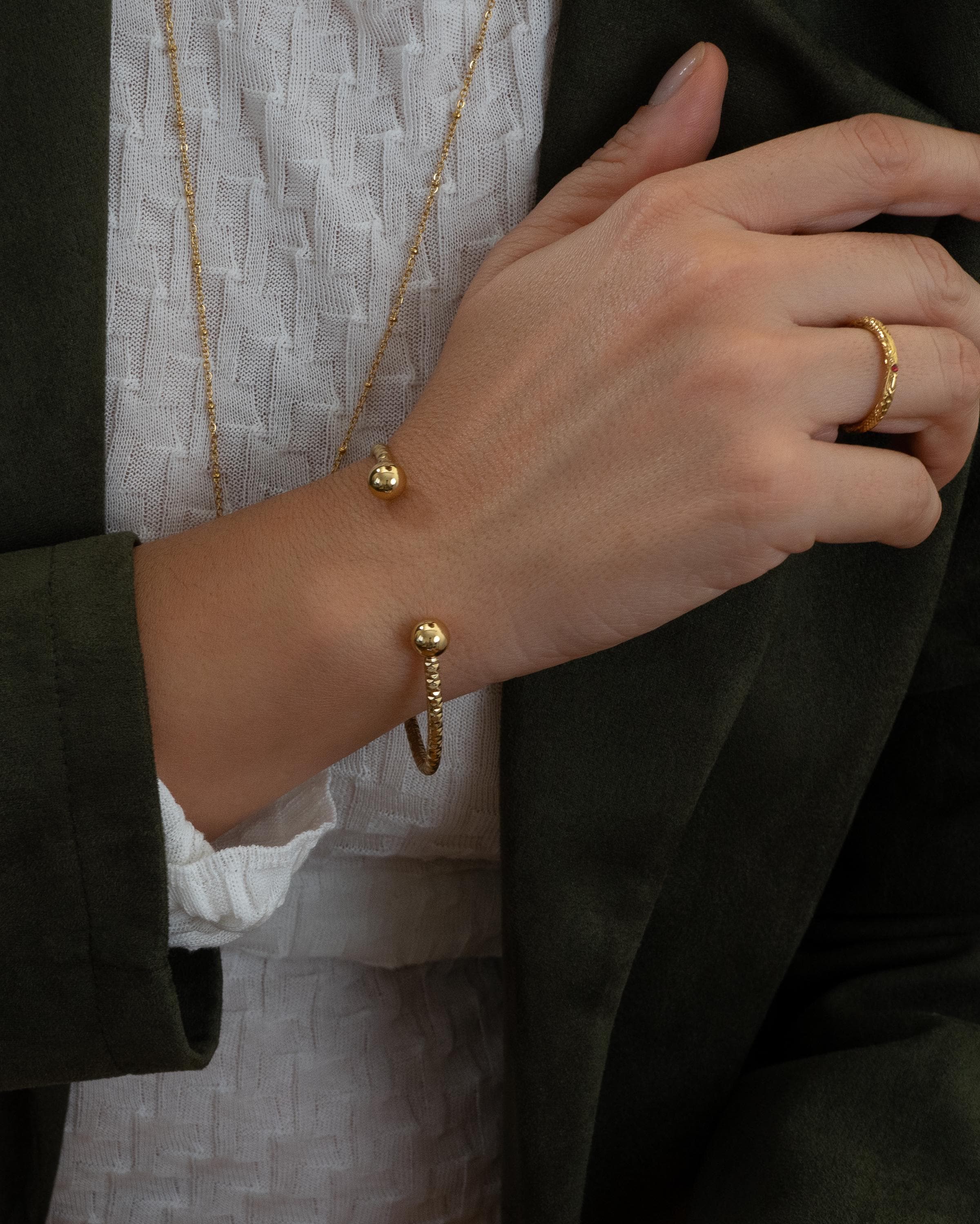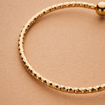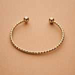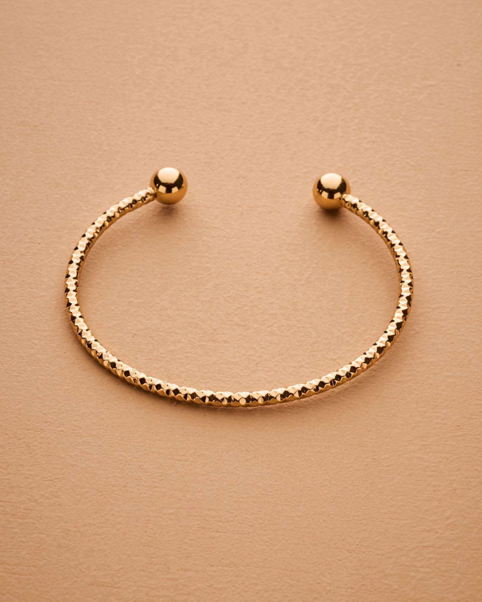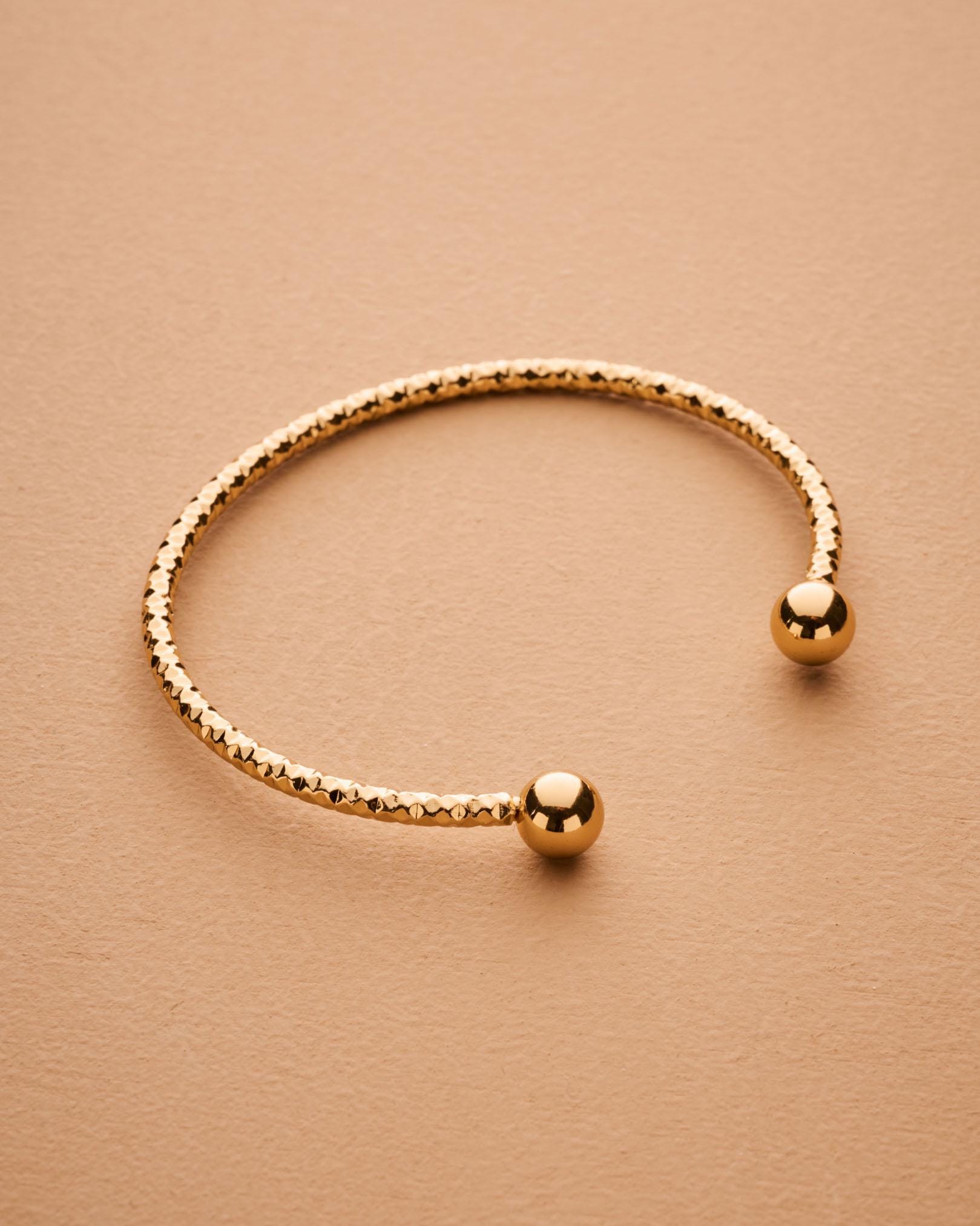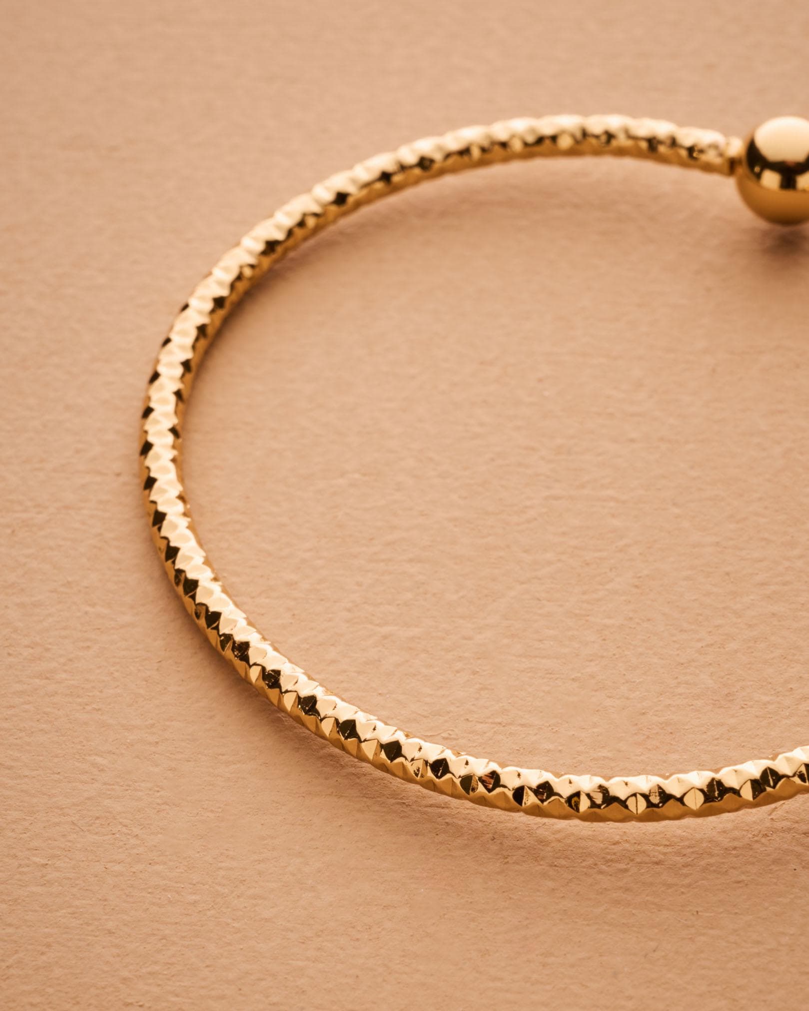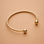 This gold diamond-cut wire bracelet is your go-to everyday cuff. Designed in stainless steel with a high-polish gold finish, it features a sculptural diamond-cut texture and 8mm ball ends. The open cuff style allows for easy wear and light adjustability, making it a perfect addition to your layered bracelet stack or worn alone for a bold minimalist look.