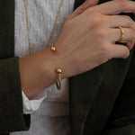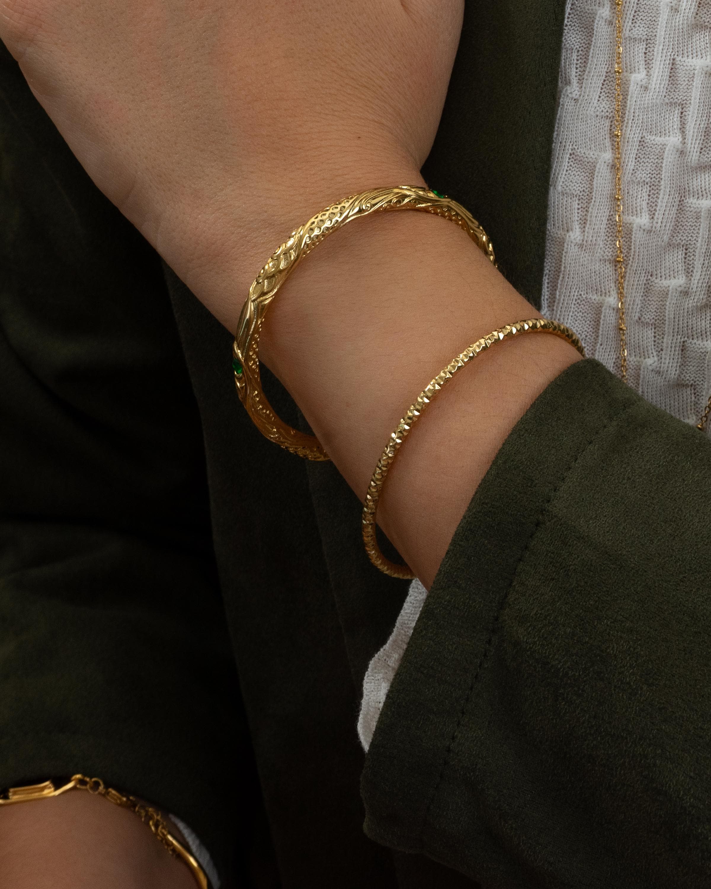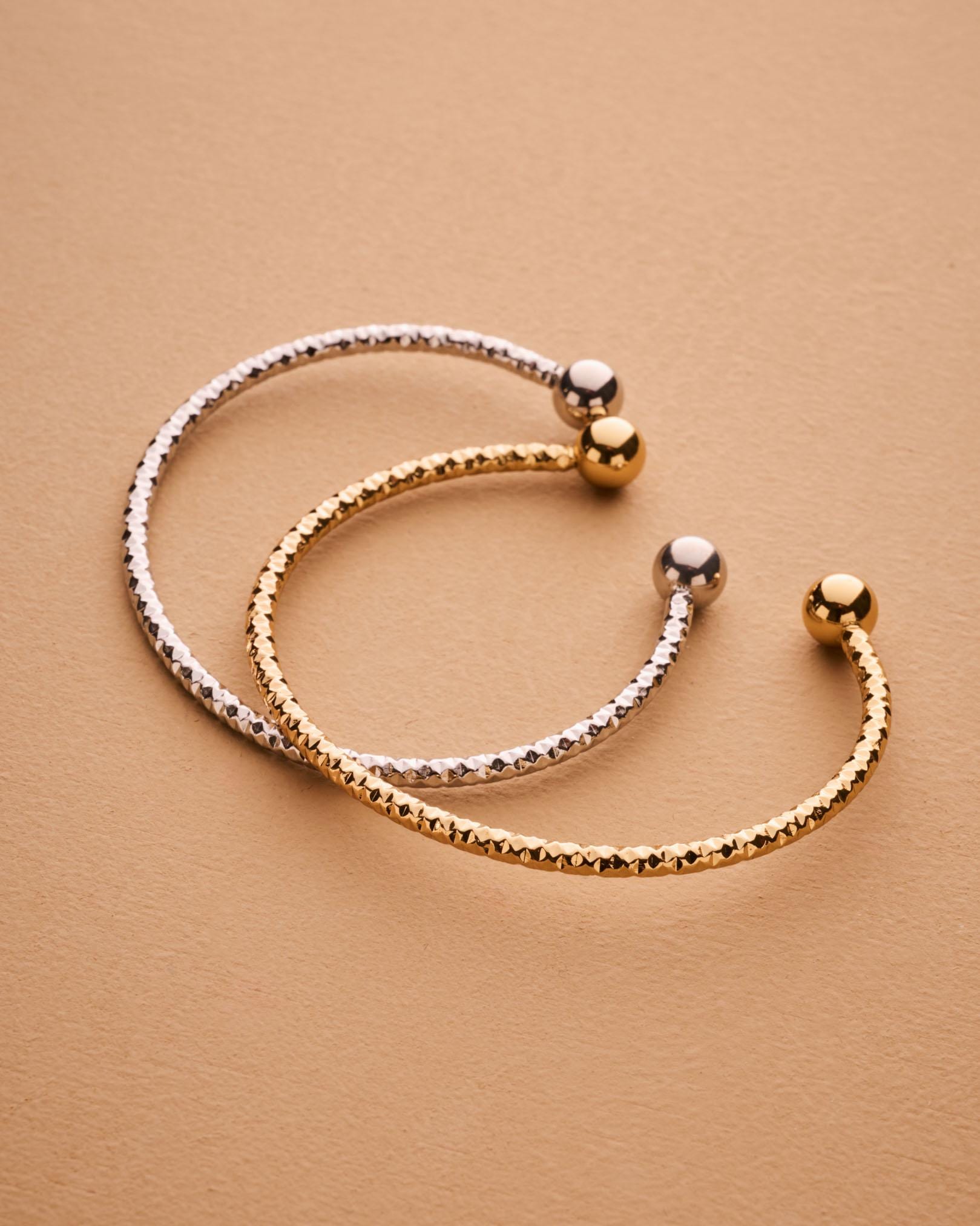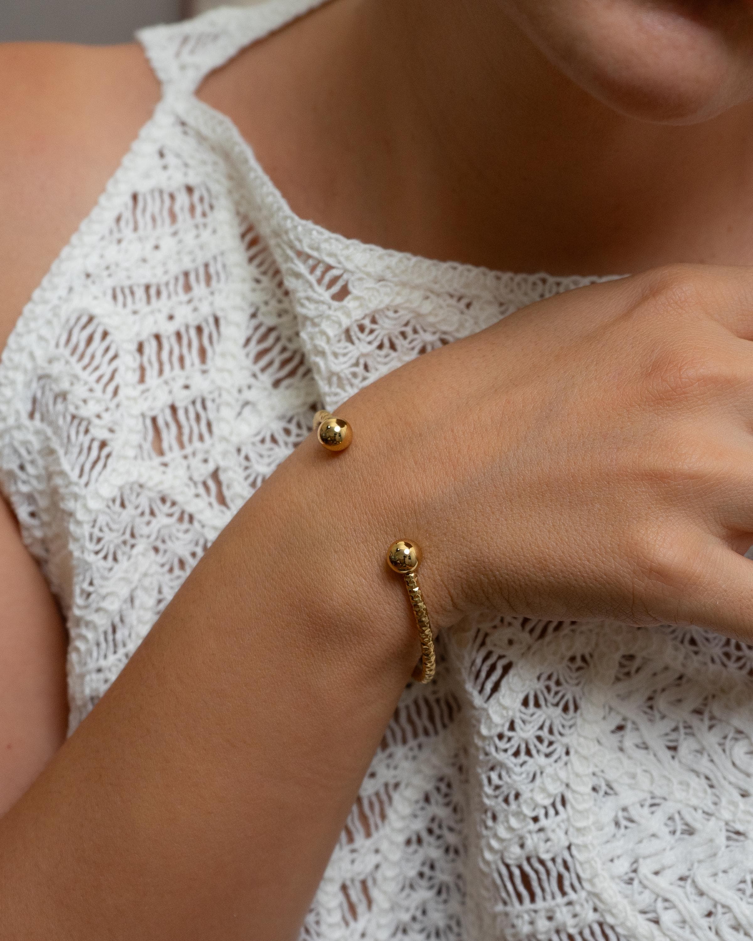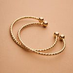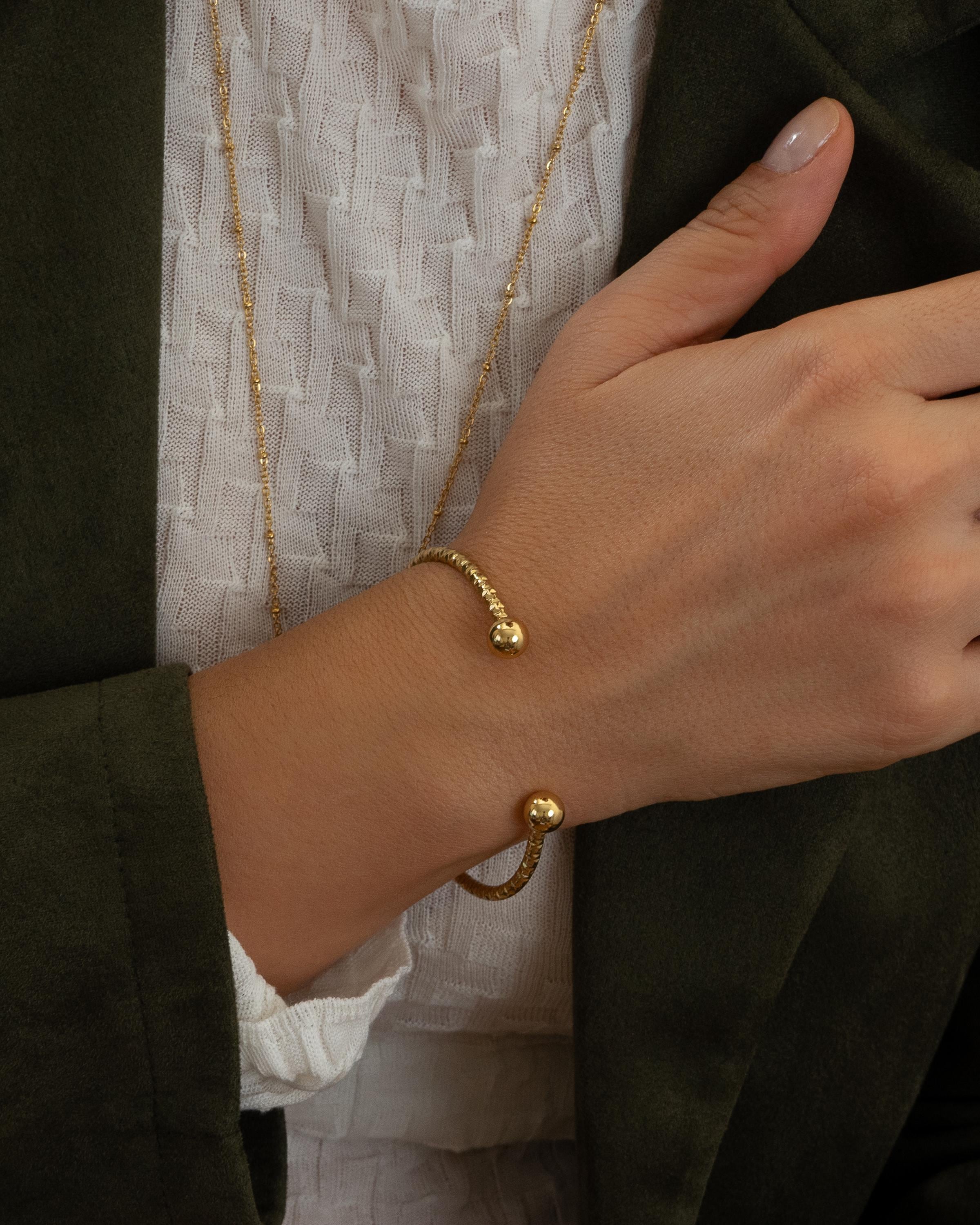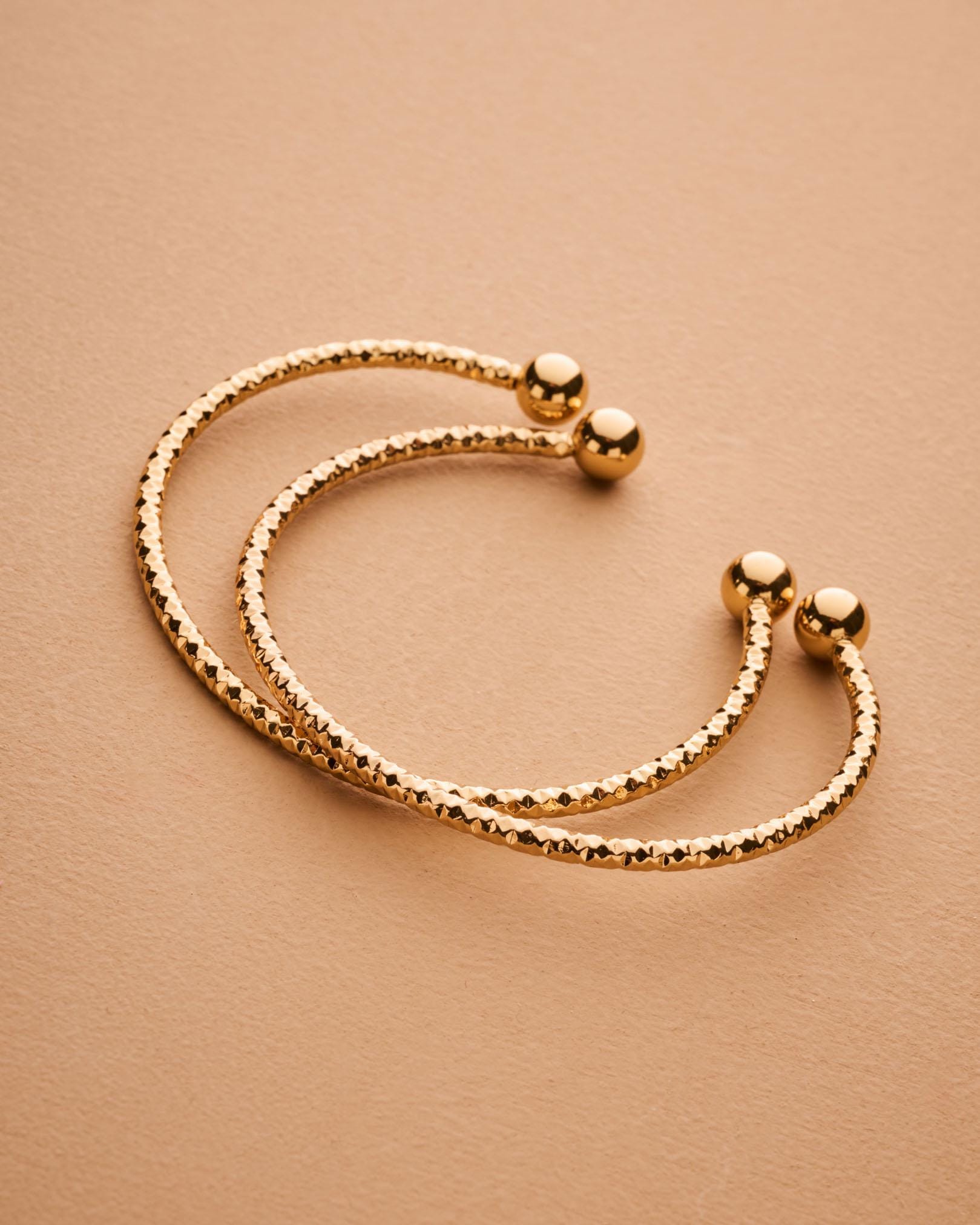 This gold diamond-cut wire bracelet is your go-to everyday cuff. Designed in stainless steel with a high-polish gold finish, it features a sculptural diamond-cut texture and 8mm ball ends. The open cuff style allows for easy wear and light adjustability, making it a perfect addition to your layered bracelet stack or worn alone for a bold minimalist look.