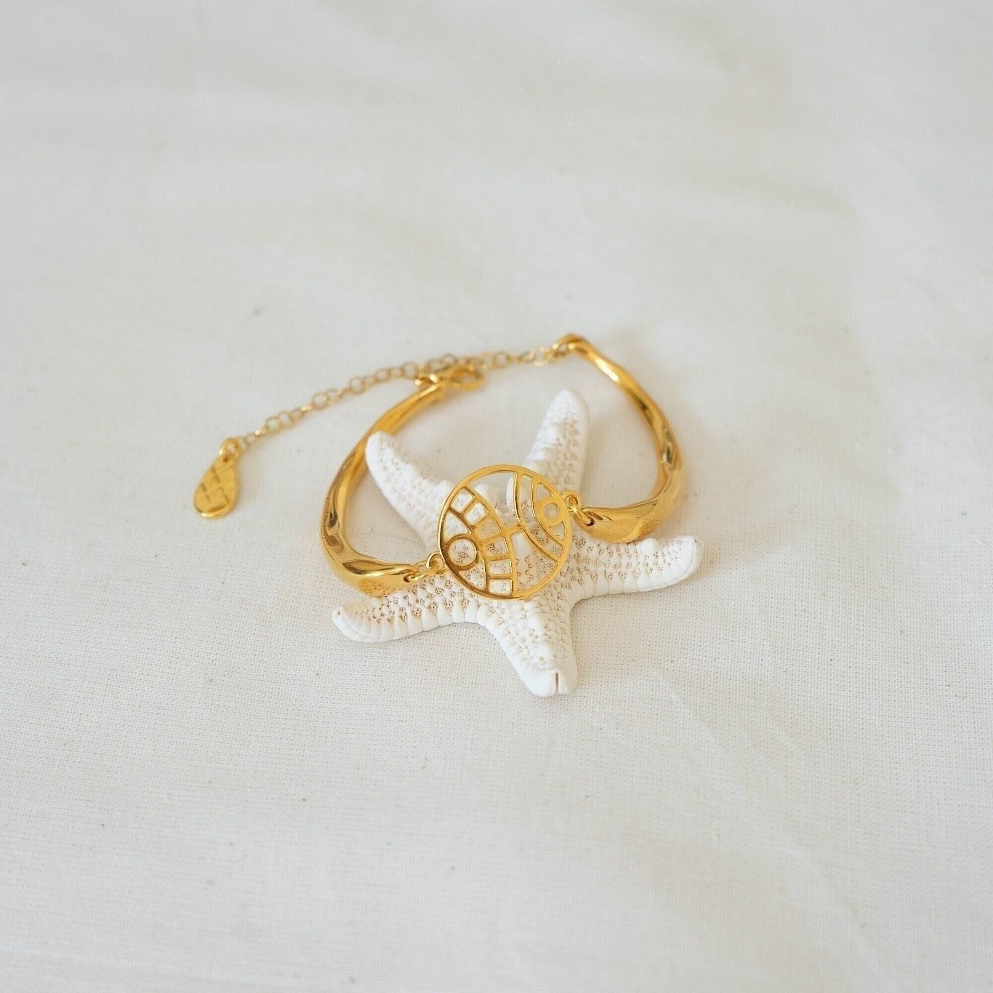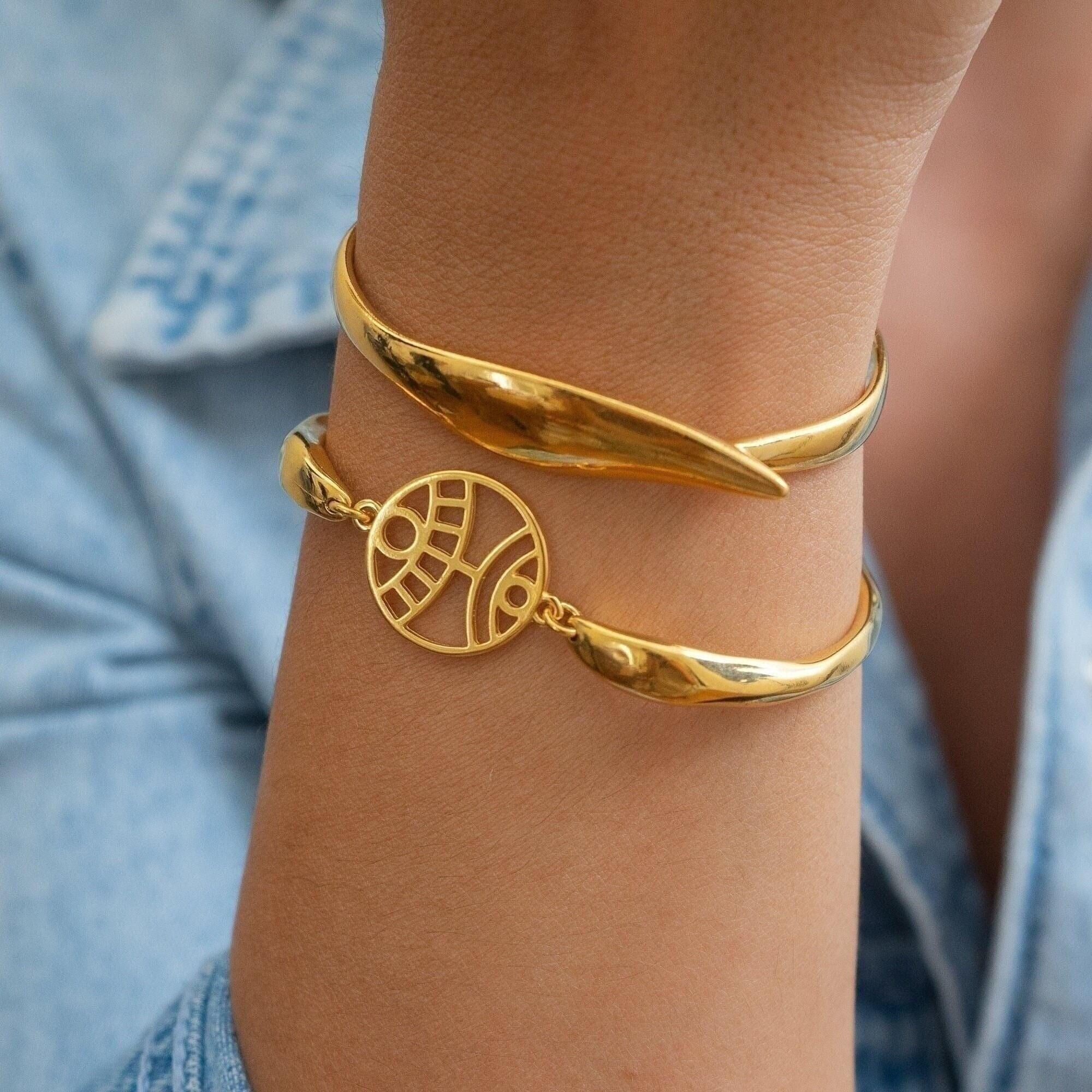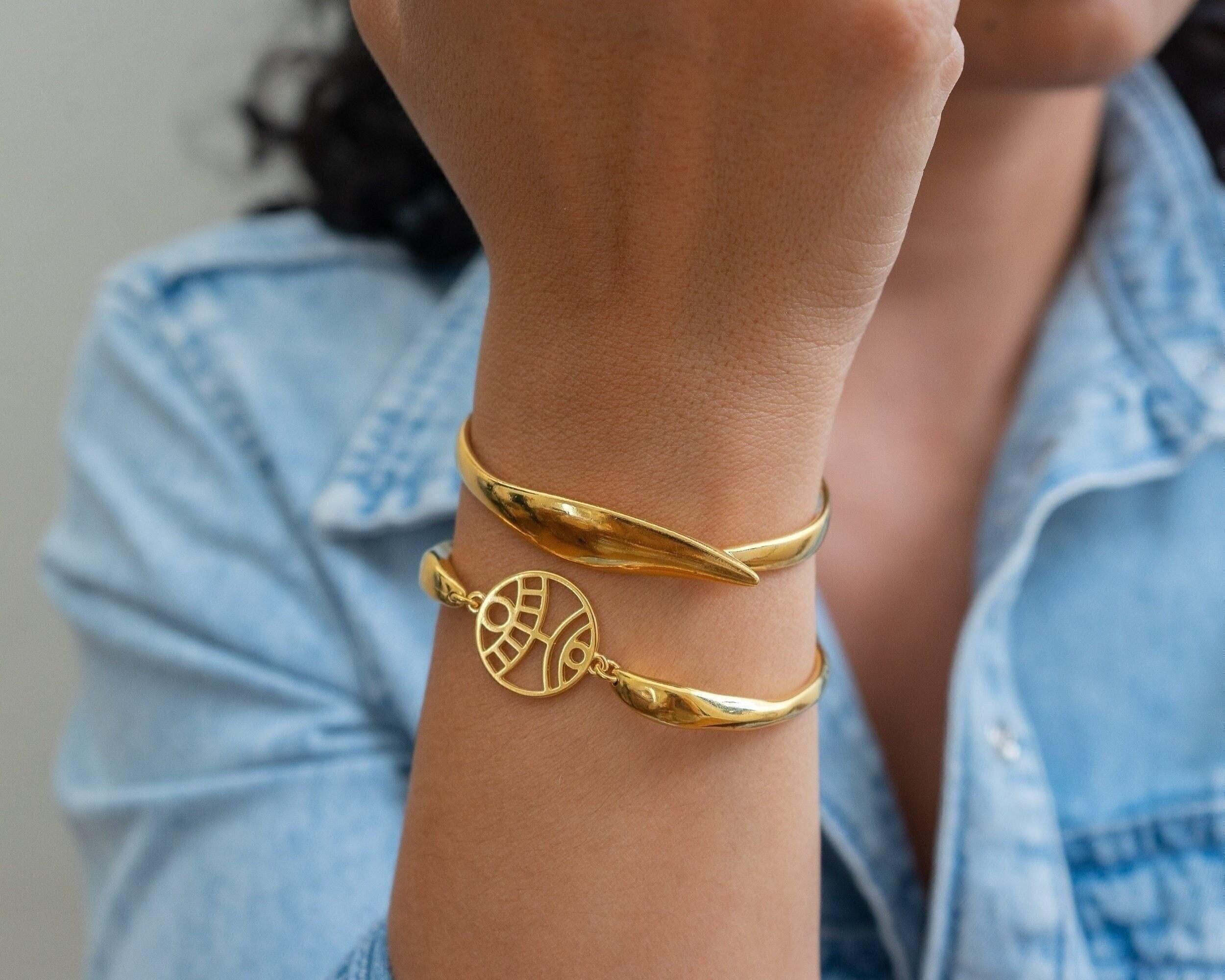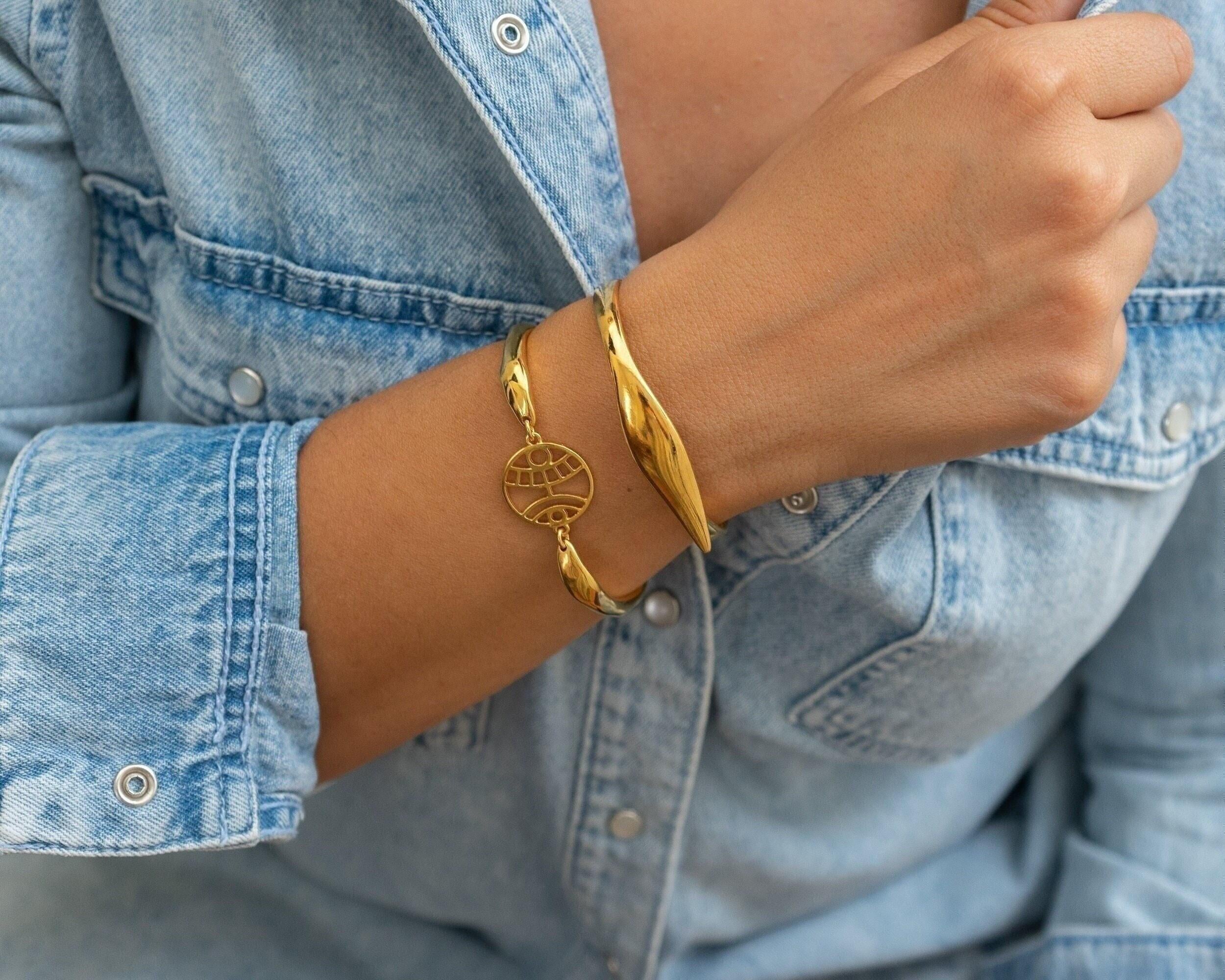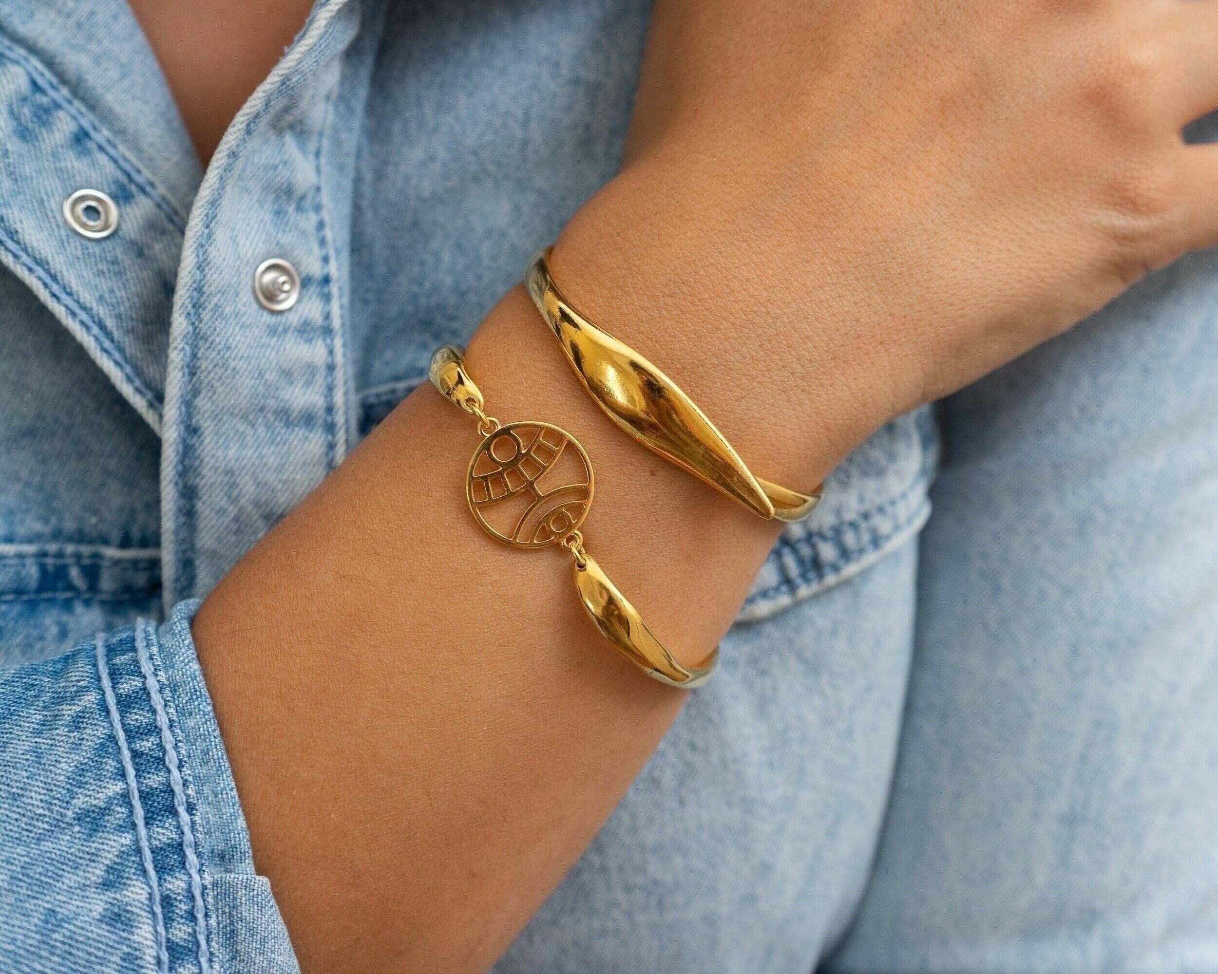 A statement piece that blends elegance with symbolism, this gold-plated cuff bracelet showcases two intricately hammered carved connectors and a bold Evil Eye pendant. Known for its protective and positive energy, the Evil Eye adds both style and meaning to this timeless design.