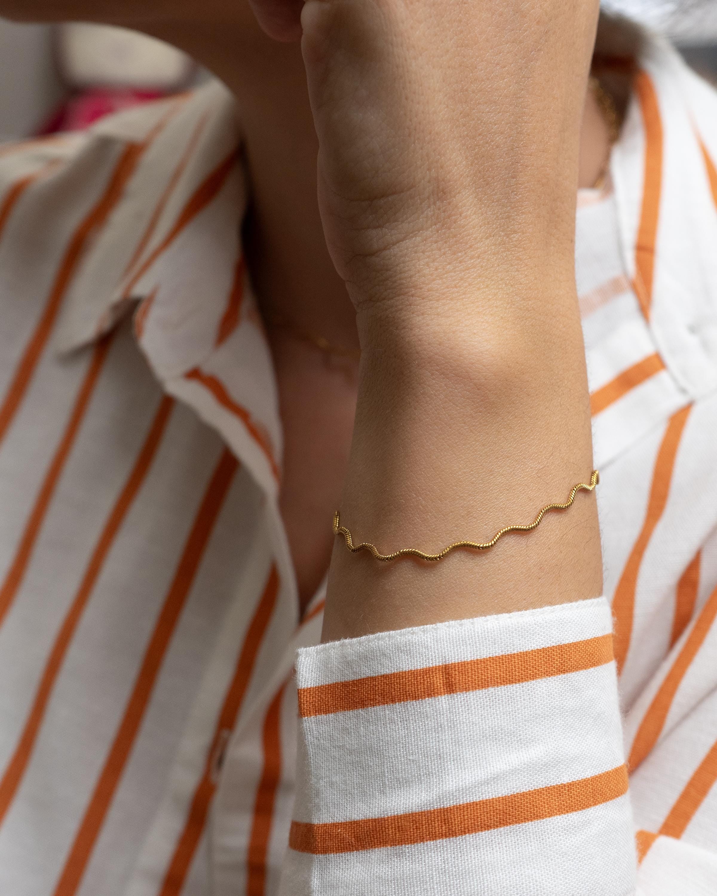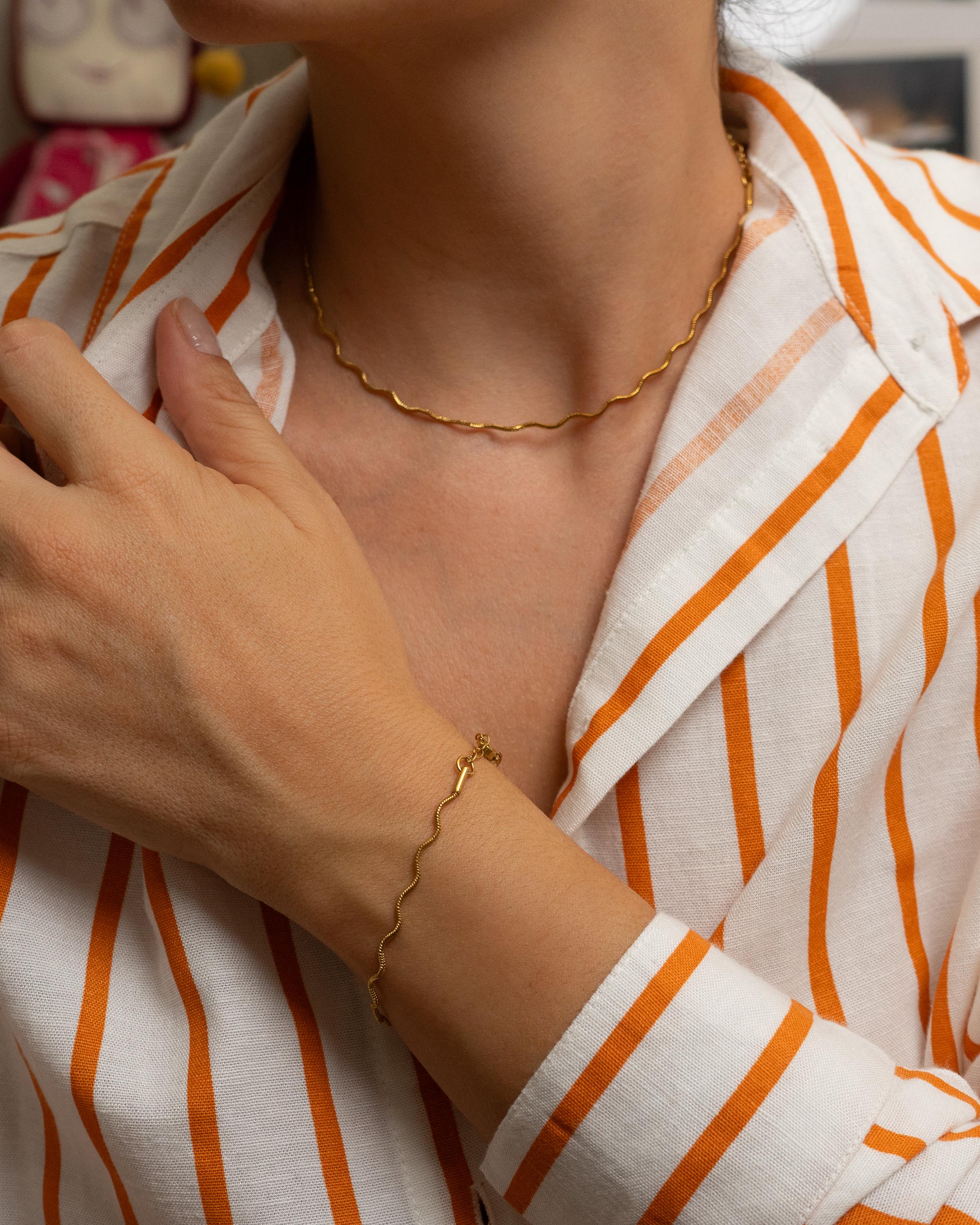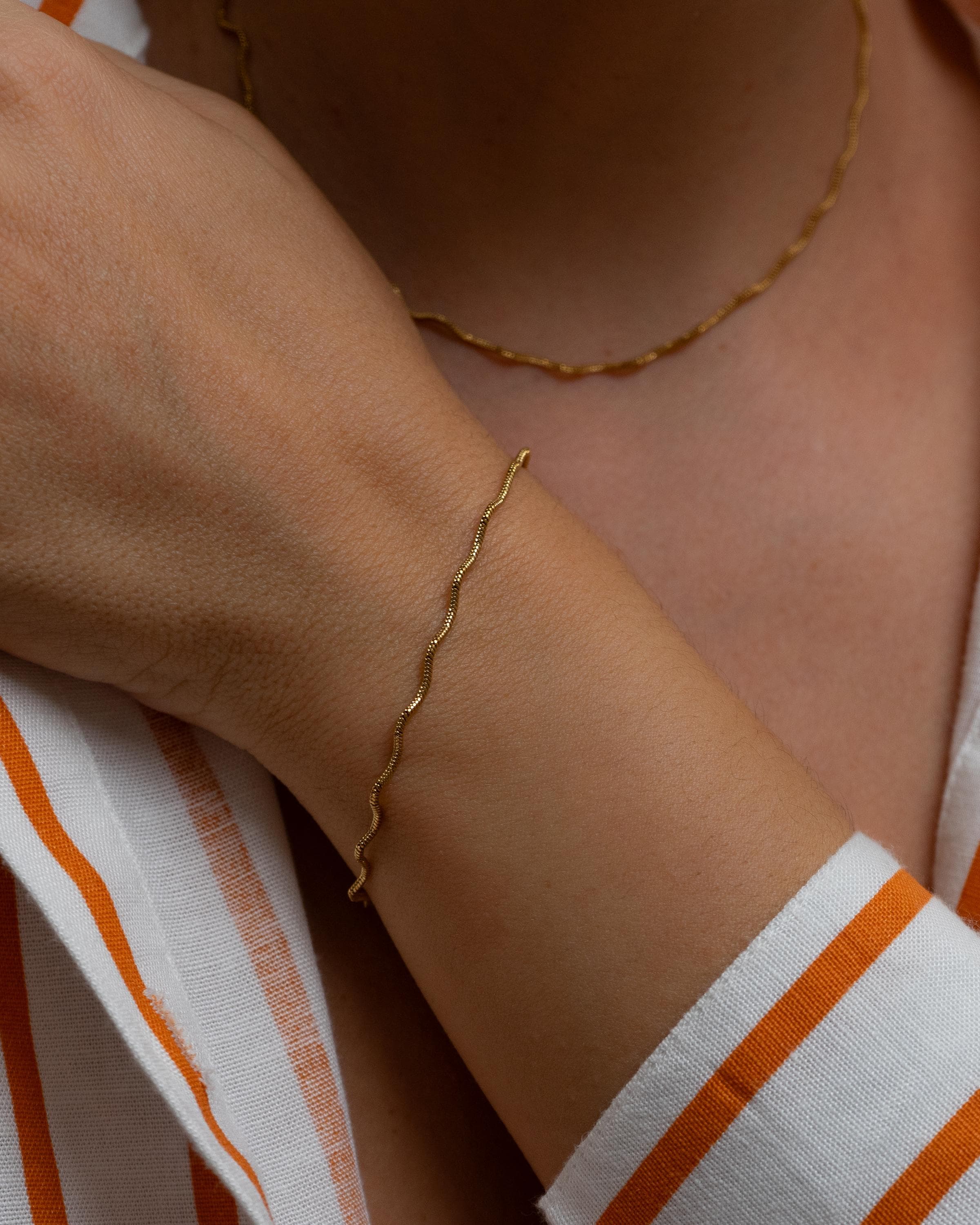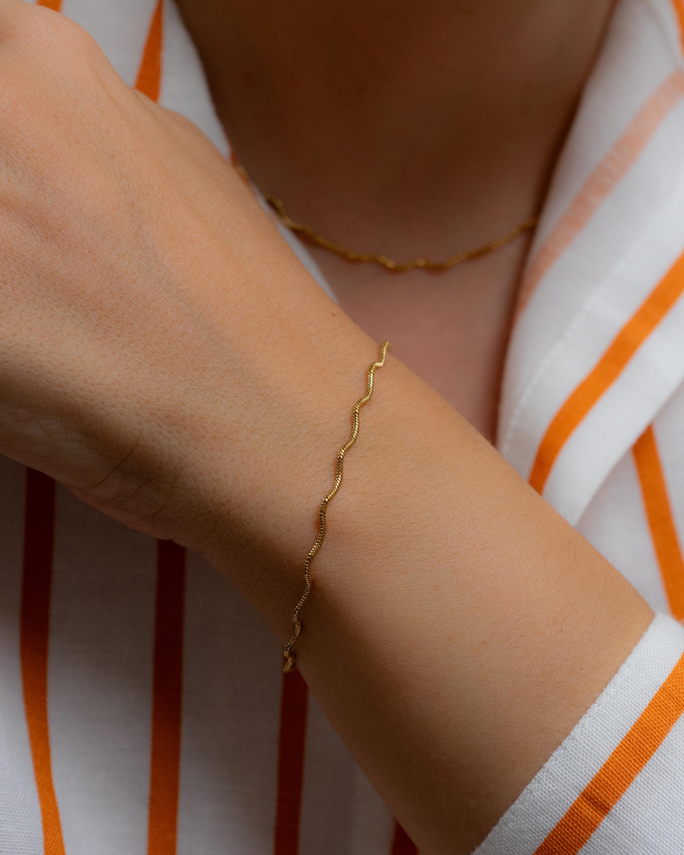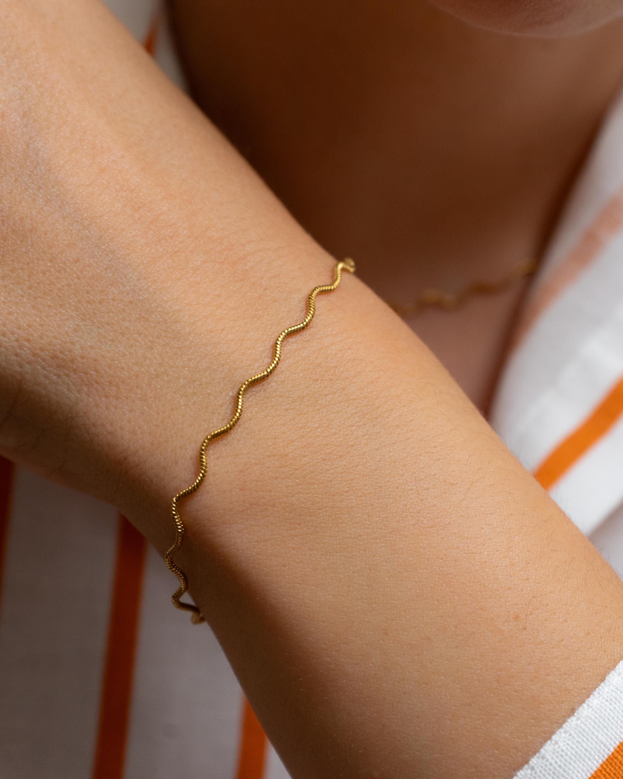 A refined wavy snake chain bracelet crafted from stainless steel with a gold finish. Its slim 1.2 mm design adds a subtle shine while remaining lightweight and comfortable for everyday wear.
