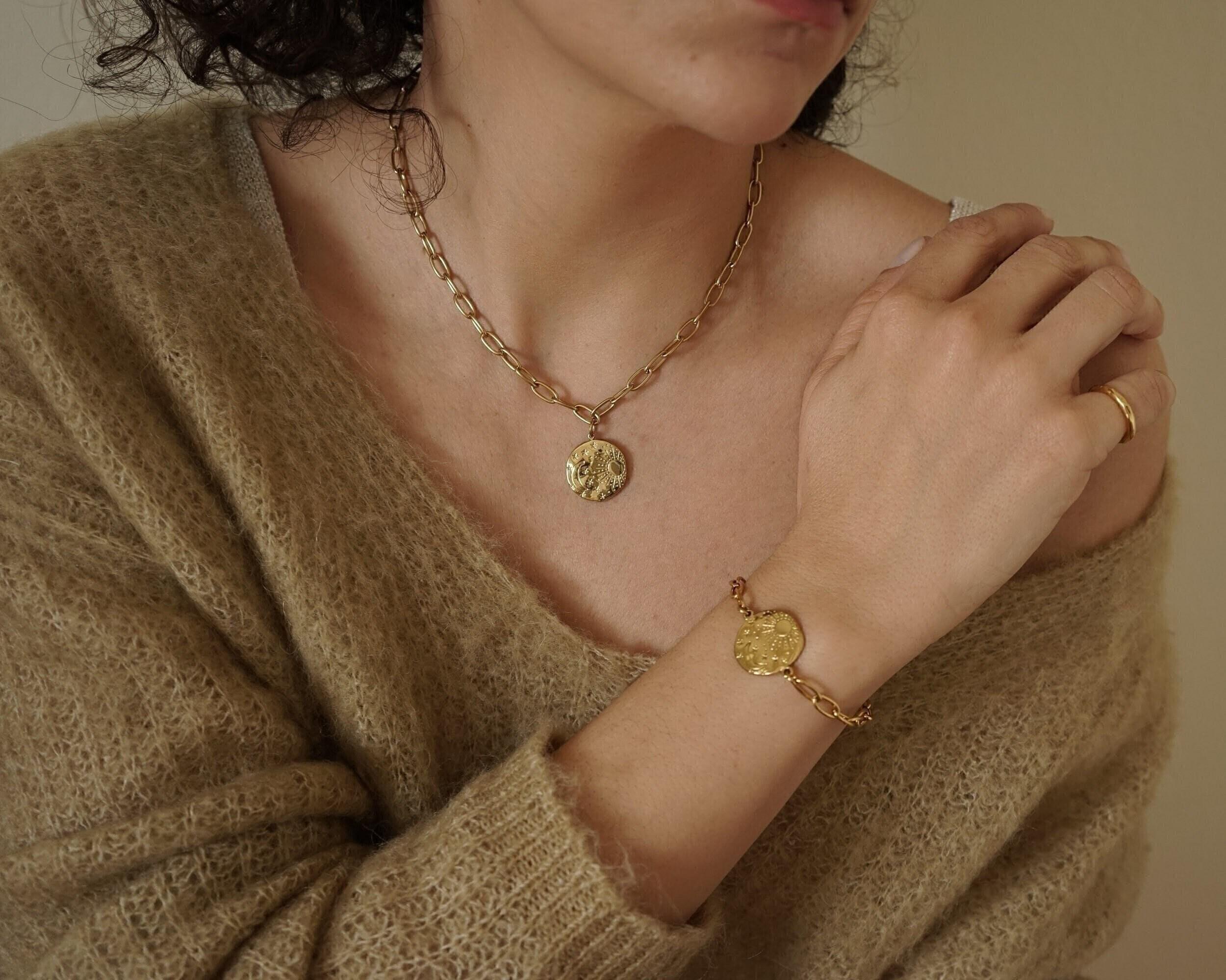 This elegant and timeless gold Sun & Moon chain bracelet is a sophisticated piece that complements any style effortlessly. Its celestial design adds a touch of charm and meaning, making it perfect for both day and night wear.