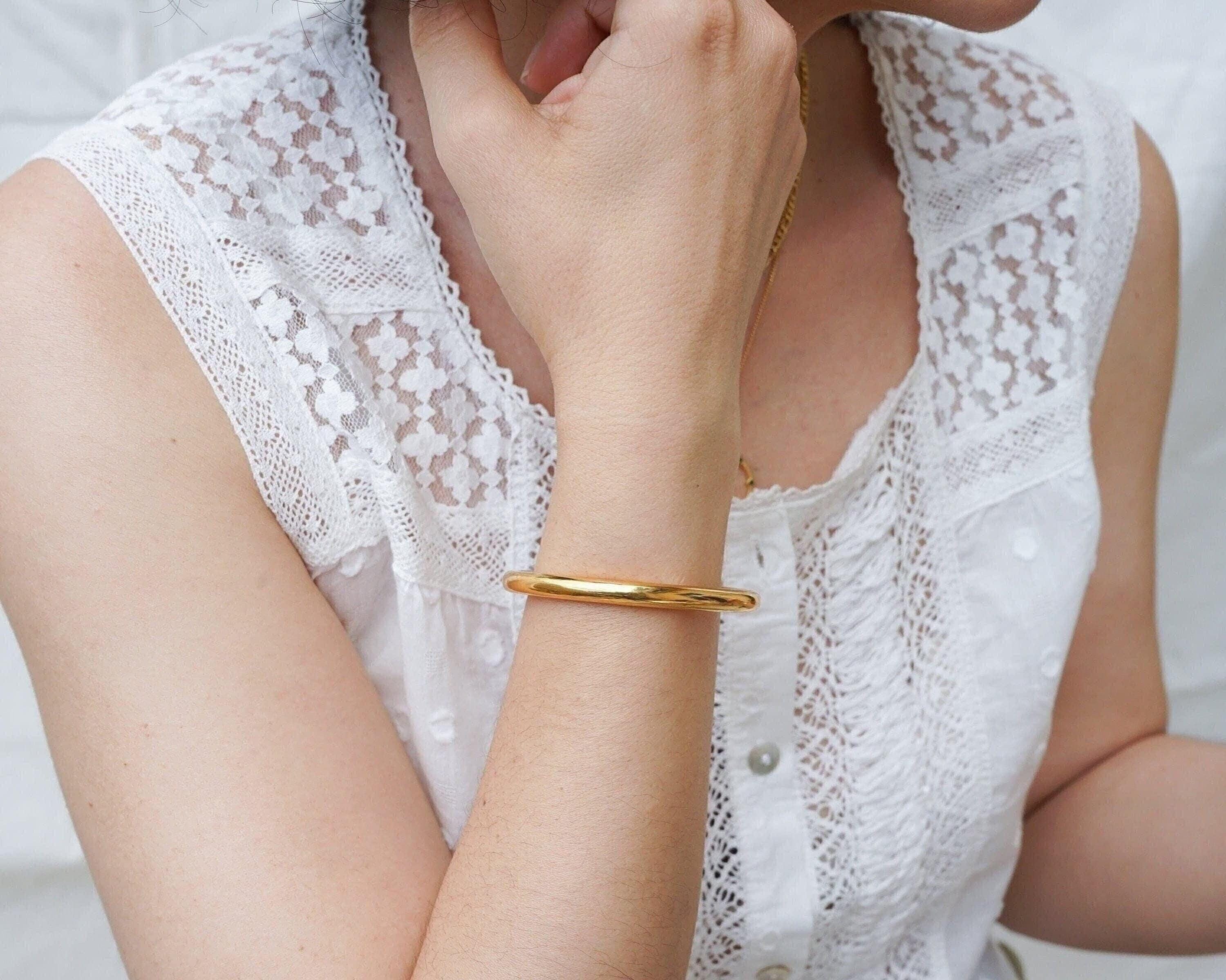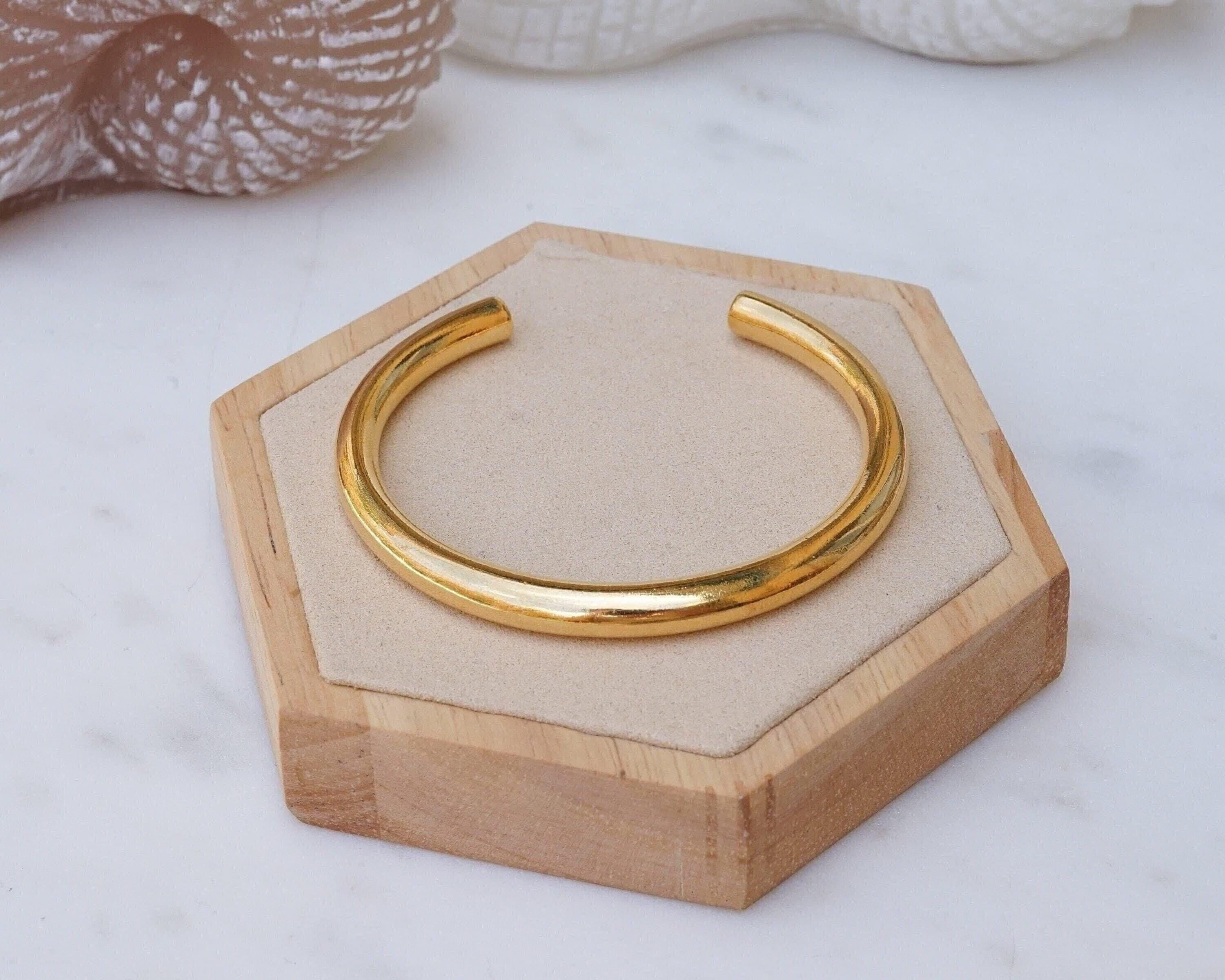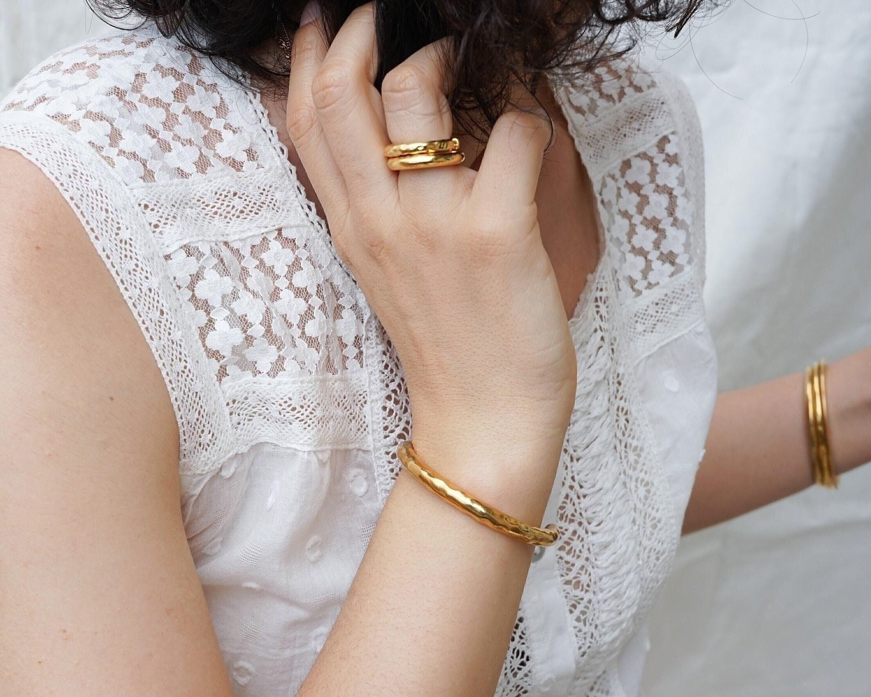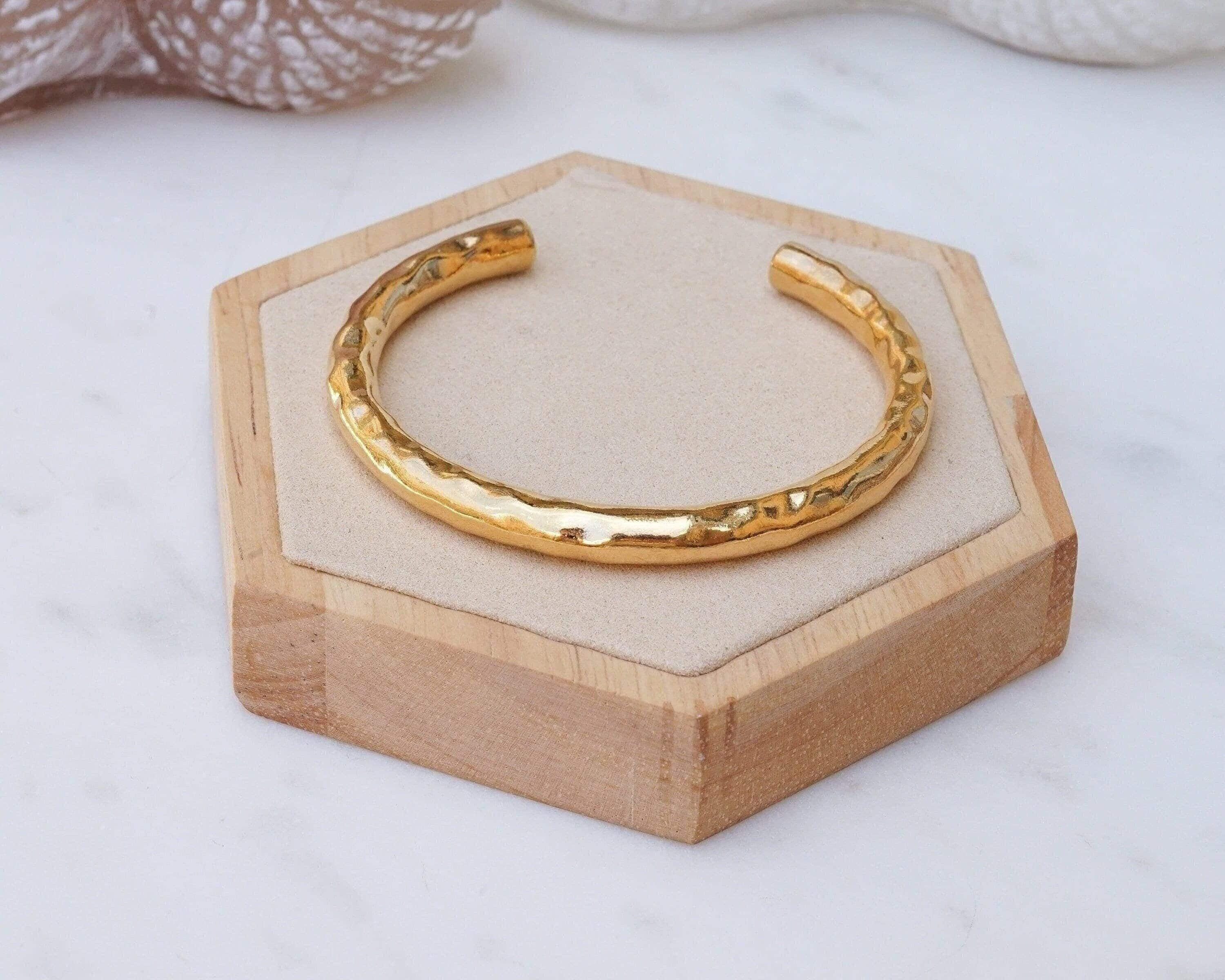 A 24k gold-plated cuff bracelet available in a hammered surface or a simple design. Its versatile style makes it perfect for mixing and matching with other cuffs and bangles. Pair it beautifully with several rings from our collection to create a cohesive and elegant look. Whether worn individually or stacked, this cuff adds a touch of sophistication to any outfit.