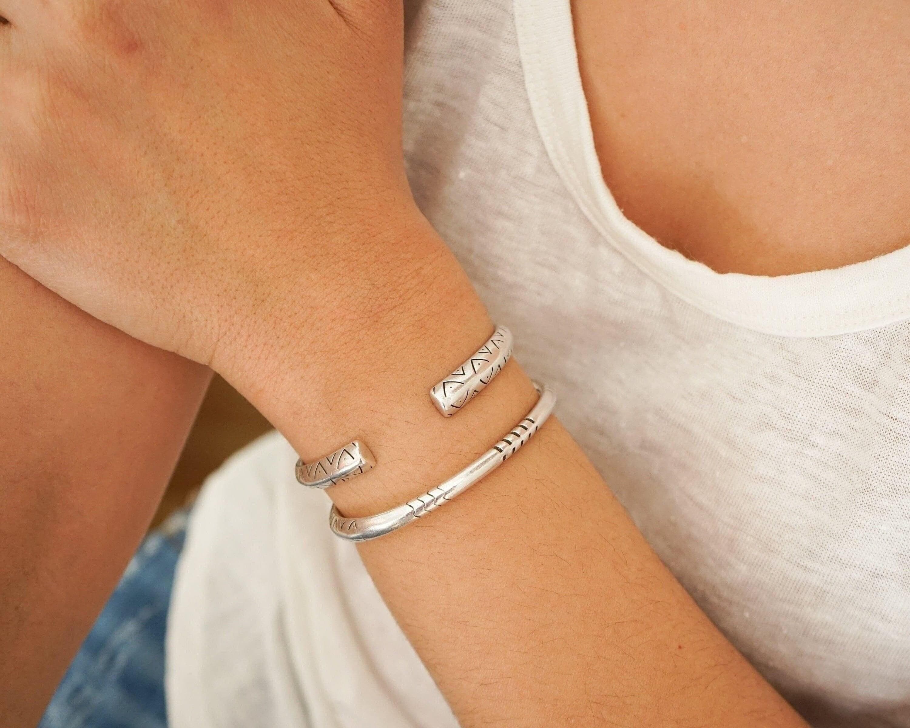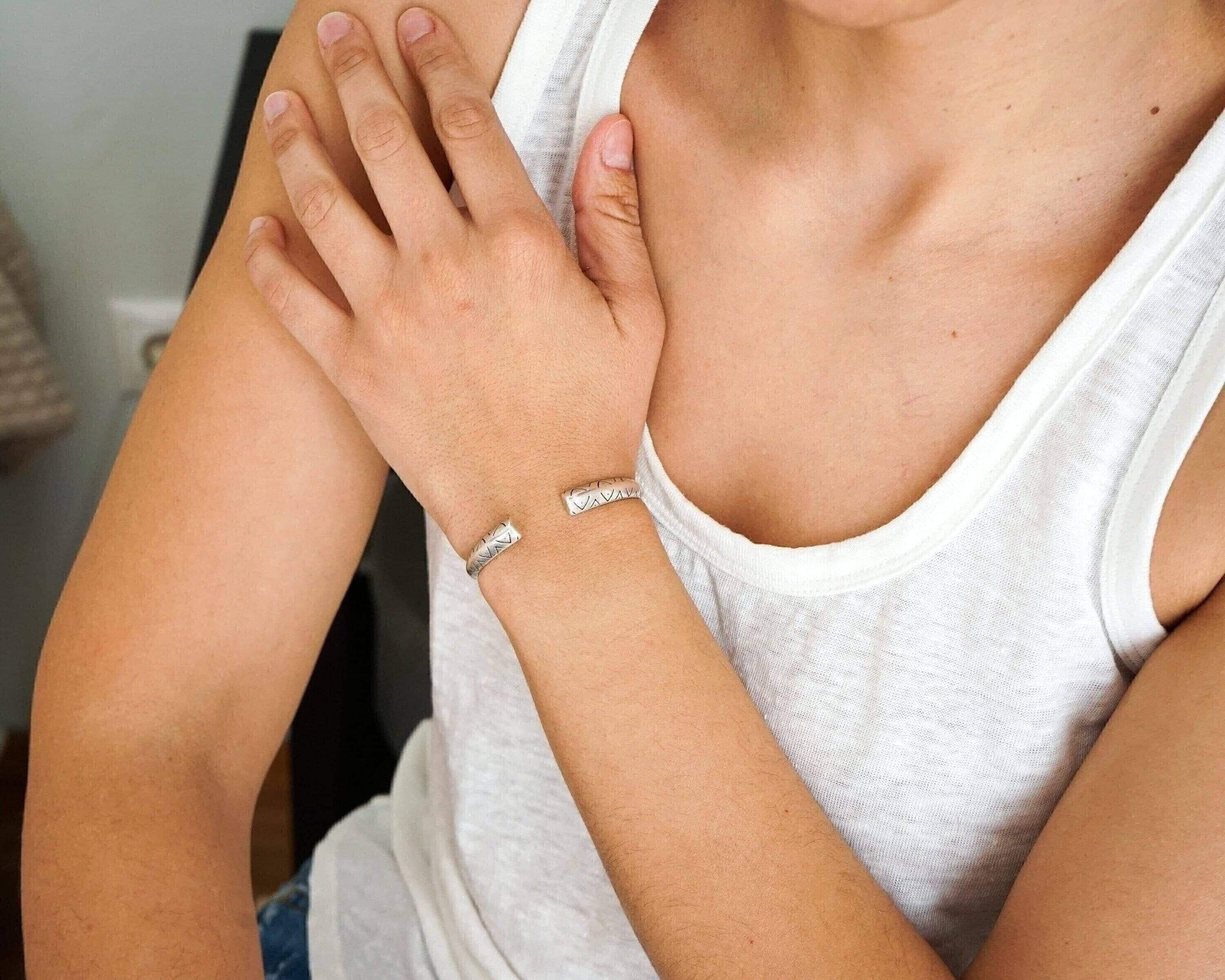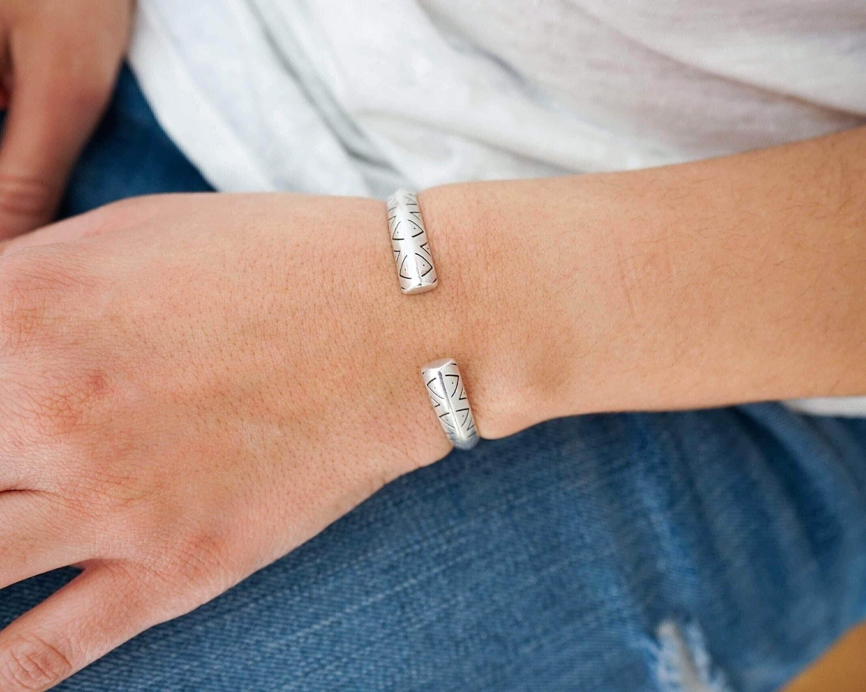 This silver-plated cuff bracelet, crafted with an antique vintage look, features intricate engraved details inspired by ethnic tribal artistry. The black patina finish enhances its textured design, giving it a distinctive and timeless appeal.