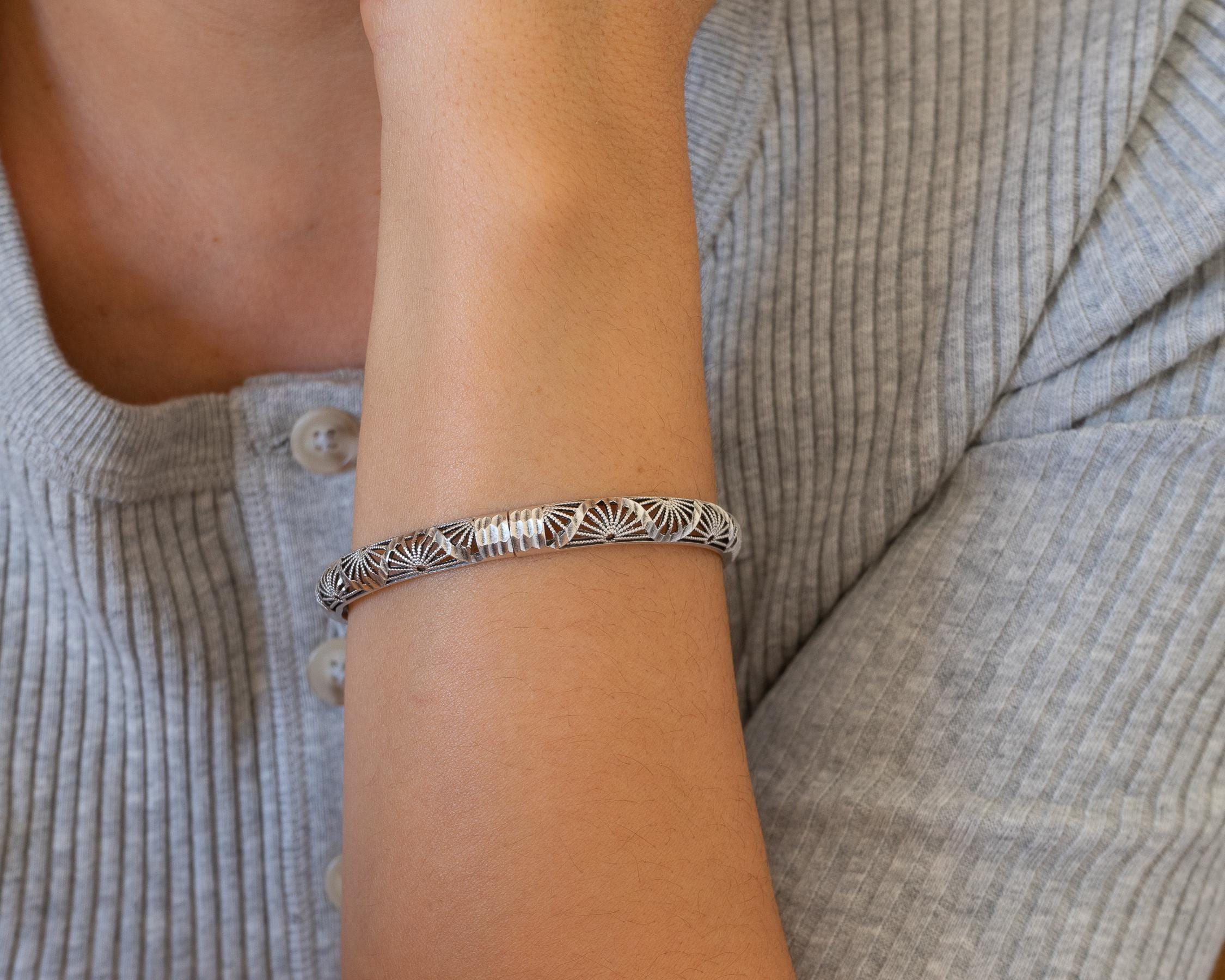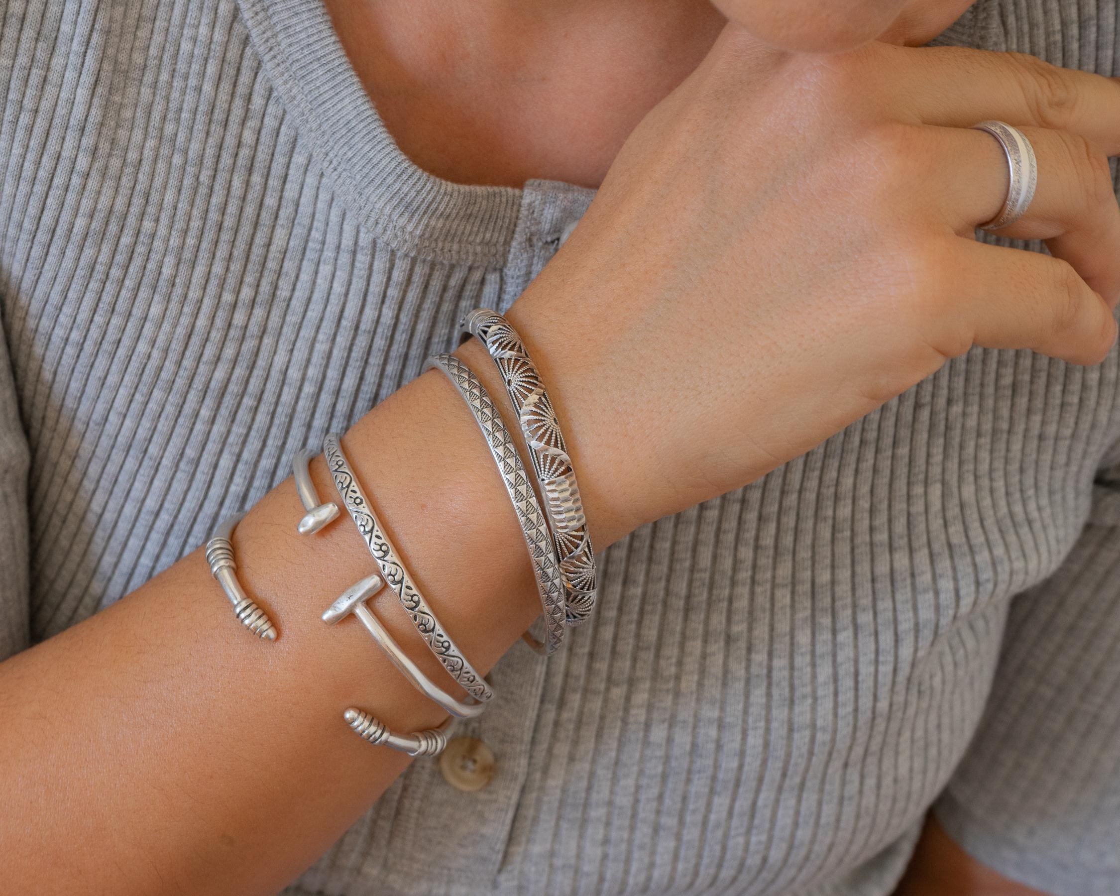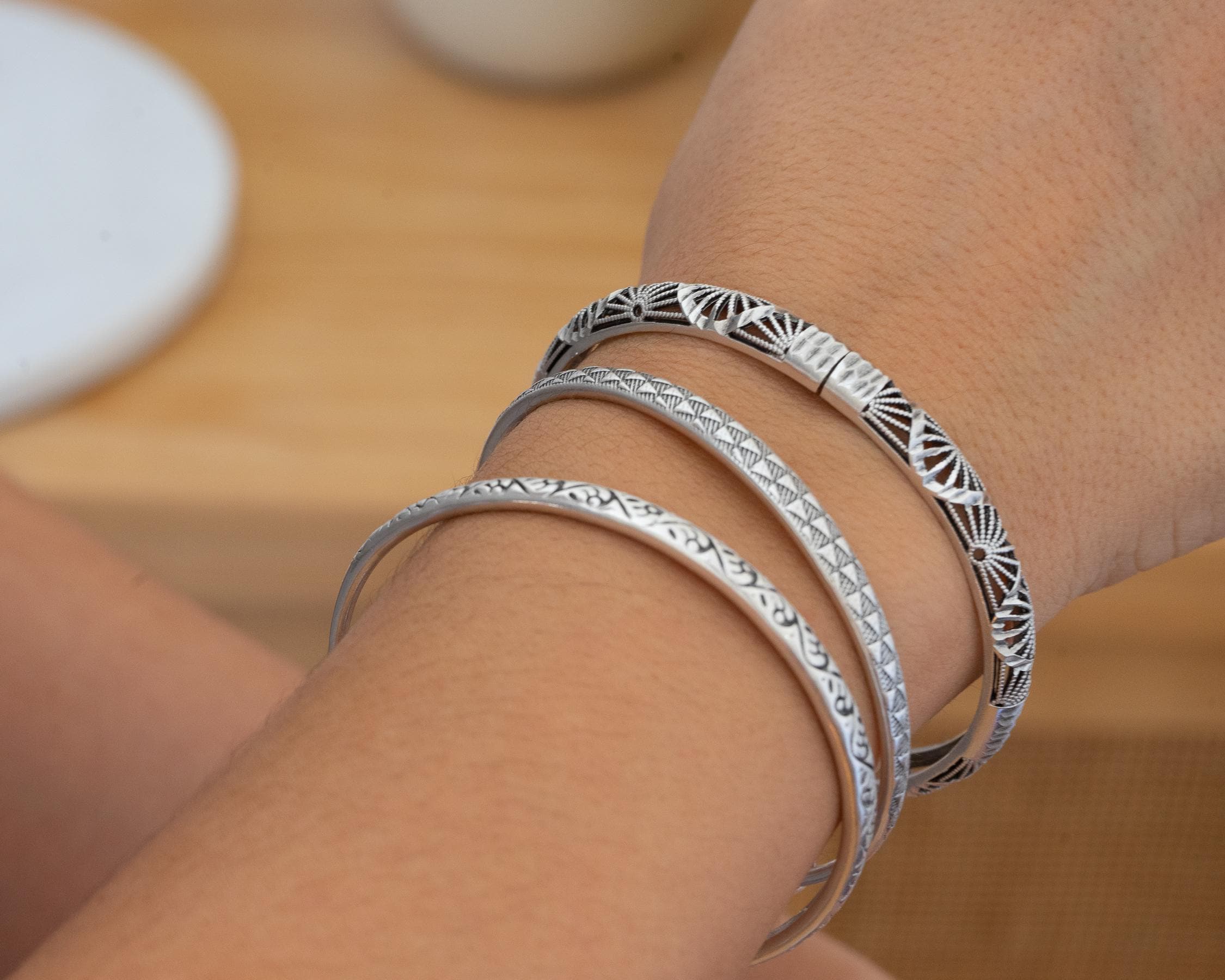 Crafted with precision and attention to detail, this silver-plated bangle combines durability and style, ensuring it remains a standout piece in your jewelry collection. Its versatile design allows it to be worn solo as a statement accessory or paired with other bangles for a chic, layered look.