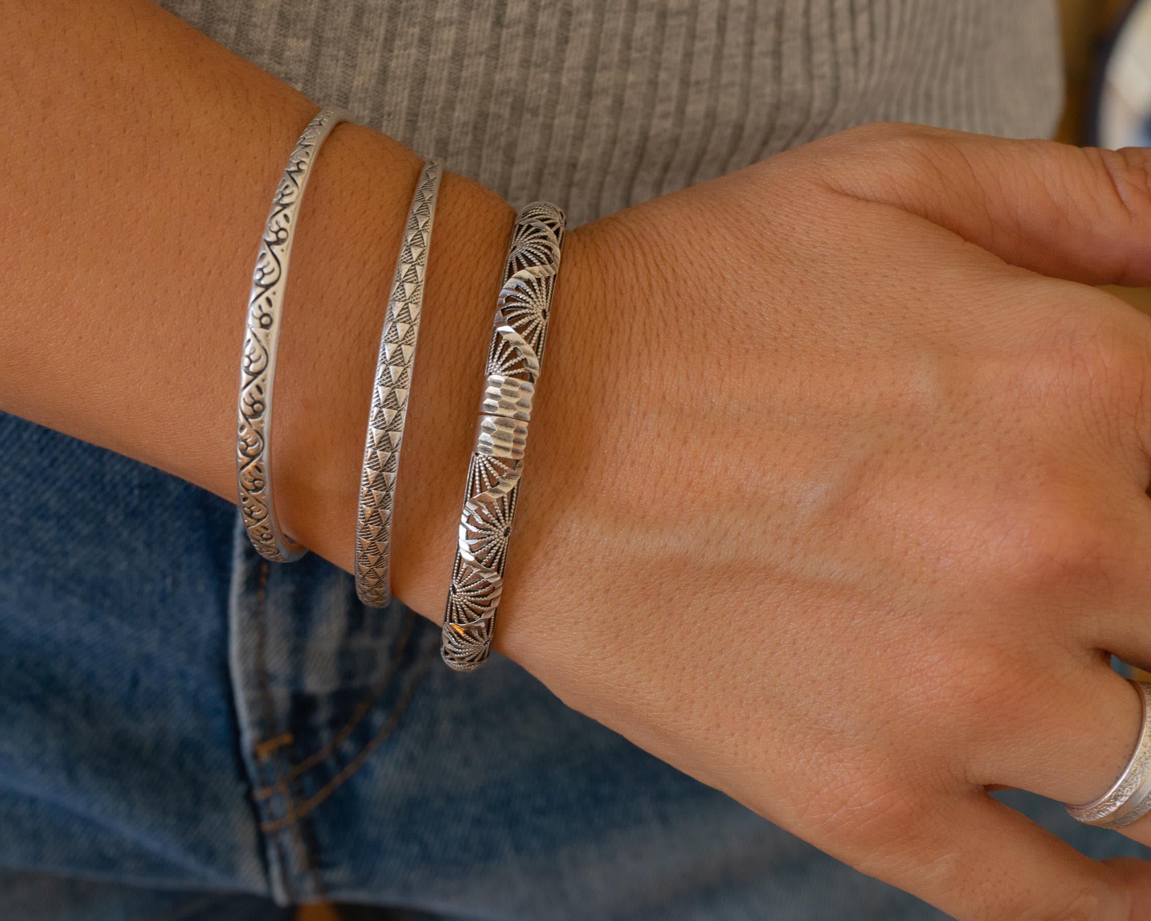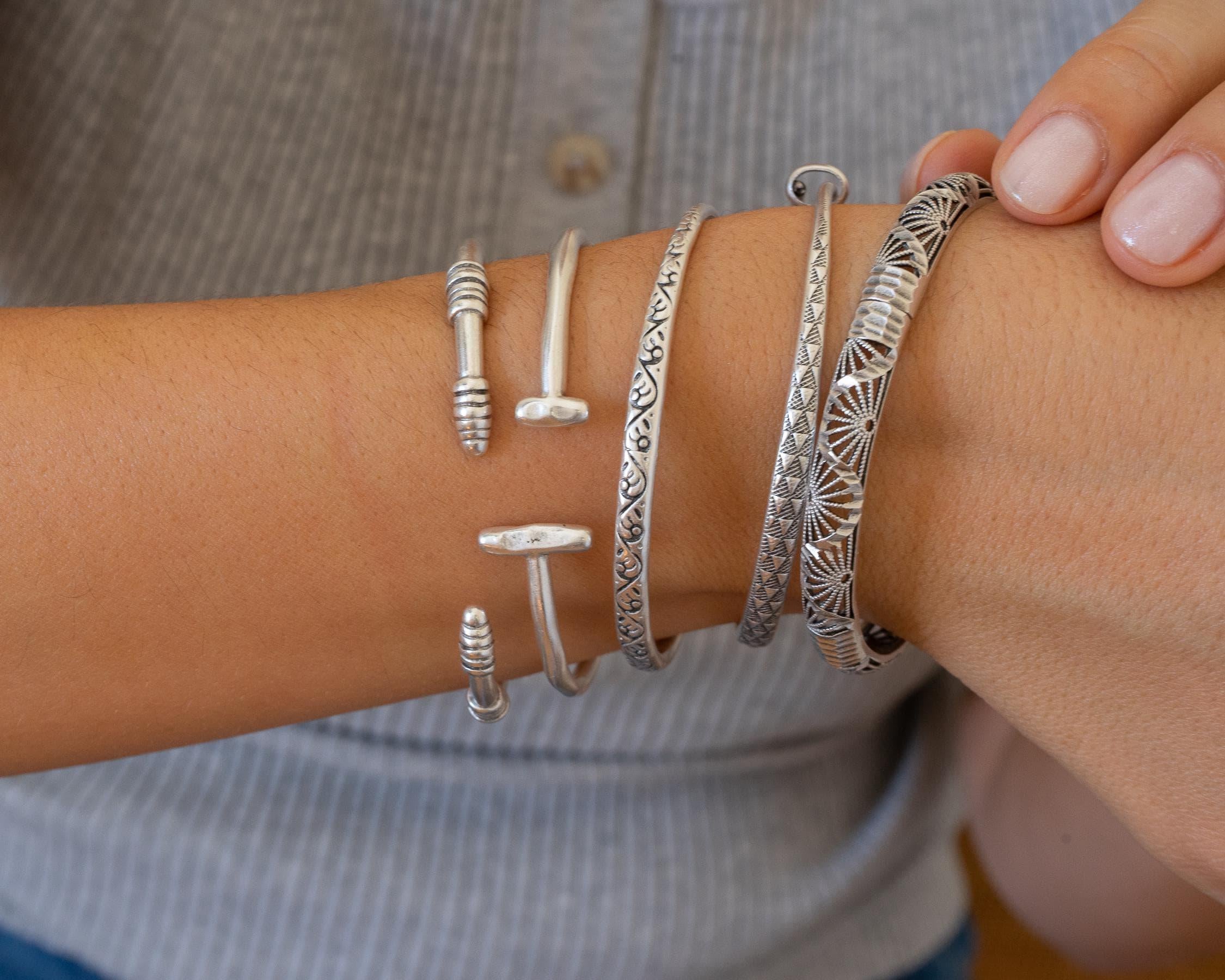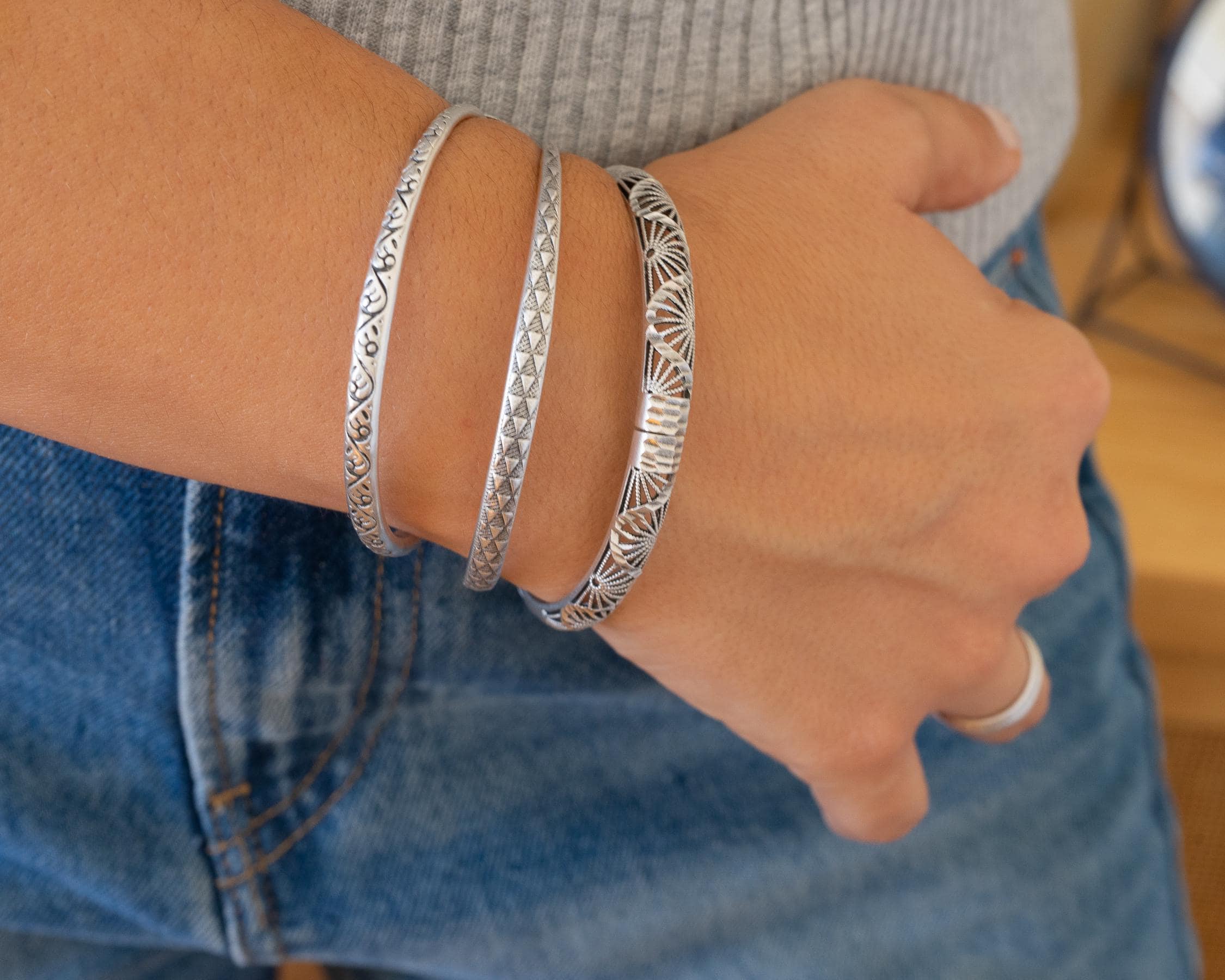 Crafted with precision and attention to detail, this silver-plated bangle combines durability and style, ensuring it remains a standout piece in your jewelry collection. Its versatile design allows it to be worn solo as a statement accessory or paired with other bangles for a chic, layered look.