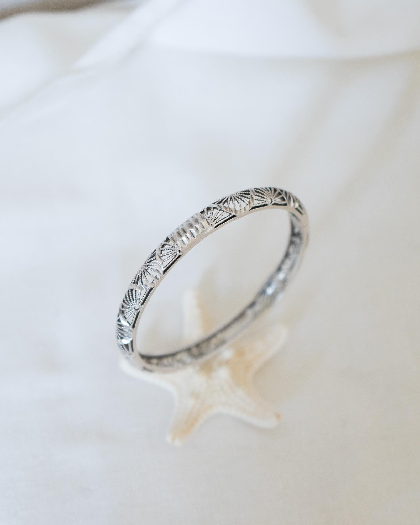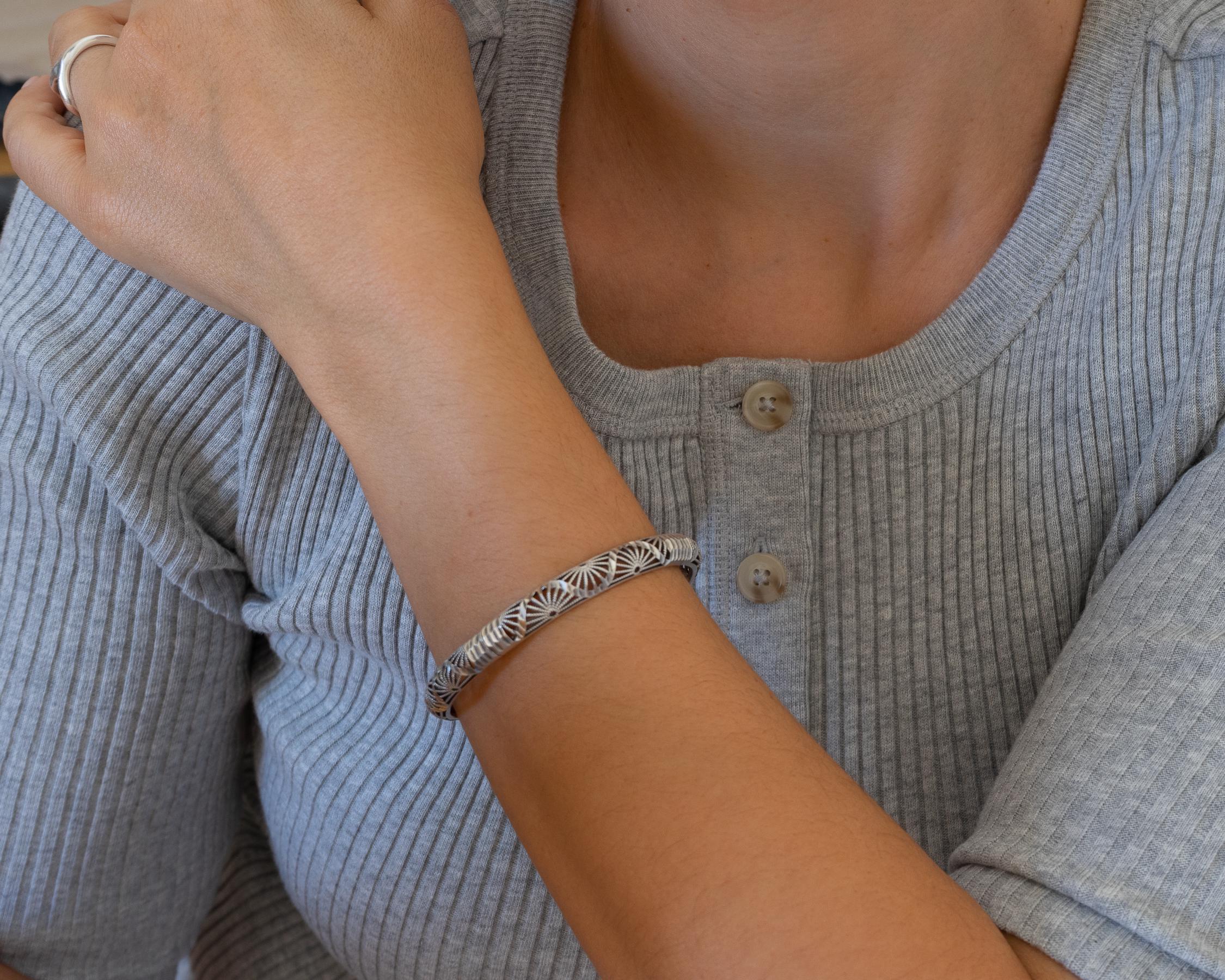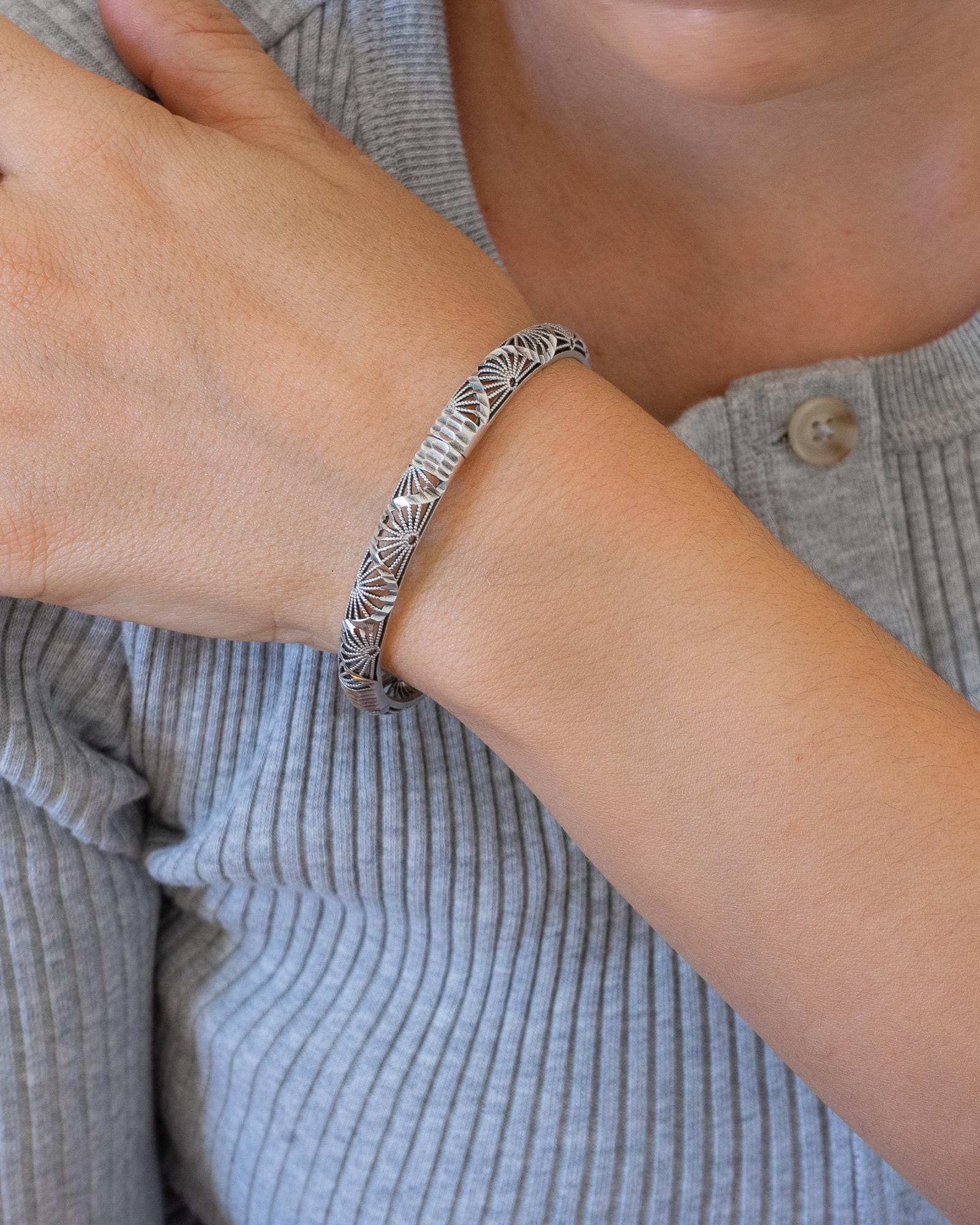Effortless sophistication meets timeless beauty with the Silver Floral Perforated Bangle. Featuring an intricate floral design and a secure clasp, this bangle adds an elegant touch to any outfit, making it perfect for both everyday wear and special occasions.