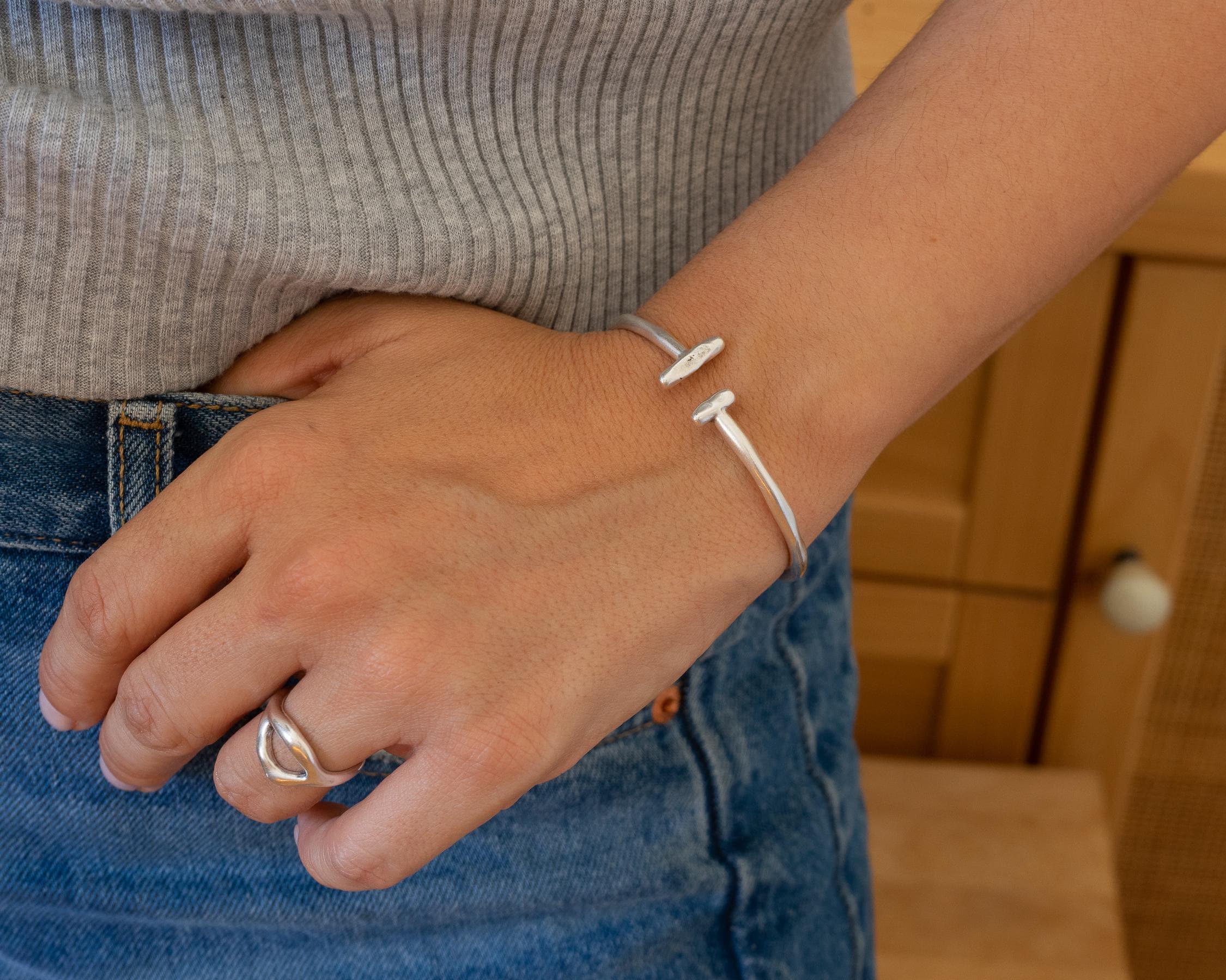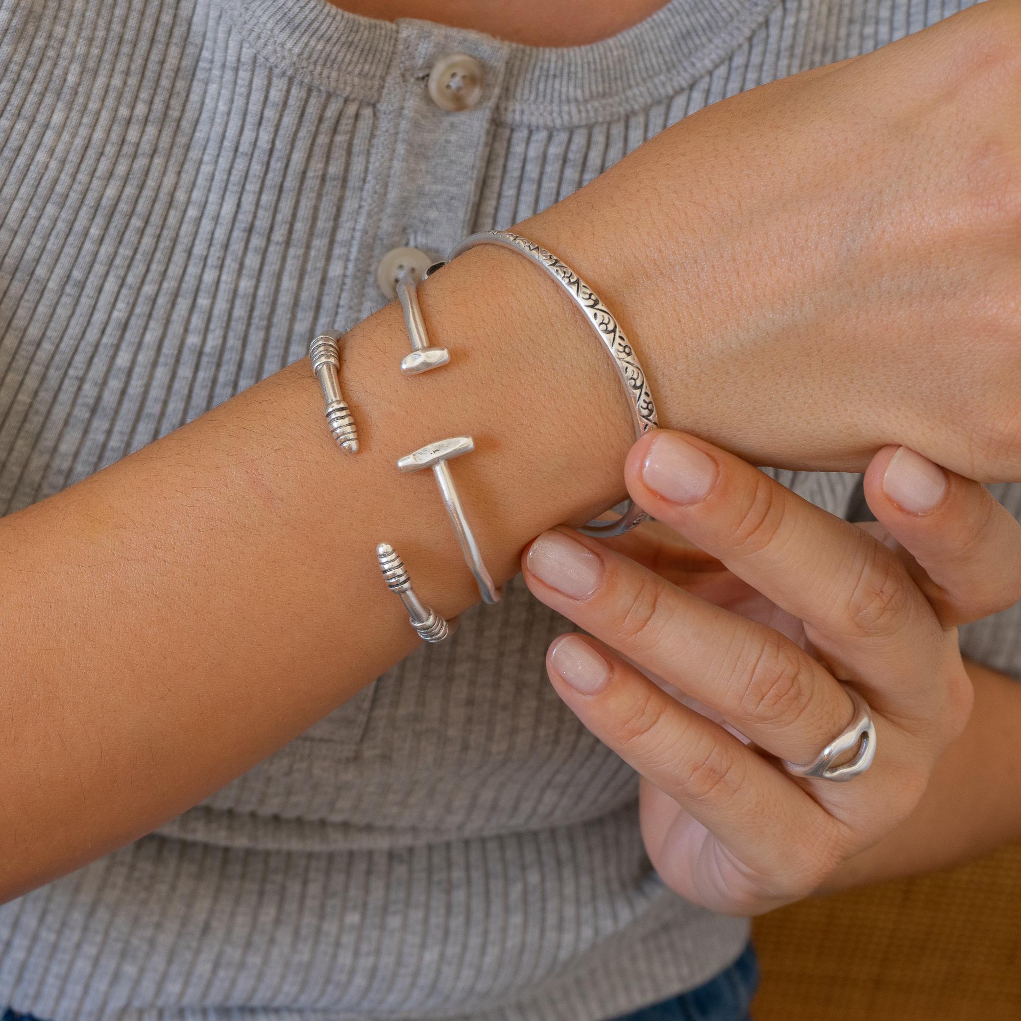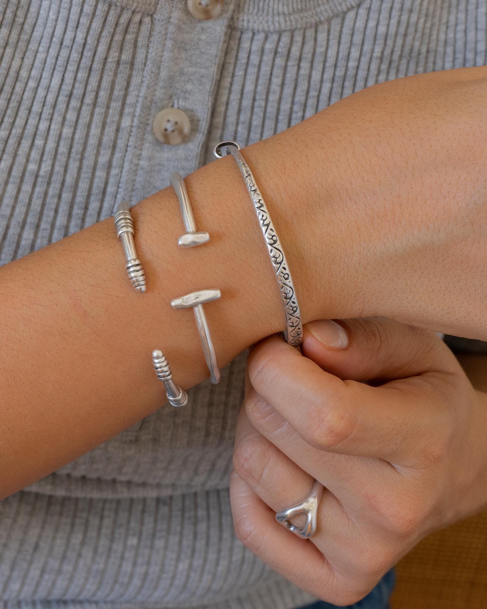 Crafted from durable silver-plated zamak, this cuff is both stylish and timeless, suitable for casual wear or more formal occasions. Its lightweight and comfortable fit ensure it becomes a go-to piece for elevating your everyday style.