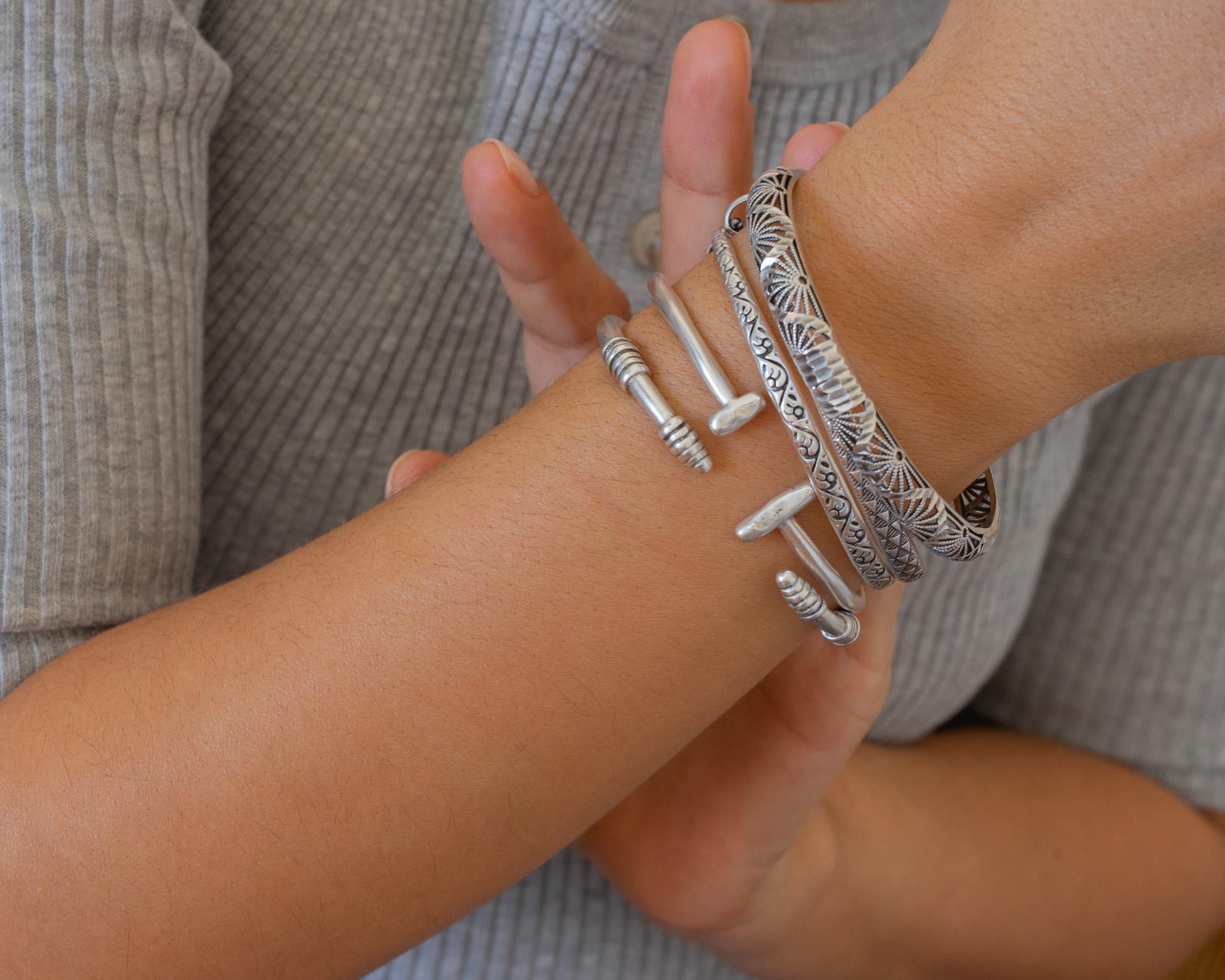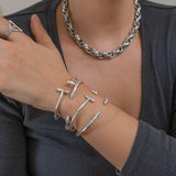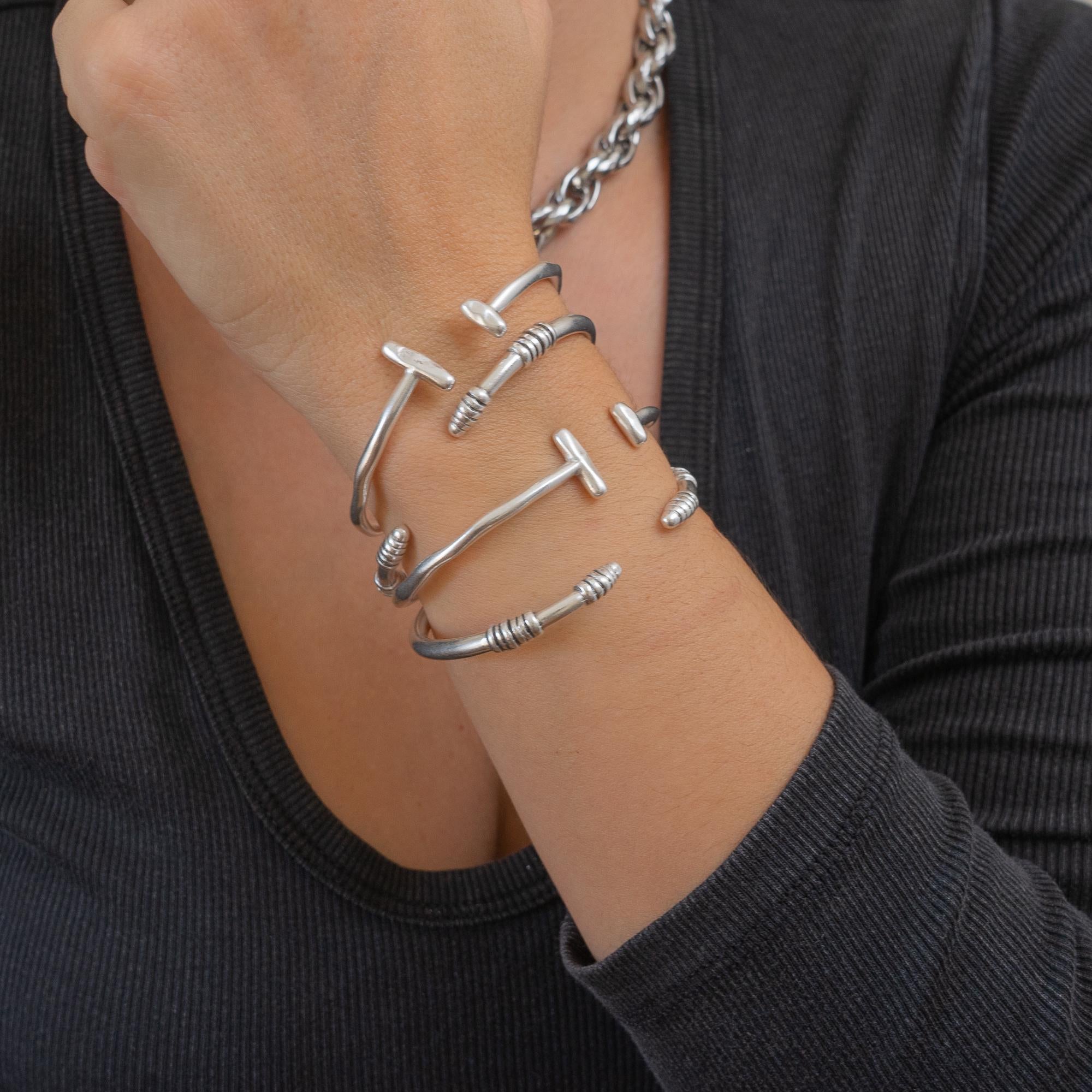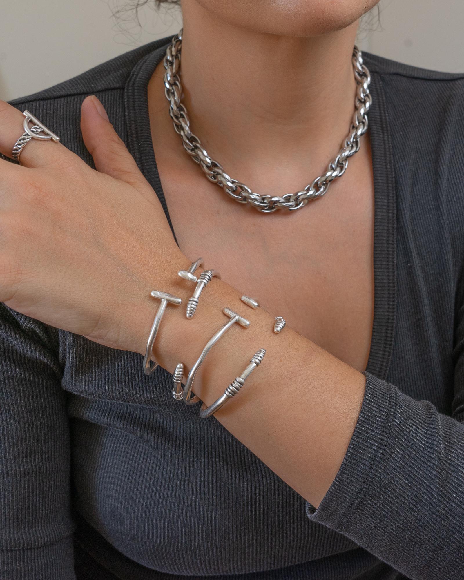 Crafted from durable silver-plated zamak, this cuff is both stylish and timeless, suitable for casual wear or more formal occasions. Its lightweight and comfortable fit ensure it becomes a go-to piece for elevating your everyday style.